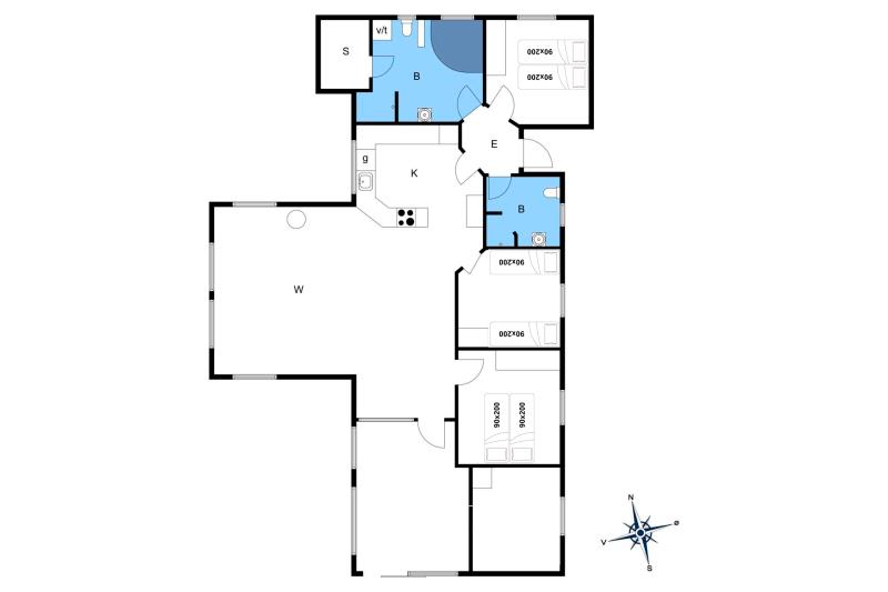 2 dobbeltsenge med 2 madrasser 90 x 200 cm + 2 enkeltsenge 90 x 200 cm.