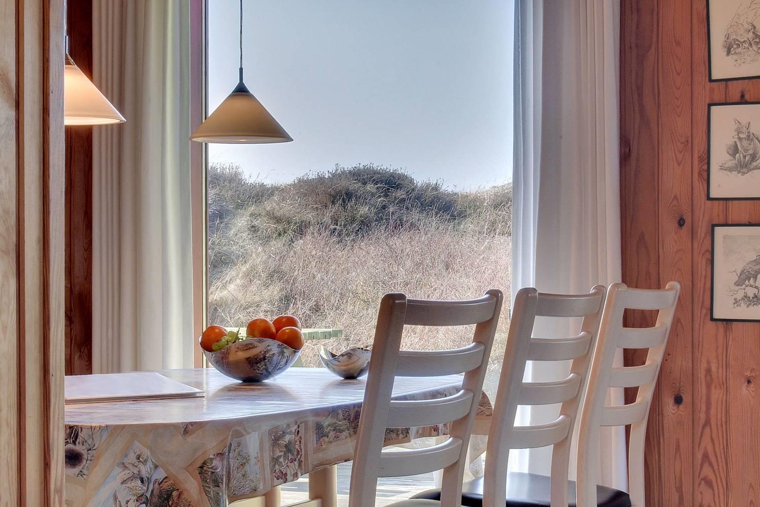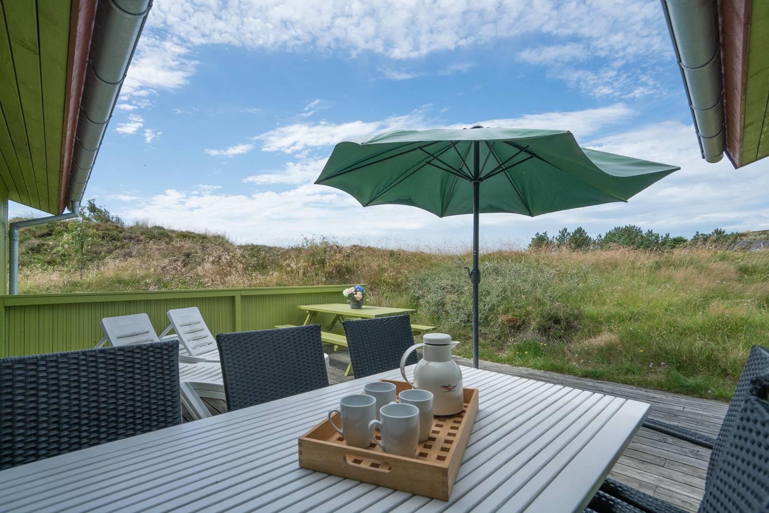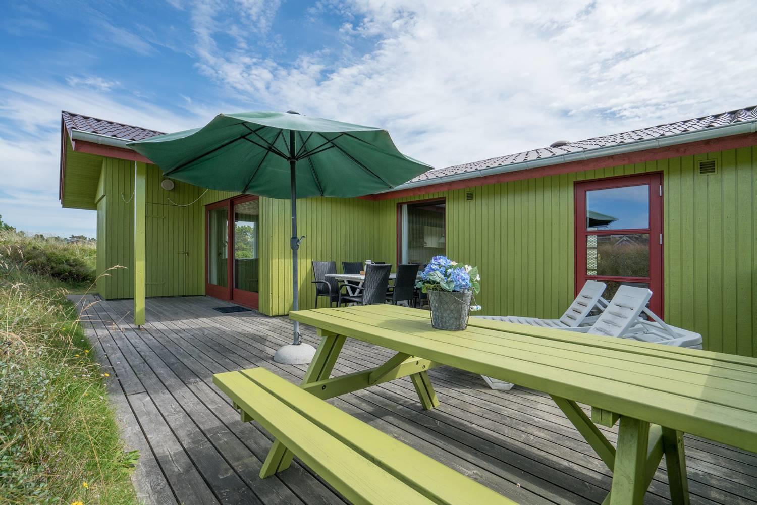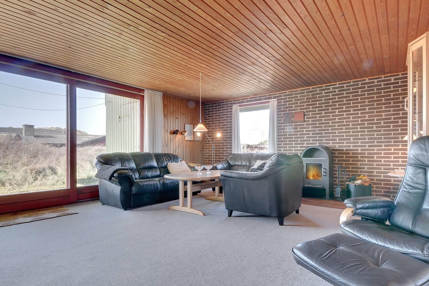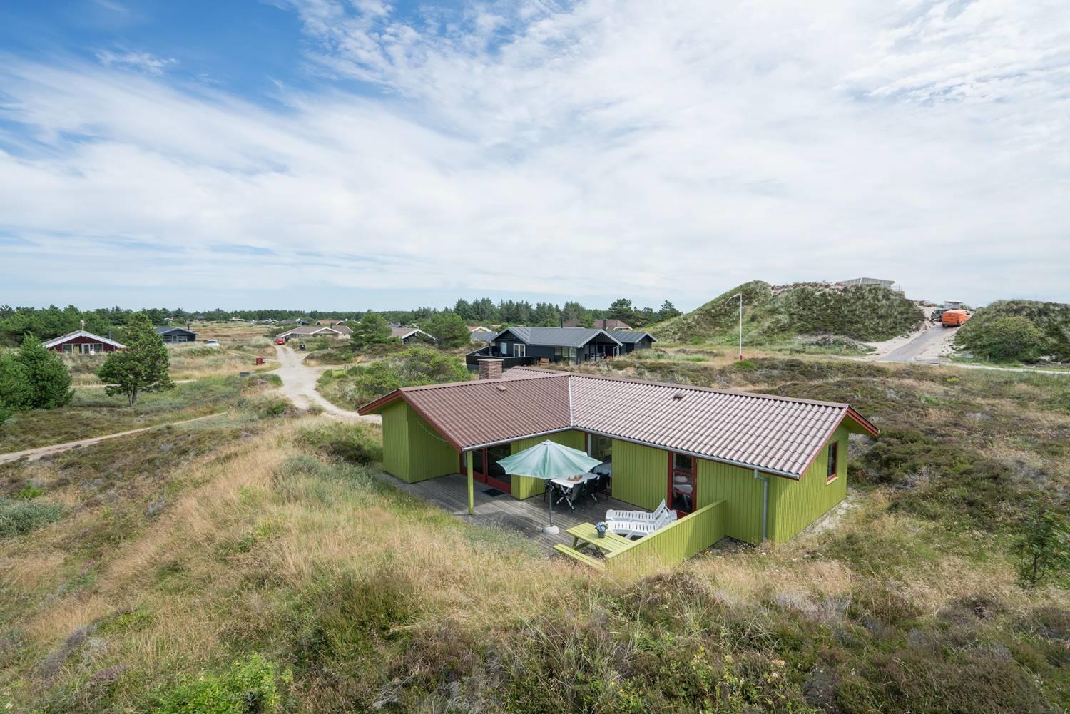 For enden af blind vej, på en kuperet klitgrund ligger dette dejlige feriehus. Det er 2 gode træterrasser, hvoraf den ene er delvis overdækket og den anden er indhegnet. Gode værelser og nyere badeværelse og køkken. Stor stue med brændeovn med glaslåge og udgang terrasse.