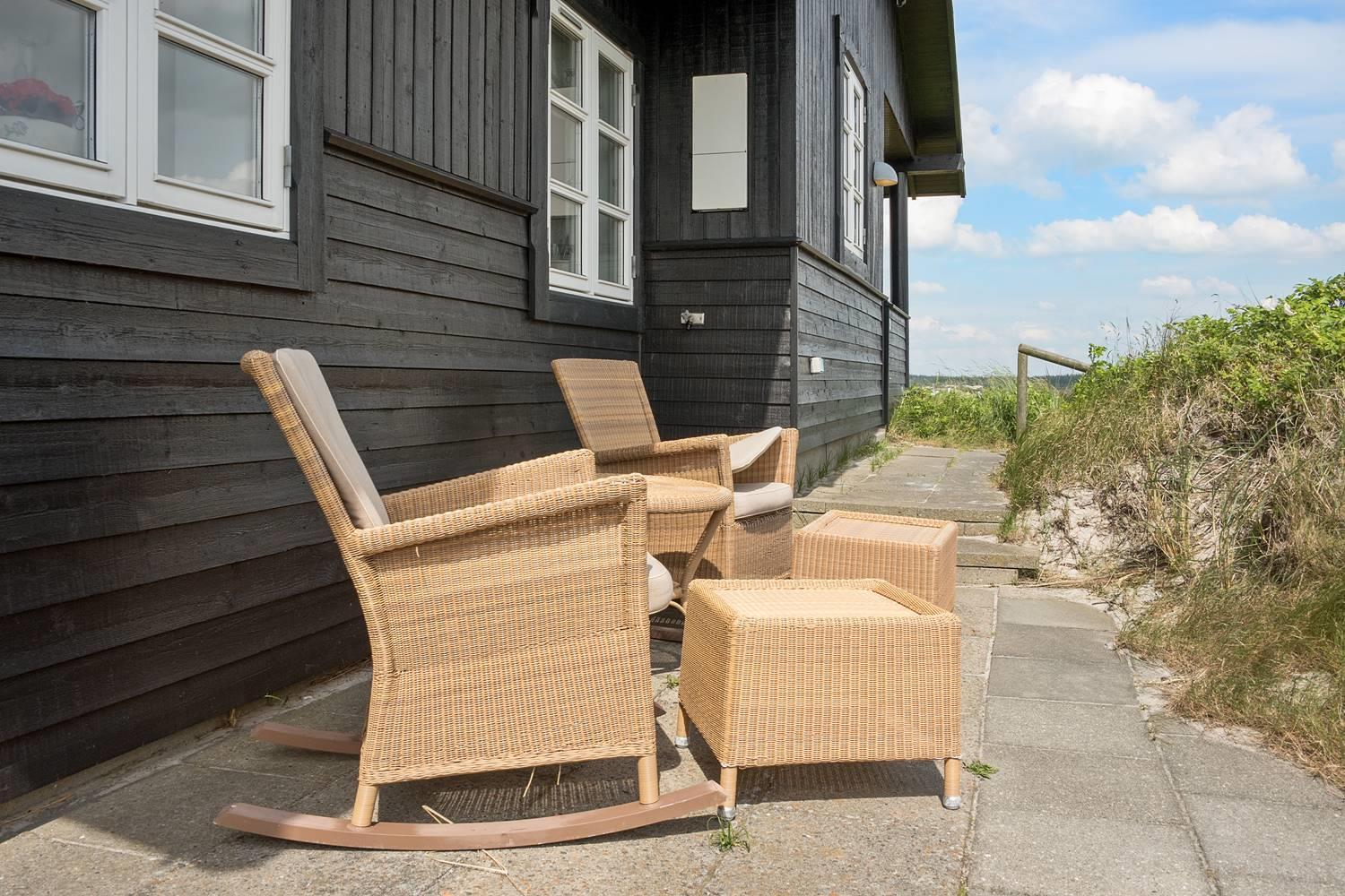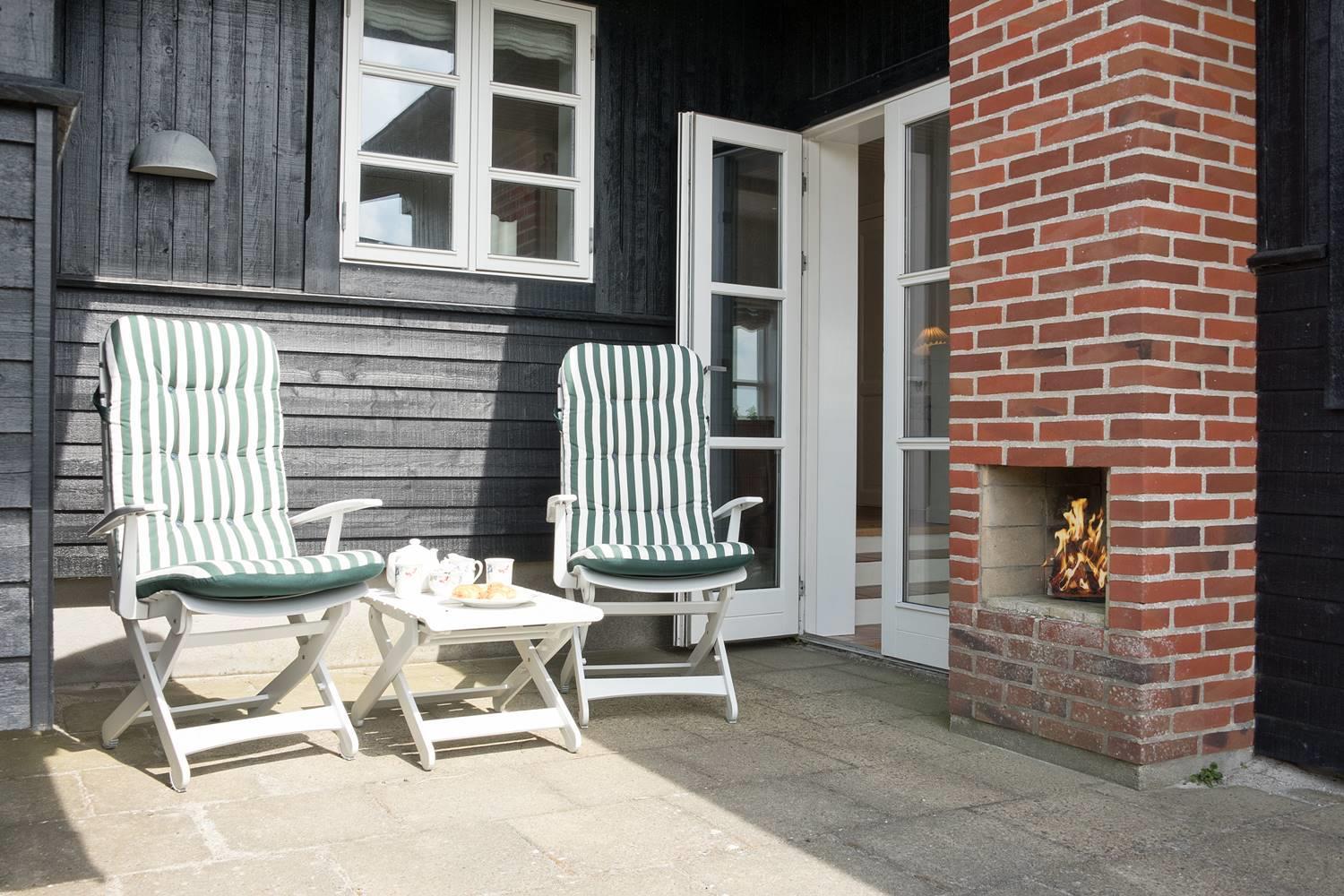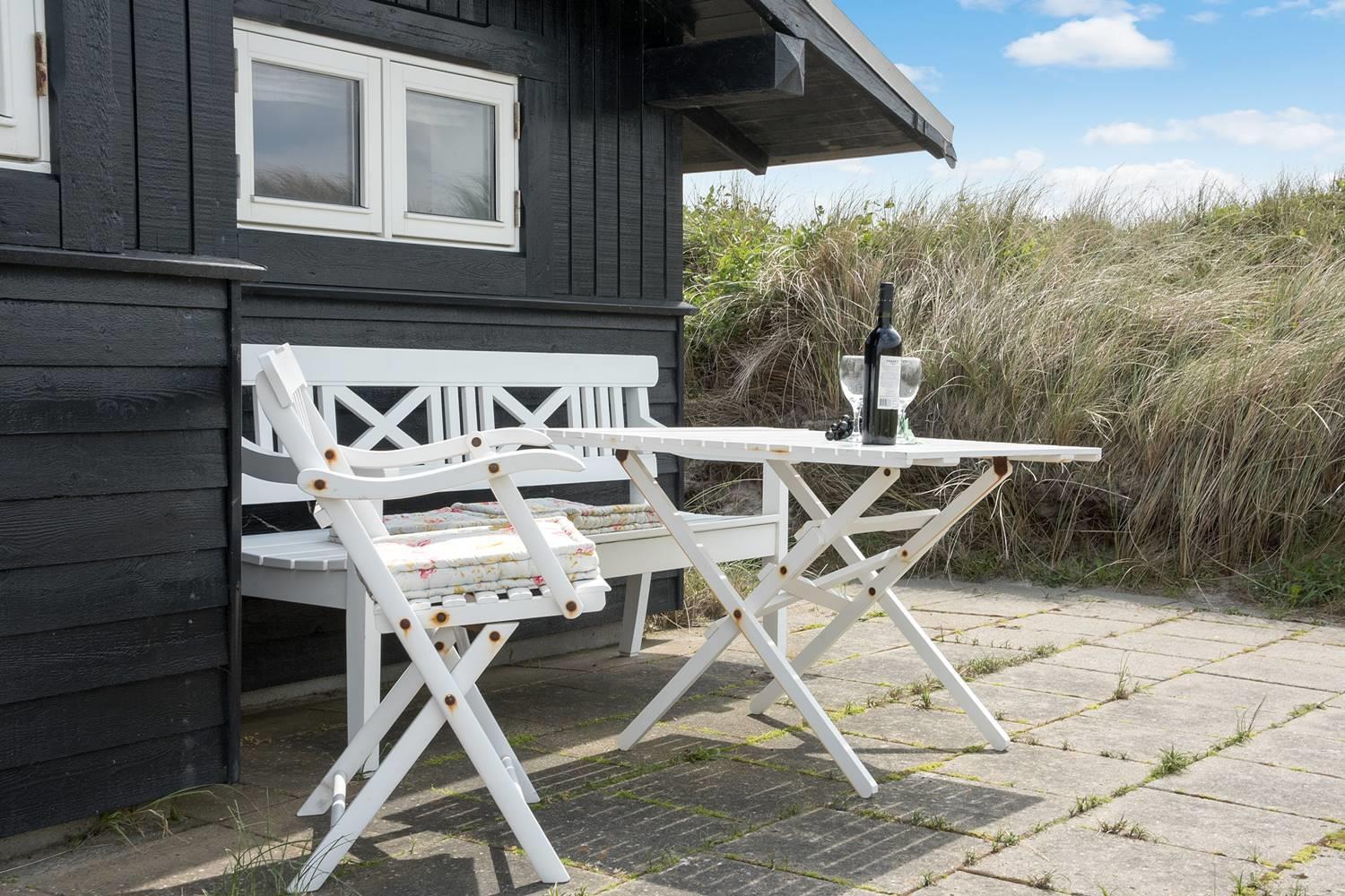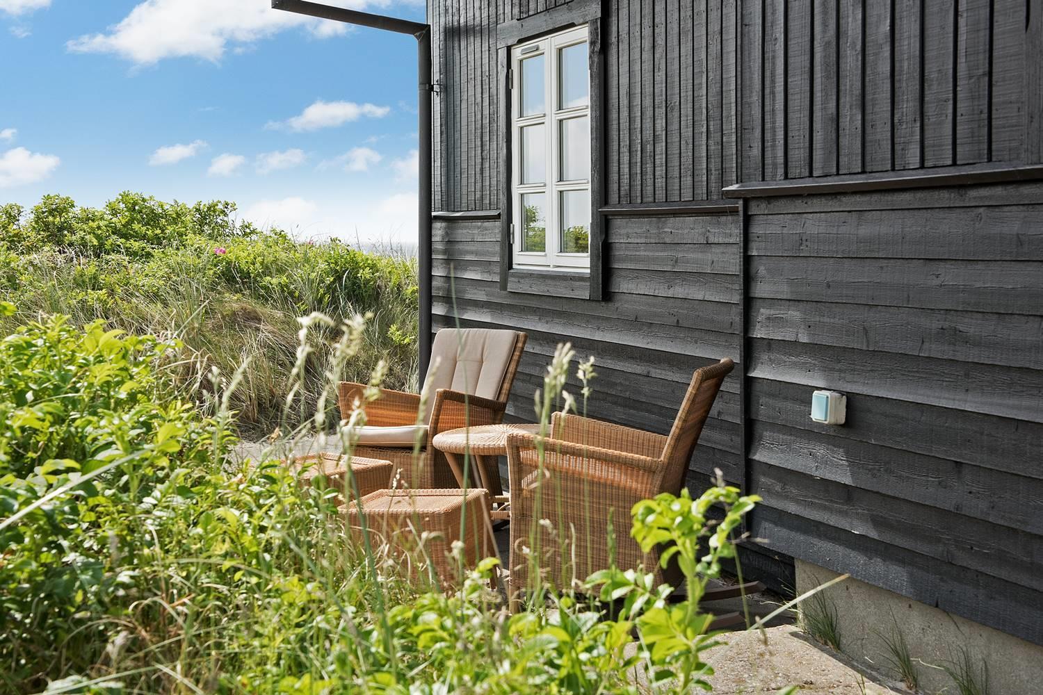 Den overdækkede terrasse giver jer et beskyttet opholdssted i den friske vestenvind. Her kan I nyde udsigten, vidderne og den særlige ro ved denne beliggenhed – både i solskin og i klassisk kystvejr.