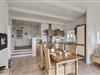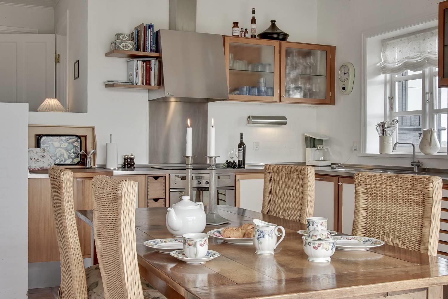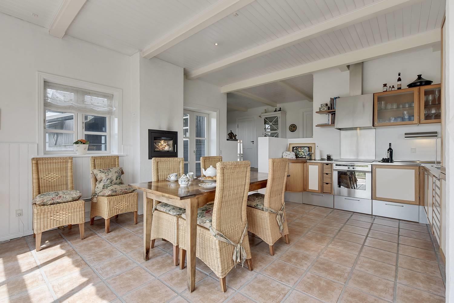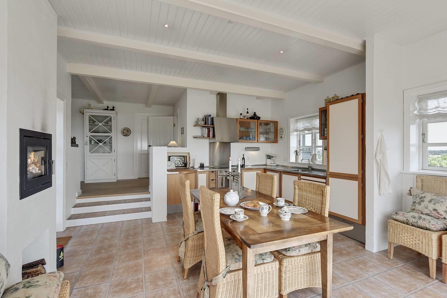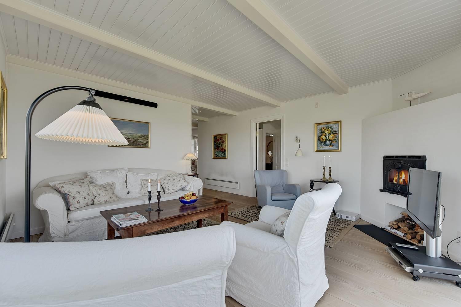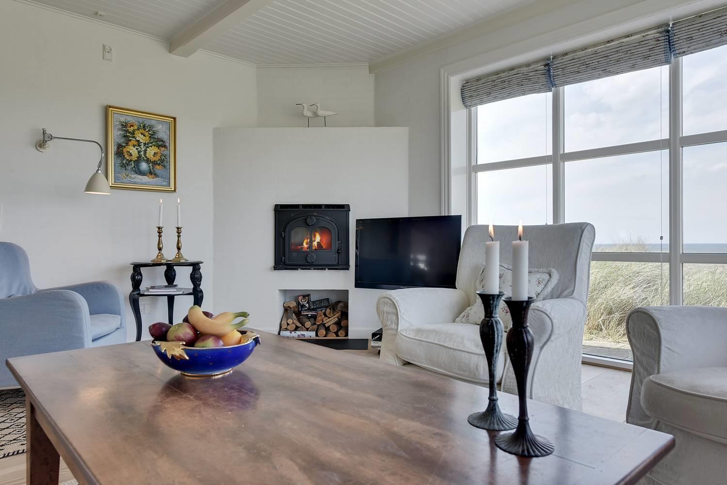 Både i stuen og i spisestuen skaber hver brændeovn en særlig hyggelig stemning. Mens afslappende aftener med udsigt over Vesterhavet venter i stuen, bliver fælles måltider i spisestuen foran den knitrende ild til et ægte ferieminde – perfekt til hyggelige aftener året rundt.