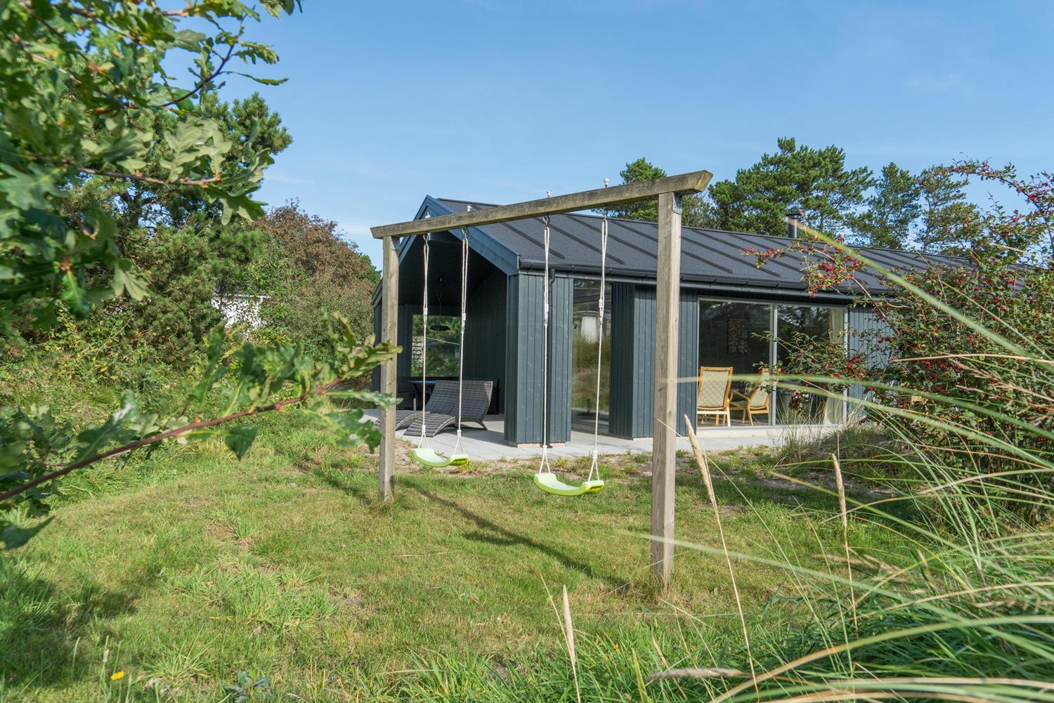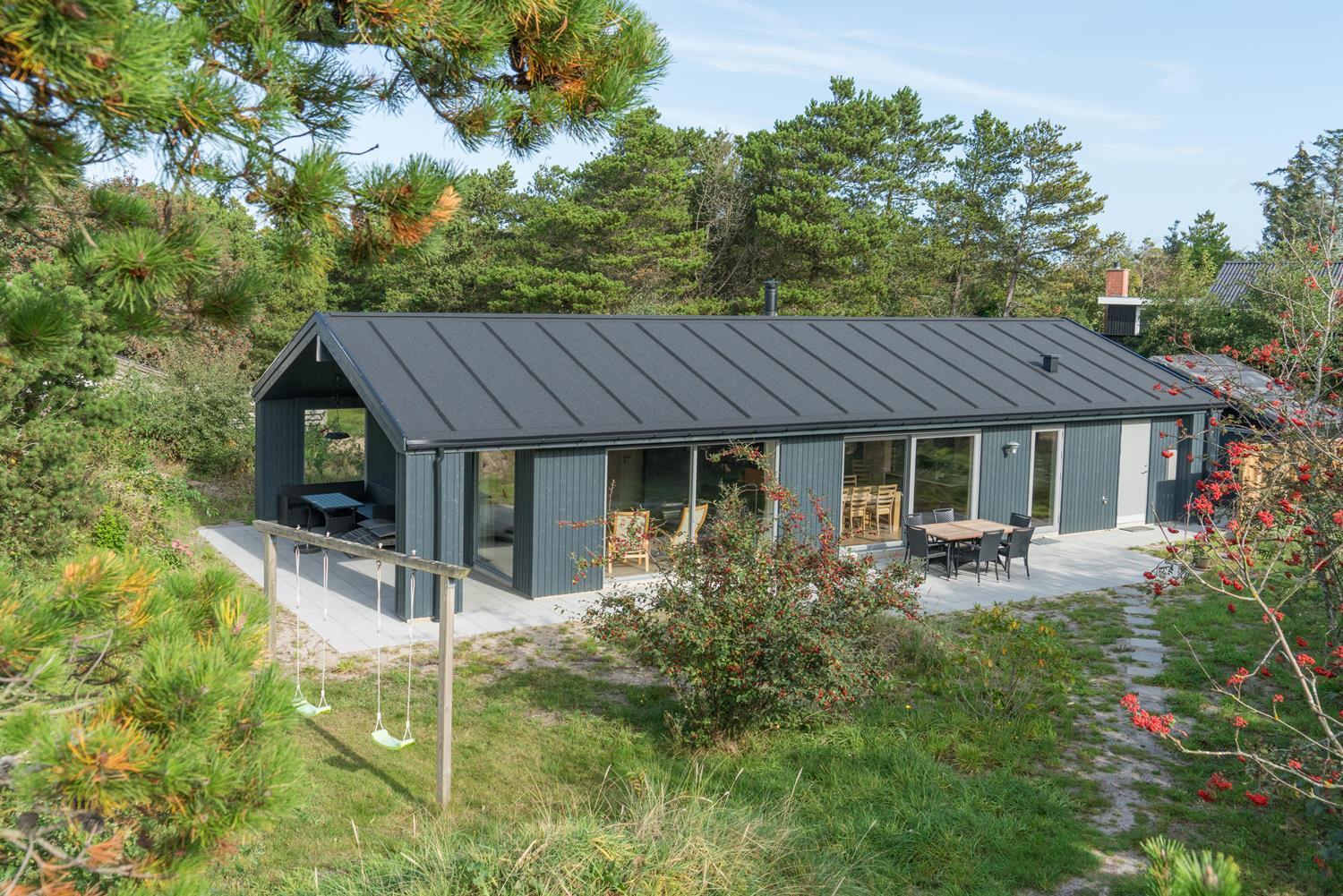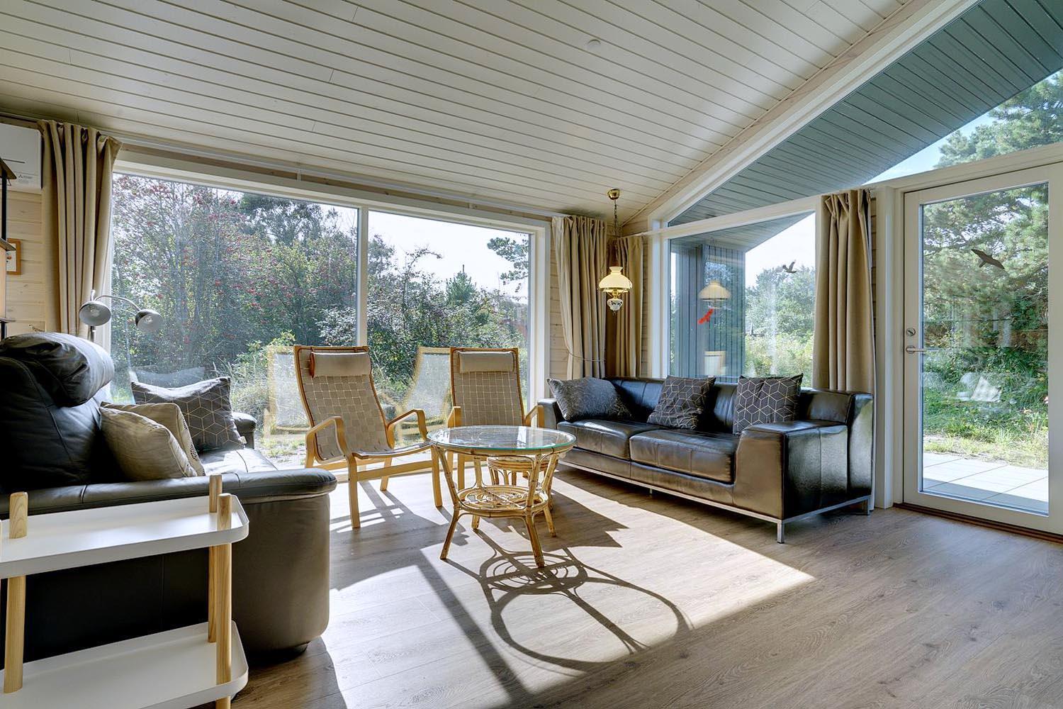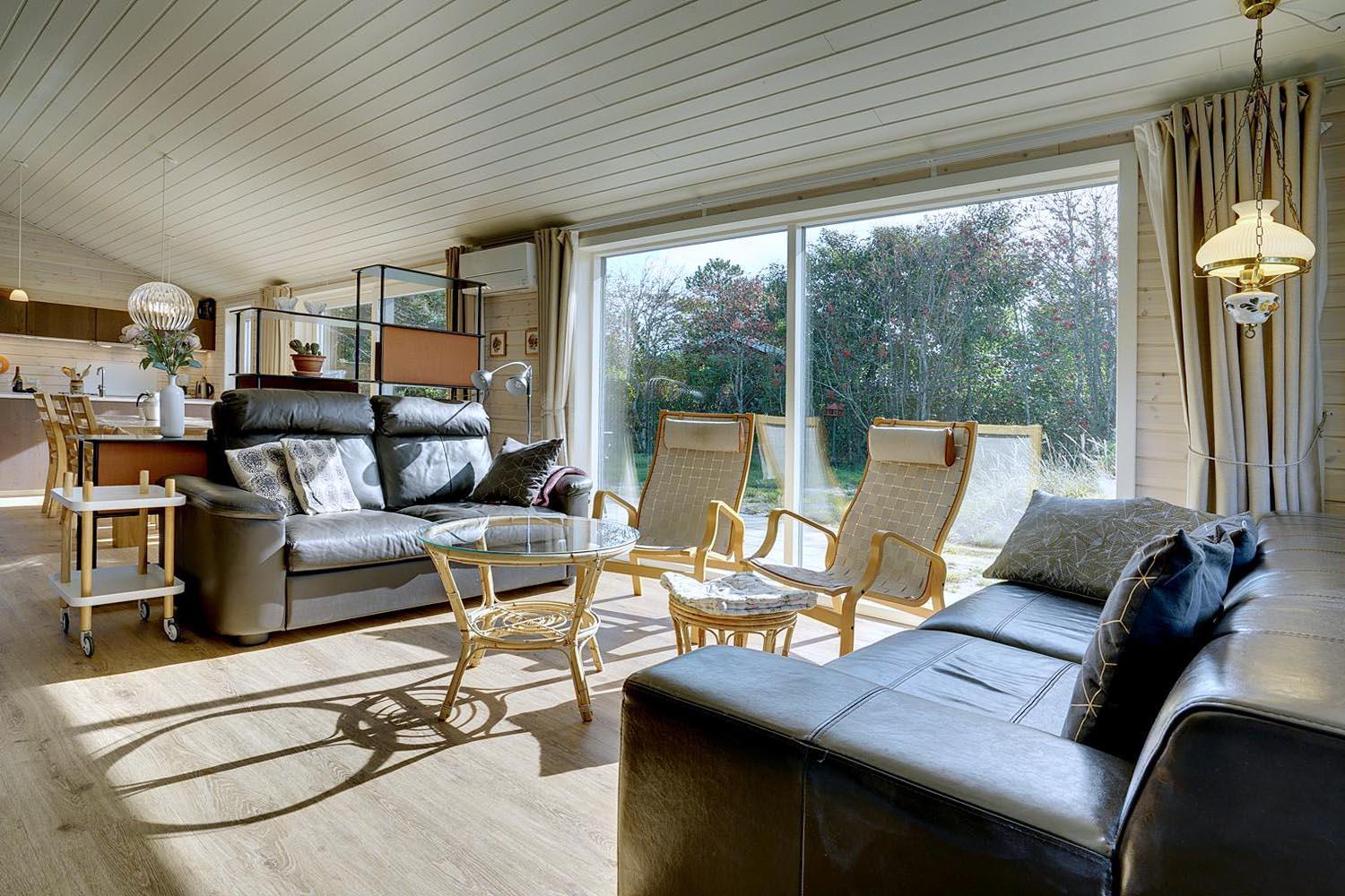 Feriehuset er opført i 2021. Lofterne går til kip, og rummene er badet i naturligt lys, som strømmer ind gennem de store vinduespartier.