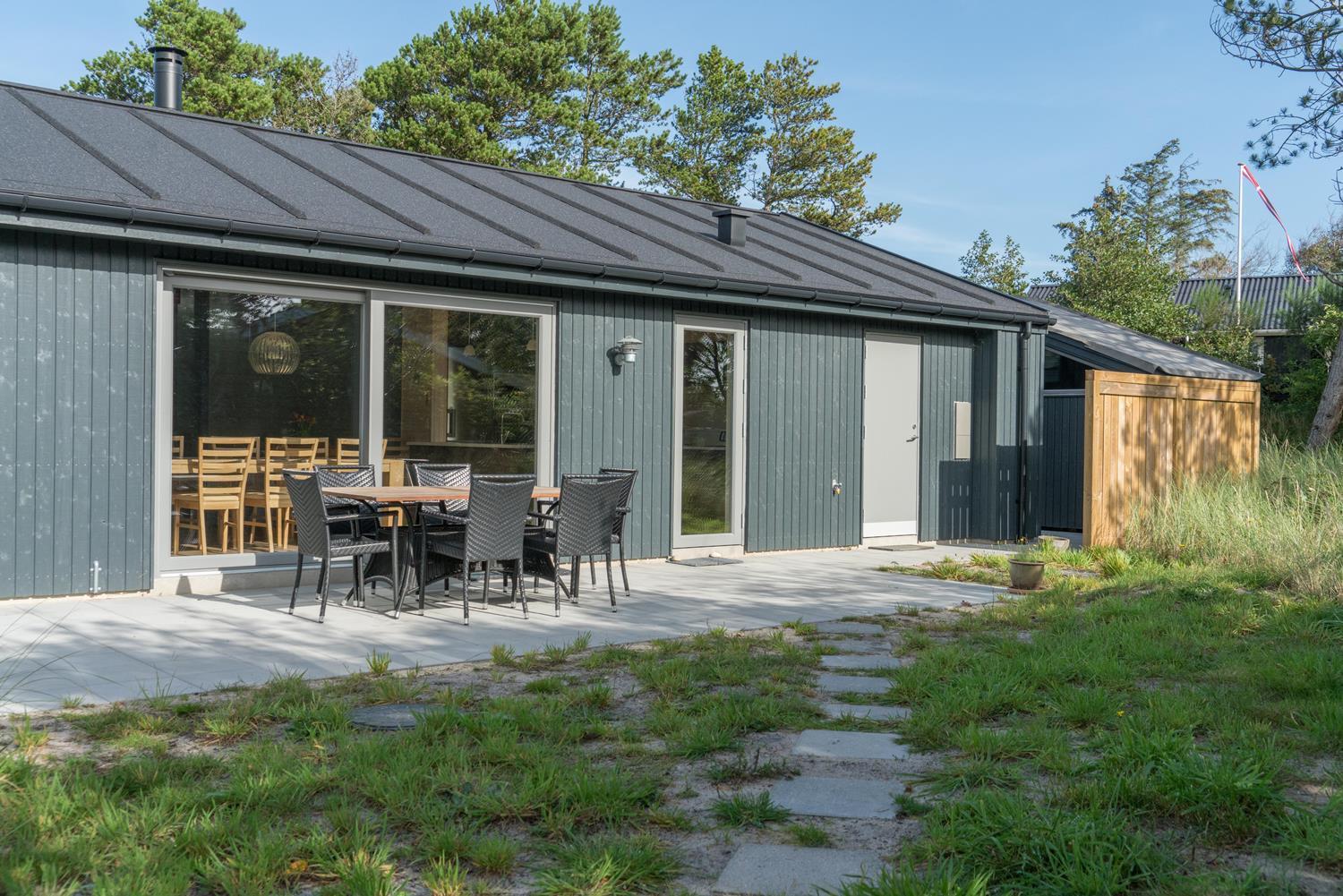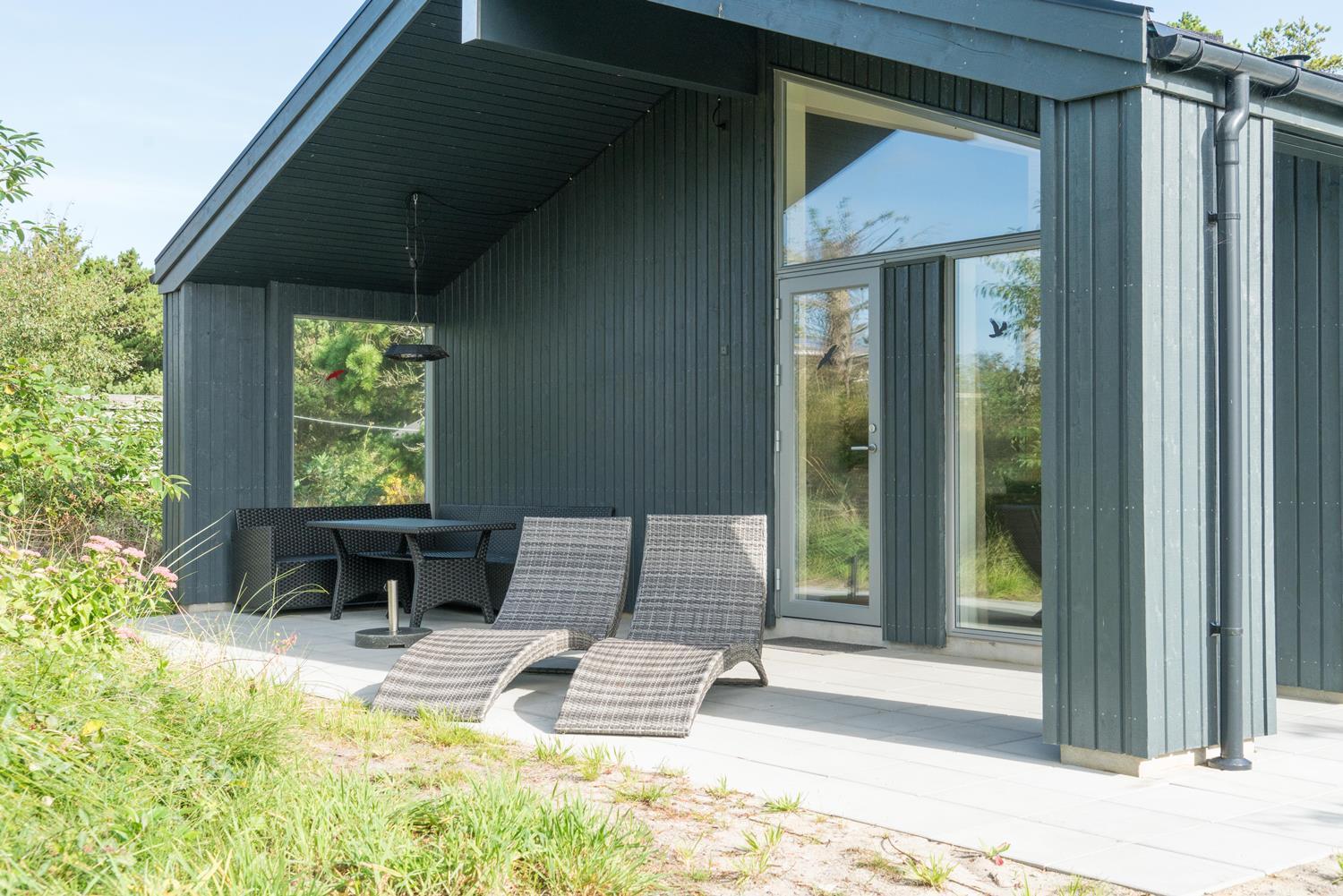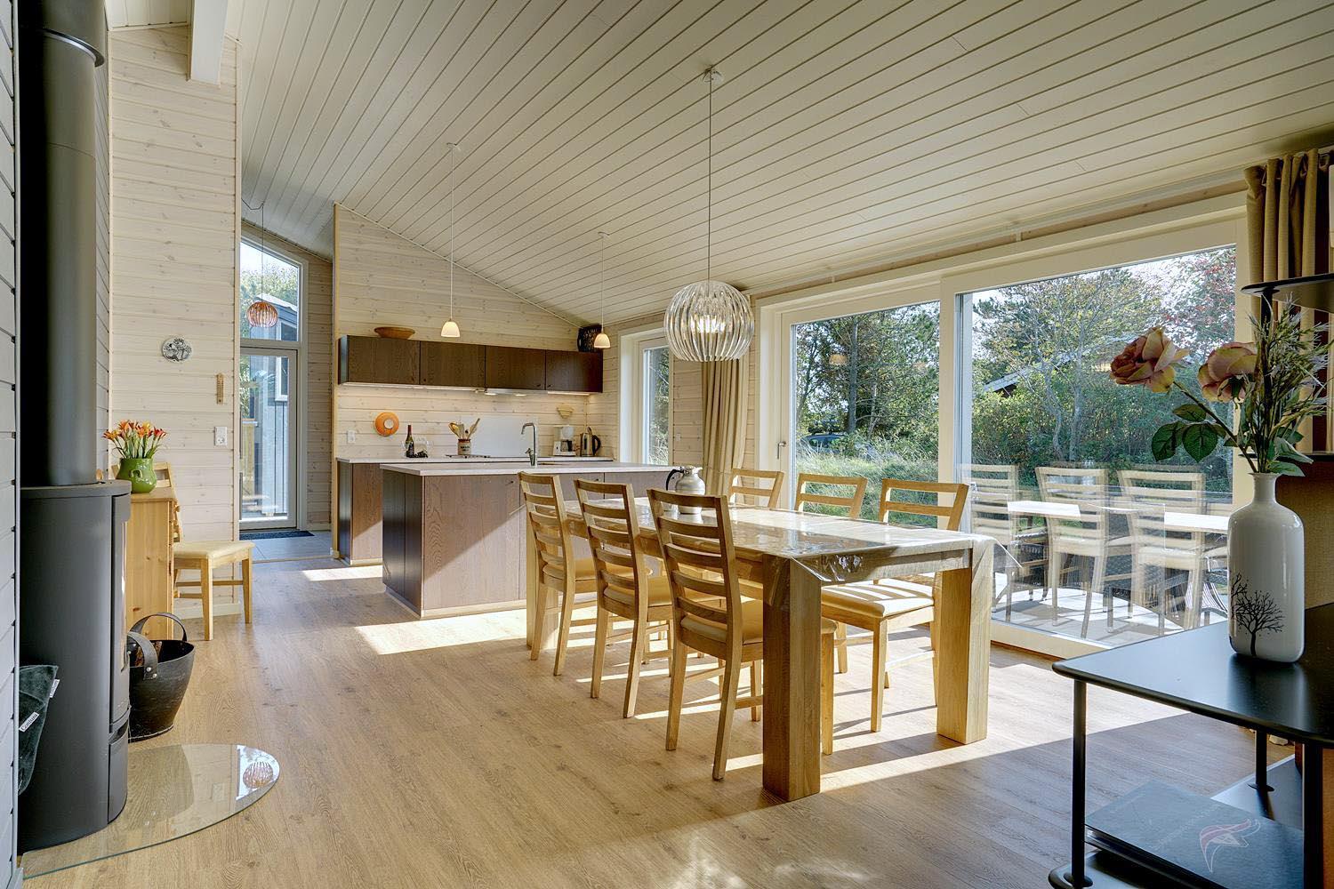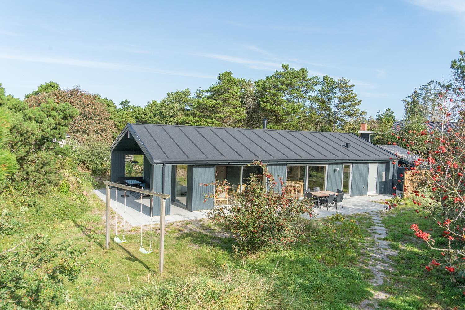 Feriehuset er opført i 2021. Lofterne går til kip, og rummene er badet i naturligt lys, som strømmer ind gennem de store vinduespartier.