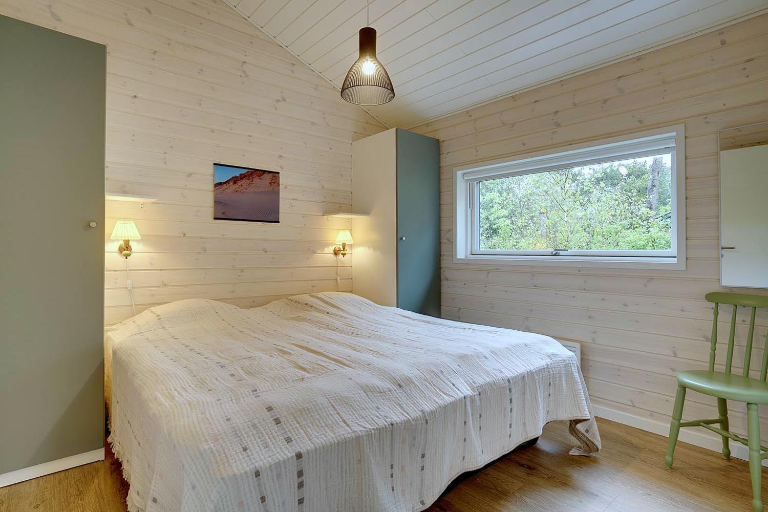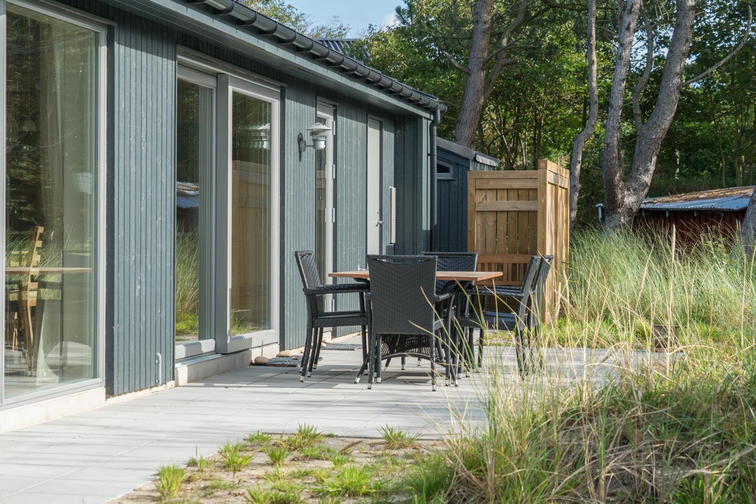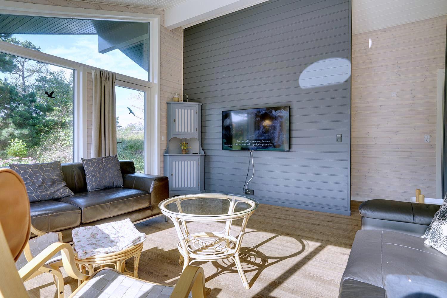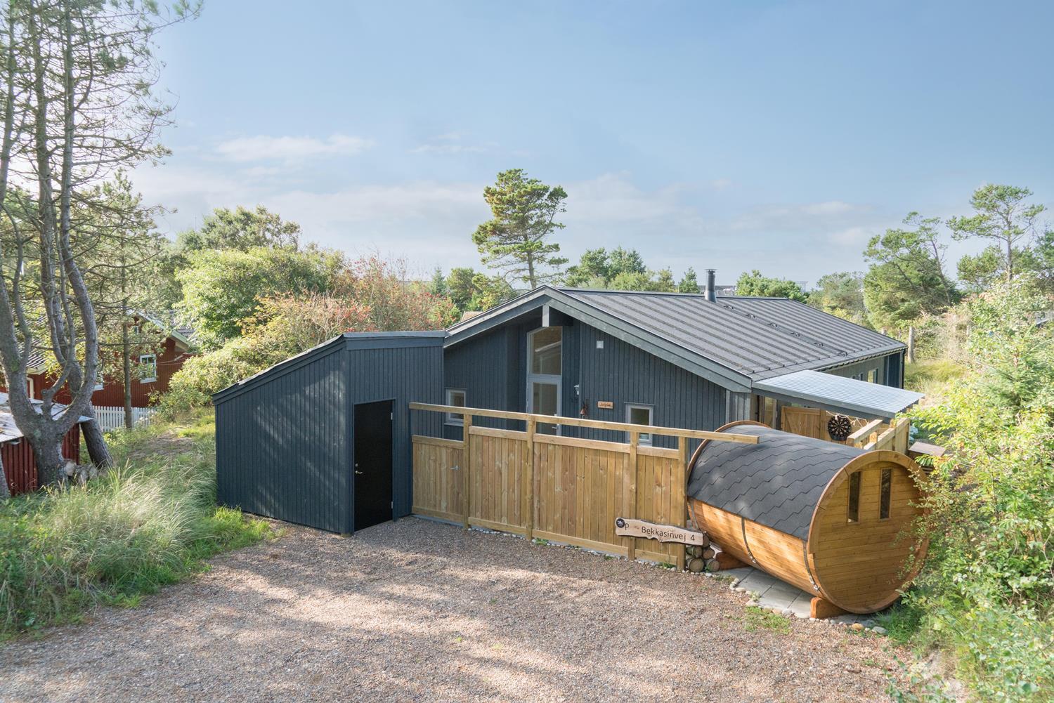 Feriehuset er opført i 2021. Lofterne går til kip, og rummene er badet i naturligt lys, som strømmer ind gennem de store vinduespartier.