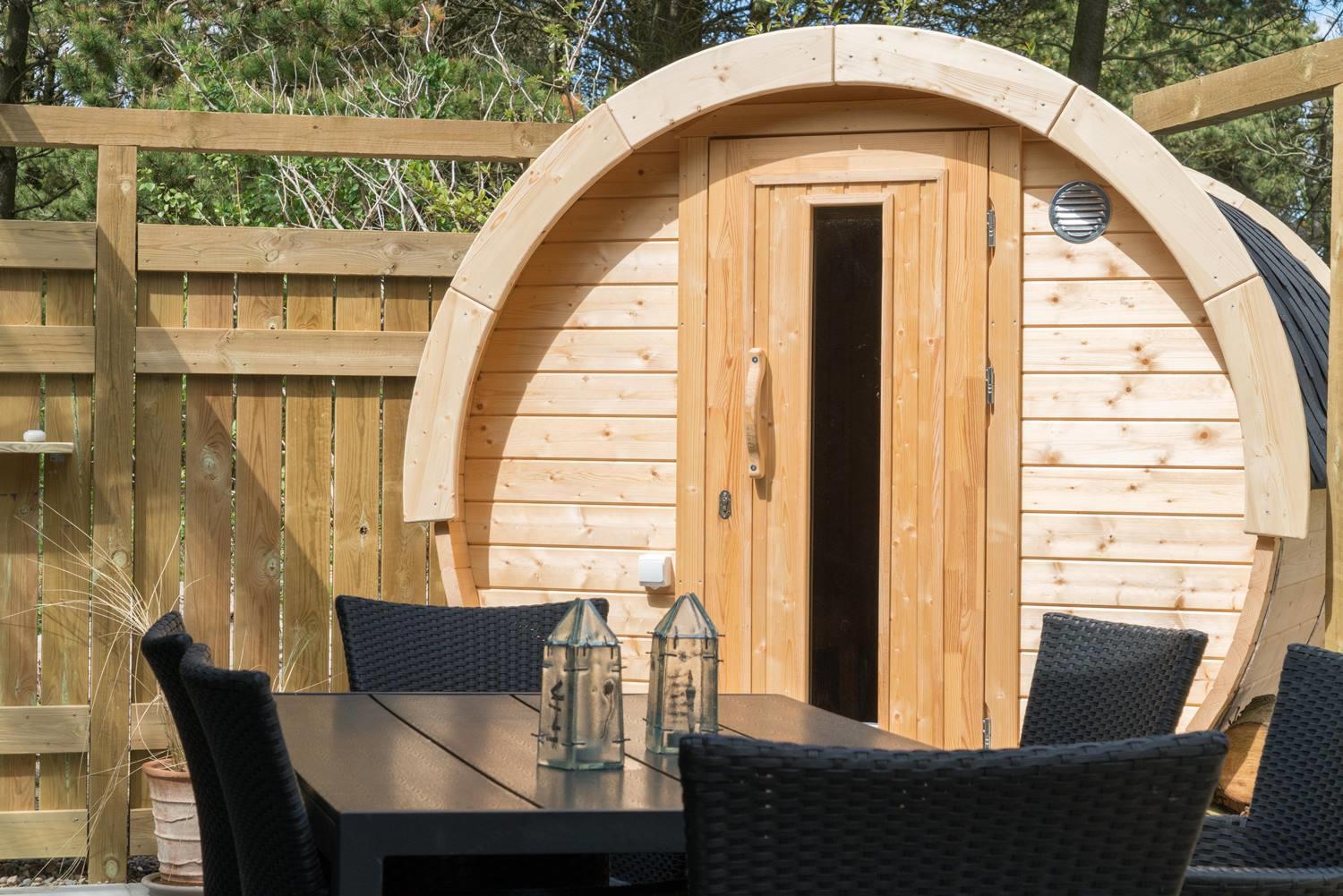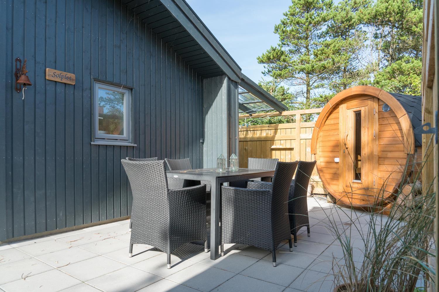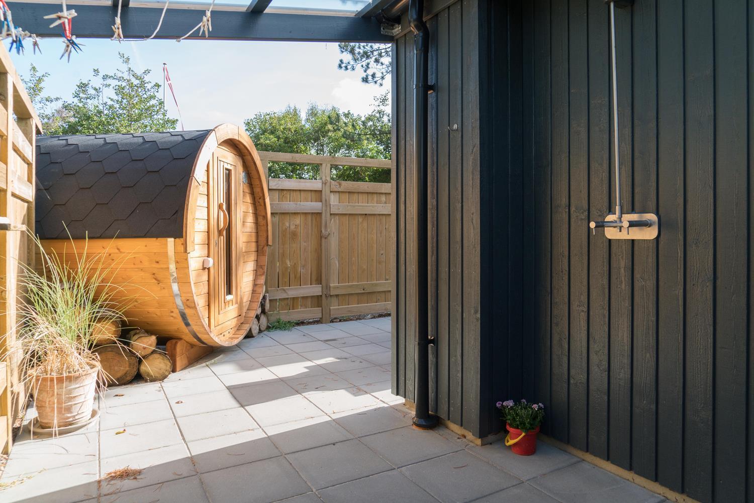 Der er udendørs sauna i forbindelse med lækkert udemiljø på endnu en terrasse.
