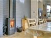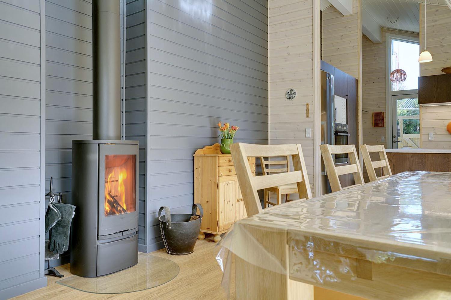 Stuen er udstyret med komfortable møbler og brændeovn. Fra stuen er der udgang til dejlige terrasser som omkranser huset, hvoraf den ene er delvis overdækket.