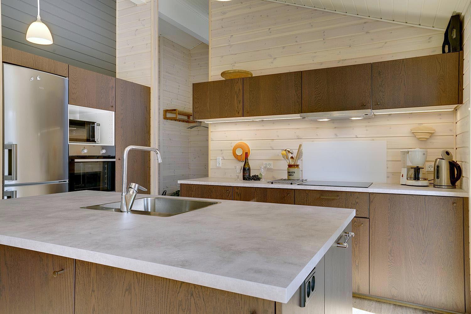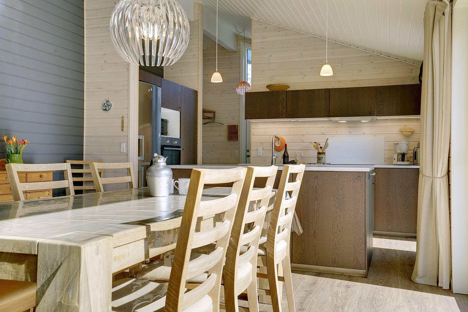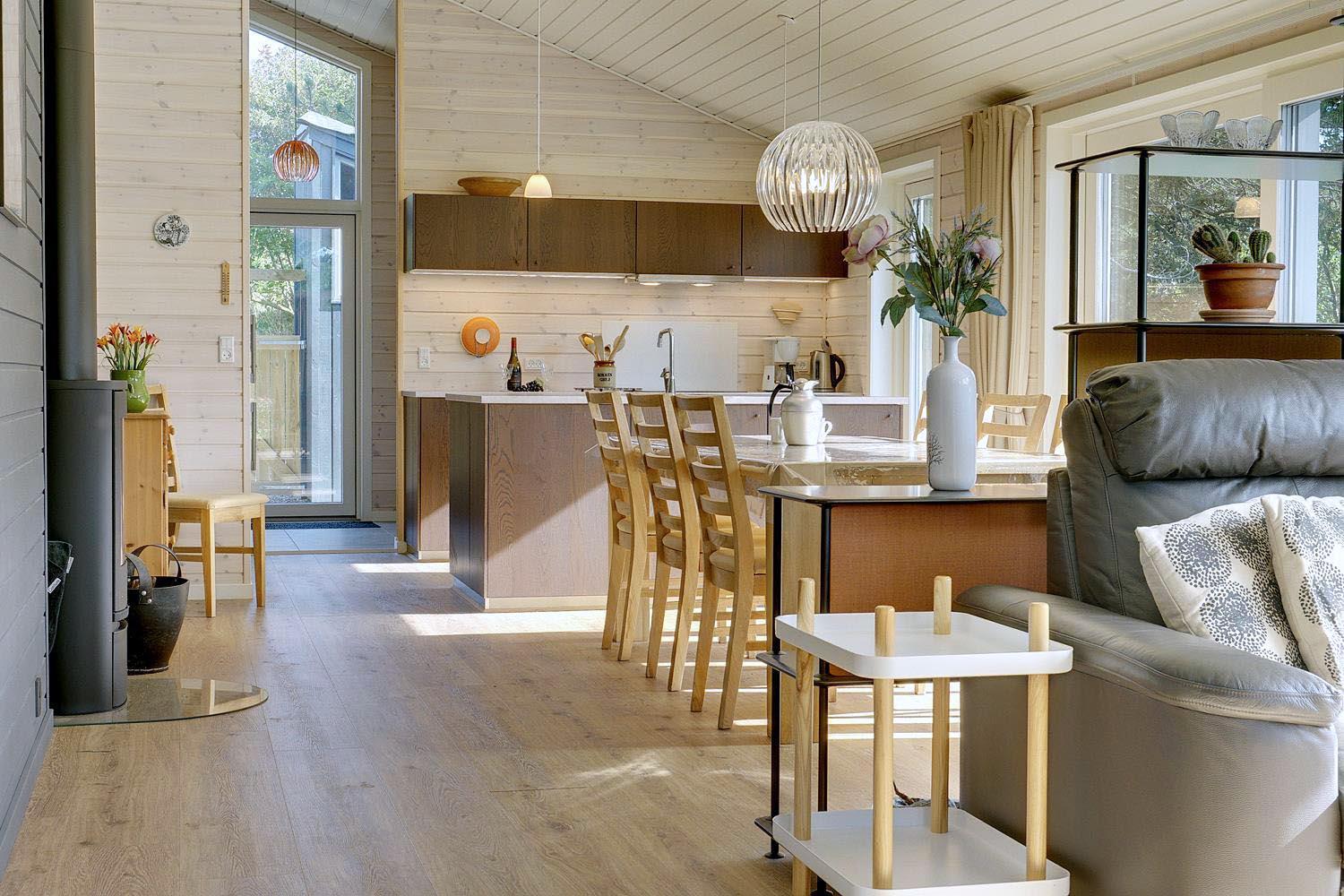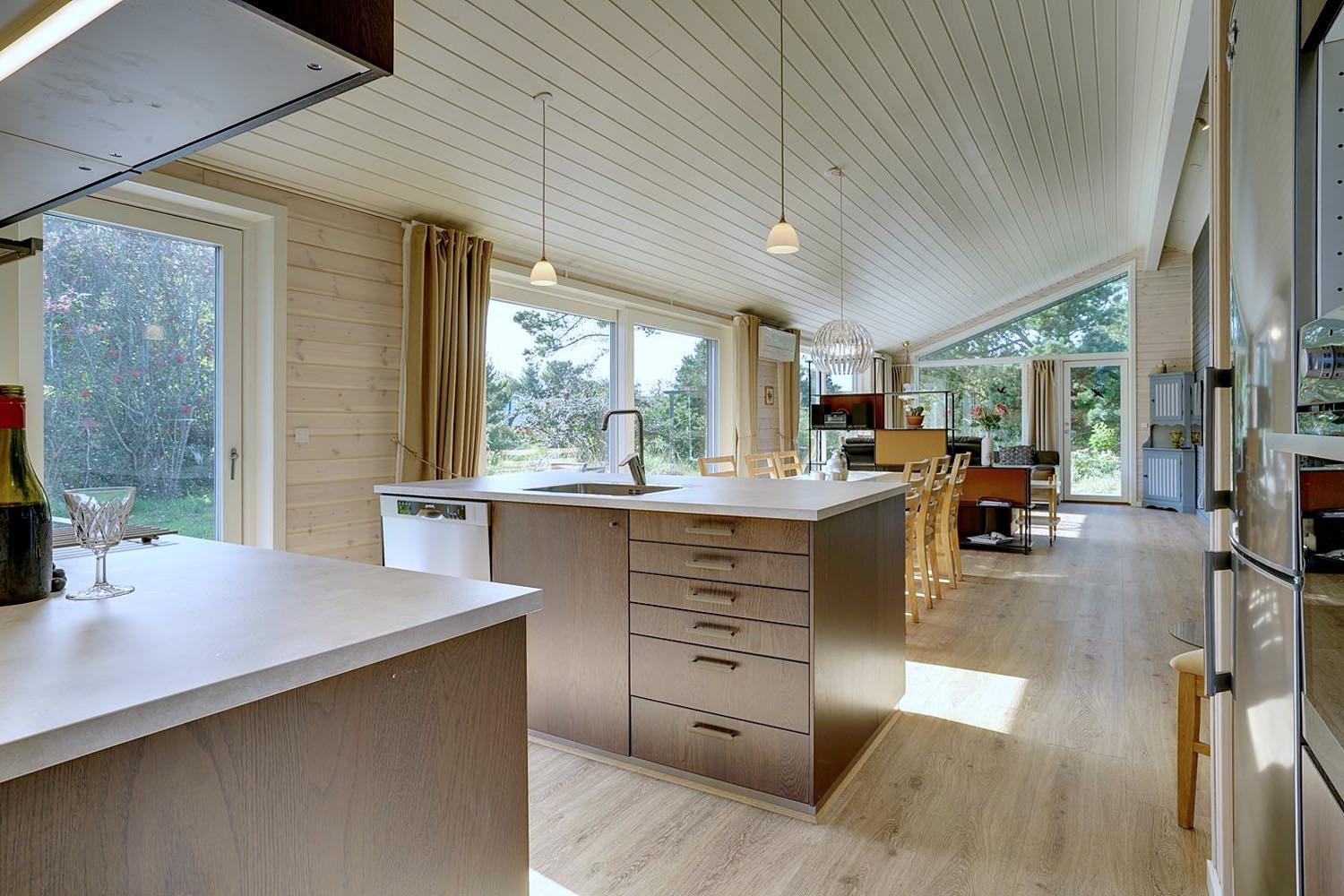 Flot køkken i åben forbindelse med stuen, og herudover byder huset på 3 soverum med seks sovepladser.