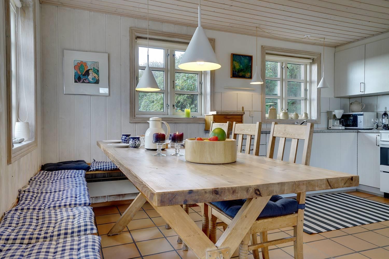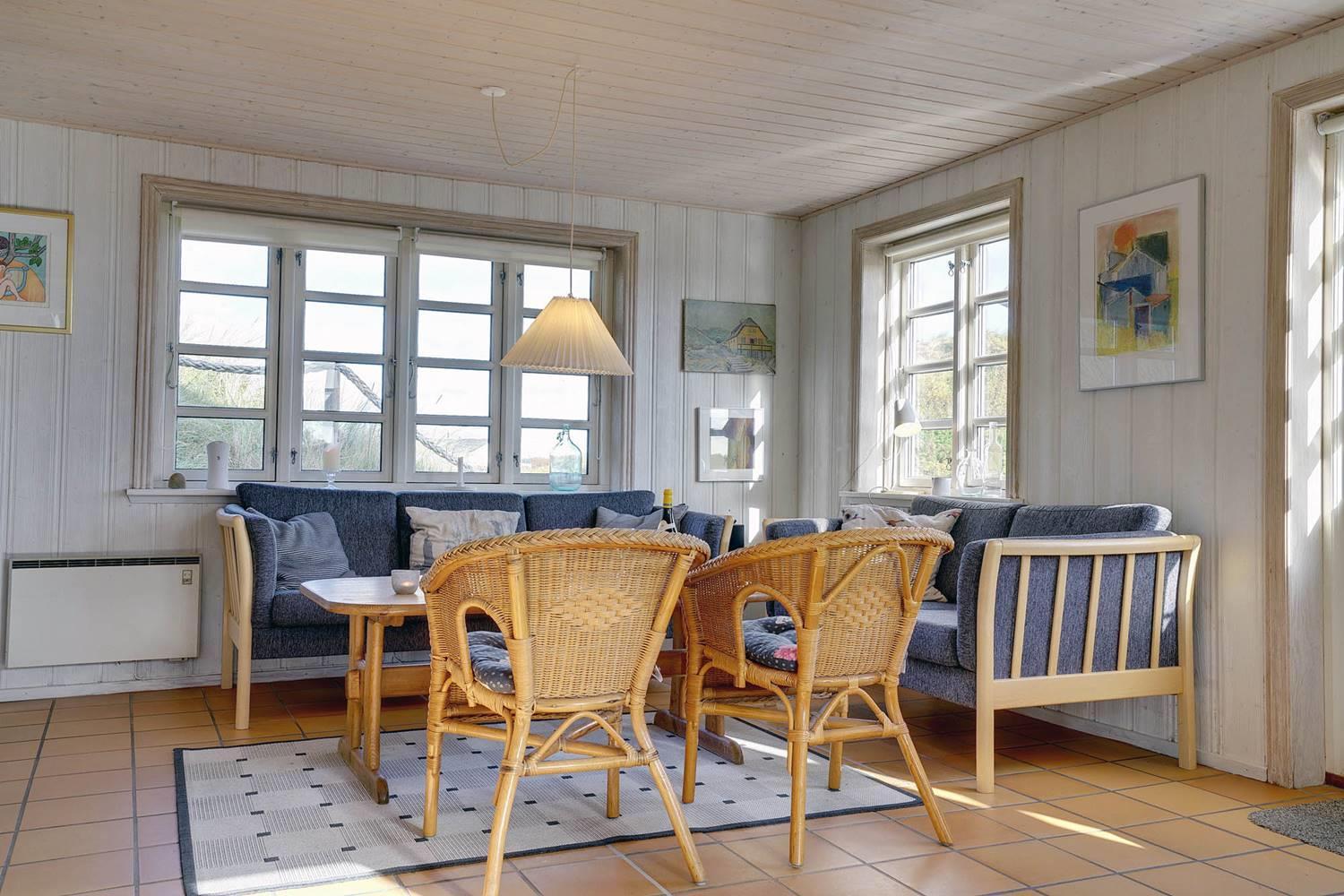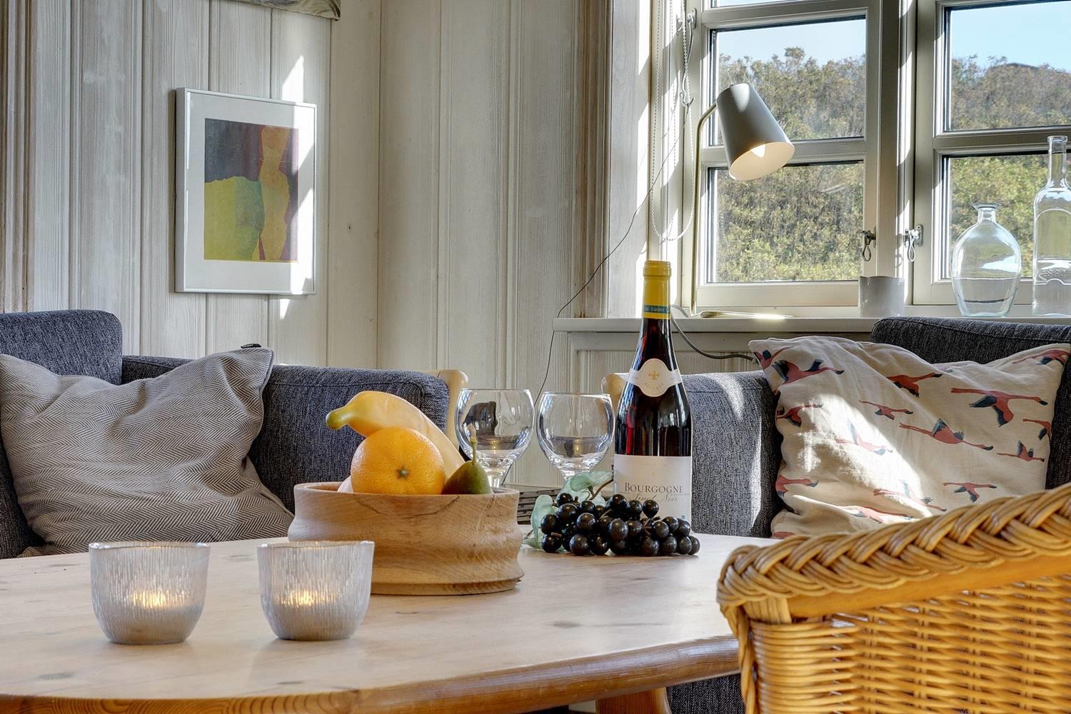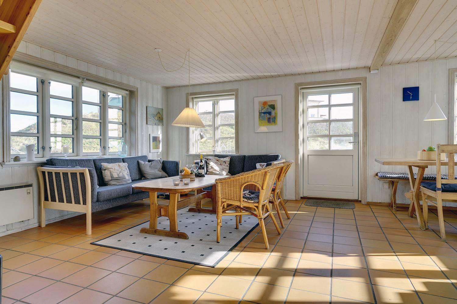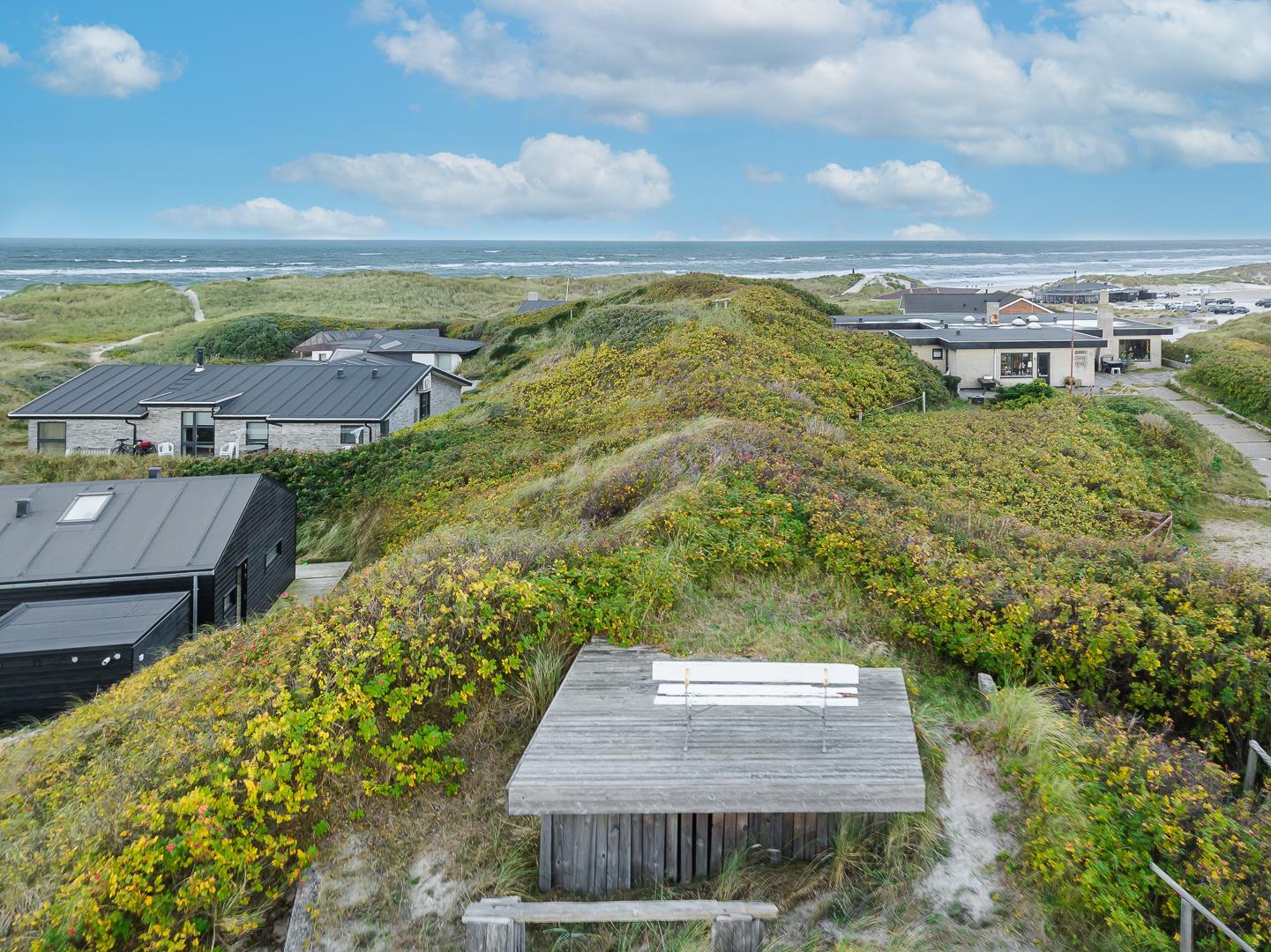 På en kuperet klitgrund ligger dette meget charmerende sommerhus med stråtag og med kun få minutters gang fra Vesterhavet og Henne Strands centrum.