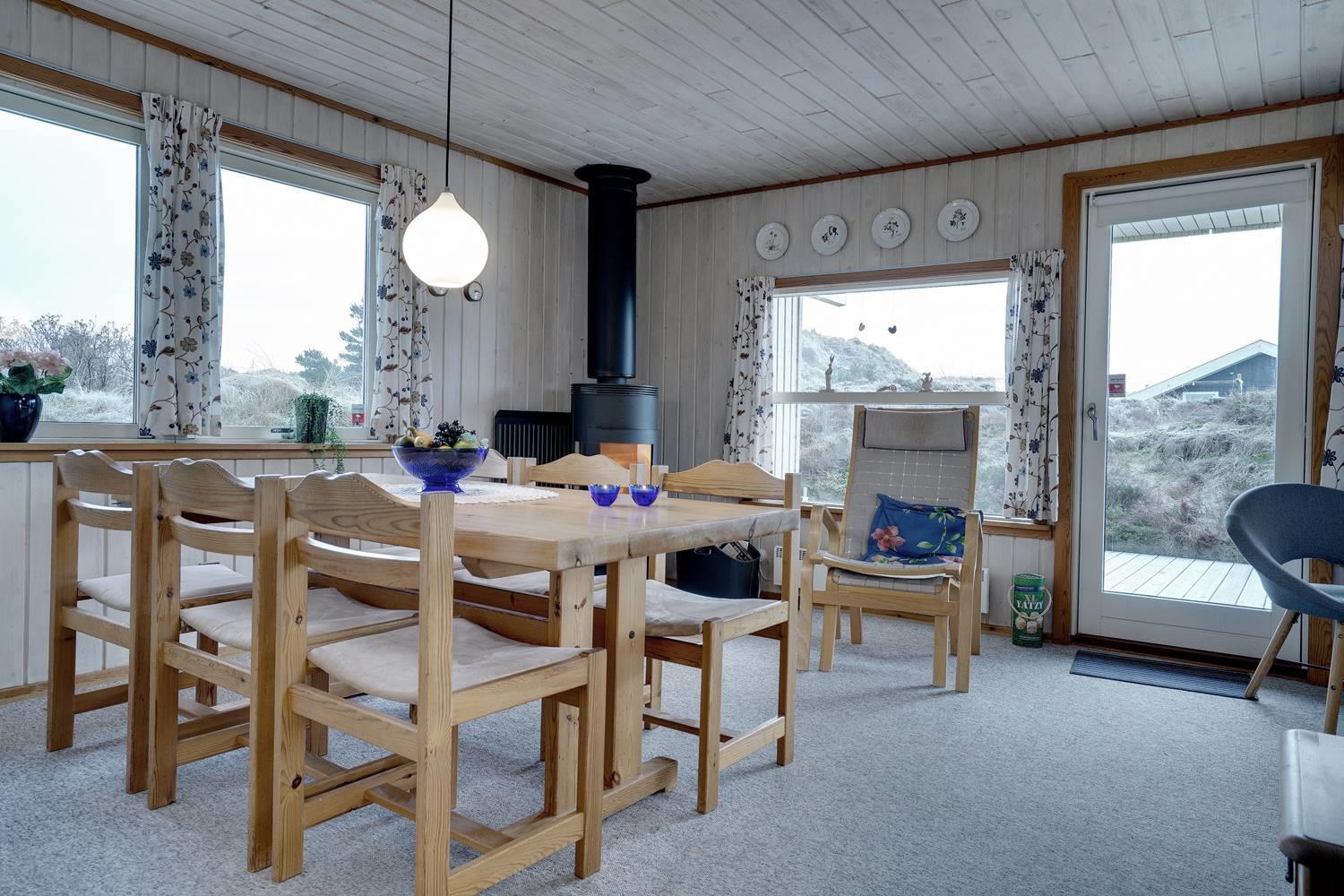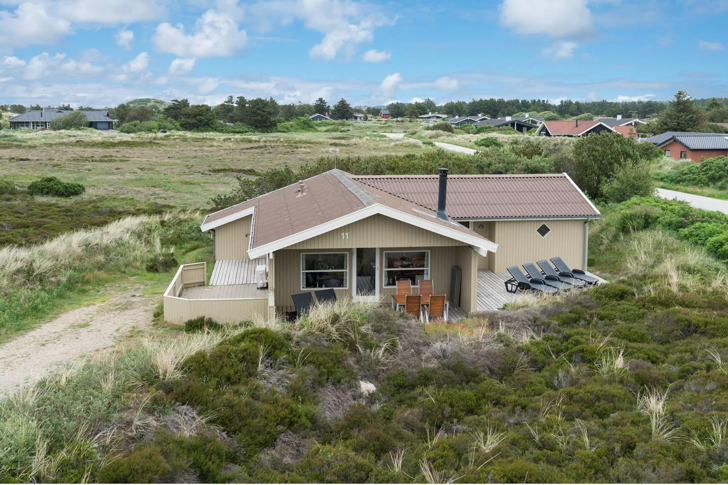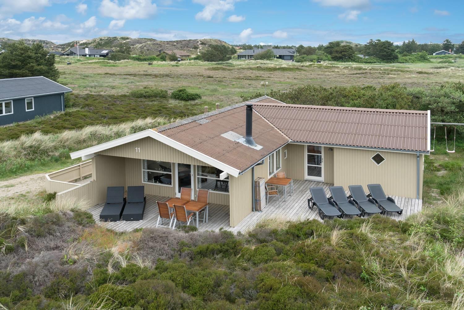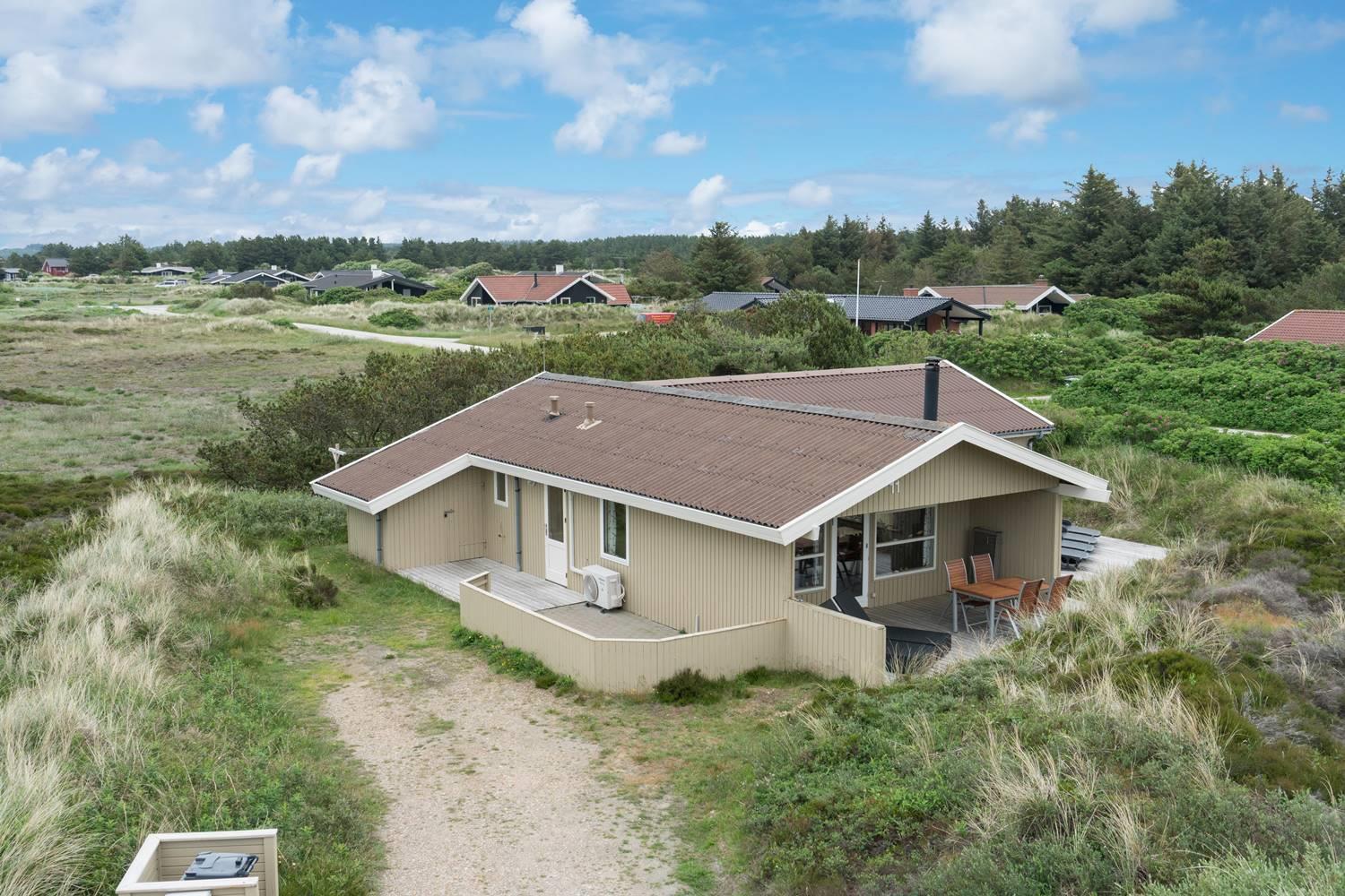 Dejligt feriehus med to flotte badeværelser, det ene med spabad og det andet med sauna. Tre gode soveværelser alle med dobbeltsenge. De store terrasser rundt om huset giver perfekte muligheder for at nyde solen hele dagen. Huset ligger tæt på de store fredede klit- og lyngarealer, hvor I kan gå lange ture. Der er alarmanlæg i huset.