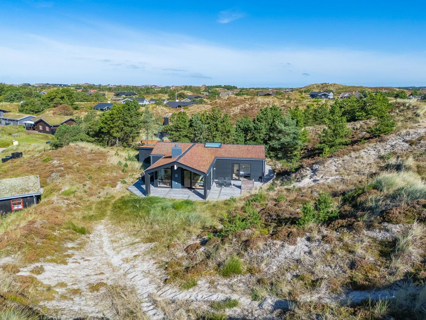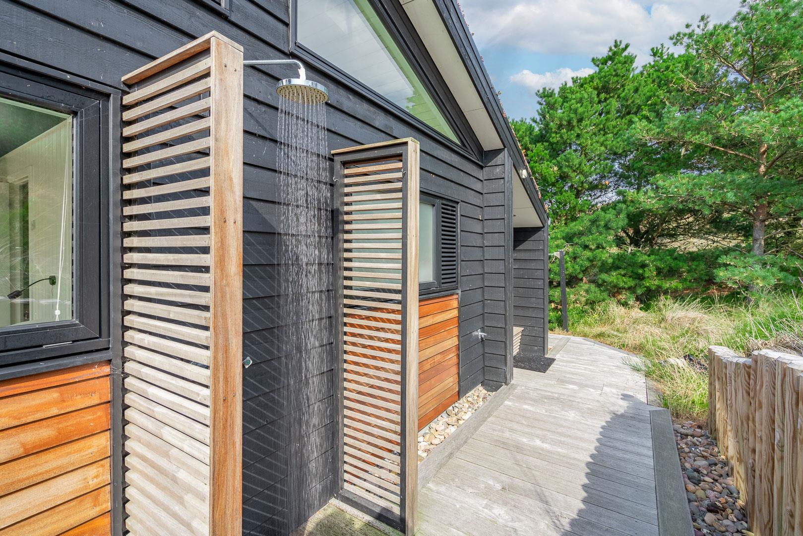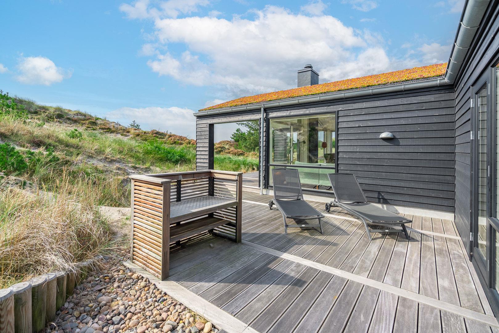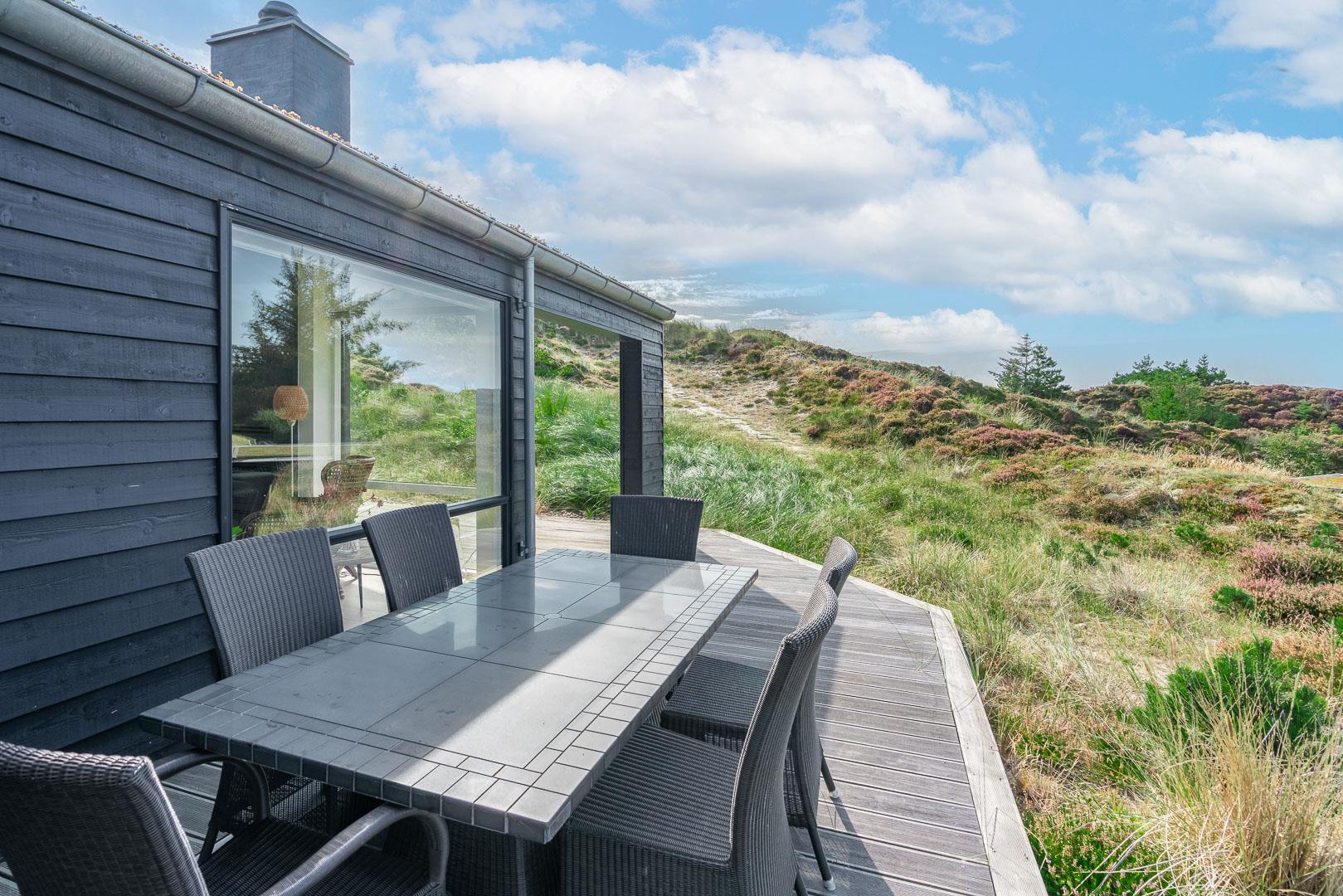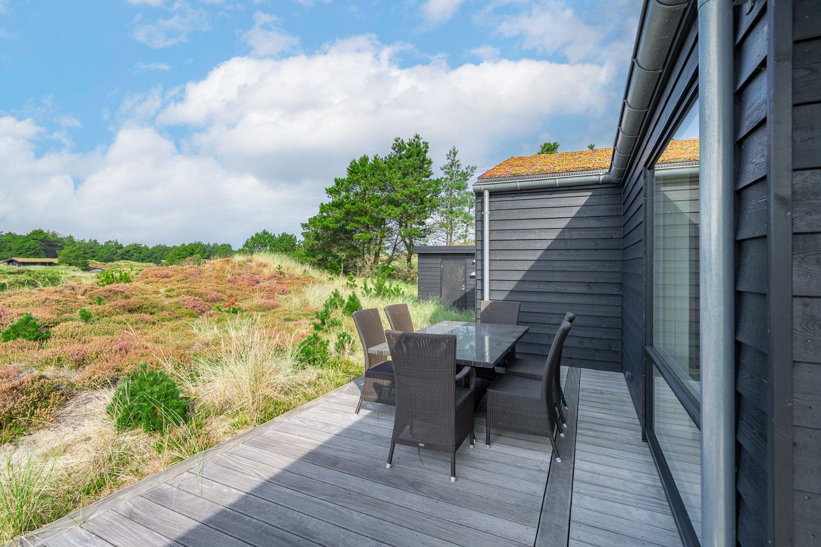 Fremhæves skal træterrassen som omkranser huset og som er delvis overdækket og med udebruse. I læ fra den store klit er der rig mulighed for at finde læ og hvor solens stråler kan nydes i fulde drag.