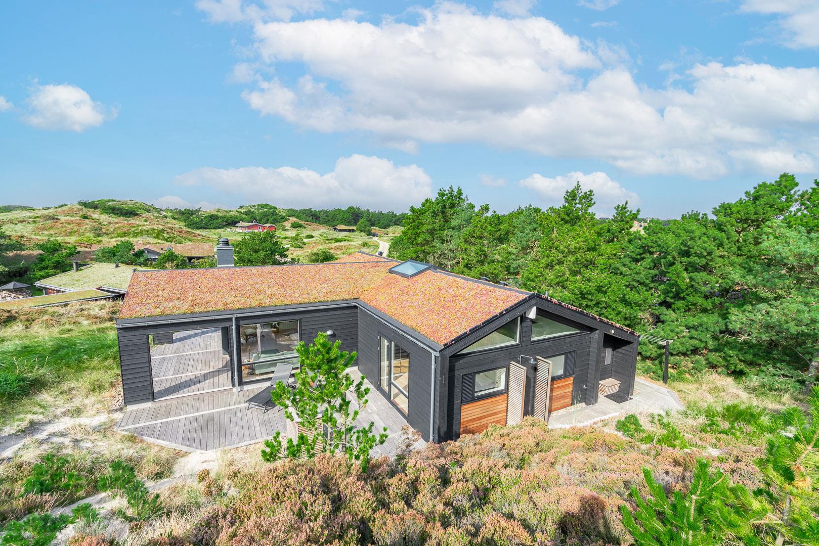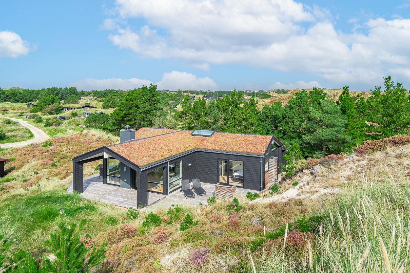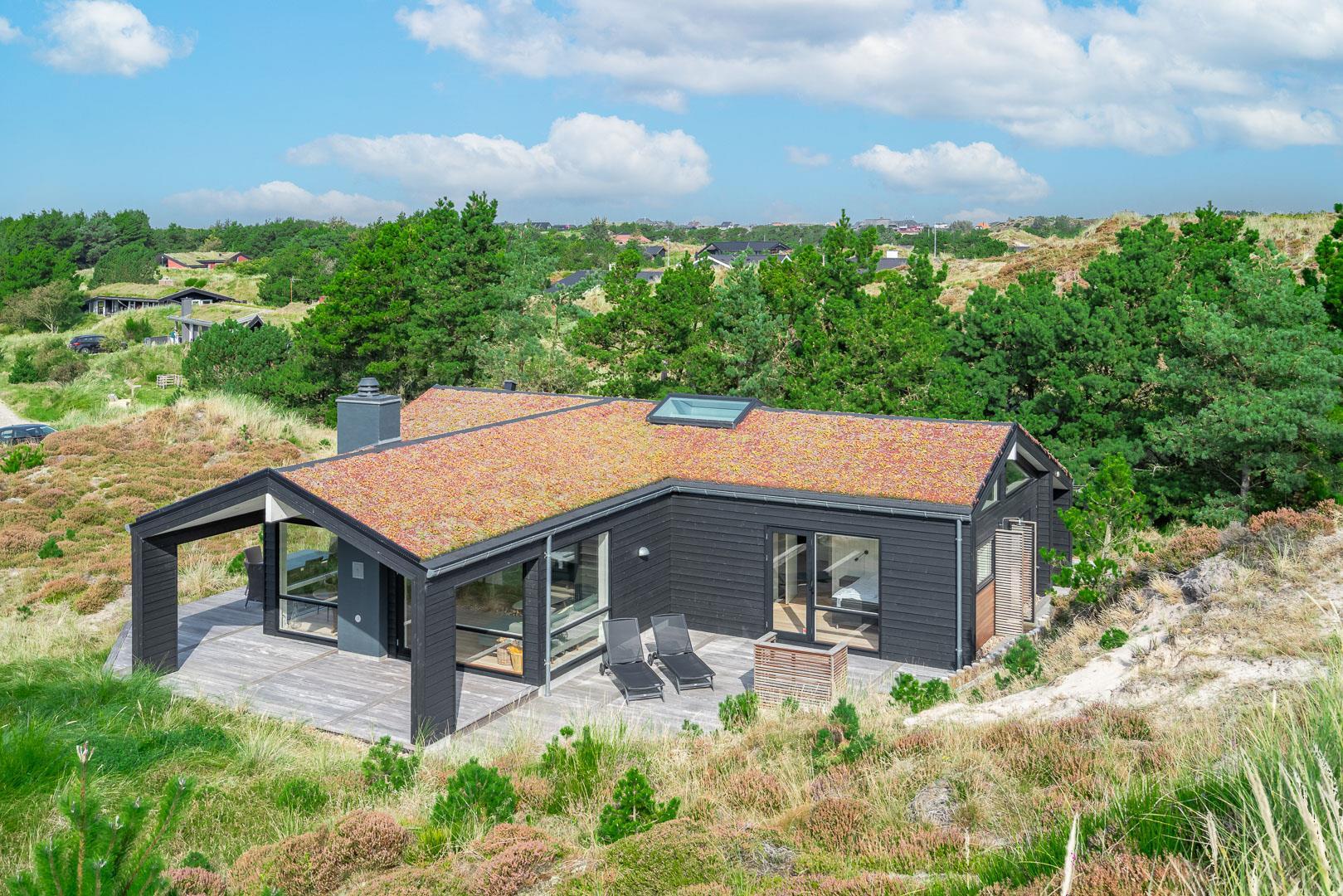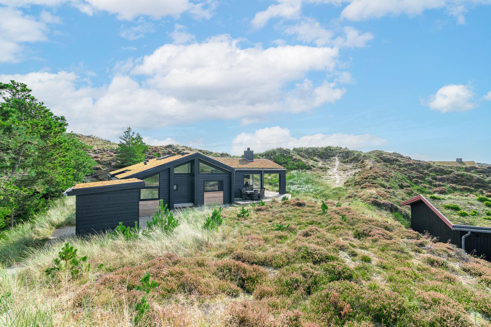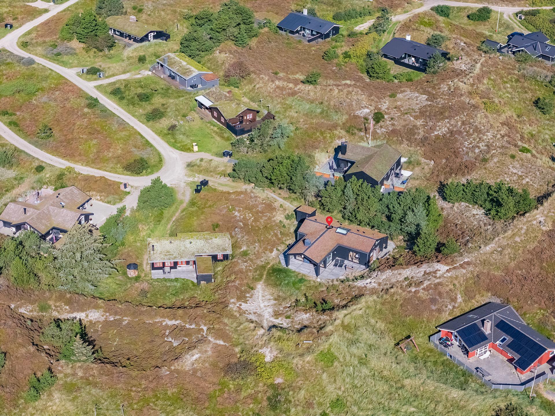 Fremhæves skal træterrassen som omkranser huset og som er delvis overdækket og med udebruse. I læ fra den store klit er der rig mulighed for at finde læ og hvor solens stråler kan nydes i fulde drag.