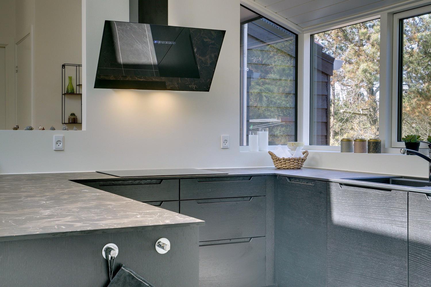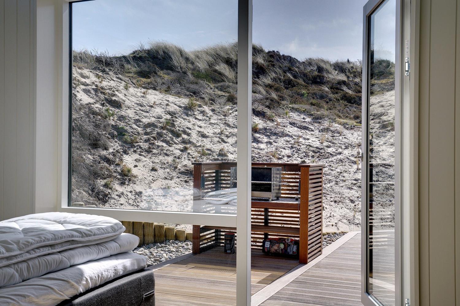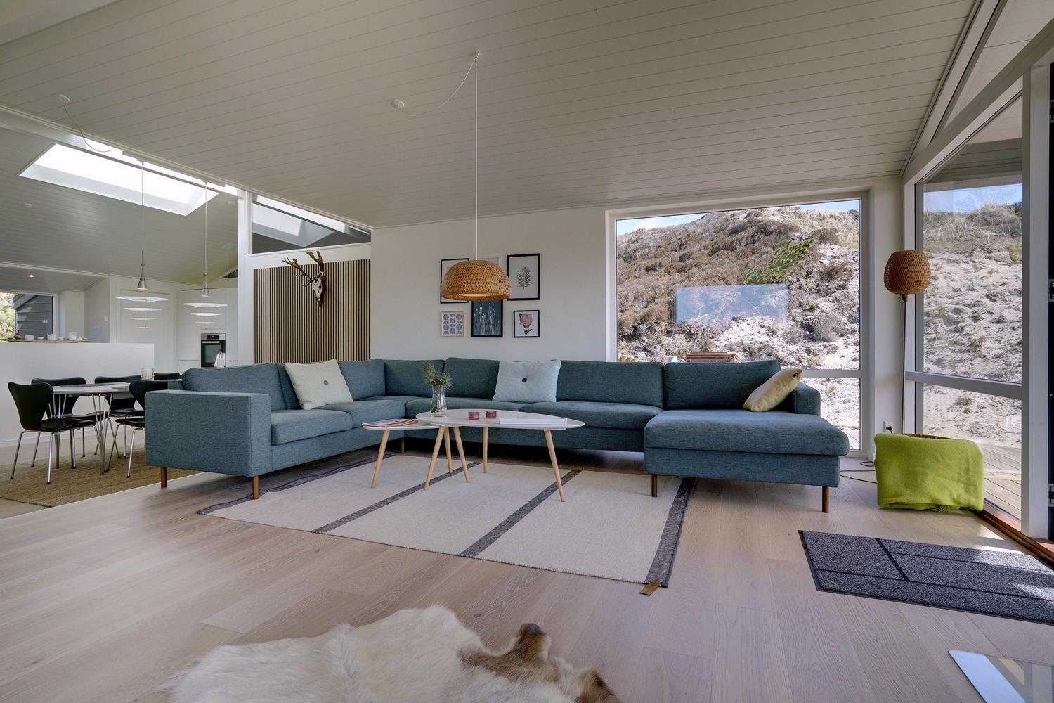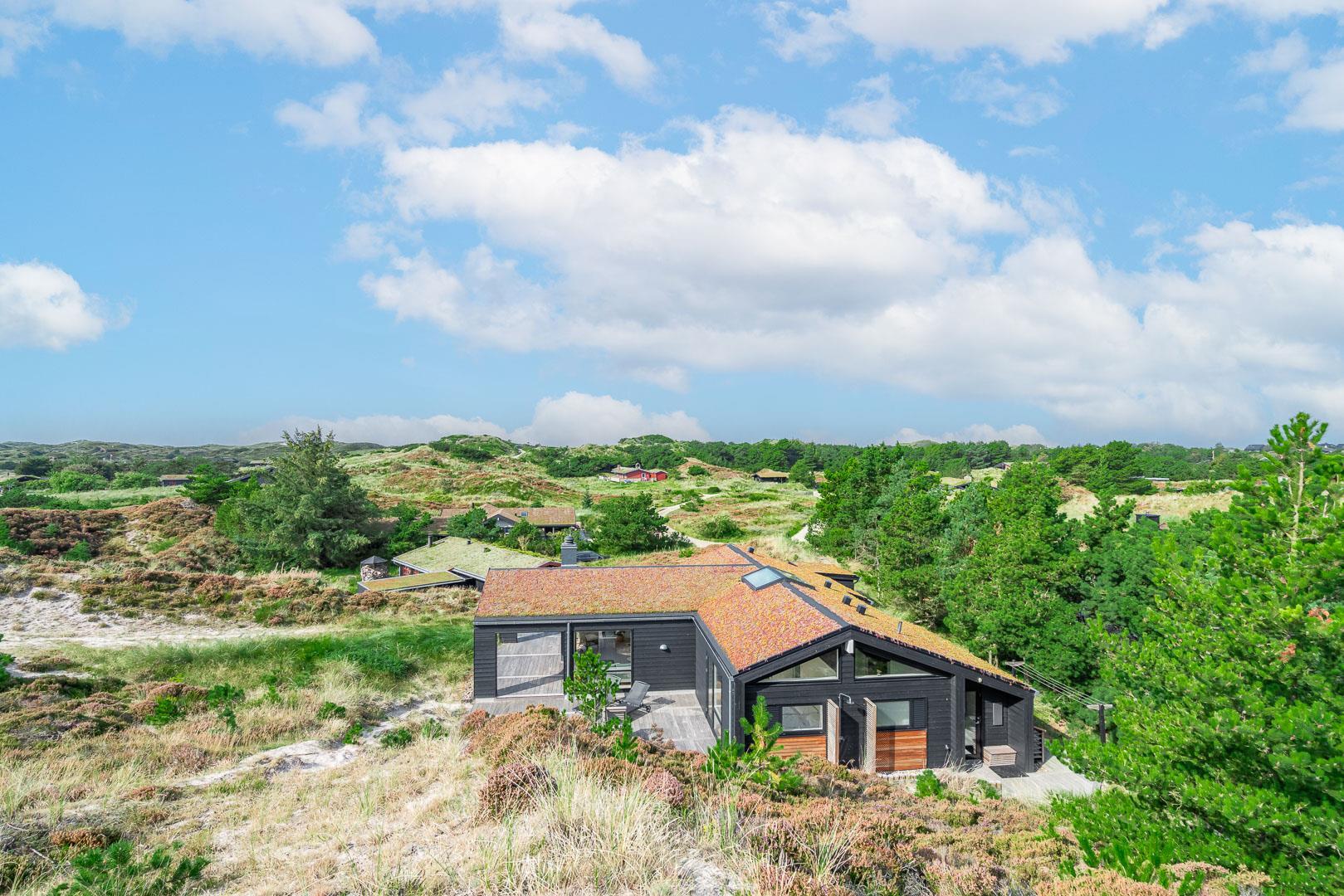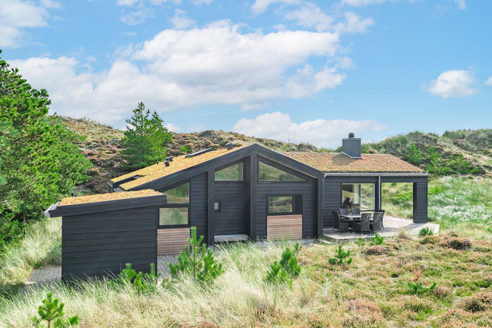 Fremhæves skal træterrassen som omkranser huset og som er delvis overdækket og med udebruse. I læ fra den store klit er der rig mulighed for at finde læ og hvor solens stråler kan nydes i fulde drag.
