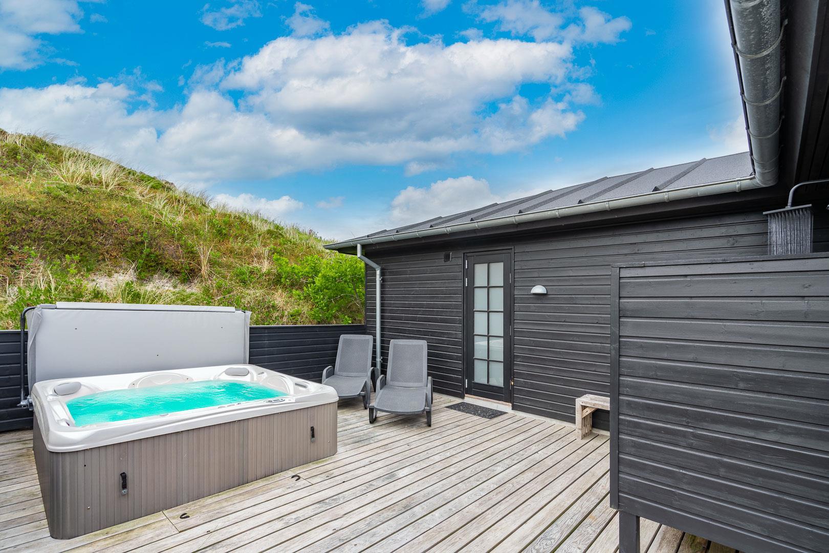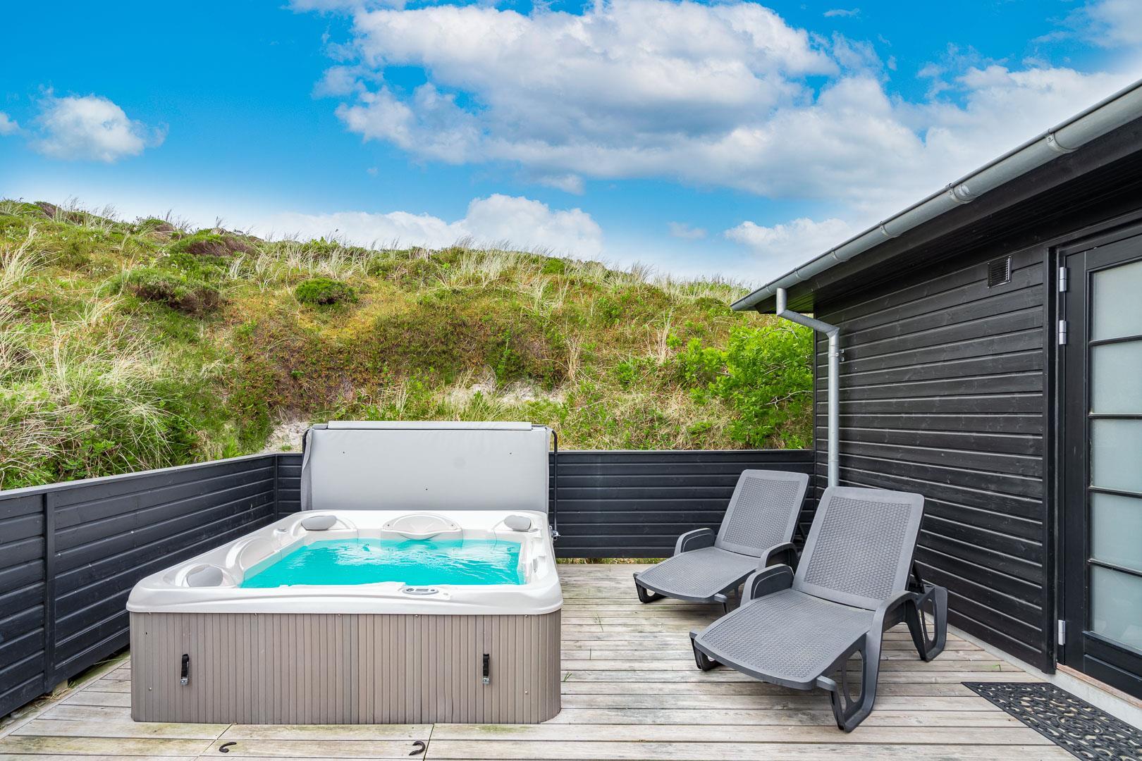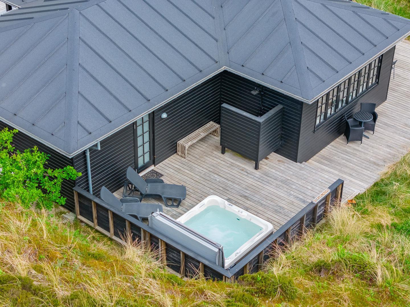 Udenfor kan du nyde solen og den imponerende udsigt fra den store og lækre træterrasse, hvor liggestole og udespaen inviterer til ren afslapning. Dette sommerhus er simpelthen det perfekte tilflugtssted i Henne Strand - et sandt paradis! Med kort afstand til stranden, Henne Strands byliv og naturskønne omgivelser, er dette sommerhus på Gyvelvej 15 en fantastisk ferieoplevelse.