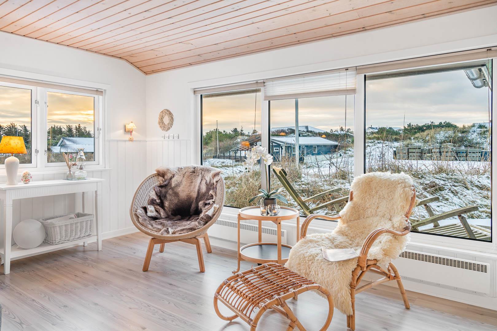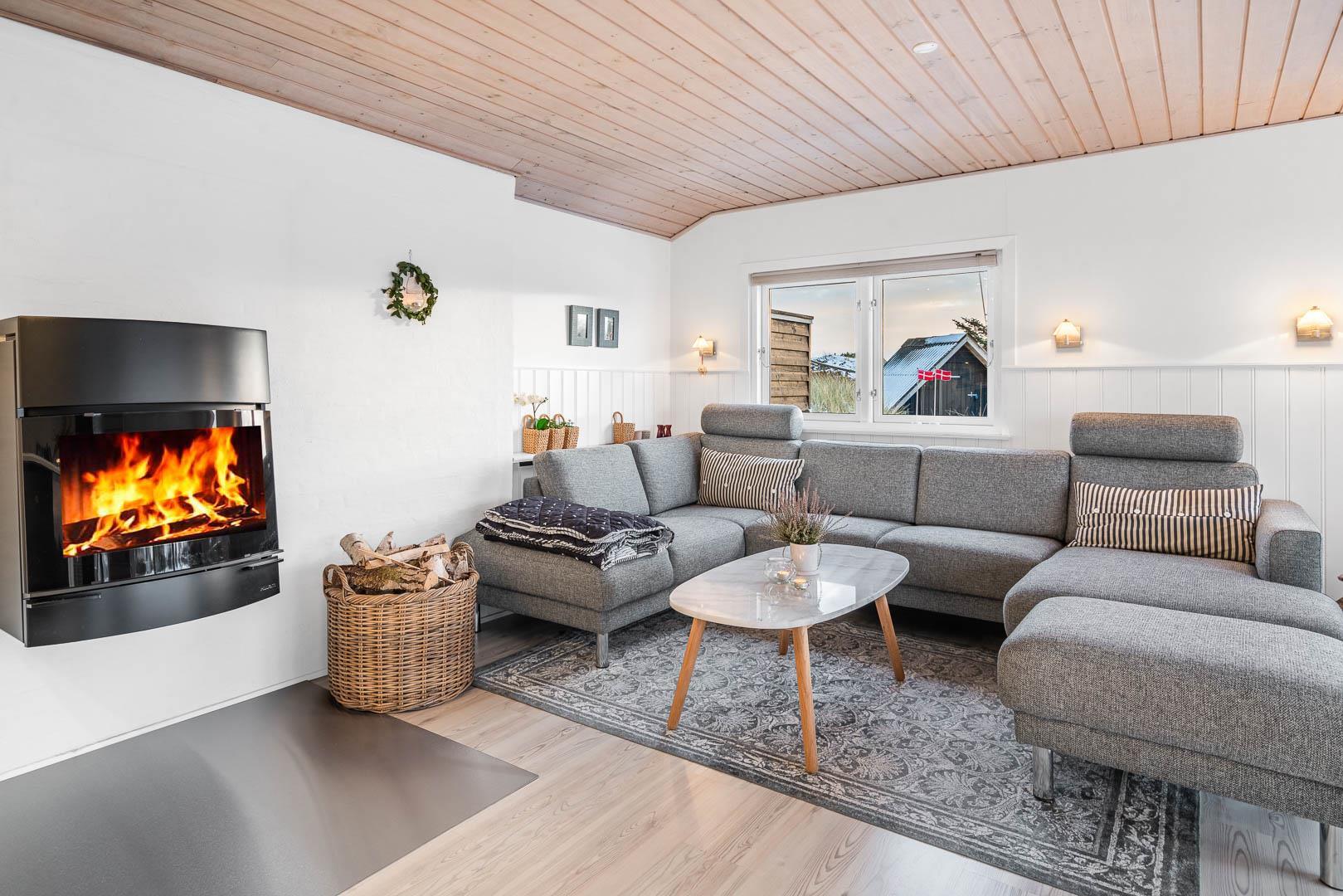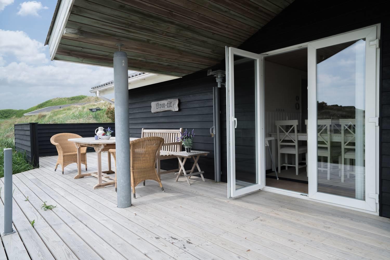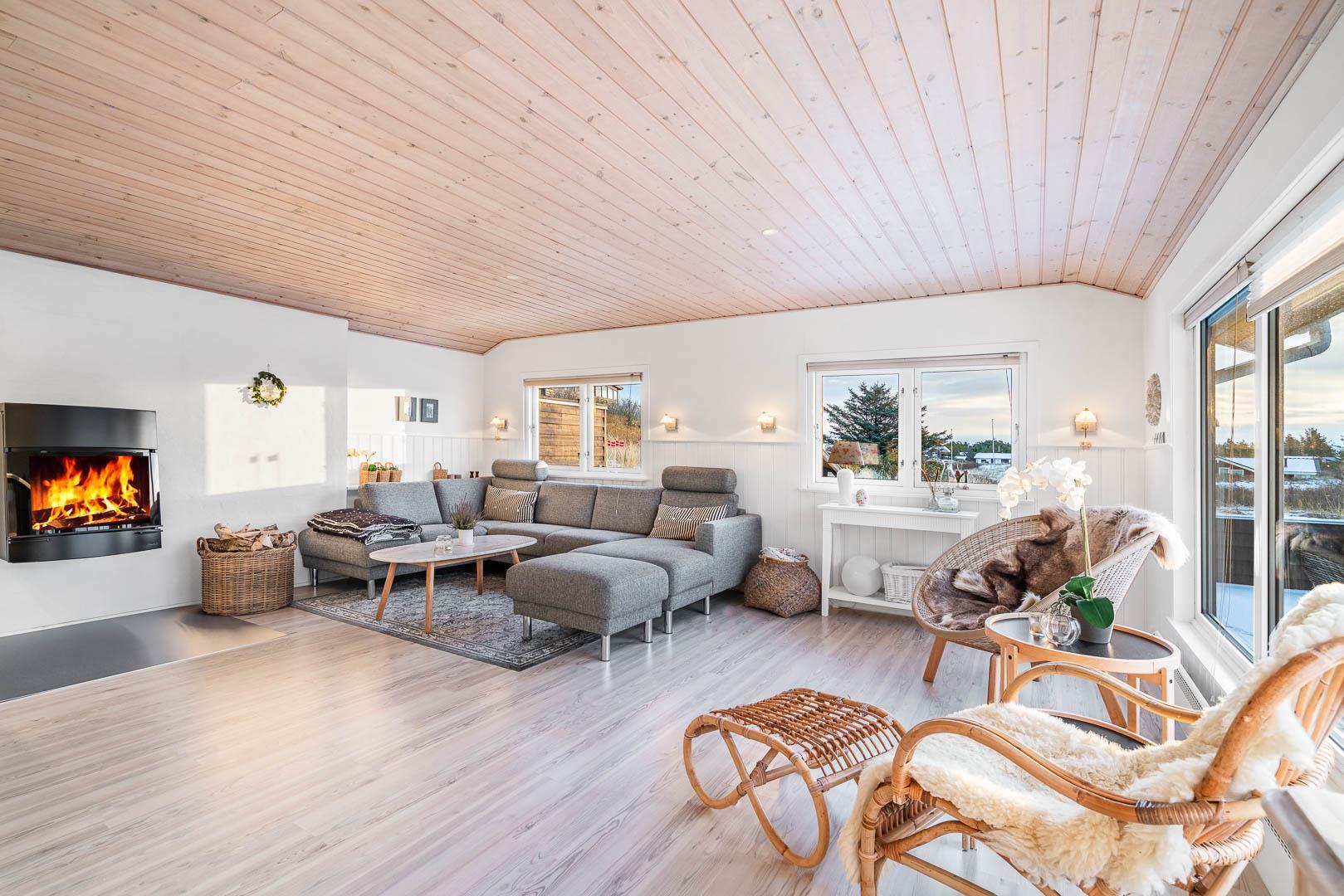 Flot og lyst feriehus på klitgrund nær havet i Henne Strand, perfekt til en hyggelig ferie for fire personer.