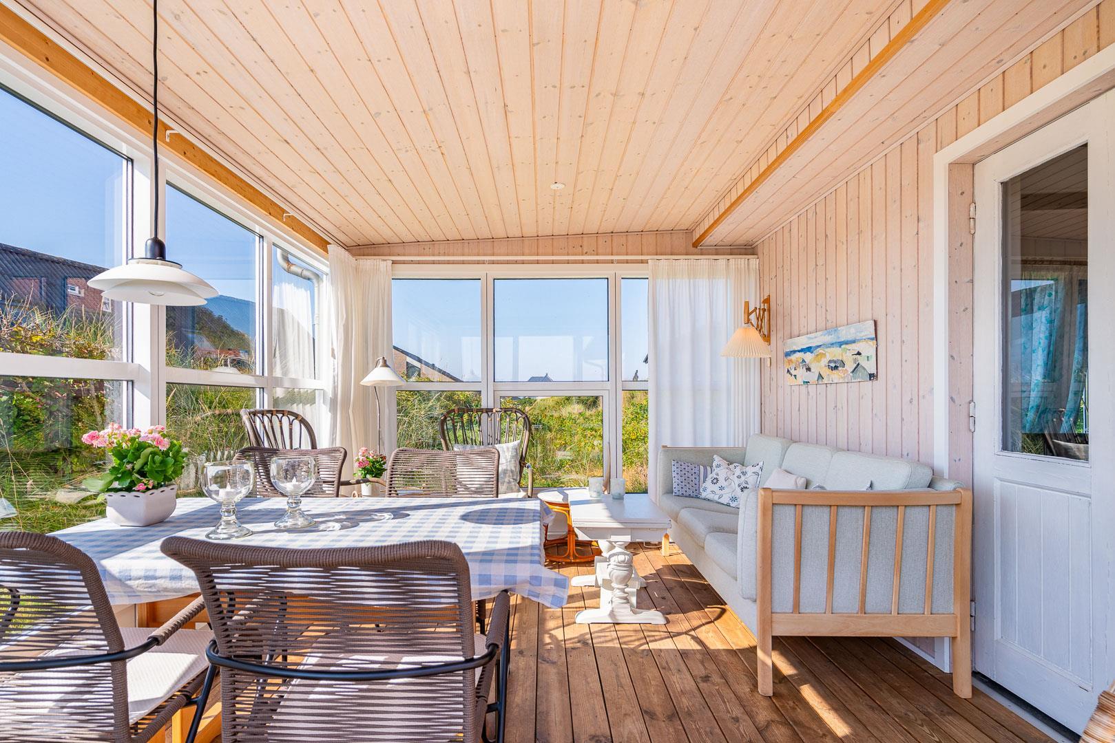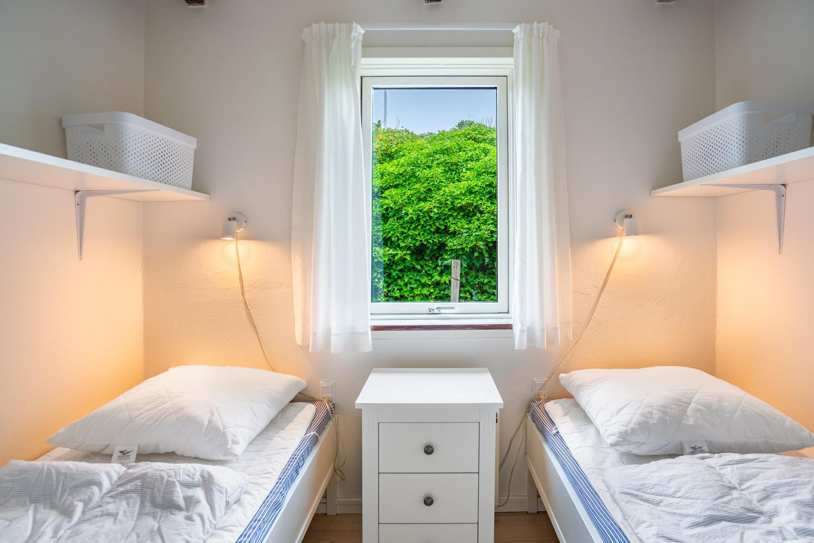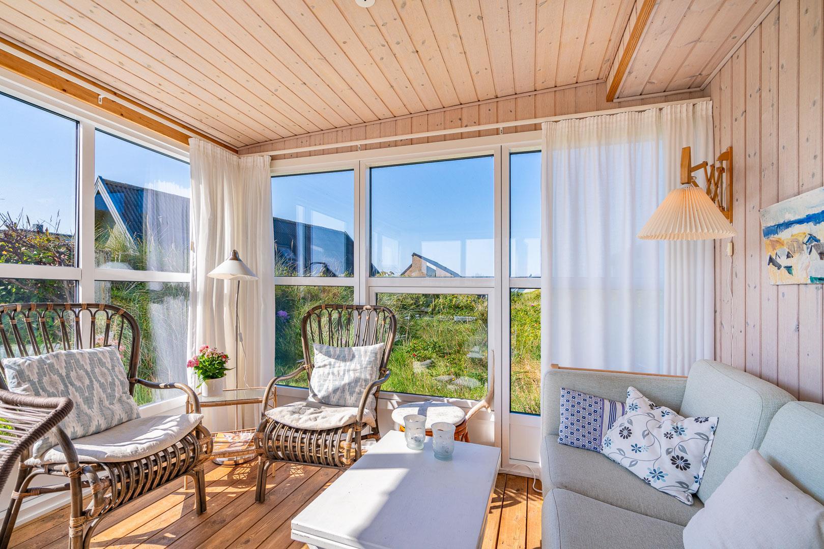 Sommerhuset er indrettet med et funktionelt køkken, et lyst badeværelse og to hyggelige soveværelser med komfortable senge. Her finder du også en dejlig udestue, som giver god mulighed for at nyde udsigten i alt slags vejr. Her vil du også nyde at kunne sætte dig tilbage med en kop kaffe og en god bog. Med flere terrasser omkring feriehuset kan man altid finde et sted at slappe af i solen, eller nyde måltiderne under åben himmel.