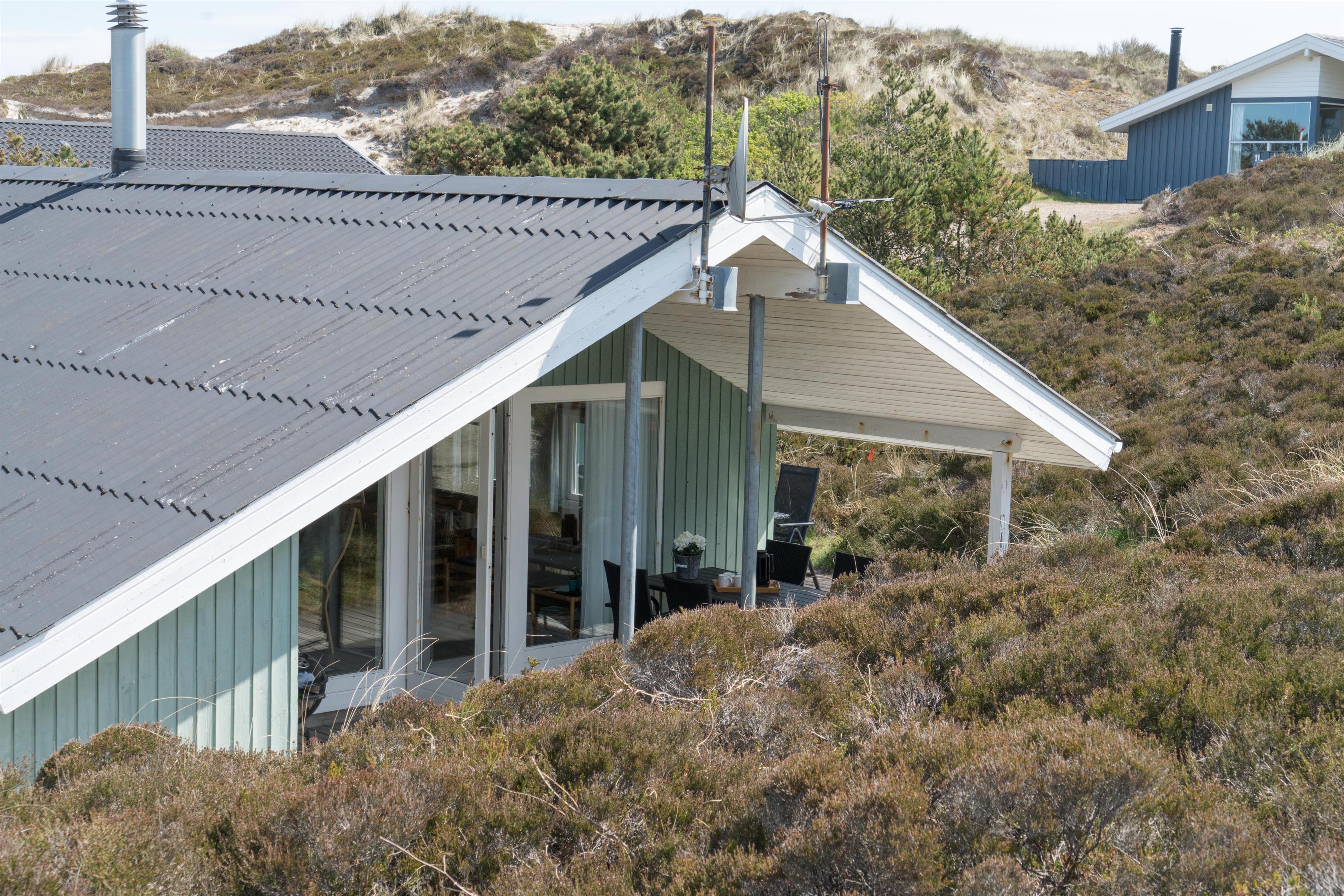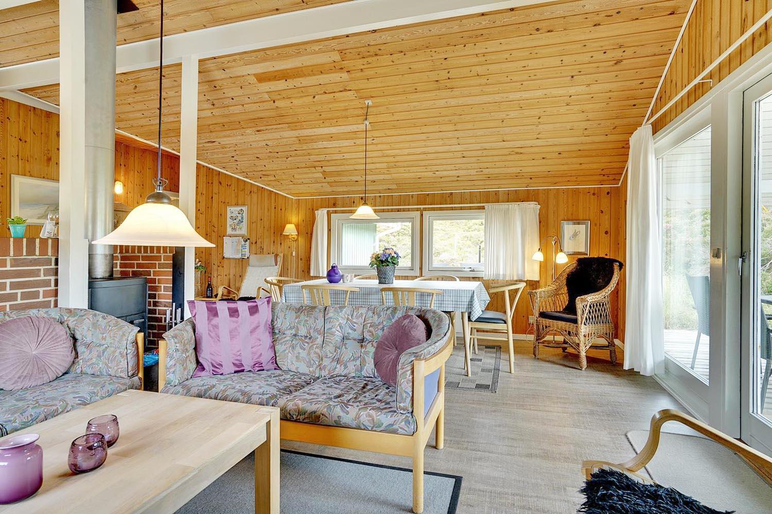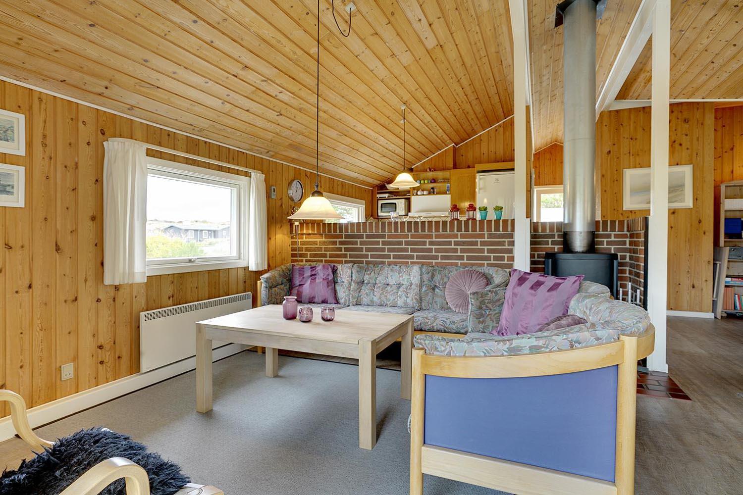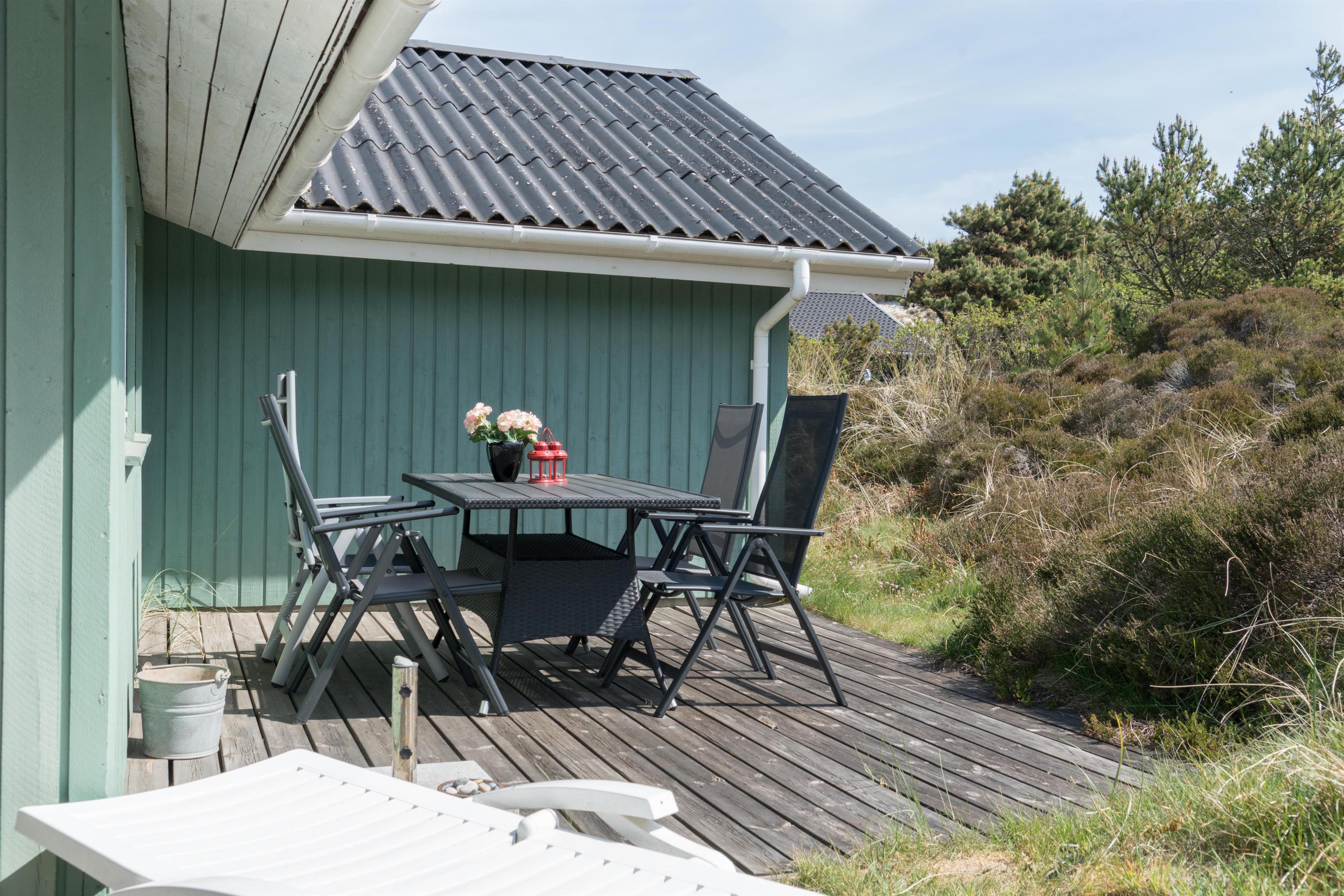 Velholdt feriehus i Henne Strand med sauna, brændeovn og flere ugenerede terrasser på naturgrund.