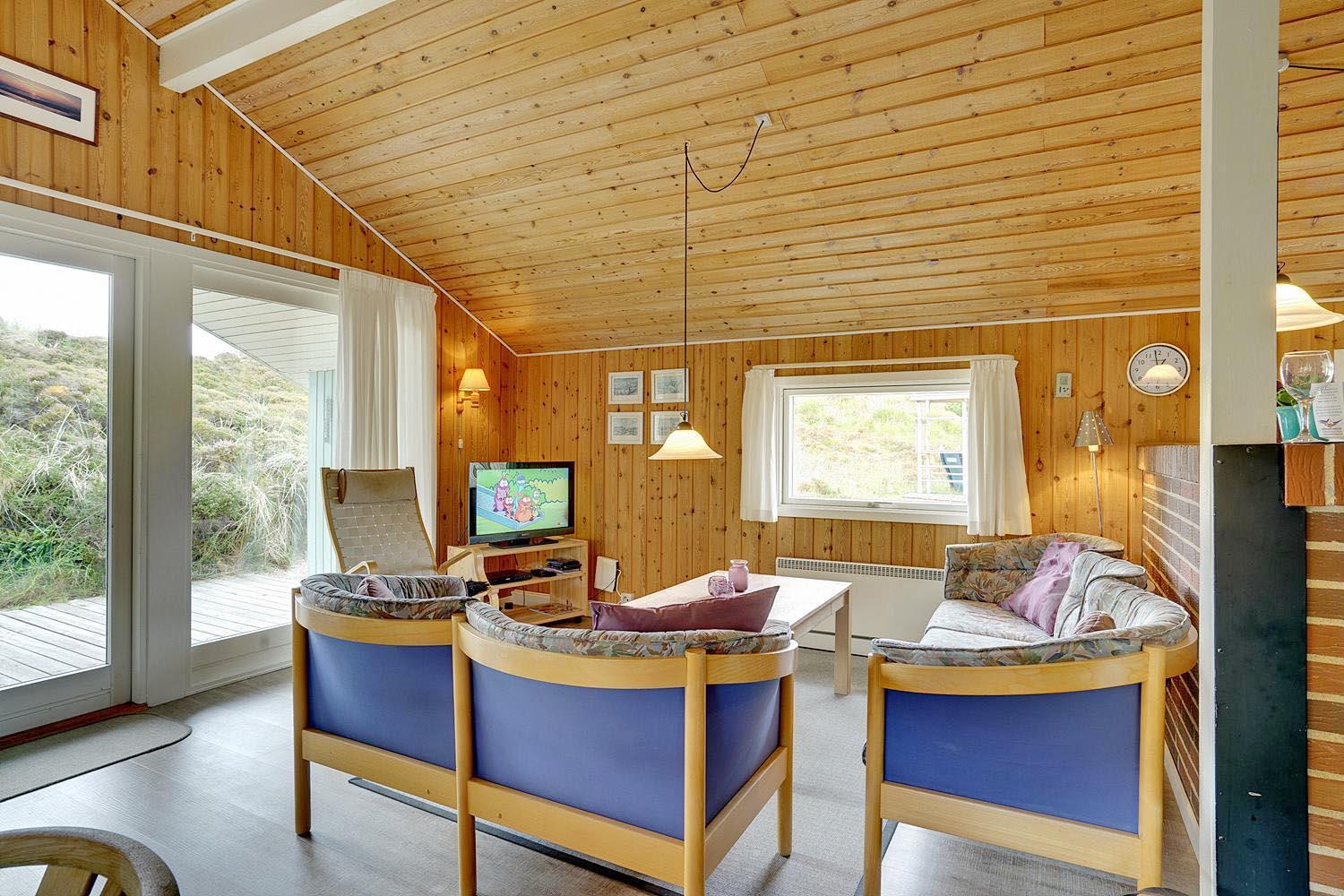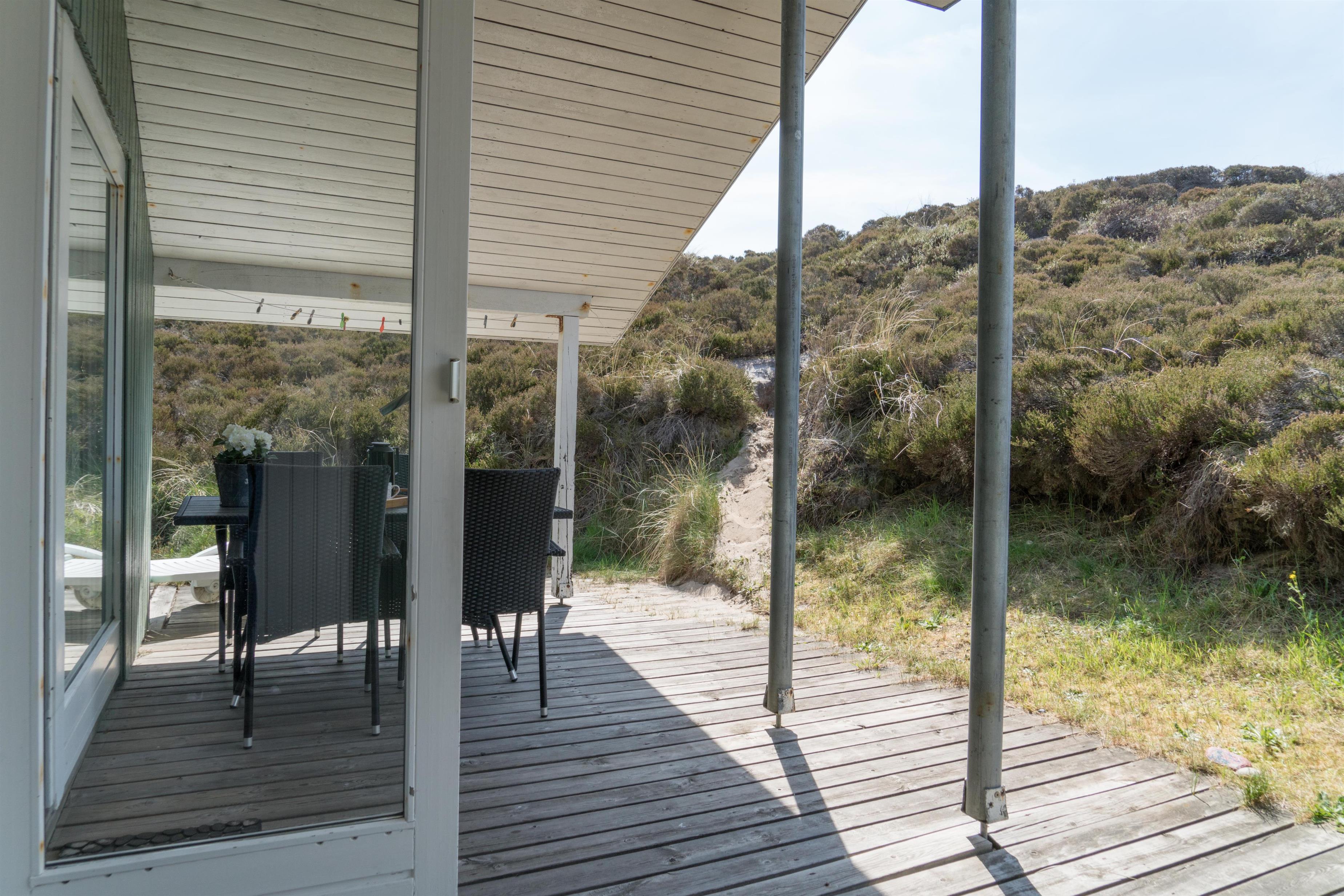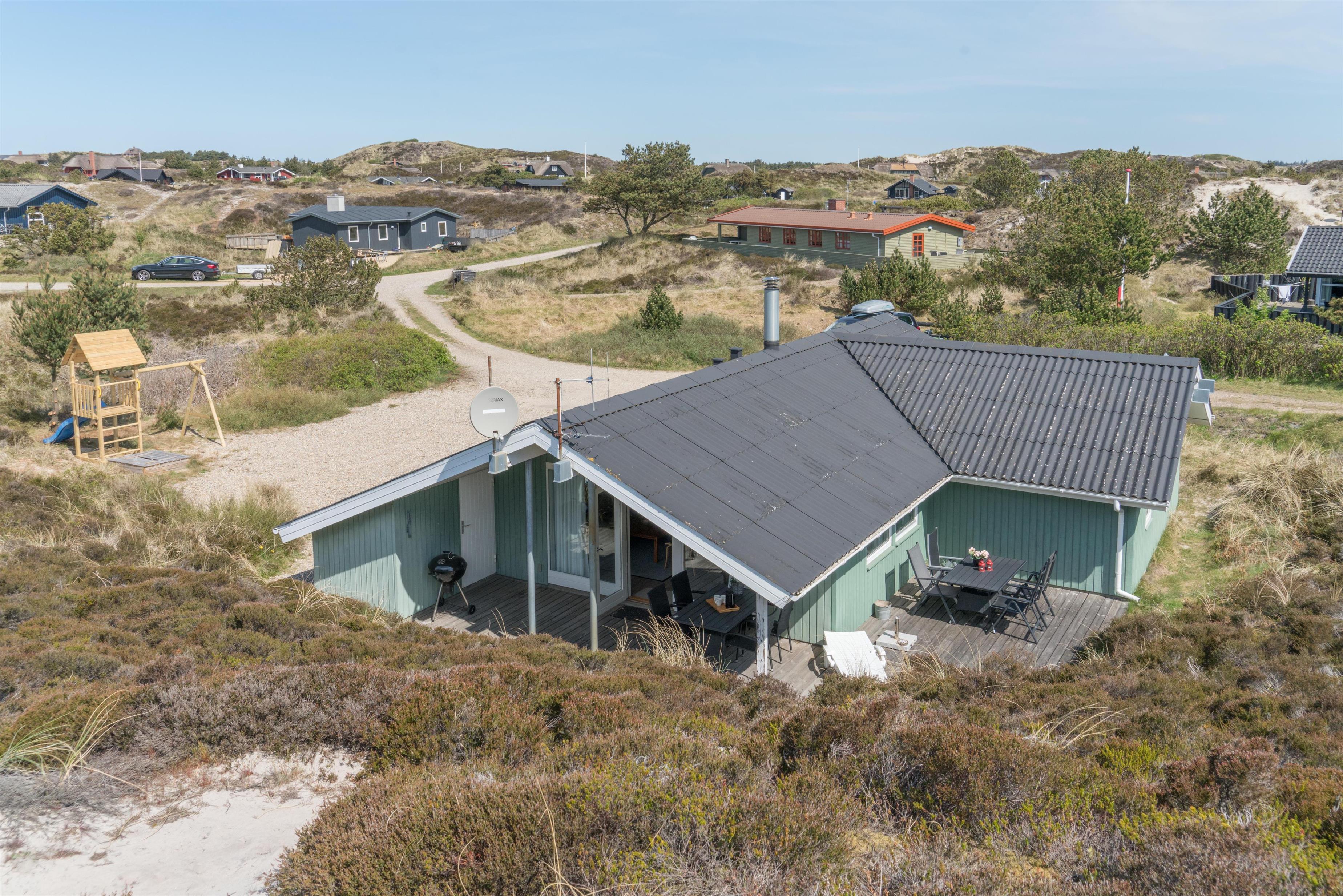 Velholdt feriehus i Henne Strand med sauna, brændeovn og flere ugenerede terrasser på naturgrund.