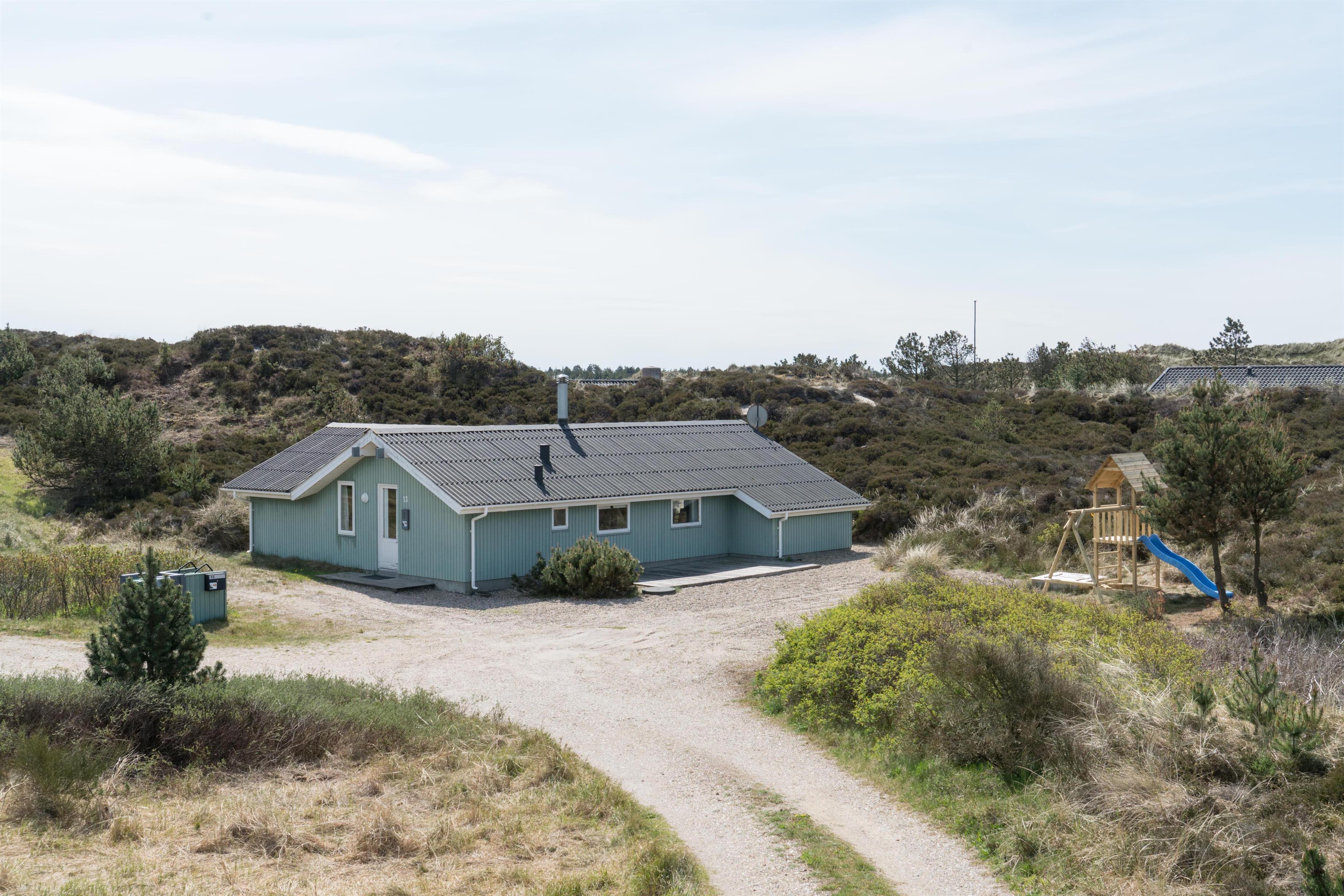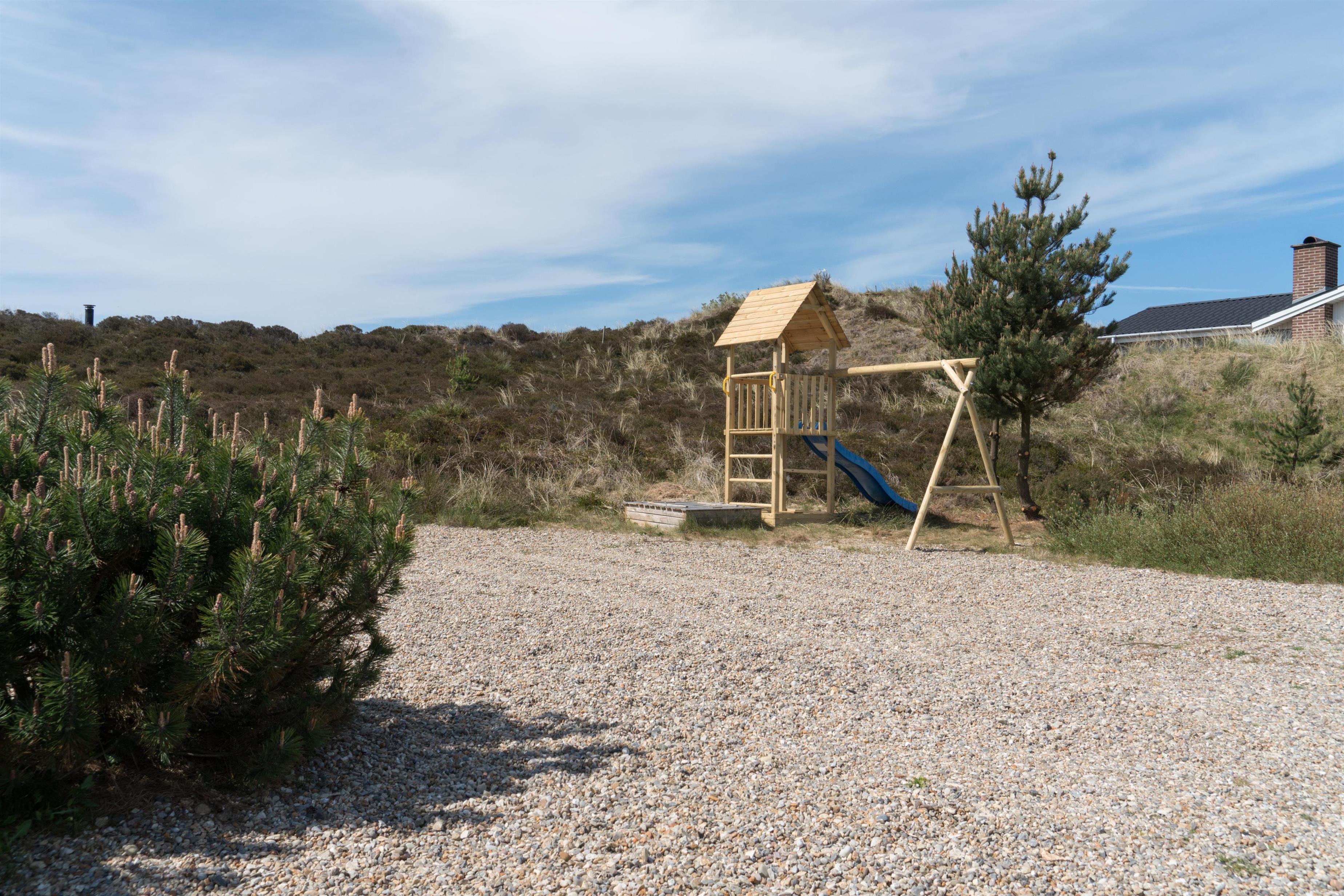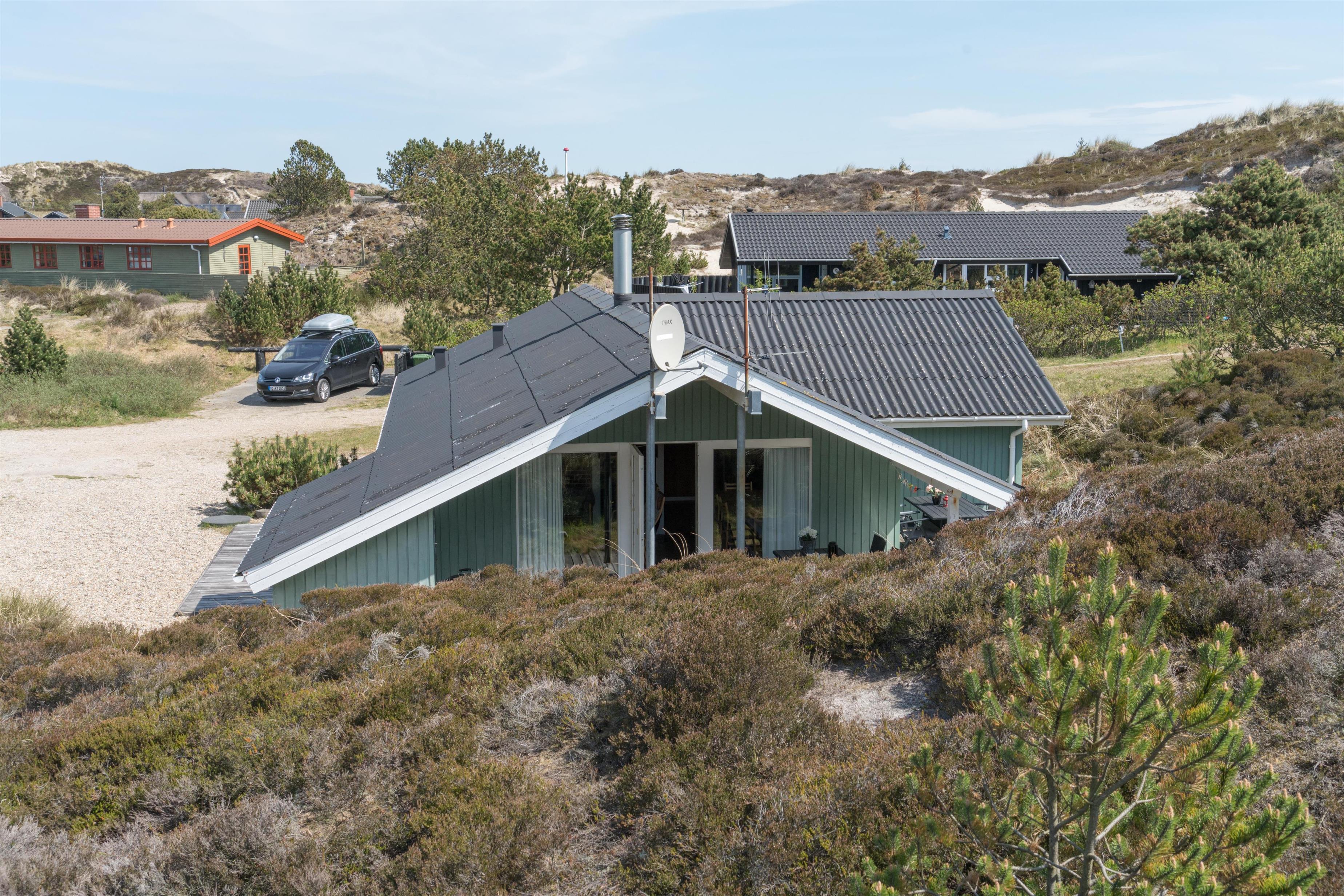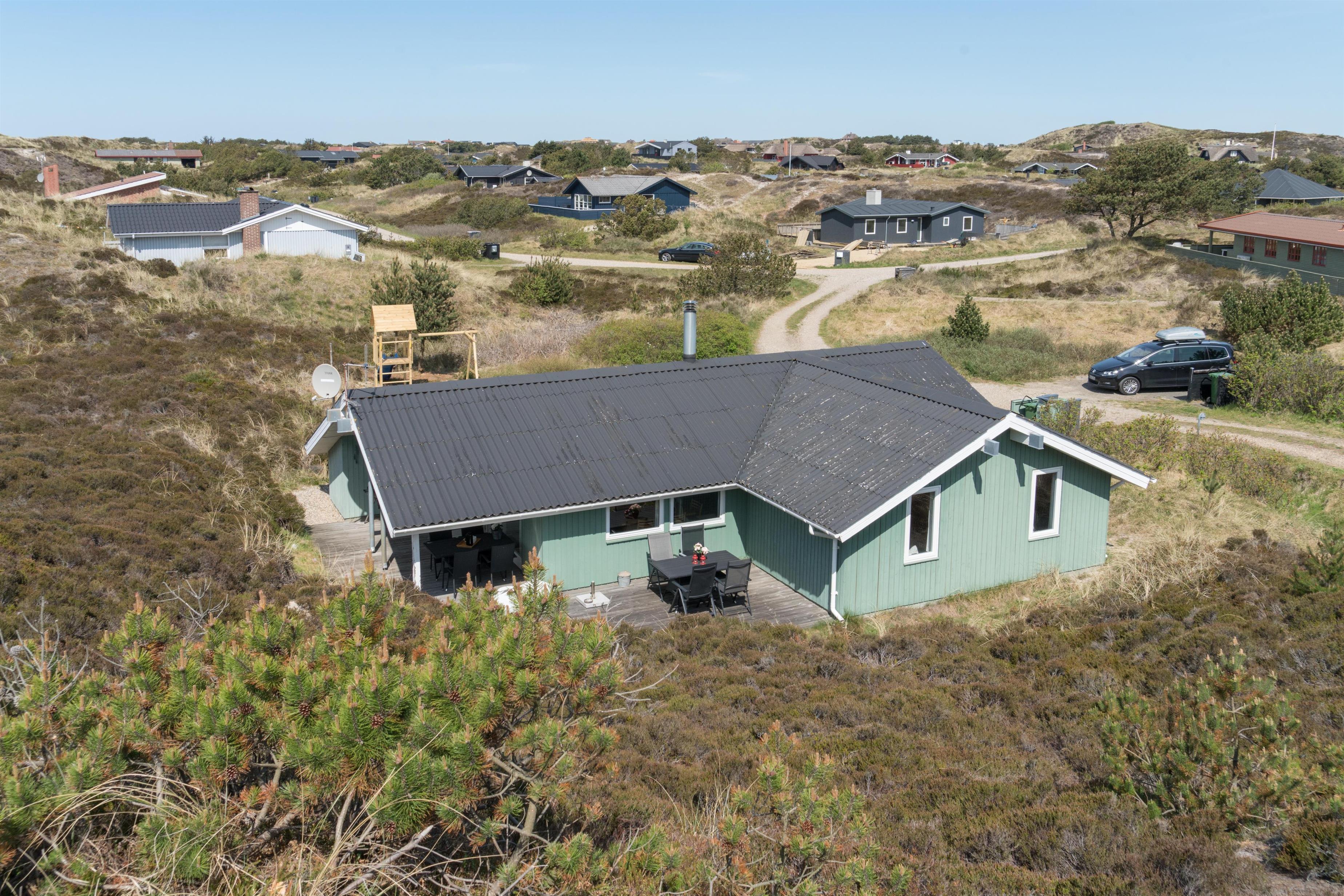 Velholdt feriehus i Henne Strand med sauna, brændeovn og flere ugenerede terrasser på naturgrund.
