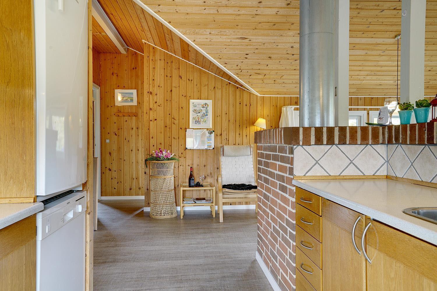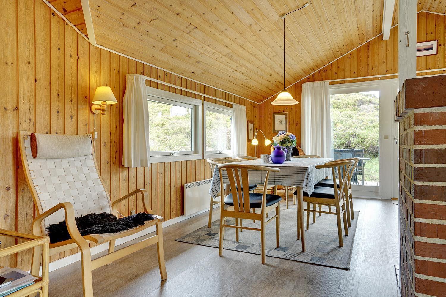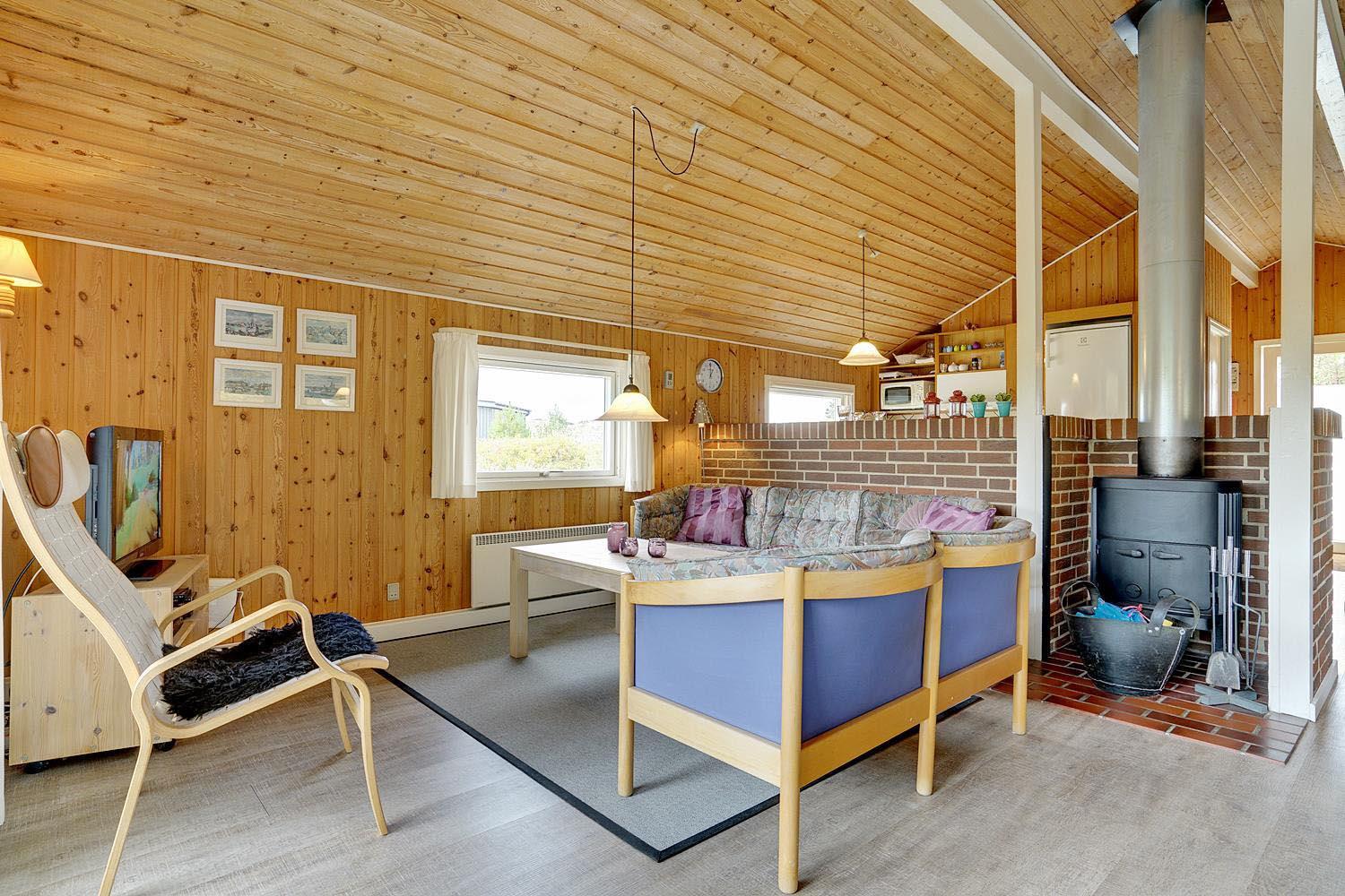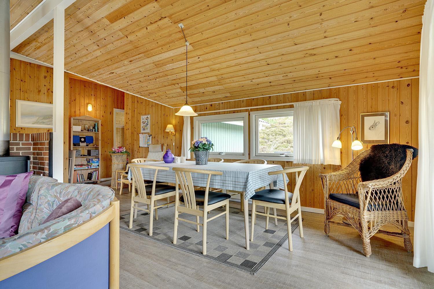 Dejligt og velholdt feriehus beliggende på en helt ugenert naturgrund for enden af blind vej. Flere ugenerede terrasser omkring huset. Nyere badeværelse med gulvvarme og sauna. Veludstyret køkkenet med bl.a. opvaskemaskine og mikrobølgeovn. Hyggelige opholdsstue indrettet med gode møbler og brændeovn. Til børnene er der sandkasse og gynge.