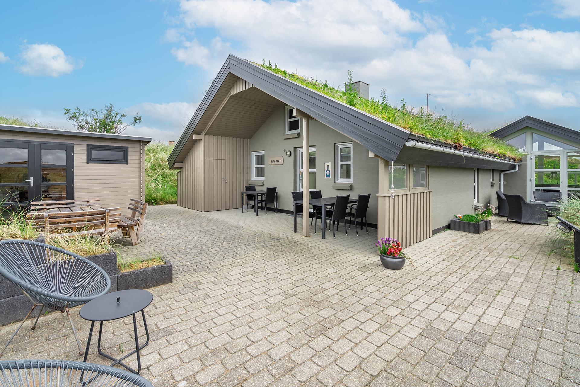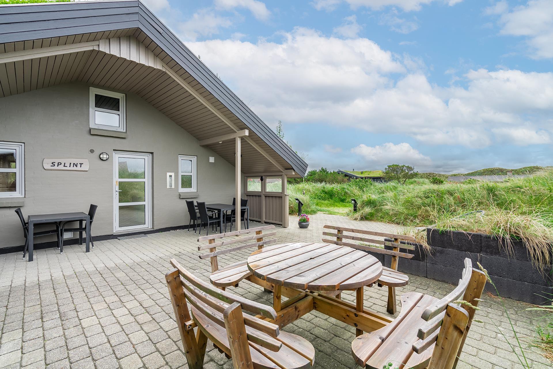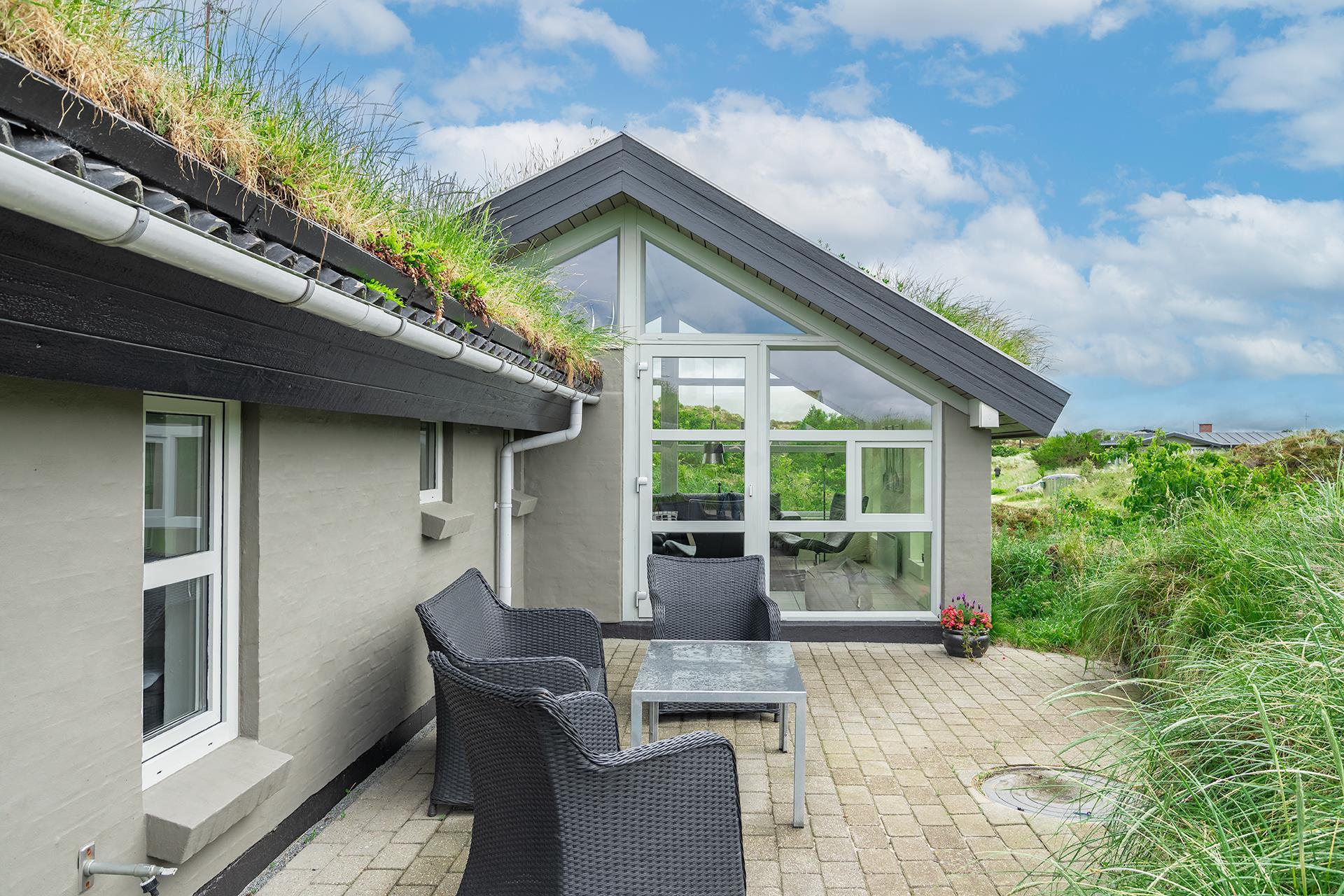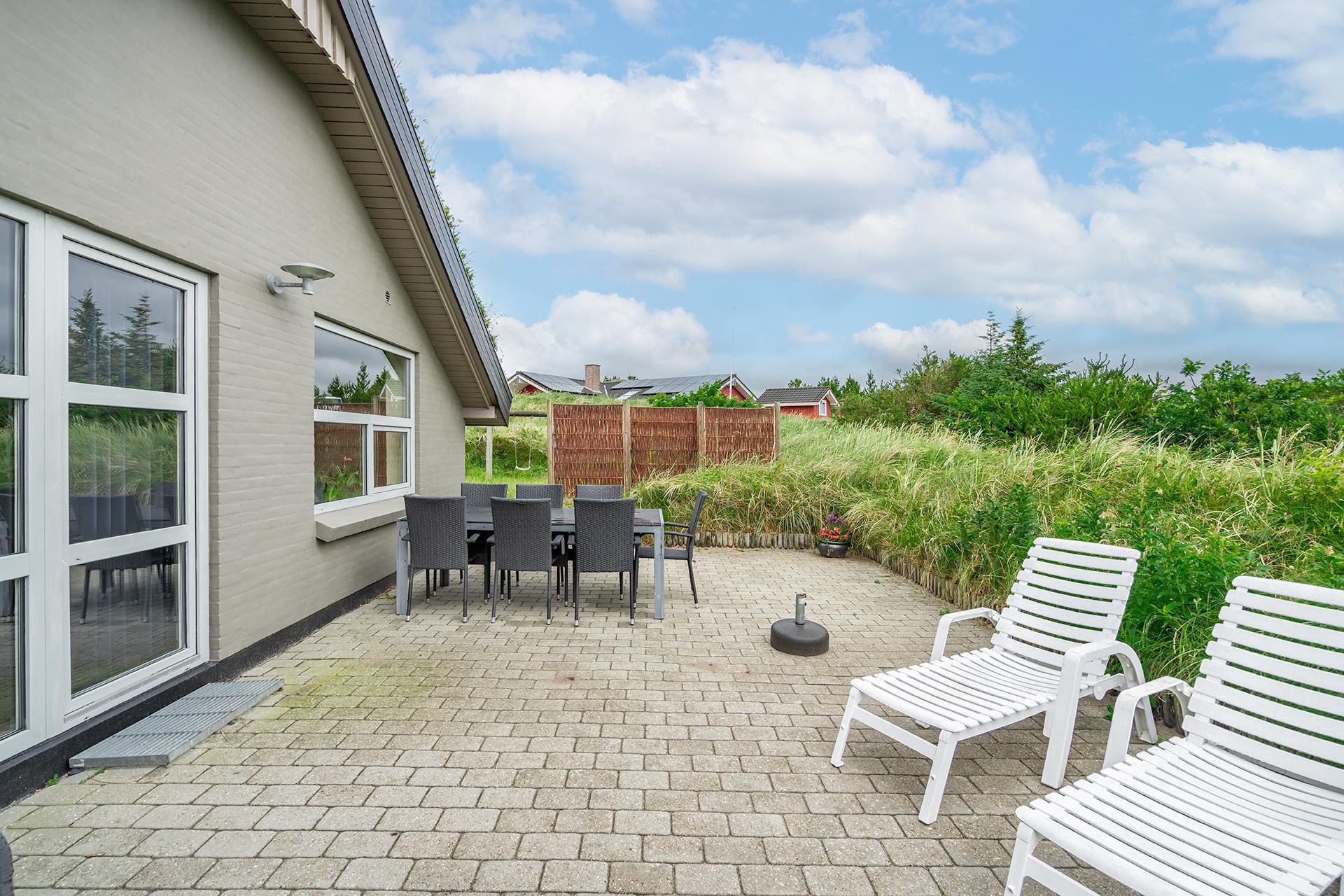 Udenfor finder du en dejlig stor og delvist overdækket terrasse – så her er gode muligheder for at nyde solens varme stråler eller finde en plads i skyggen hvis det skulle blive for varmt. Et dejligt sommerhus til familien i Henne Strand - ideelt placeret tæt på både strand og bymidte.