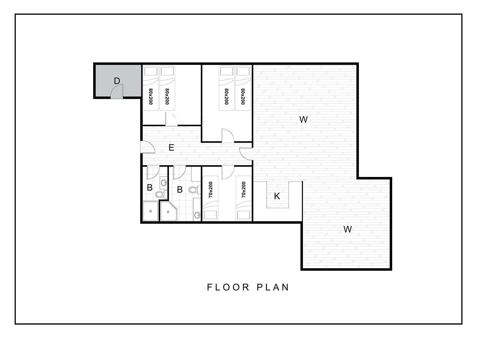 Sengestørrelse: 2 dobbeltsenge med 2 madrasser 80 x 200 cm + 2 enkeltsenge 70 x 200 cm.
