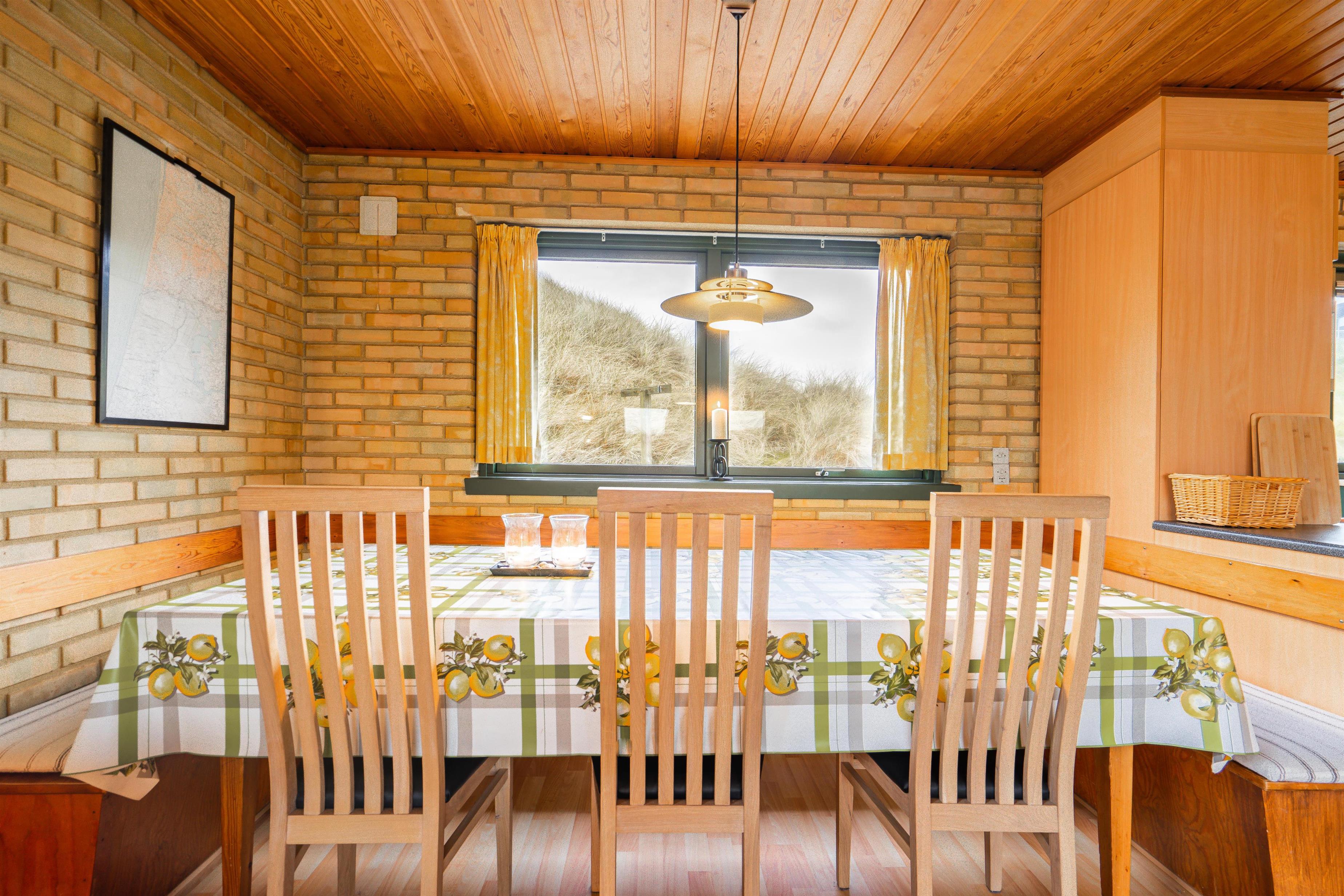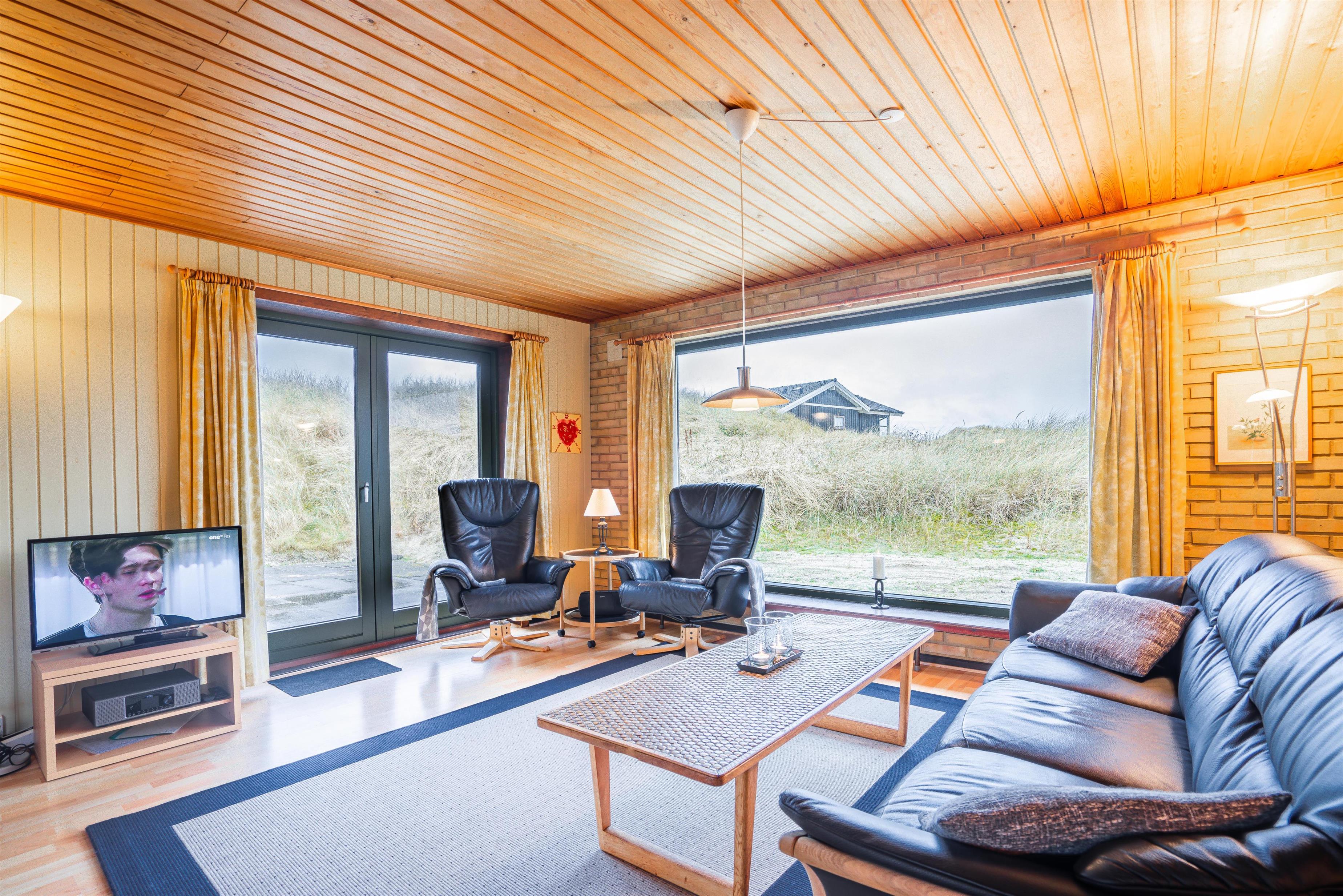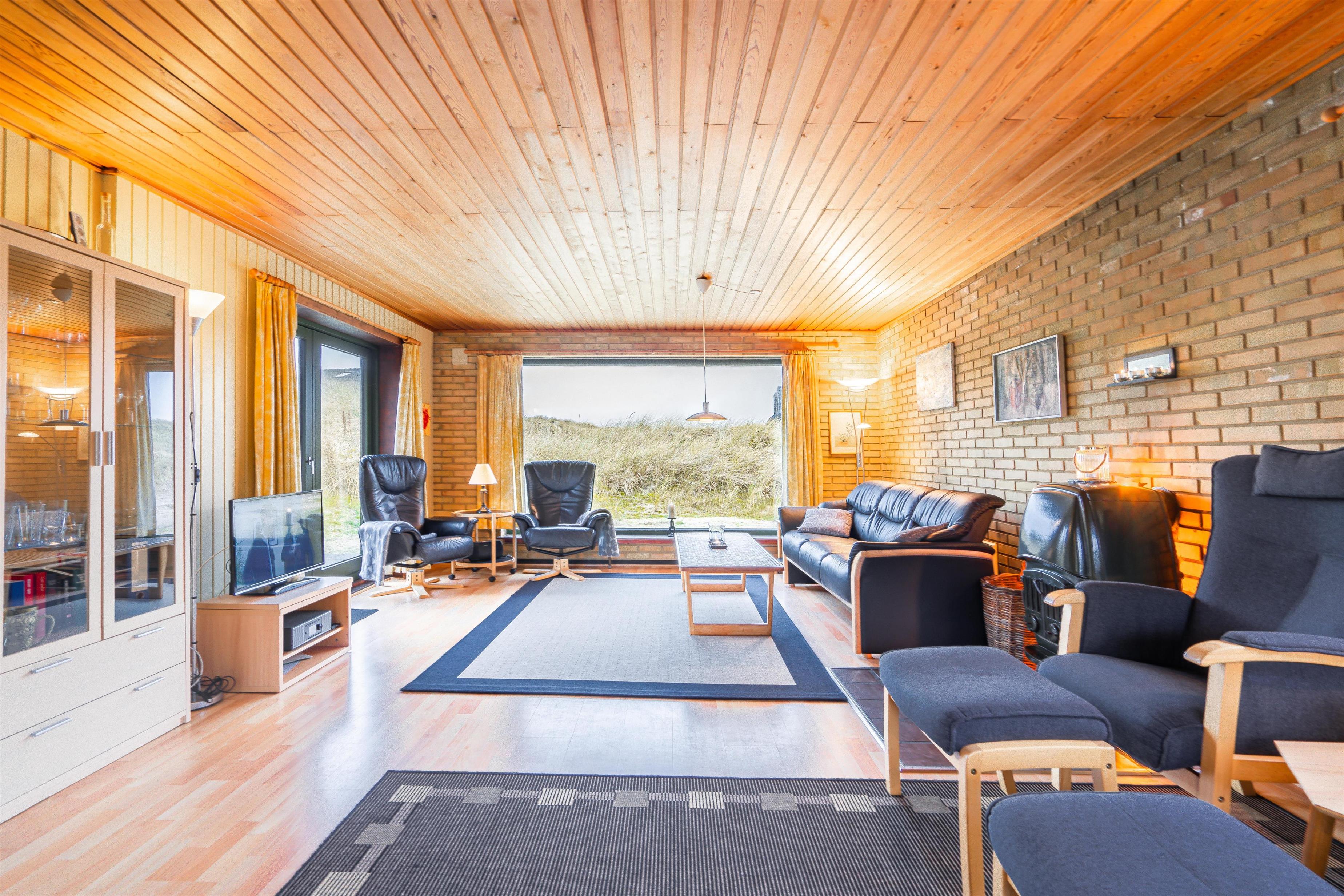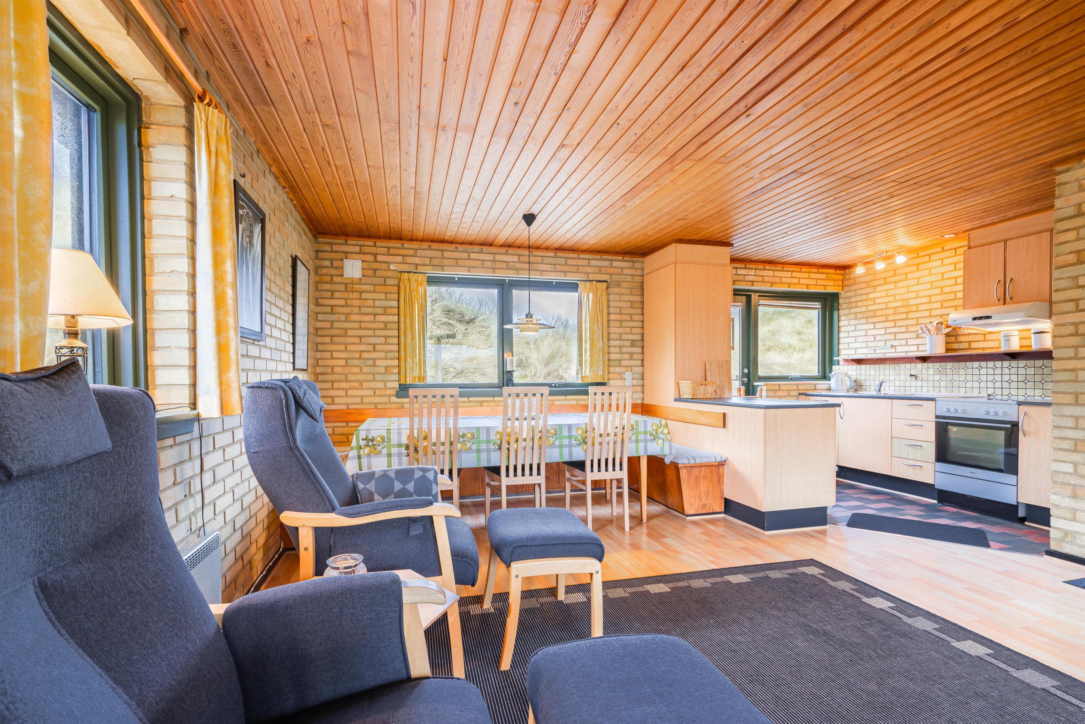 På en pragtfuld klitgrund i rolige omgivelser og kun 100 meter fra Henne Strands brede sandstrand ligger dette dejlige og charmerende fuldmurede feriehus med stråtag. Huset er indrettet med pæne møbler. Der er gode muligheder for at finde en læ krog på den store ugenerede terrasse.