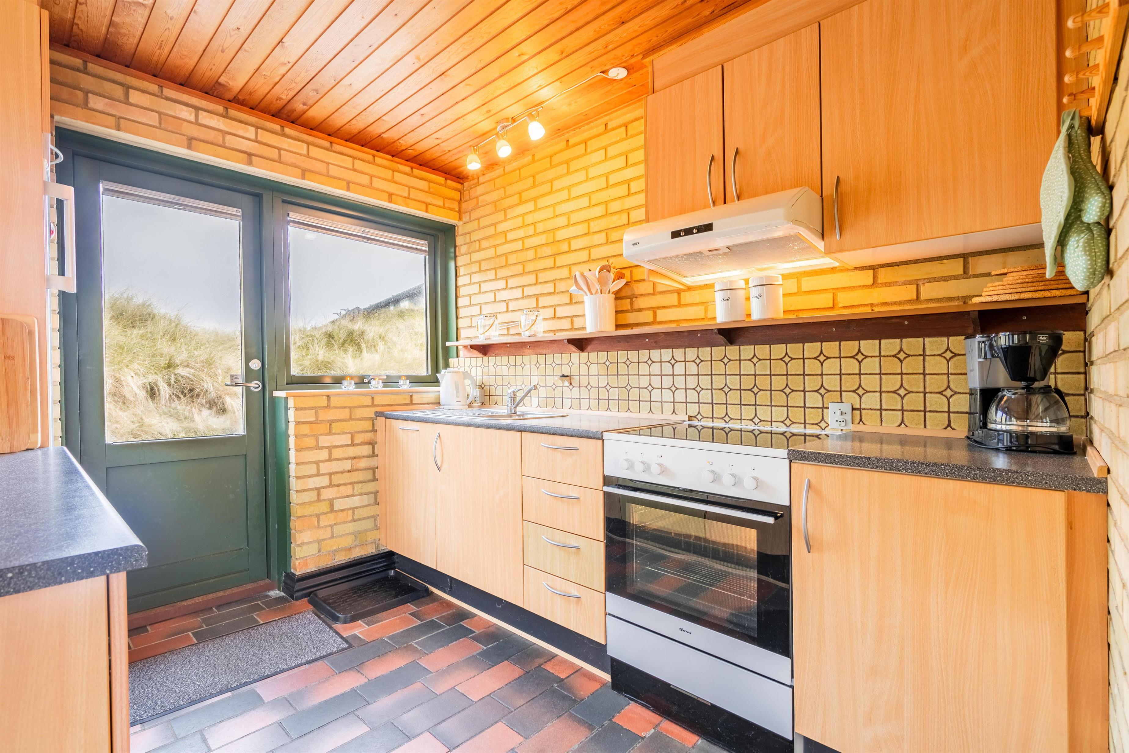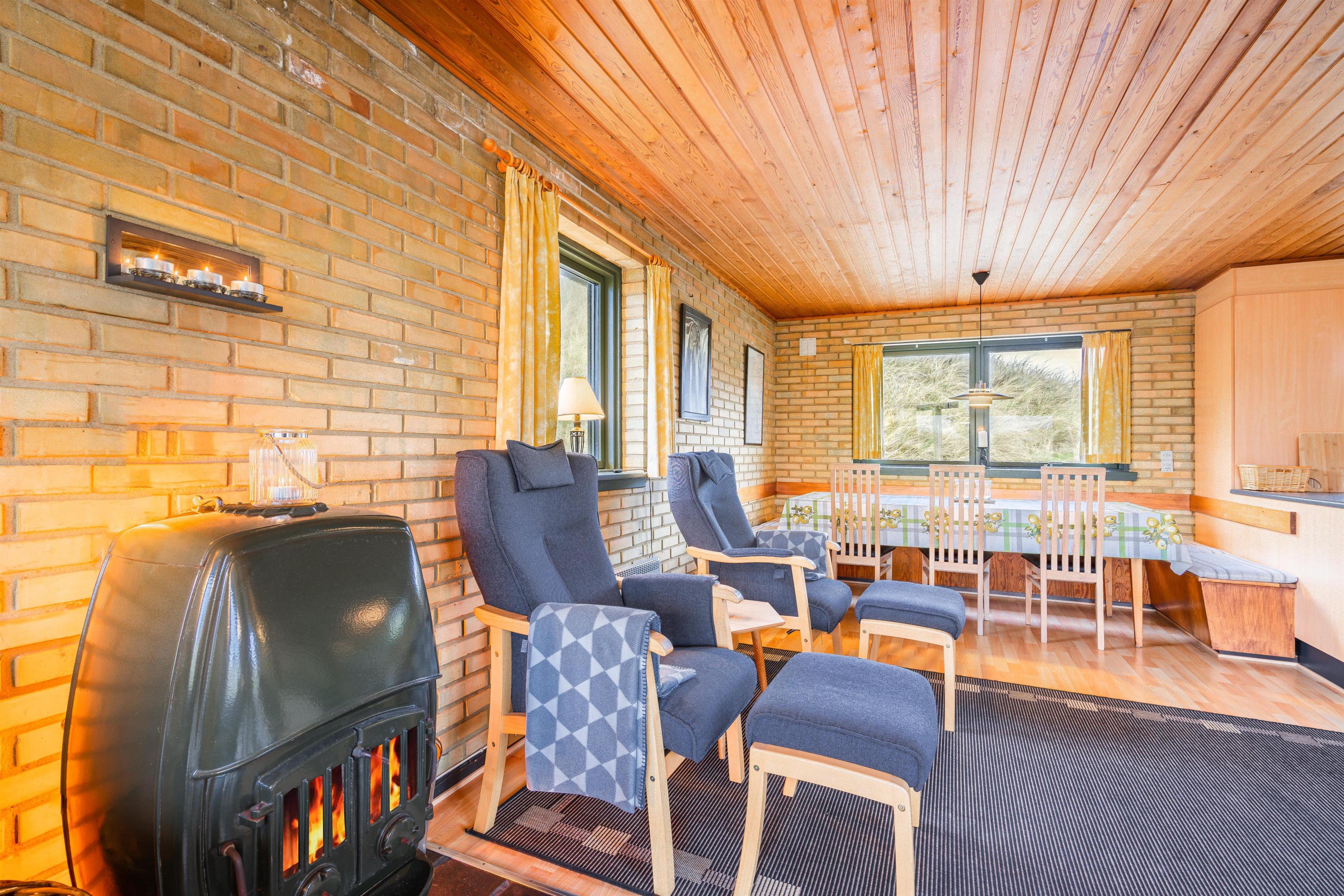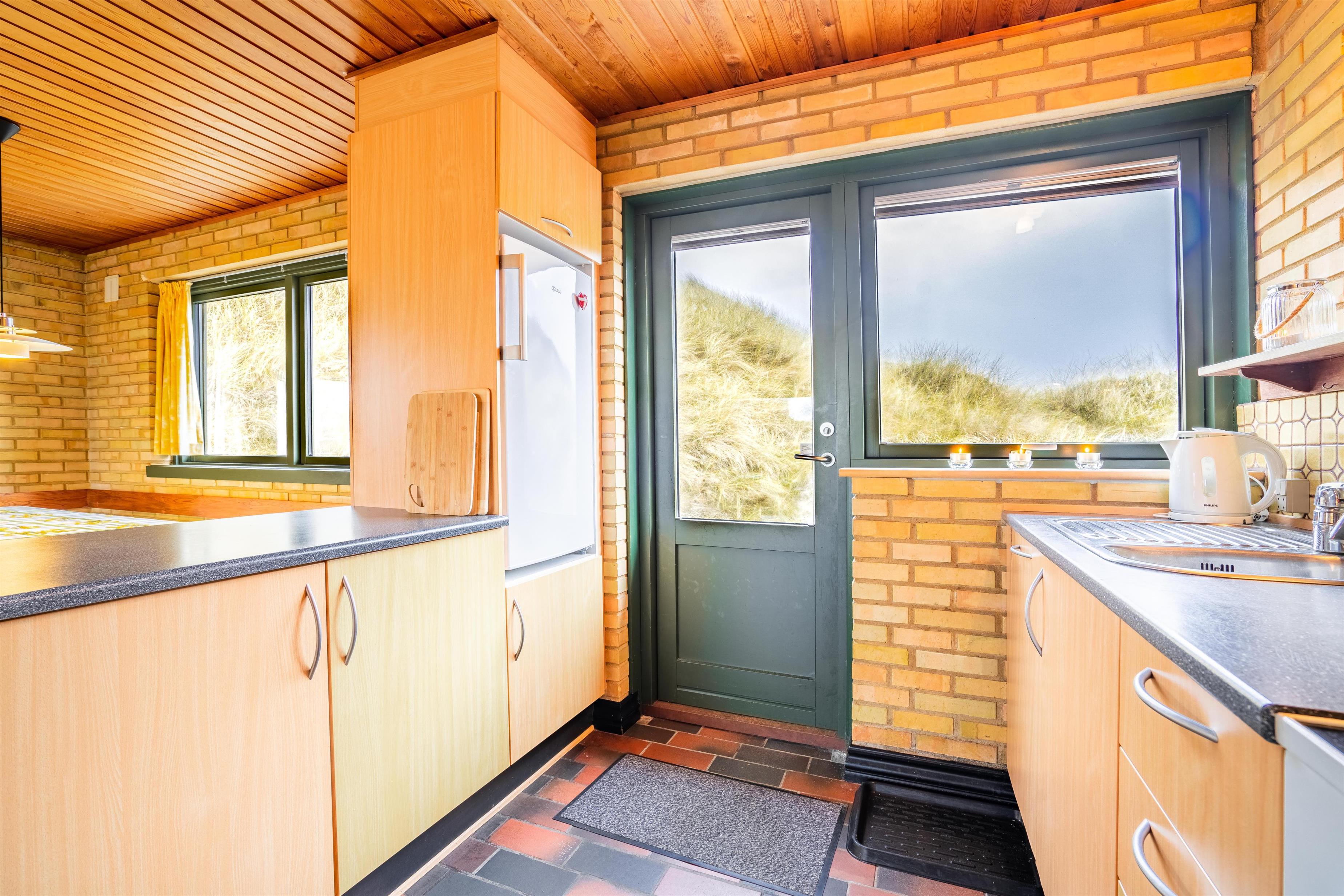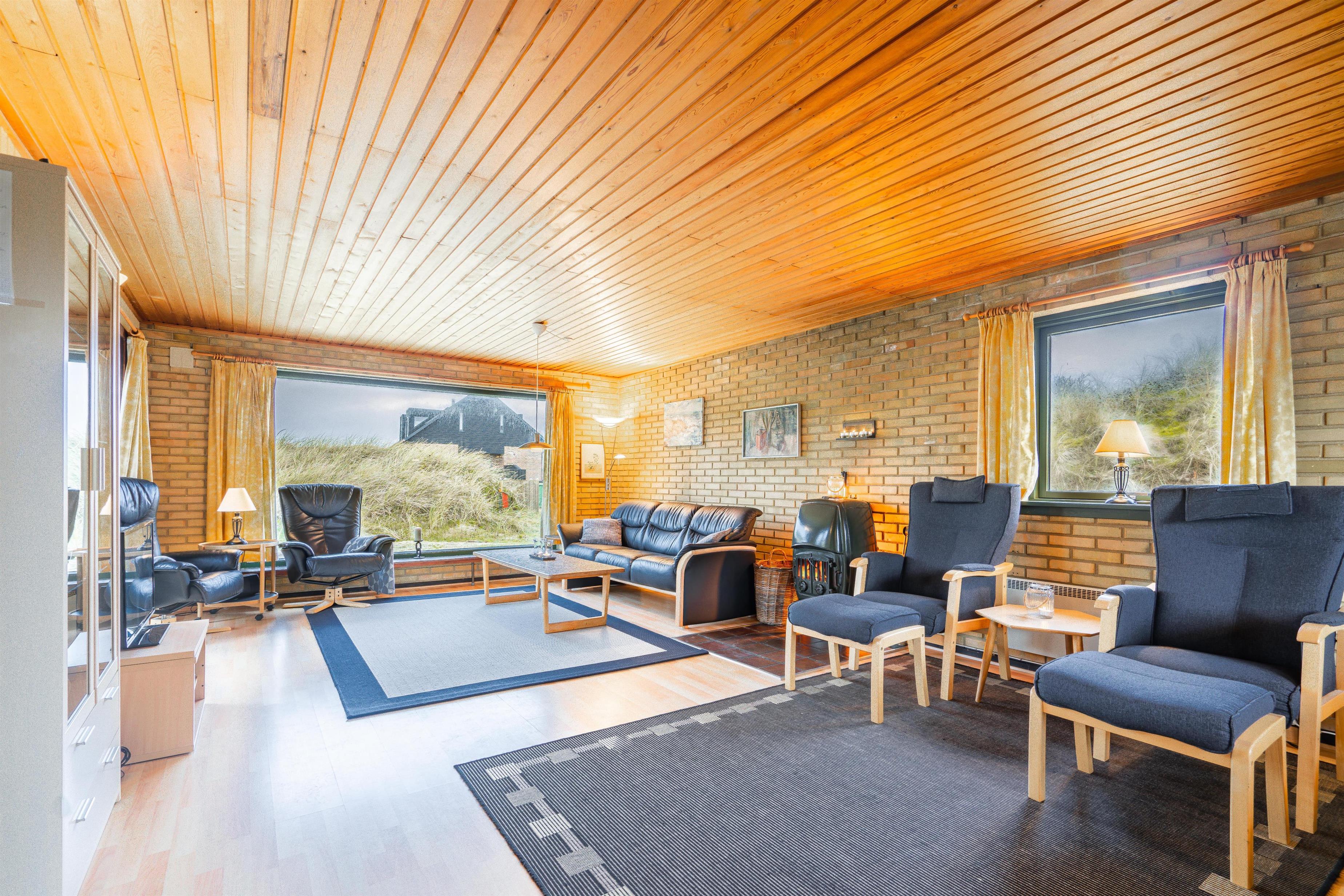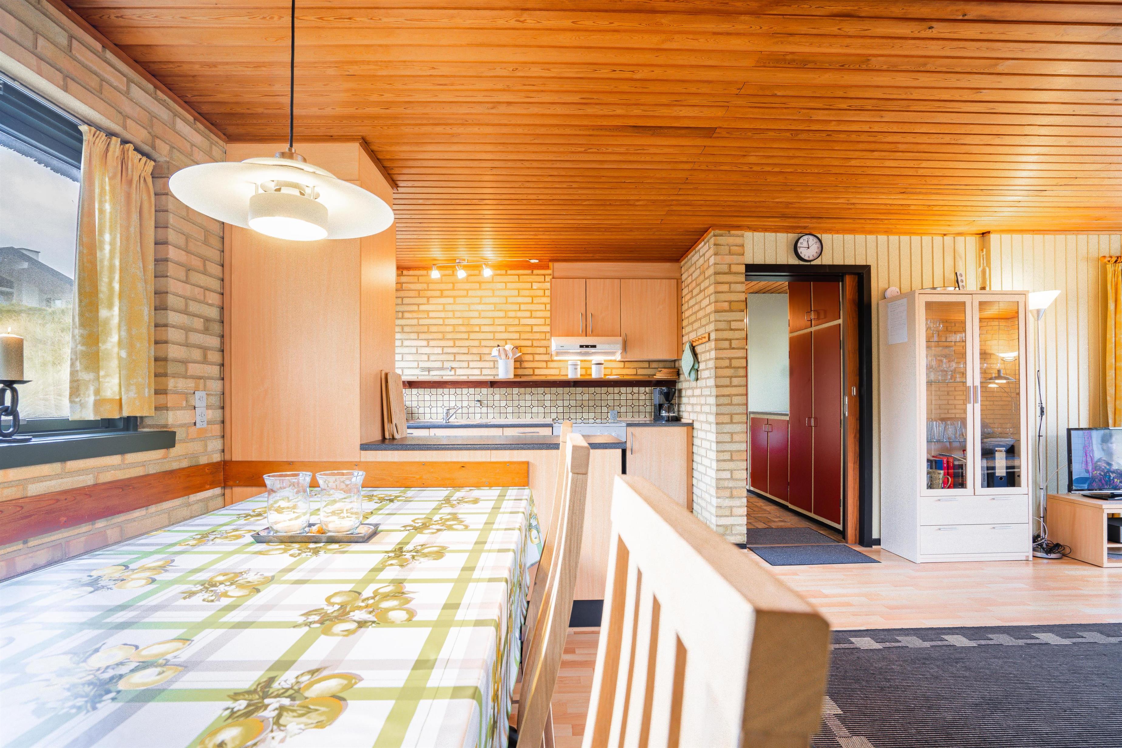 På en pragtfuld klitgrund i rolige omgivelser og kun 100 meter fra Henne Strands brede sandstrand ligger dette dejlige og charmerende fuldmurede feriehus med stråtag. Huset er indrettet med pæne møbler. Der er gode muligheder for at finde en læ krog på den store ugenerede terrasse.