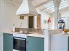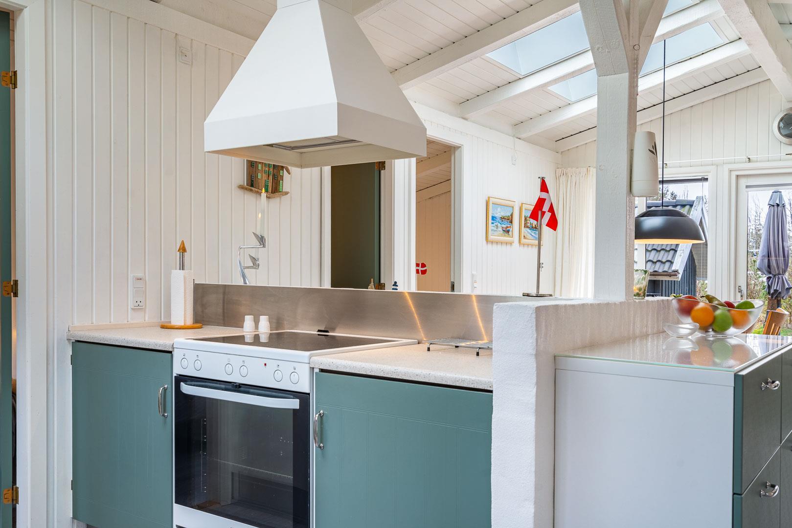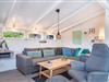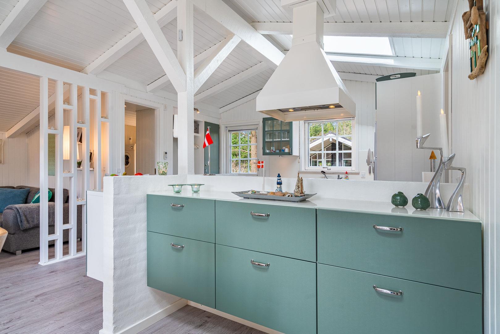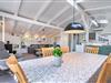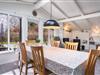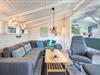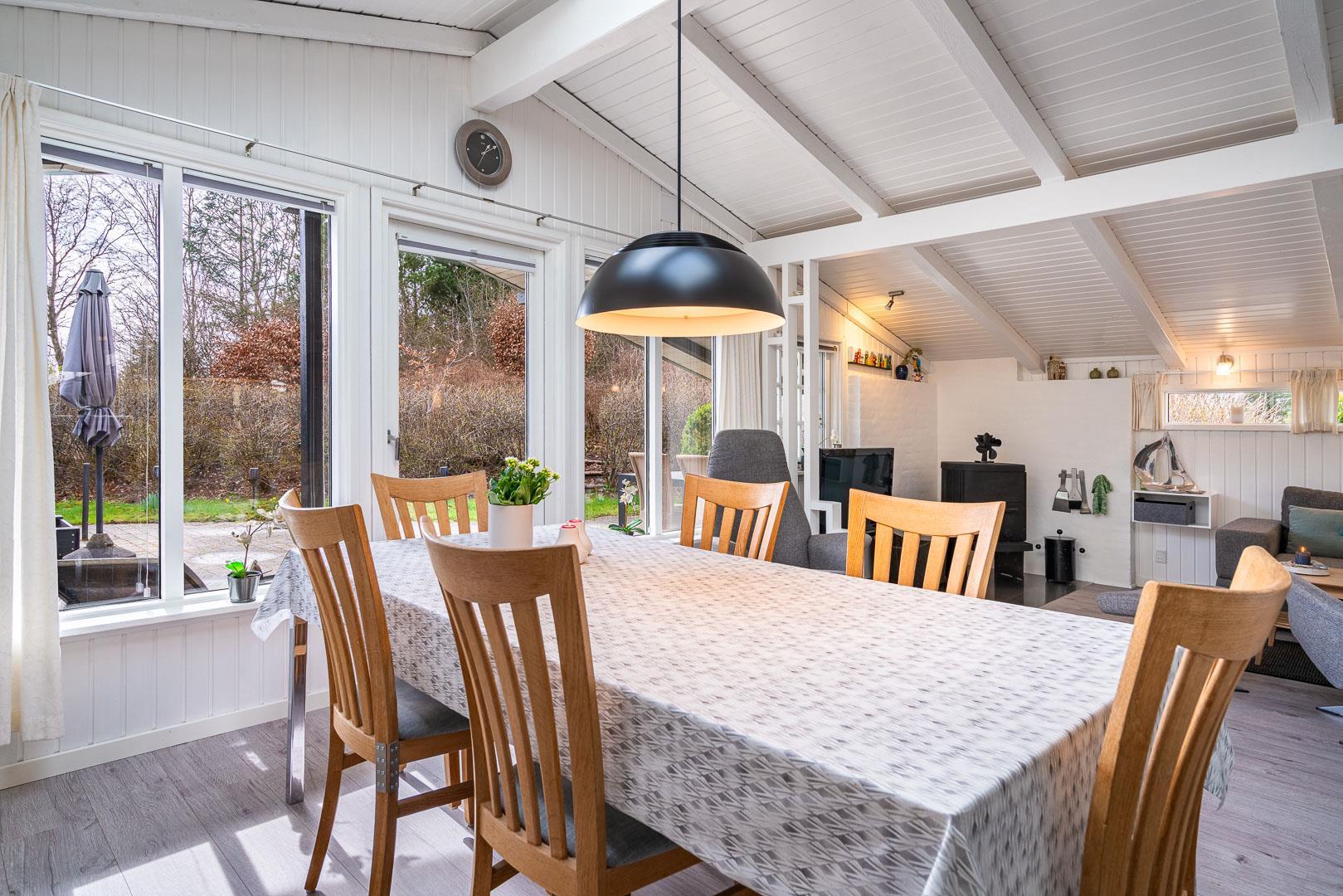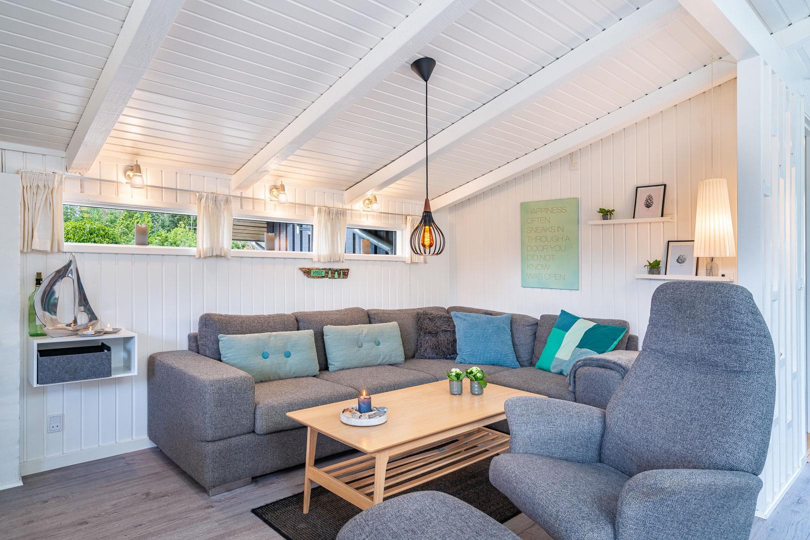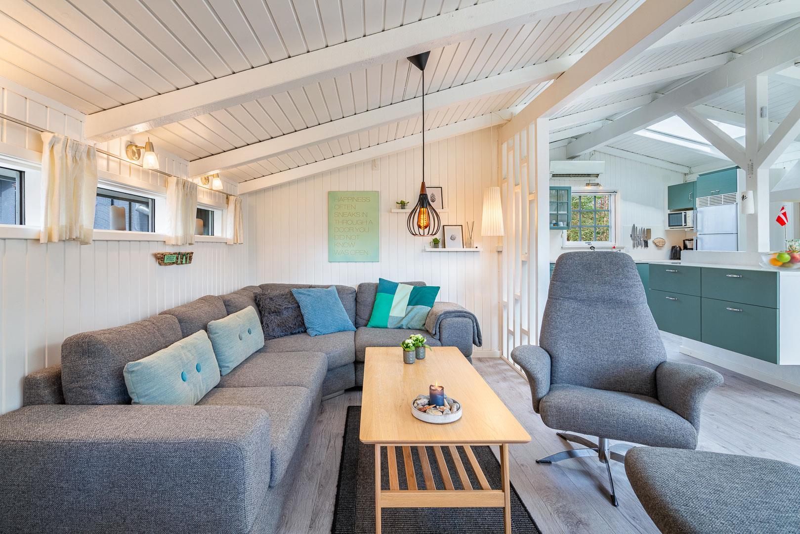 Husets stue er i åben forbindelse med køkken og spiseafdeling og her fornemmer man straks den hyggelige sommerhusstemning.