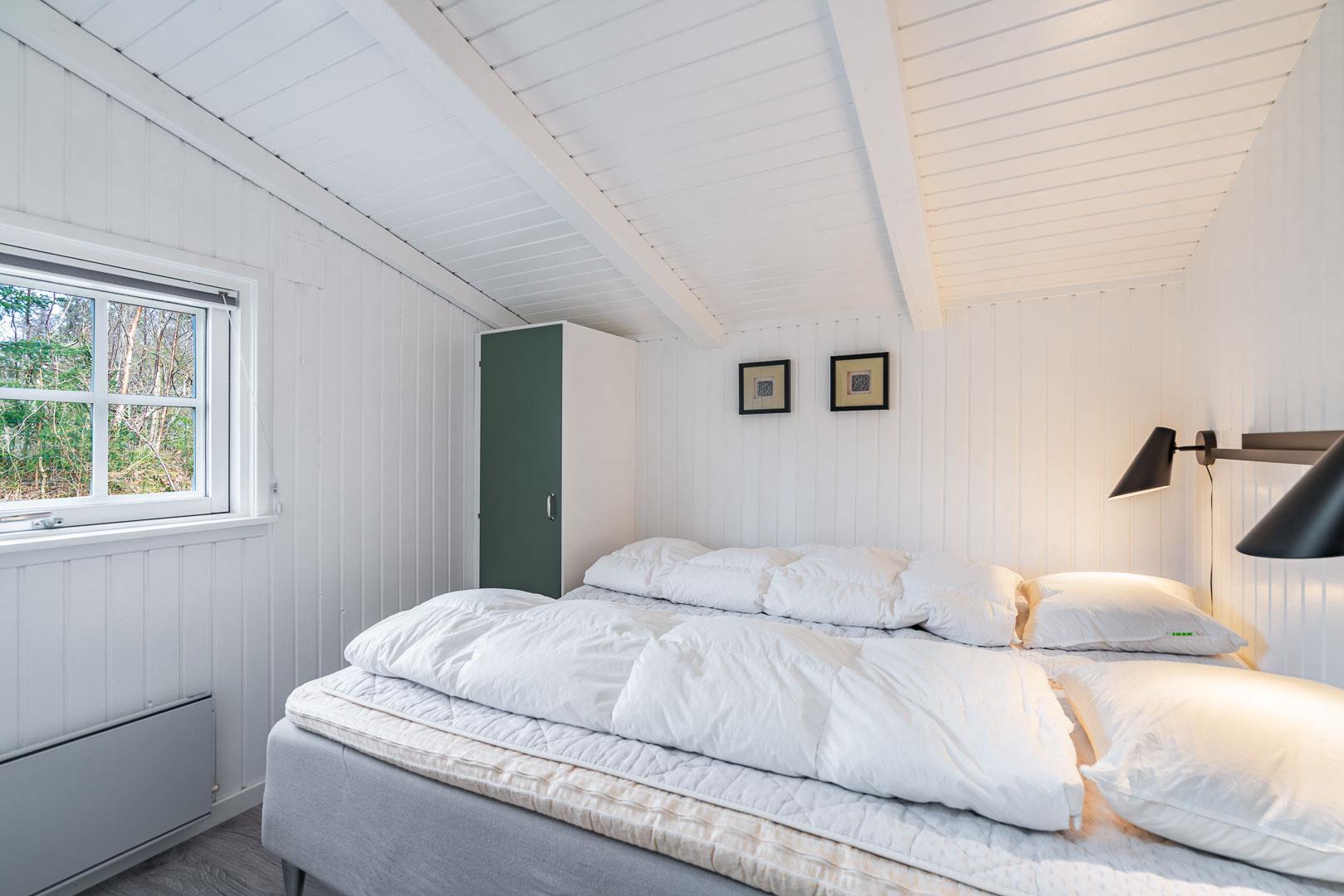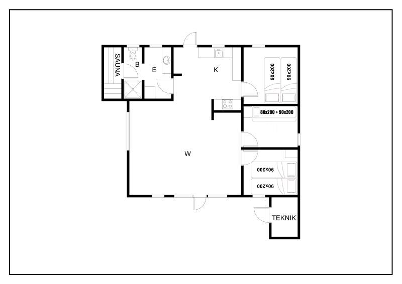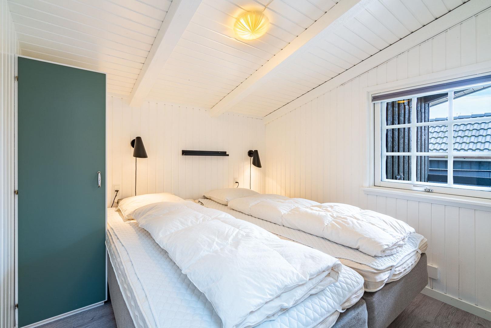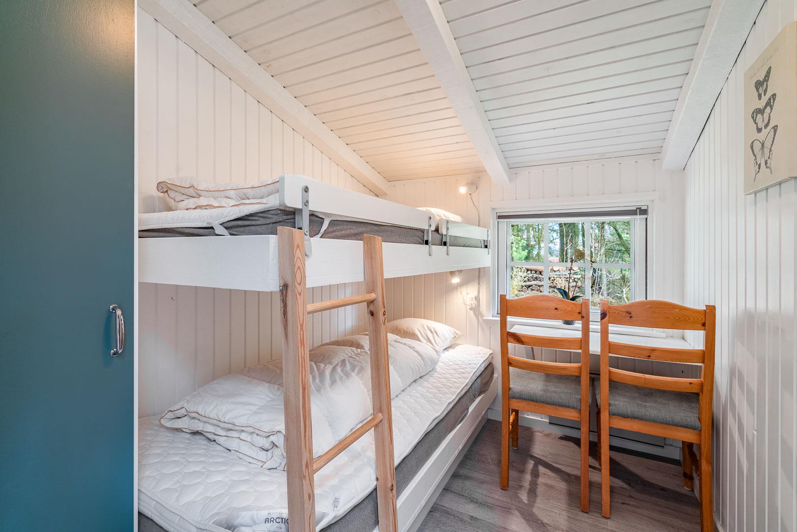 Sengestørrelse: 2 dobbeltsenge med 2 madrasser 90 x 200 cm + 1 køjeseng, hvor den øverste madras er 80 x 200 cm og den nederste er 90 x 200 cm.