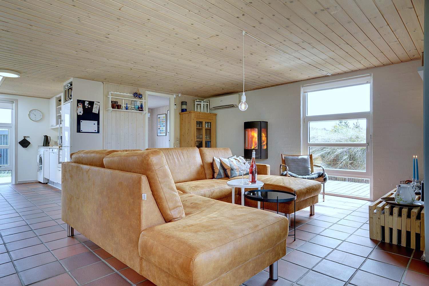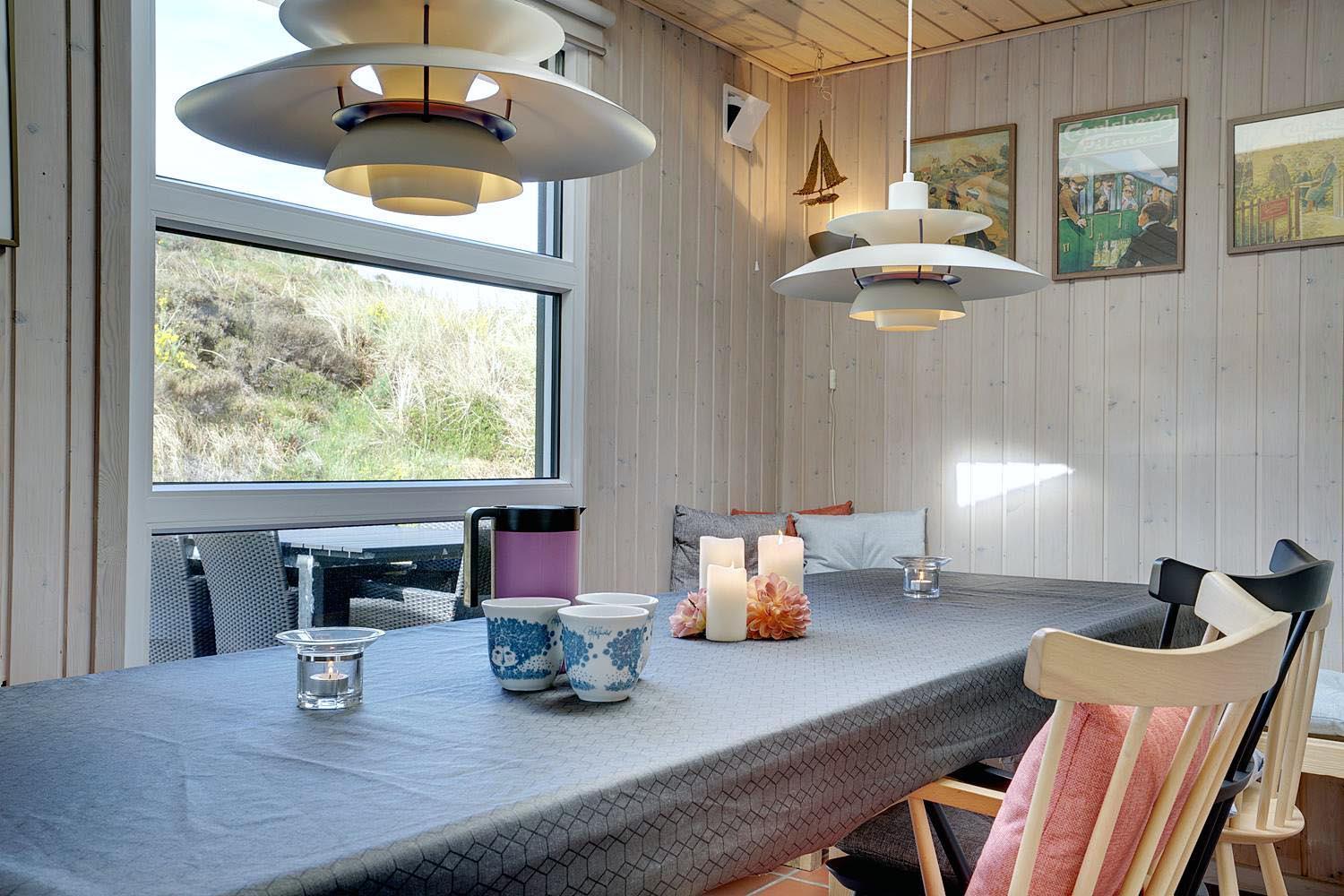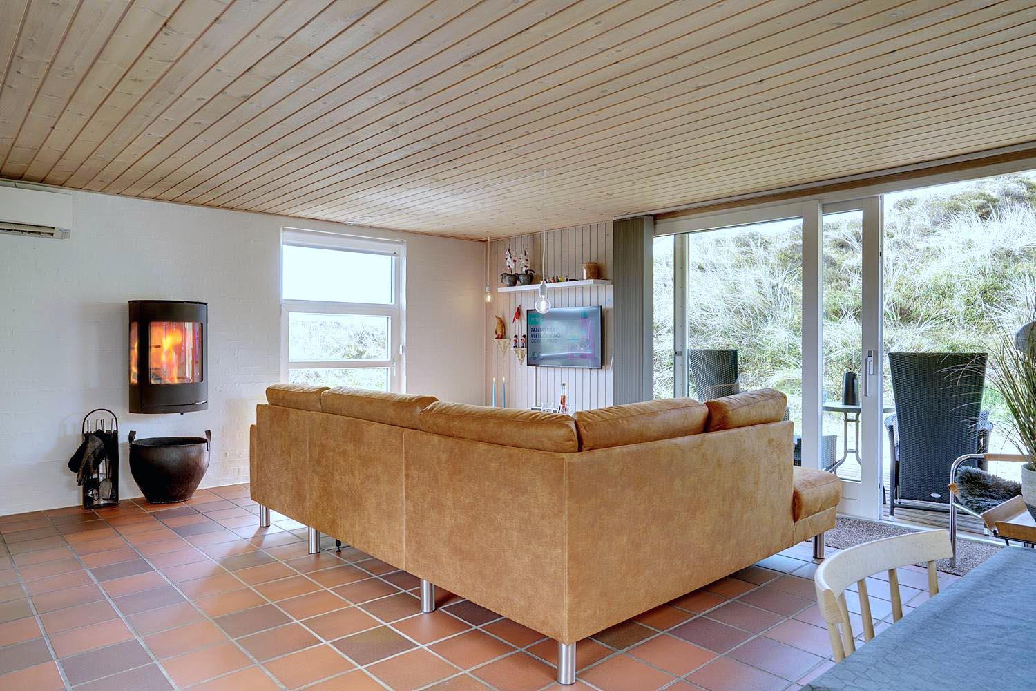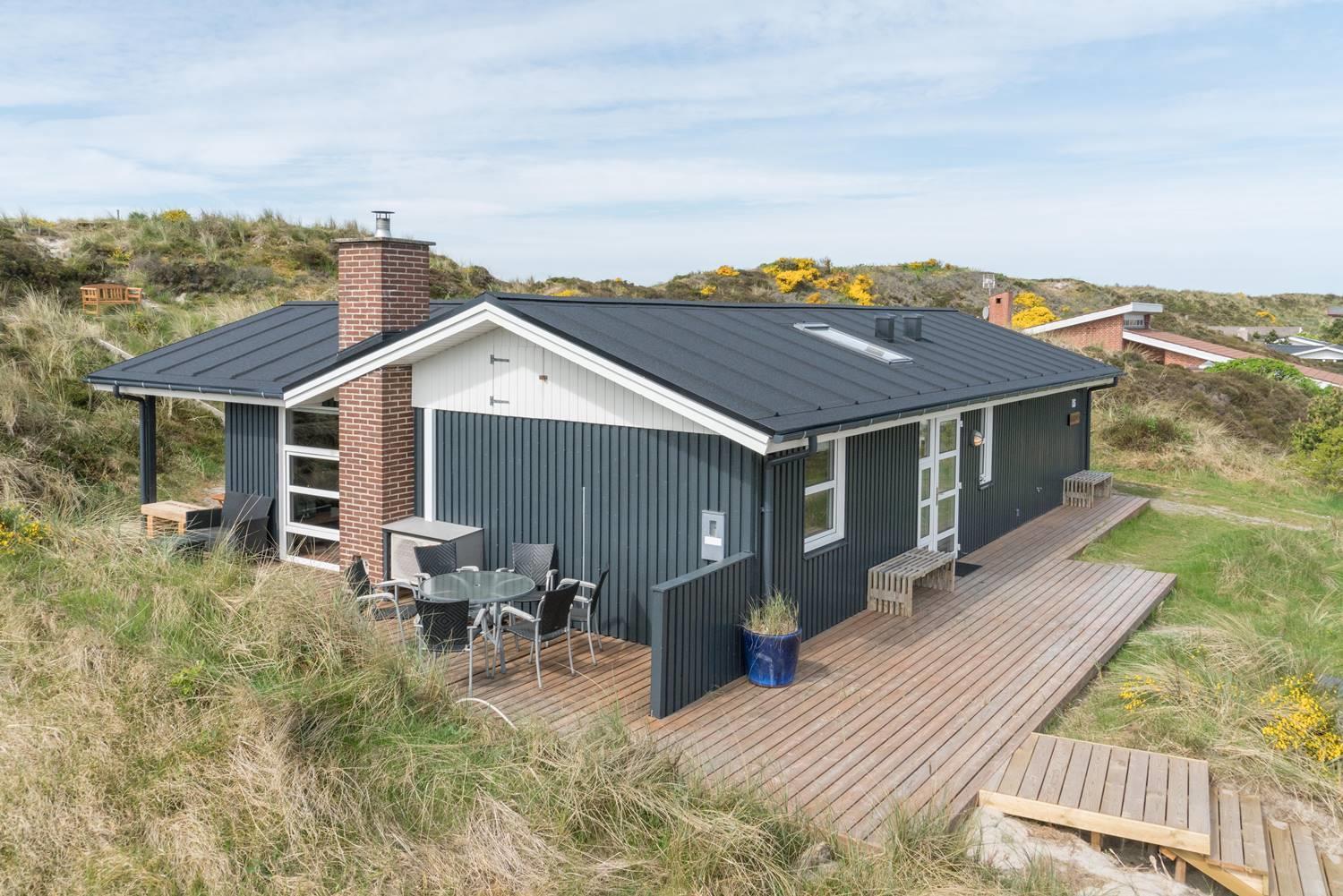 Velholdt og hyggelig indrettet feriehus med sauna beliggende på en pragtfuld, læfyldt og ugeneret klitgrund. Huset er lyst og venligt indrettet med veludstyret køkken i åben forbindelse med stuen. Fra stuen er der udgang til en skøn delvist overdækket terrasse. Her finder I også en trappe op til en bænk på den omkringliggende klit, hvorfra udsigten kan nydes i fulde drag. Huset har energivenlig varmepumpe og brændeovn. Lyst badeværelset, som er udstyret med en sauna. 3 gode soverum og god skabsplads. Stort depotrum til cykler m.m. Der er ekstra køleskab i depotrum'