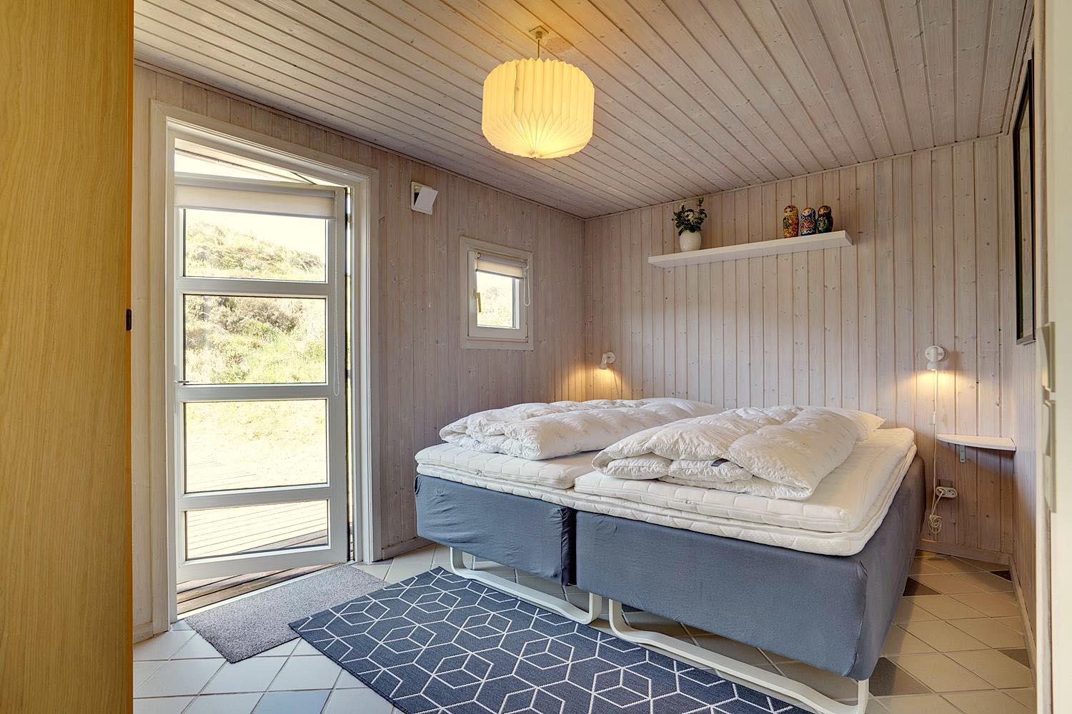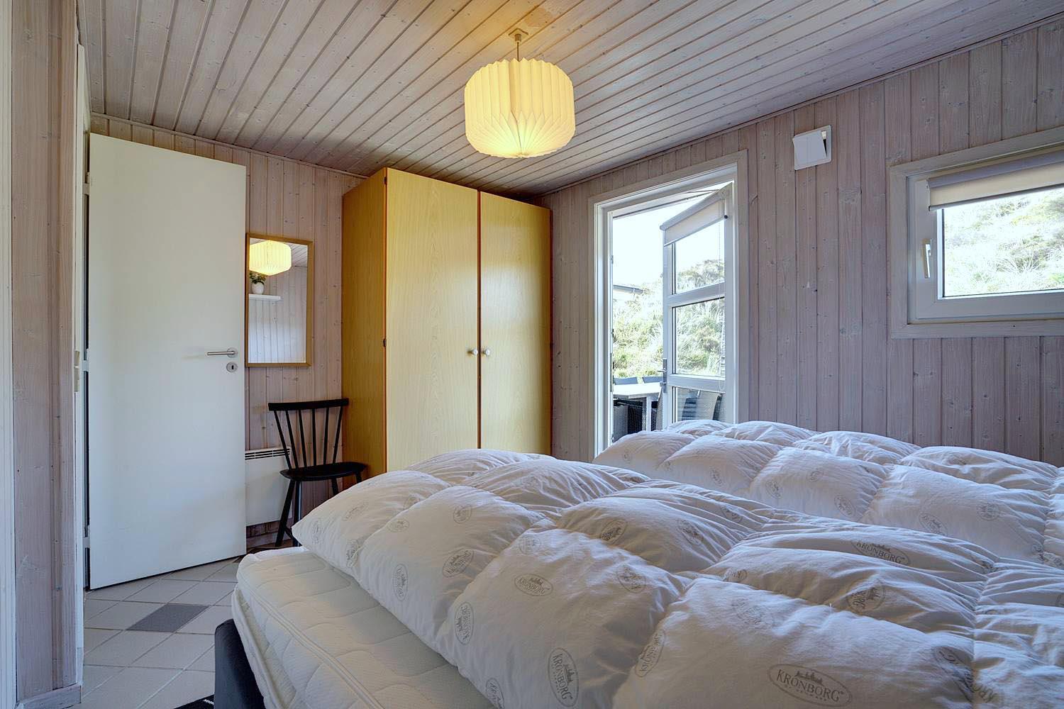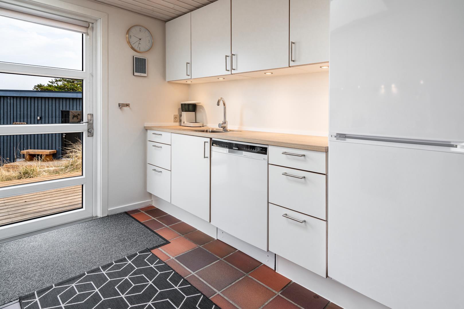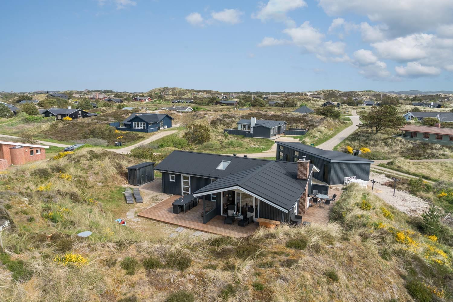 Velholdt og hyggelig indrettet feriehus med sauna beliggende på en pragtfuld, læfyldt og ugeneret klitgrund. Huset er lyst og venligt indrettet med veludstyret køkken i åben forbindelse med stuen. Fra stuen er der udgang til en skøn delvist overdækket terrasse. Her finder I også en trappe op til en bænk på den omkringliggende klit, hvorfra udsigten kan nydes i fulde drag. Huset har energivenlig varmepumpe og brændeovn. Lyst badeværelset, som er udstyret med en sauna. 3 gode soverum og god skabsplads. Stort depotrum til cykler m.m. Der er ekstra køleskab i depotrum'