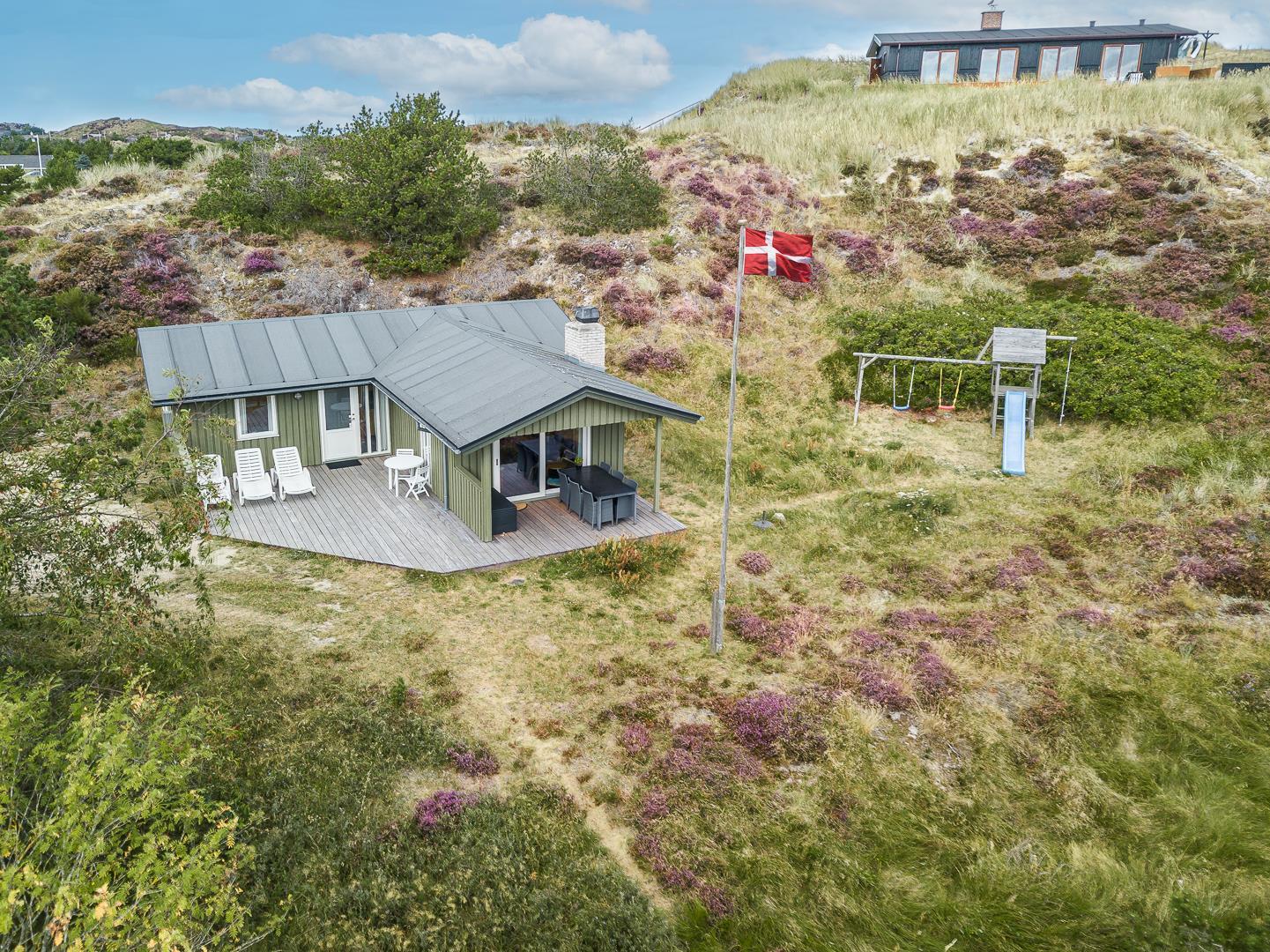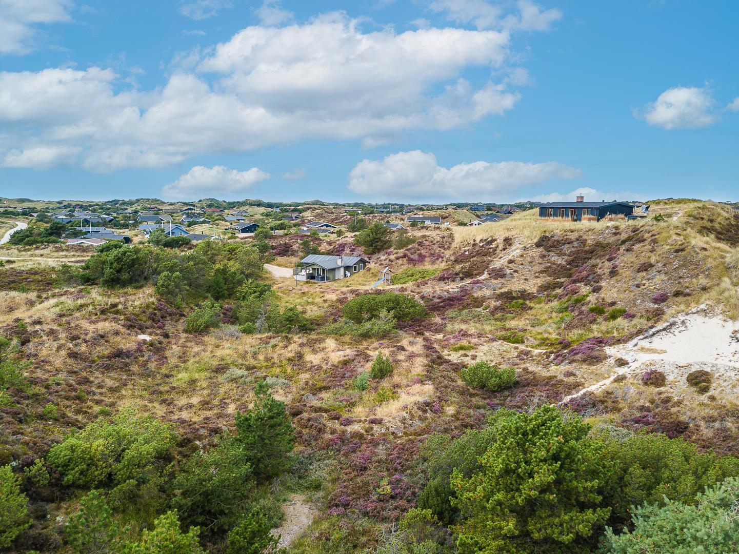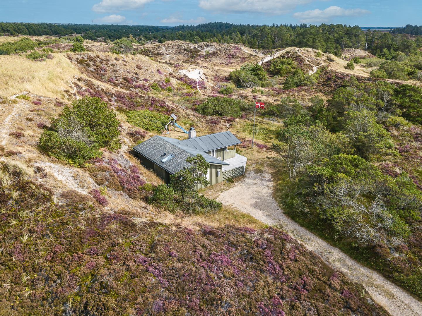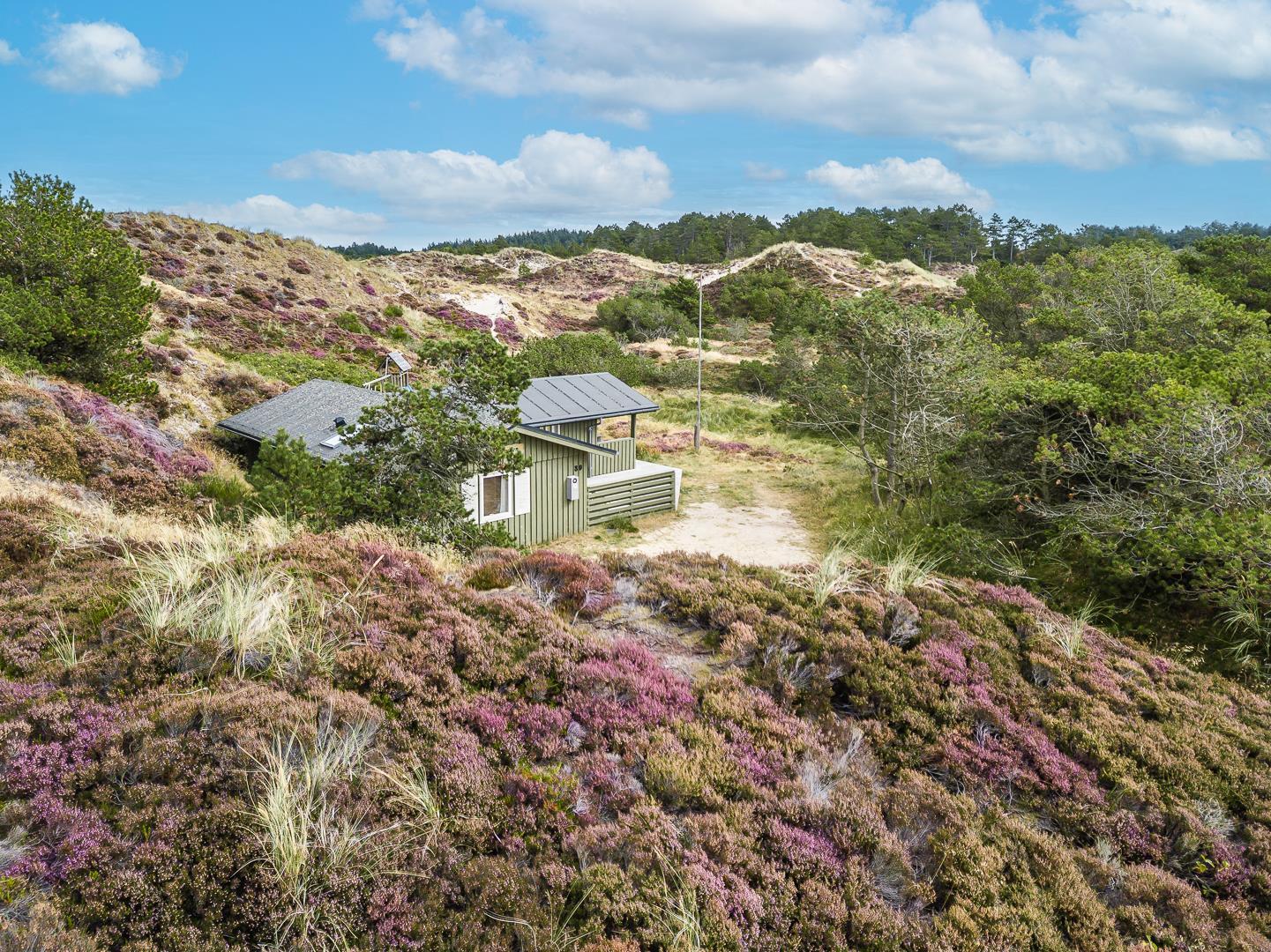 På en pragtfuld naturgrund i en gryde helt for sig selv ligger dette hyggelige og velholdte feriehus. Pænt køkken i åben forbindelse til stue med brændeovn med glaslåge. Dejligt badeværelse. Fra stuen er der super flot udsigt til fredet hedeområde og udgang til sydvendt delvis overdækket træterrasse. Huset er omkranset af klitter og ligger derfor dejligt i læ og ugenert.