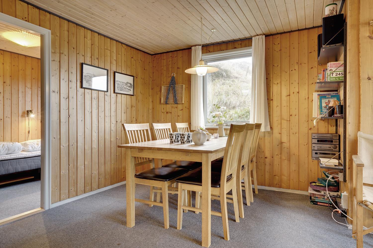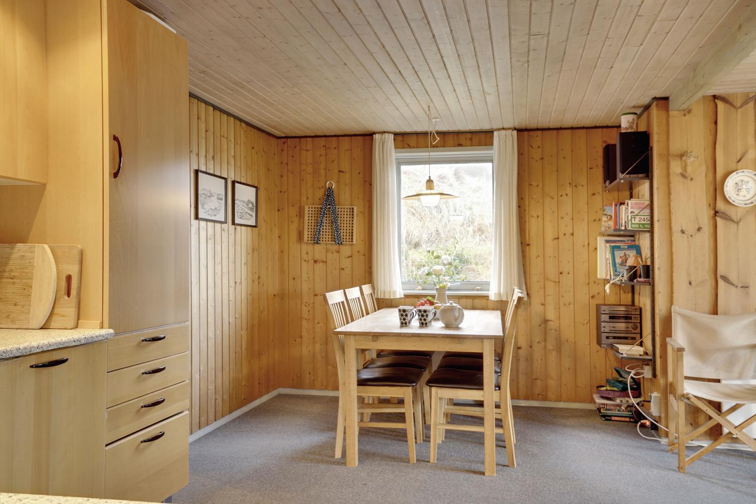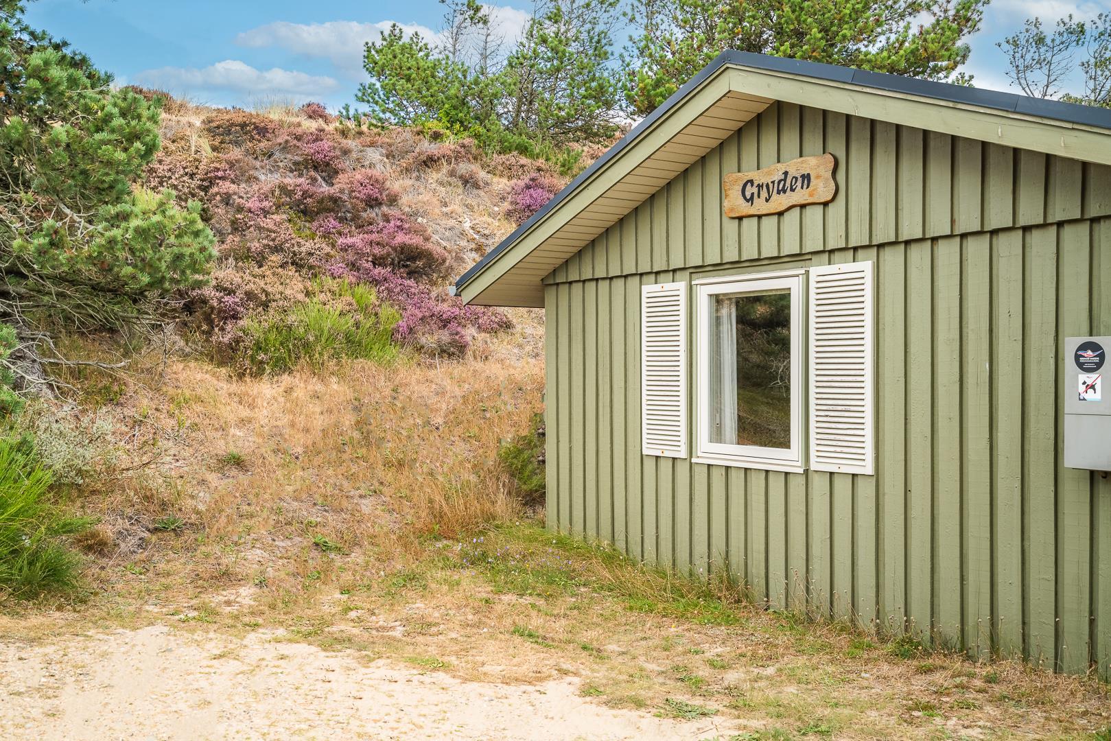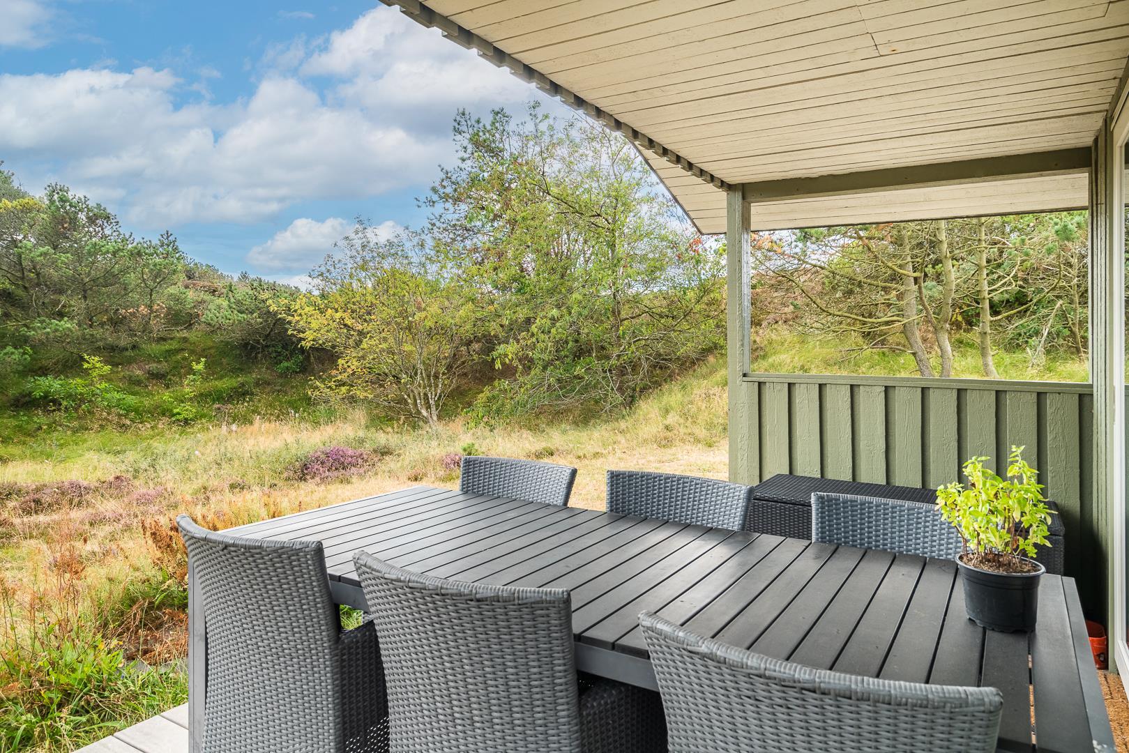 På en pragtfuld naturgrund i en gryde helt for sig selv ligger dette hyggelige og velholdte feriehus. Pænt køkken i åben forbindelse til stue med brændeovn med glaslåge. Dejligt badeværelse. Fra stuen er der super flot udsigt til fredet hedeområde og udgang til sydvendt delvis overdækket træterrasse. Huset er omkranset af klitter og ligger derfor dejligt i læ og ugenert.