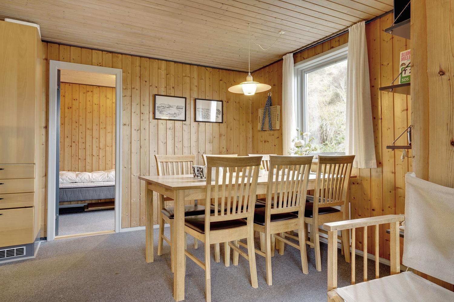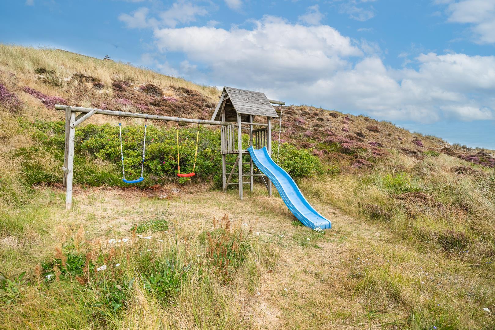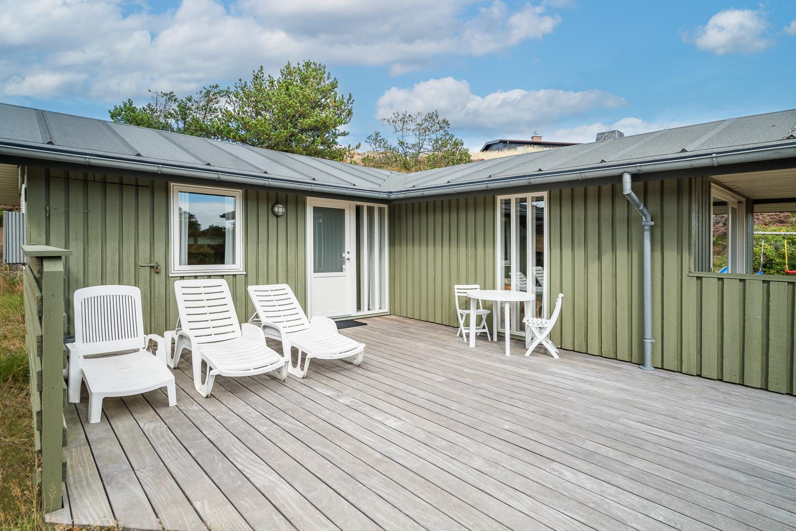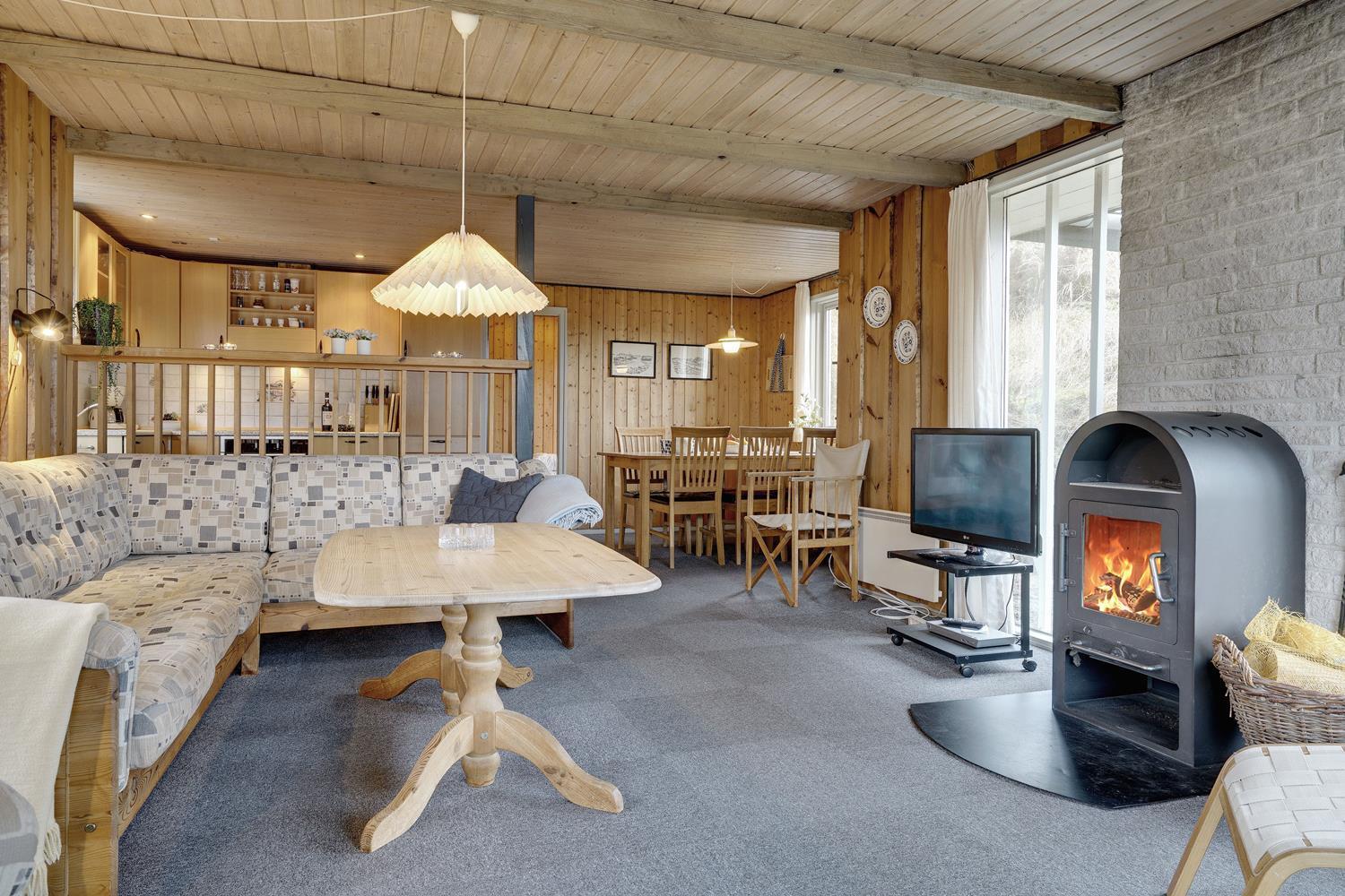 På en pragtfuld naturgrund i en gryde helt for sig selv ligger dette hyggelige og velholdte feriehus. Pænt køkken i åben forbindelse til stue med brændeovn med glaslåge. Dejligt badeværelse. Fra stuen er der super flot udsigt til fredet hedeområde og udgang til sydvendt delvis overdækket træterrasse. Huset er omkranset af klitter og ligger derfor dejligt i læ og ugenert.