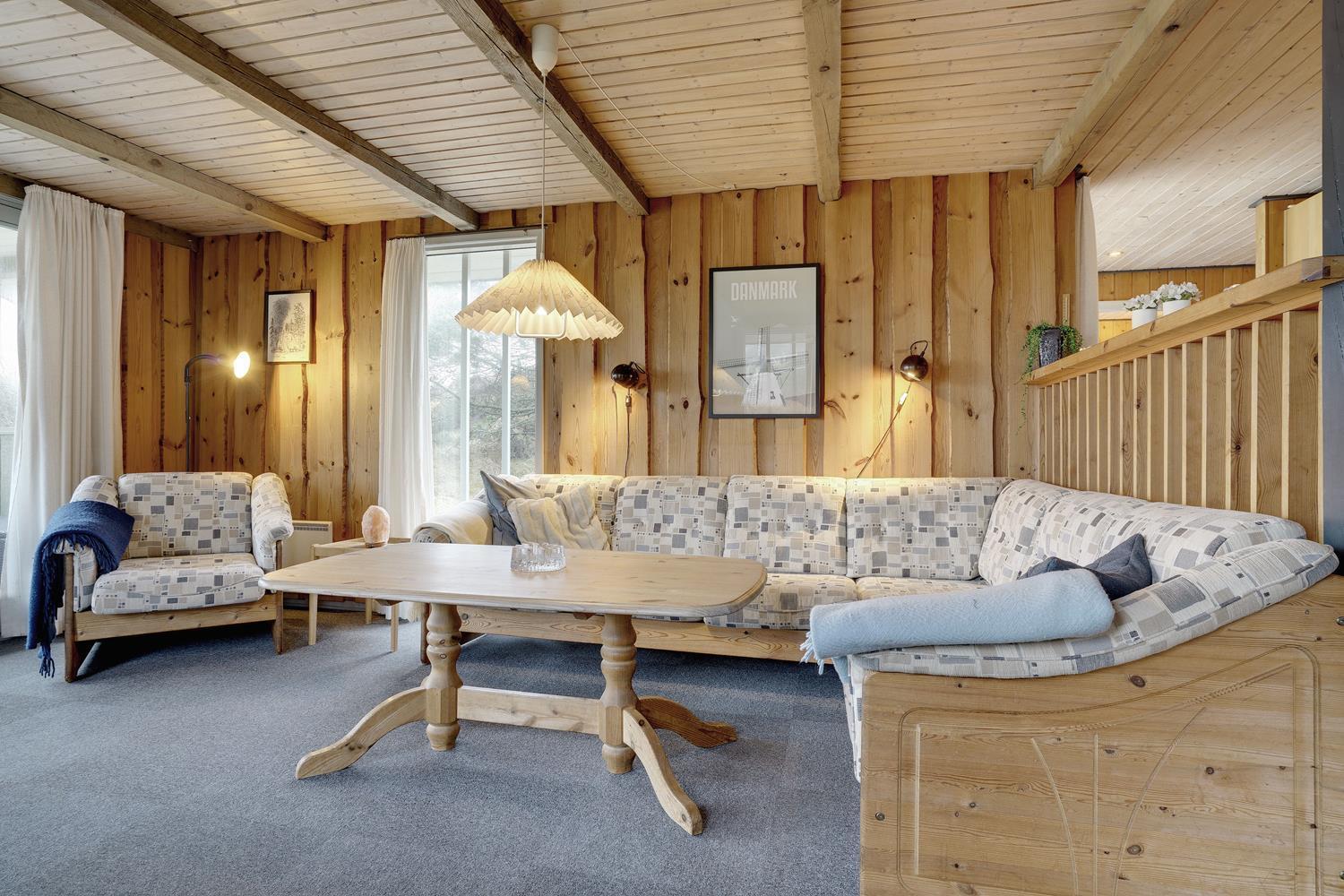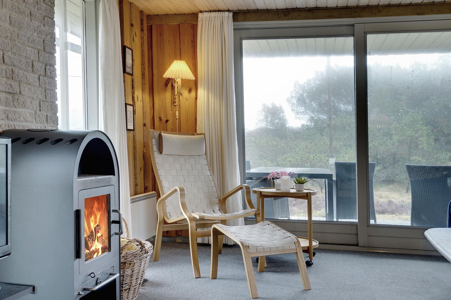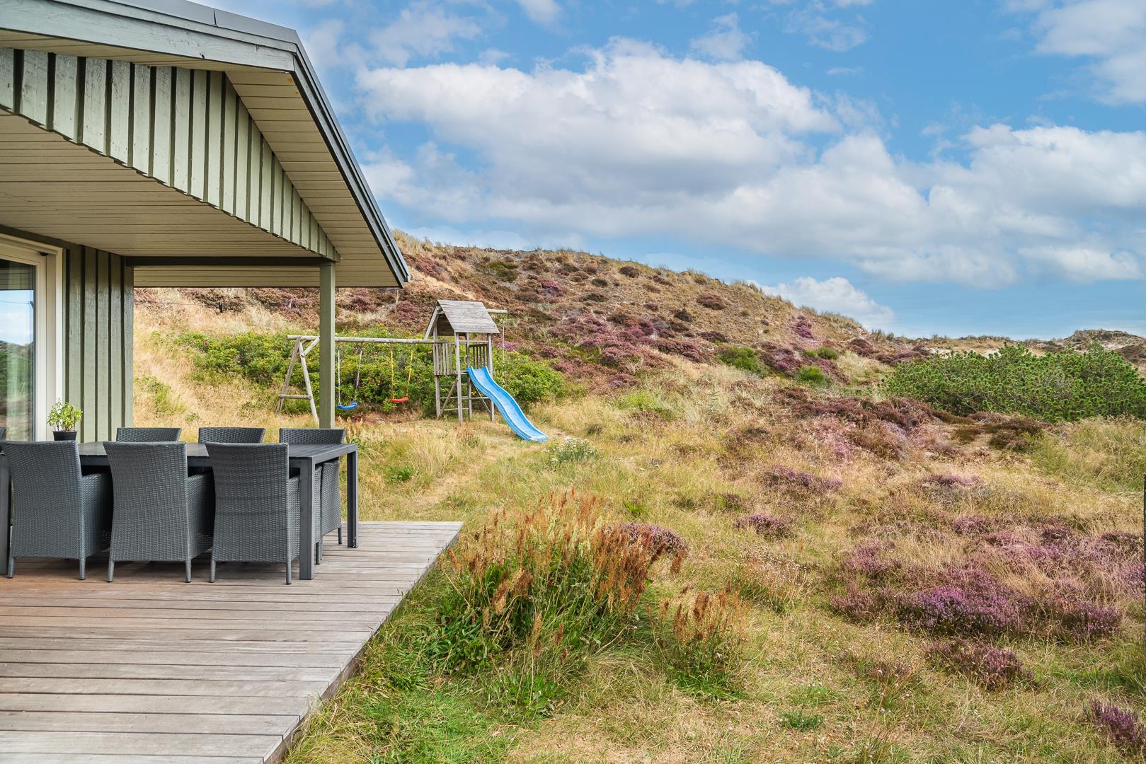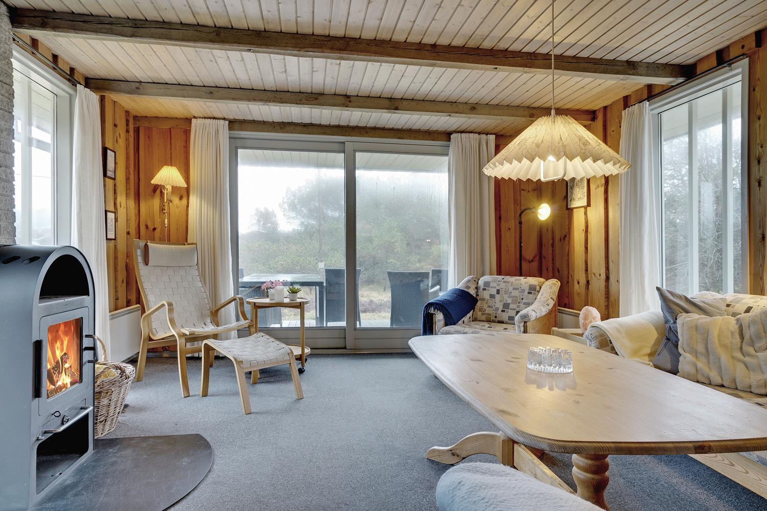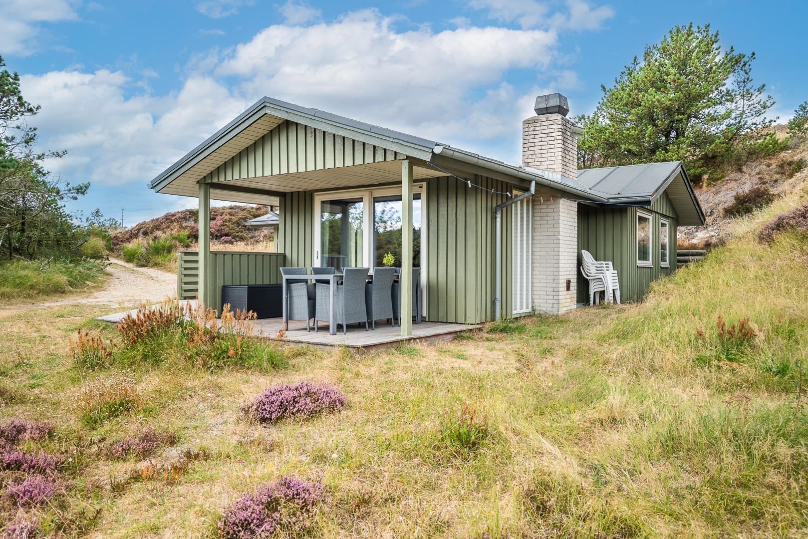 Hyggeligt feriehus i Henne Strand med brændeovn, sauna og smuk udsigt til fredet hedeområde, tæt på stranden og naturen.