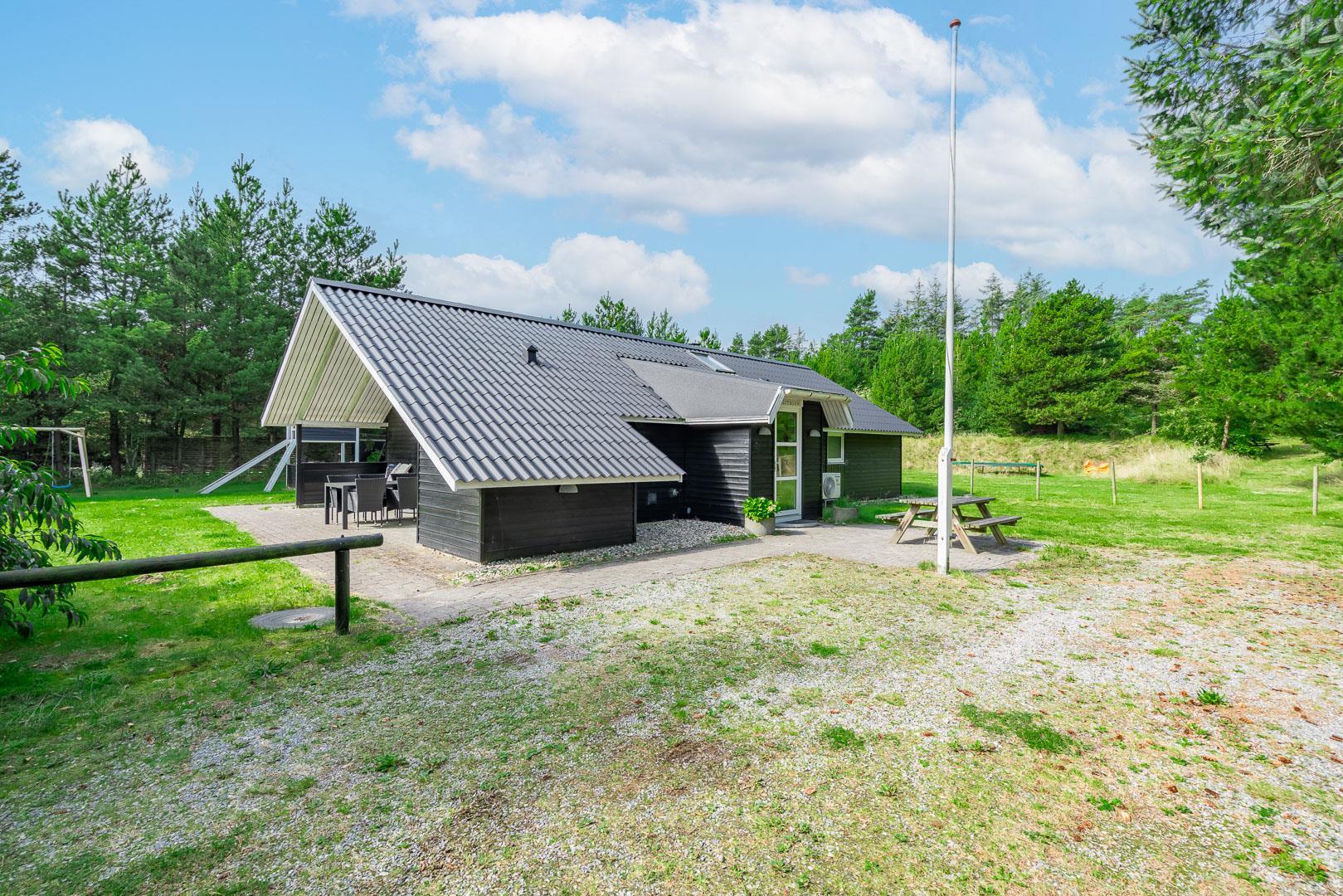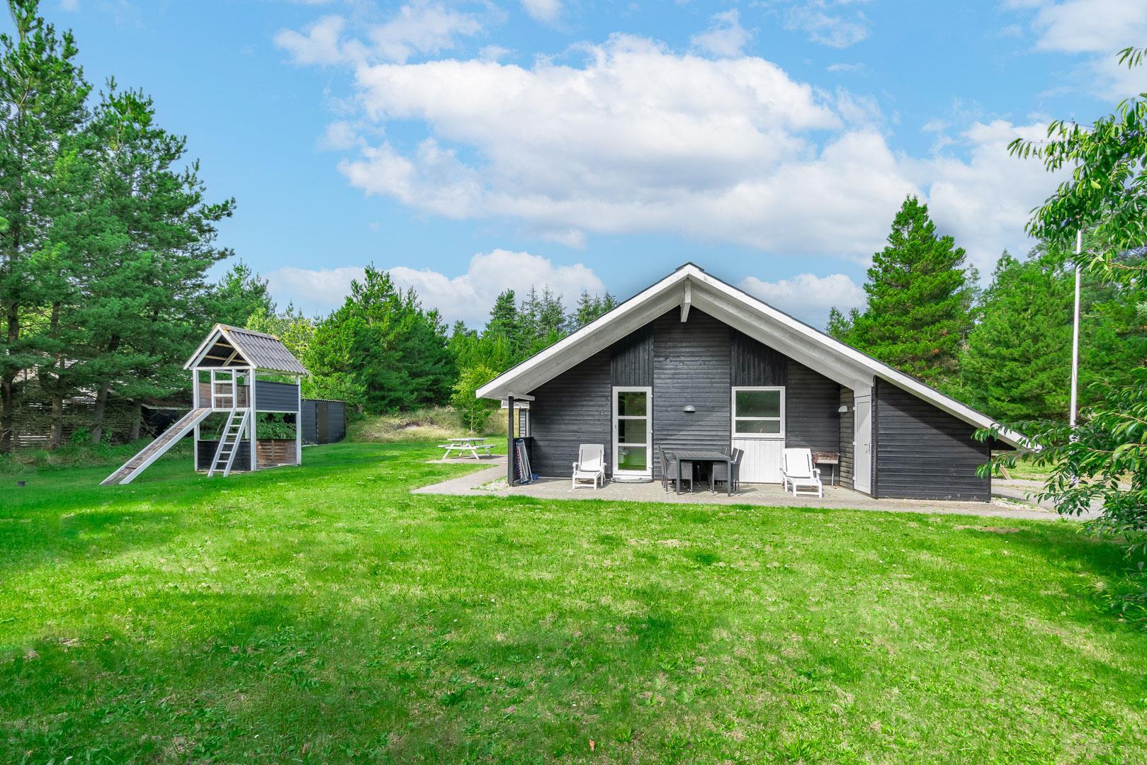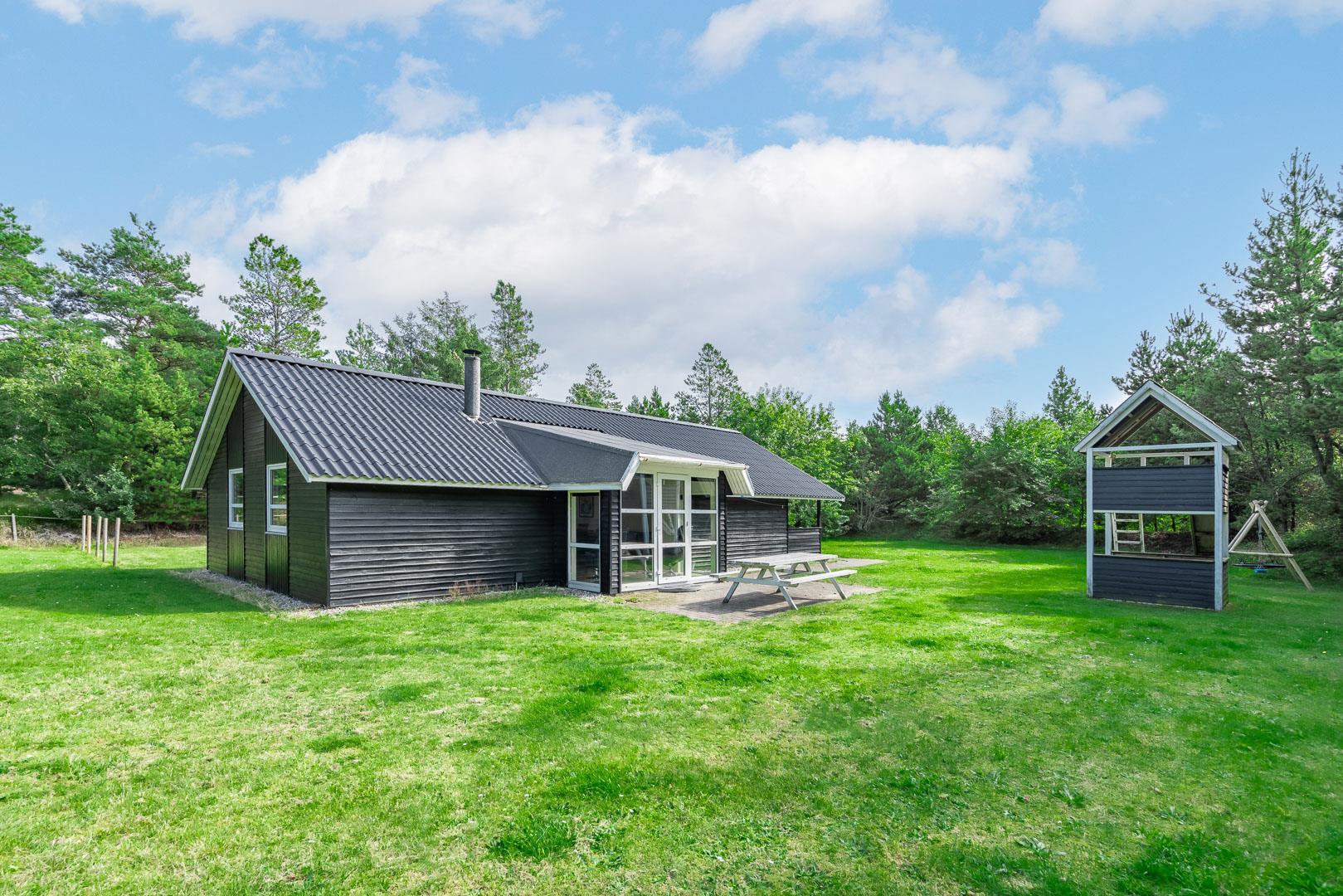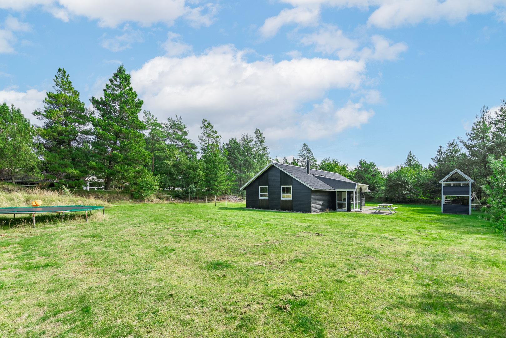 Hyggeligt feriehus nær Henne Strand med sauna, brændeovn og overdækket terrasse på stor naturgrund.