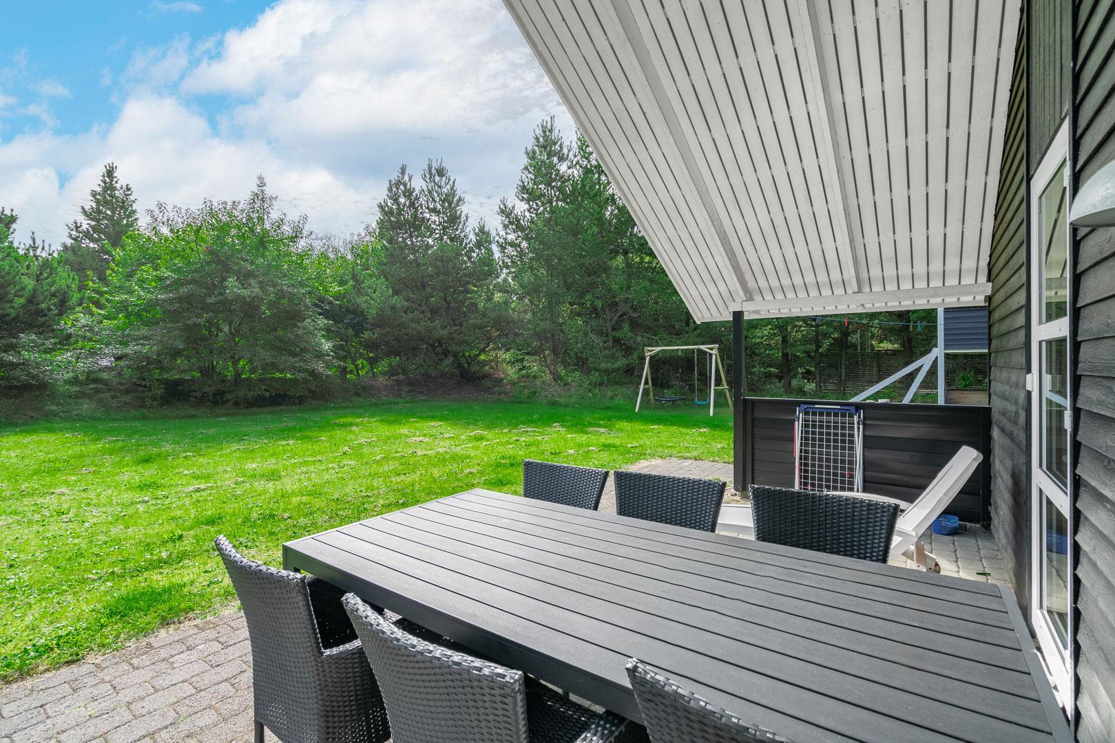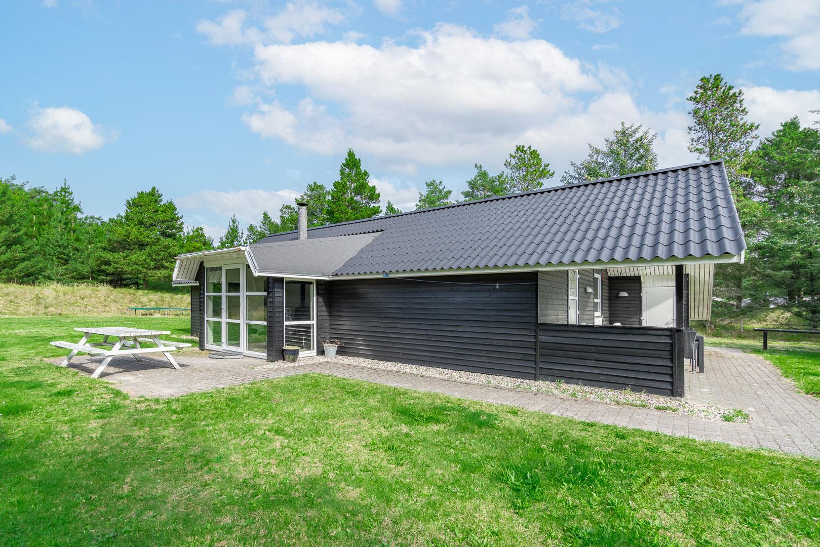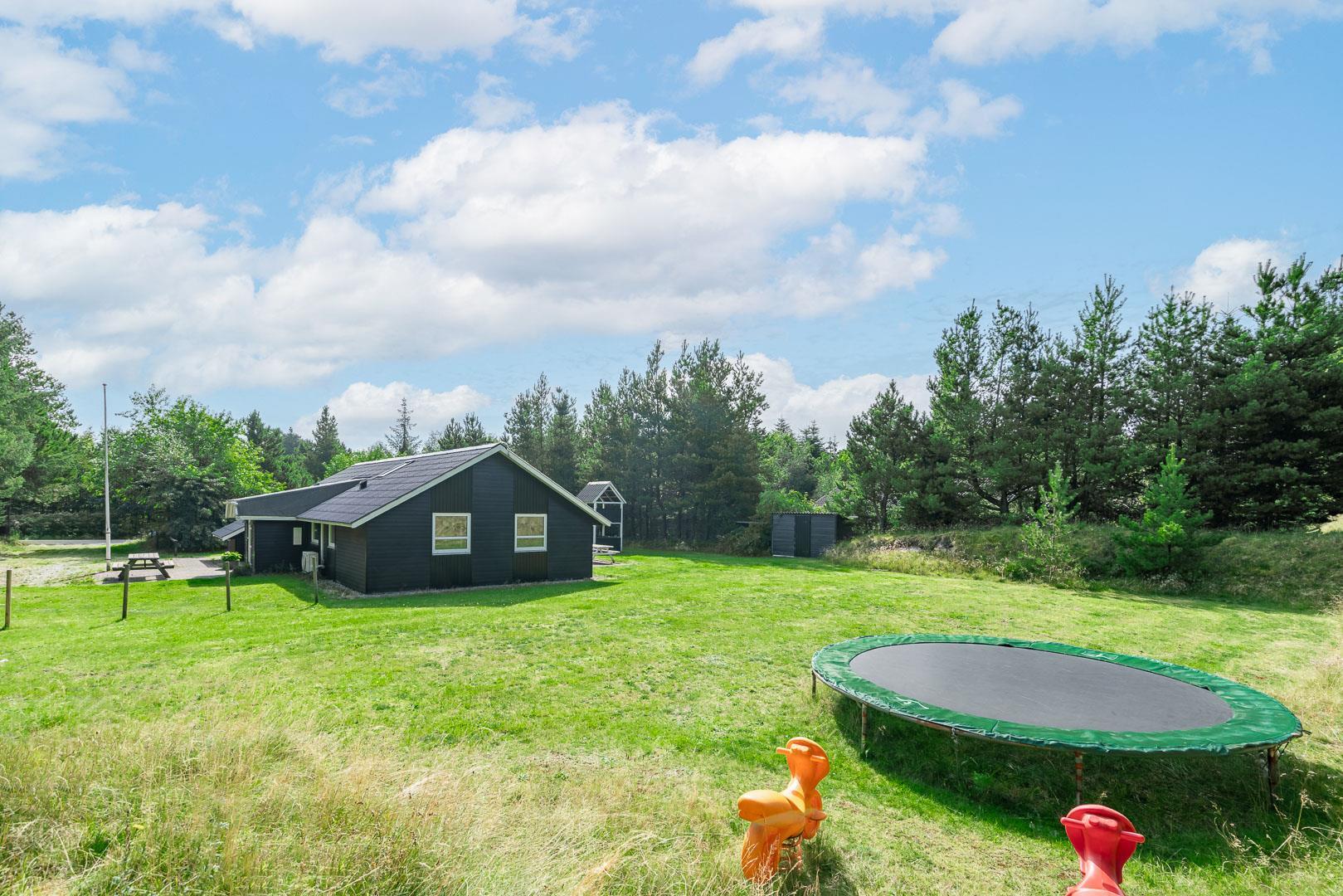 Hyggeligt feriehus nær Henne Strand med sauna, brændeovn og overdækket terrasse på stor naturgrund.
