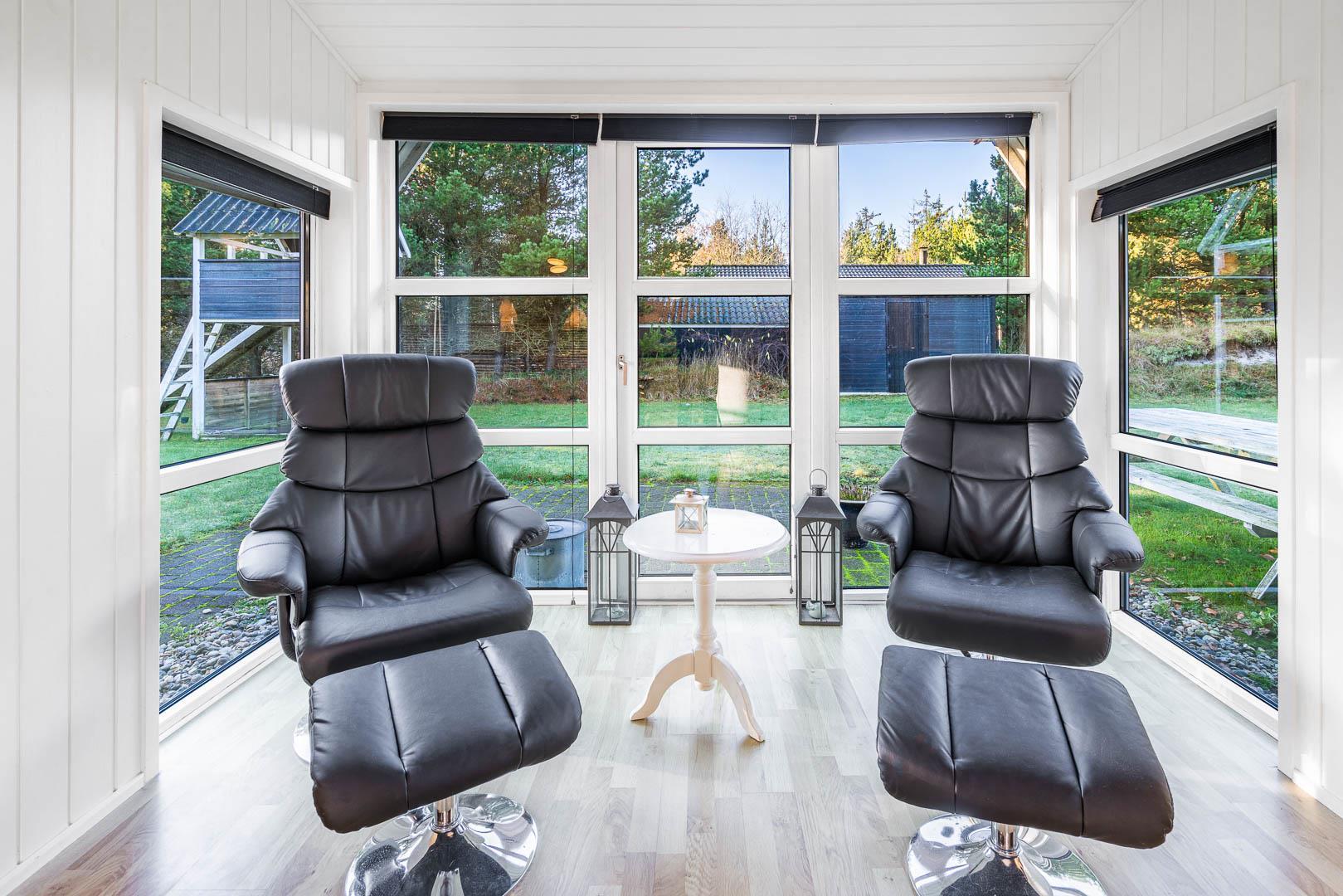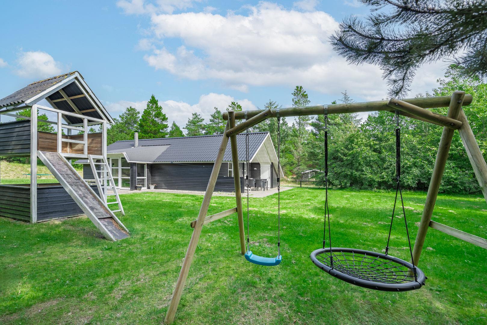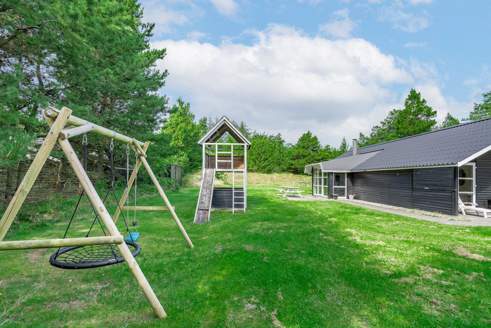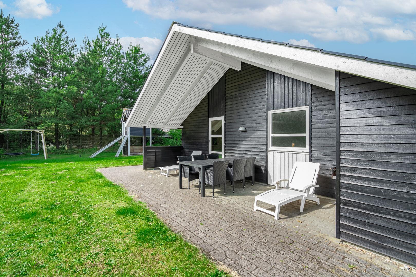 Hyggeligt feriehus nær Henne Strand med sauna, brændeovn og overdækket terrasse på stor naturgrund.