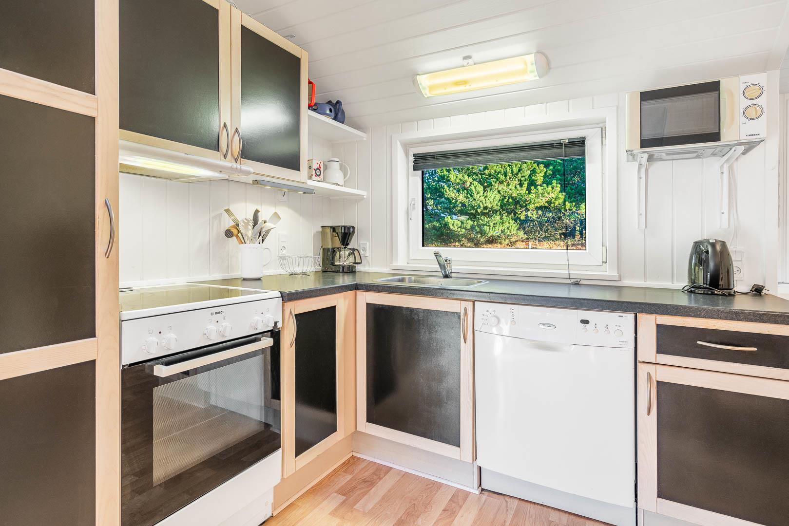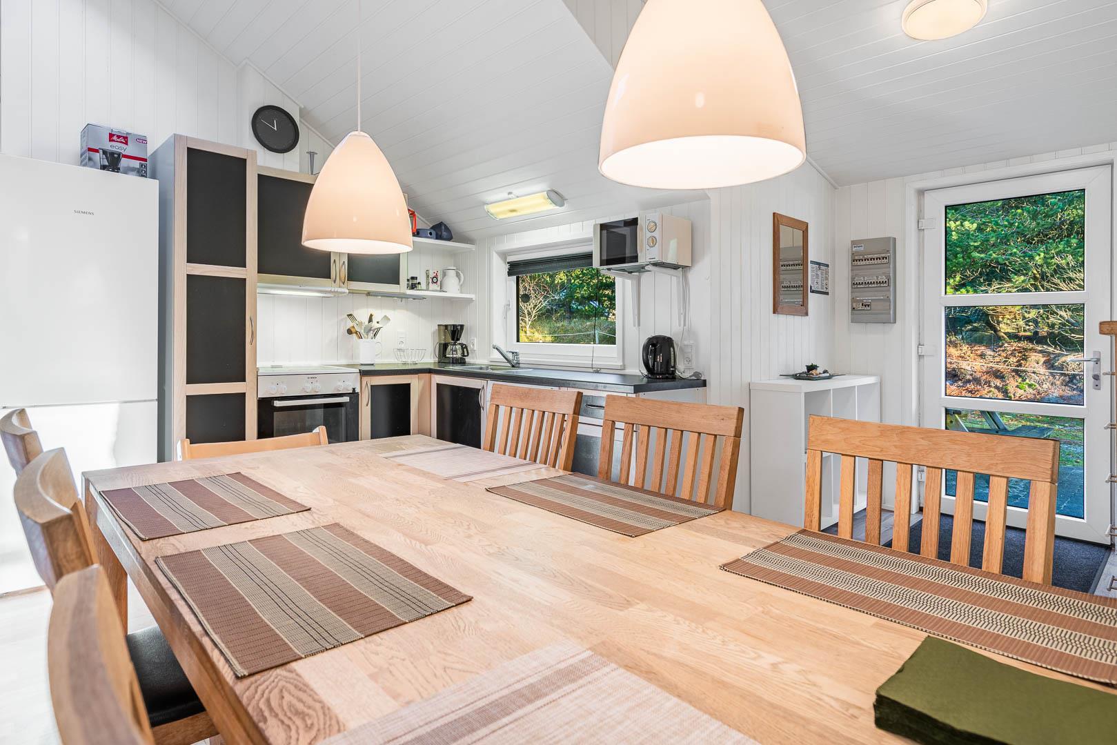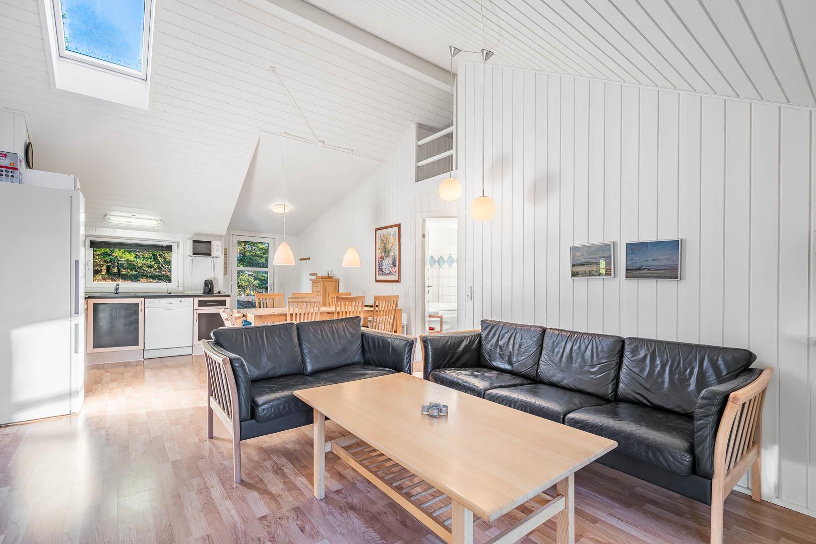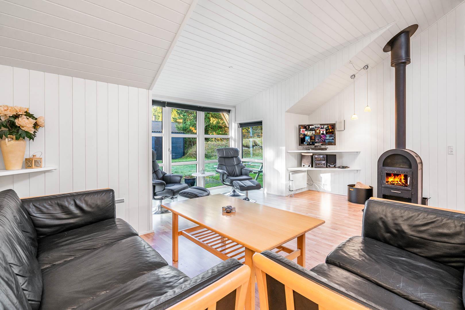 Dette skønne feriehus er beliggende på en dejlig naturgrund. Køkken i åben forbindelse til stue med højt til loftet og gode møbler, samt brændeovn med glaslåge. Fra stue er der udgang til terrasse. 3 gode soveværelser, hvoraf den ene har direkte udgang til overdækket terrasse. Trægulve overalt i huset. Gratis Internetforbindelse.