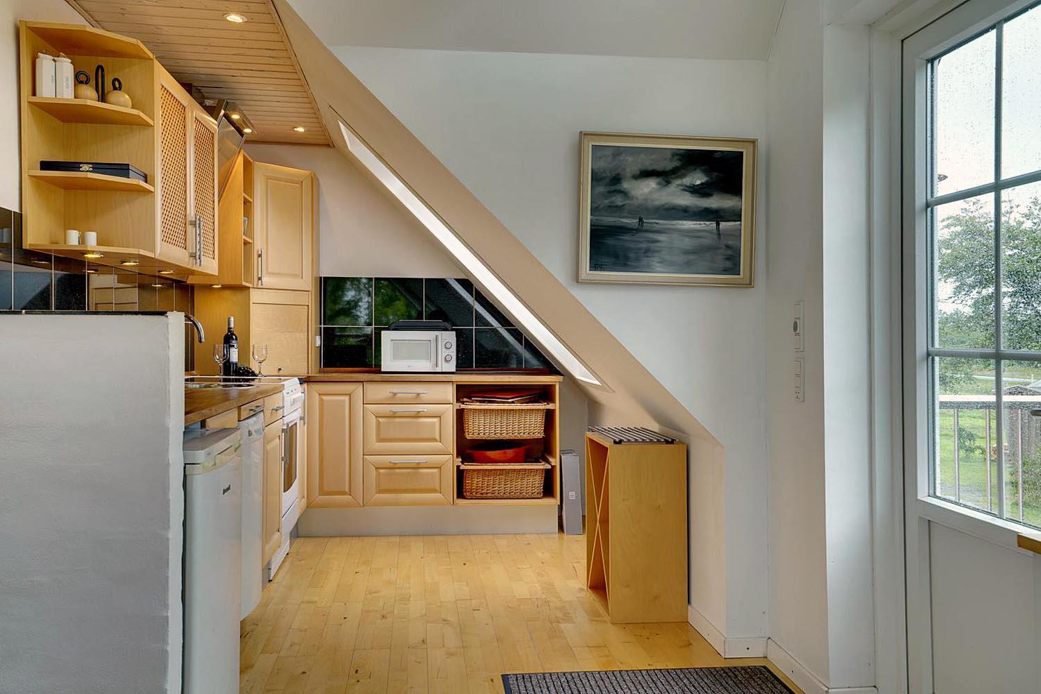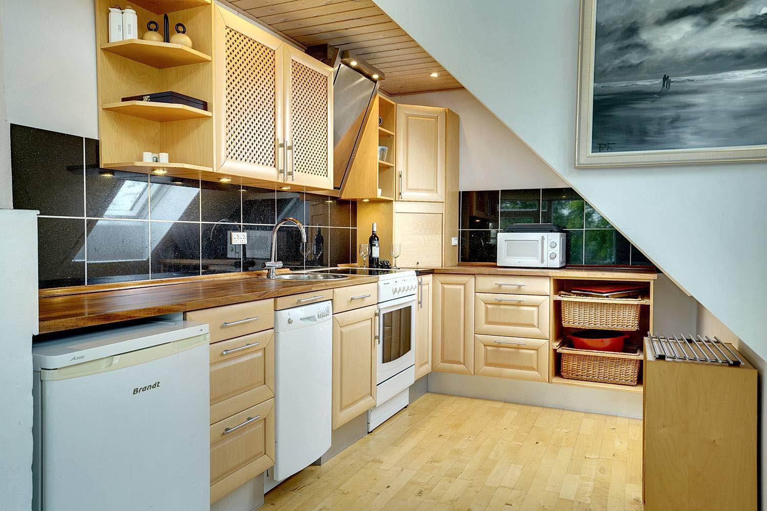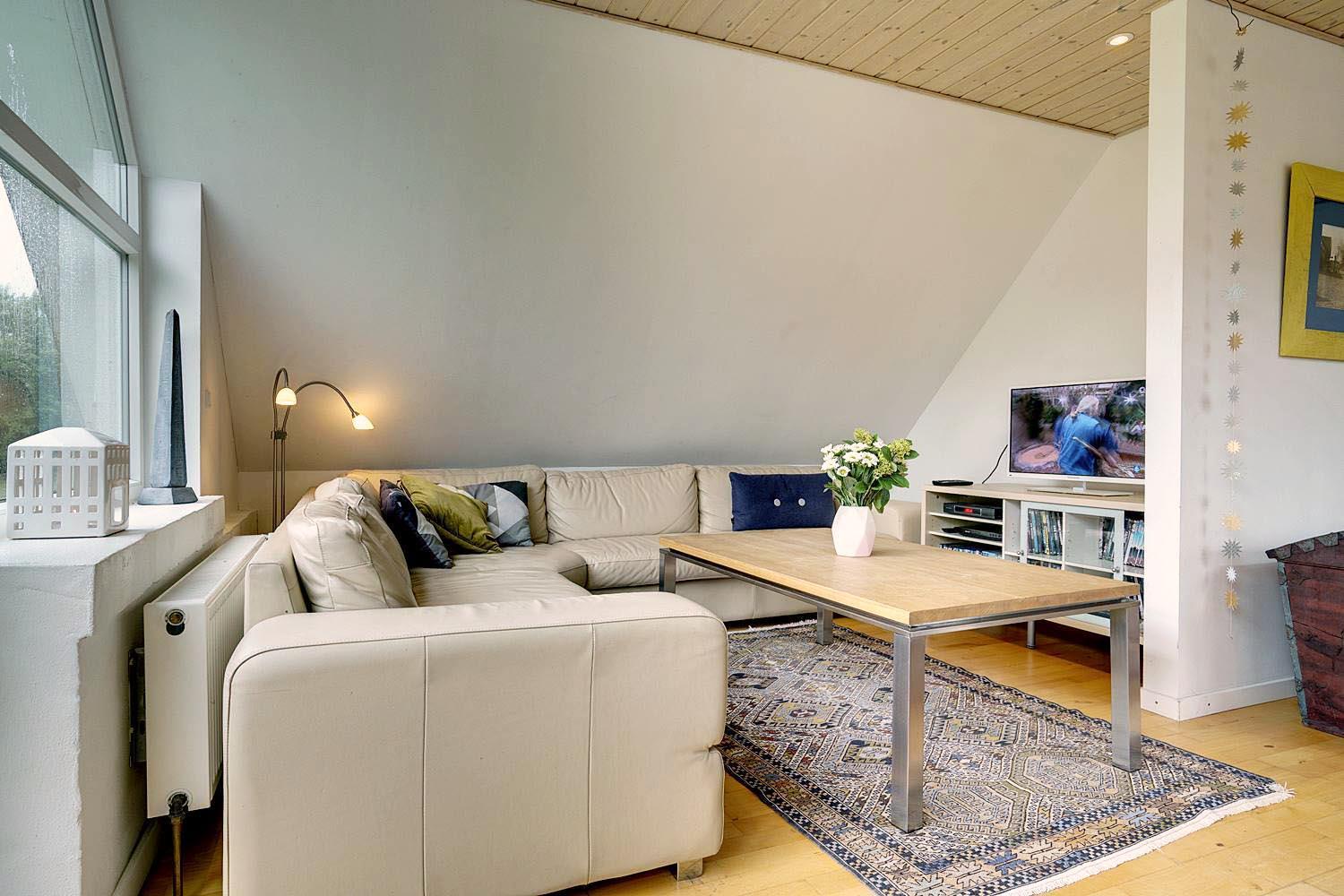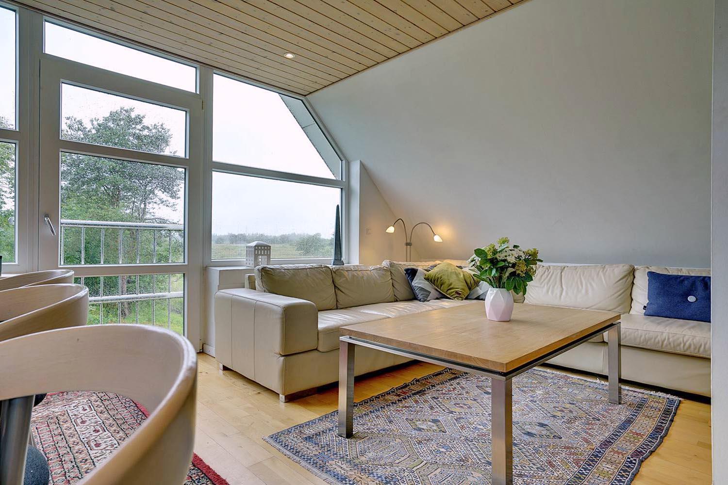 Denne lejlighed på 1. sal i Henne Kirkeby giver jer en unik mulighed for at opleve Vesterhavets perler, med en skøn udsigt over området og adgang til en række spændende oplevelser. I hjertet af lejligheden findes en lys og åben opholdsstue med køkkenafdeling, som indeholder alt, hvad I har brug for – keramisk komfur, emhætte, opvaskemaskine samt køleskab med lille fryser, alt sammen i åben forbindelse med stuen. Her kan I slappe af og nyde ferien efter dagens oplevelser.