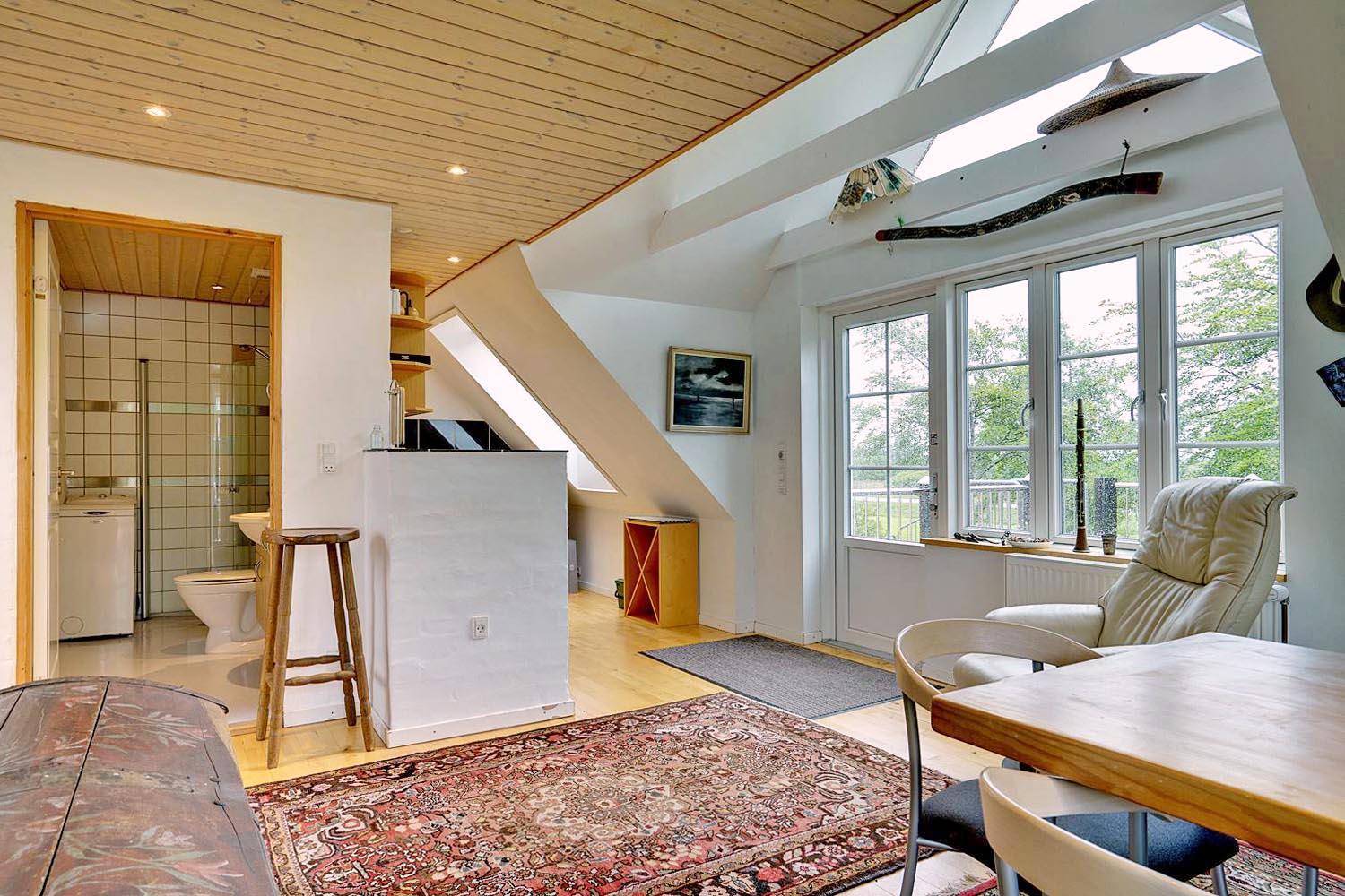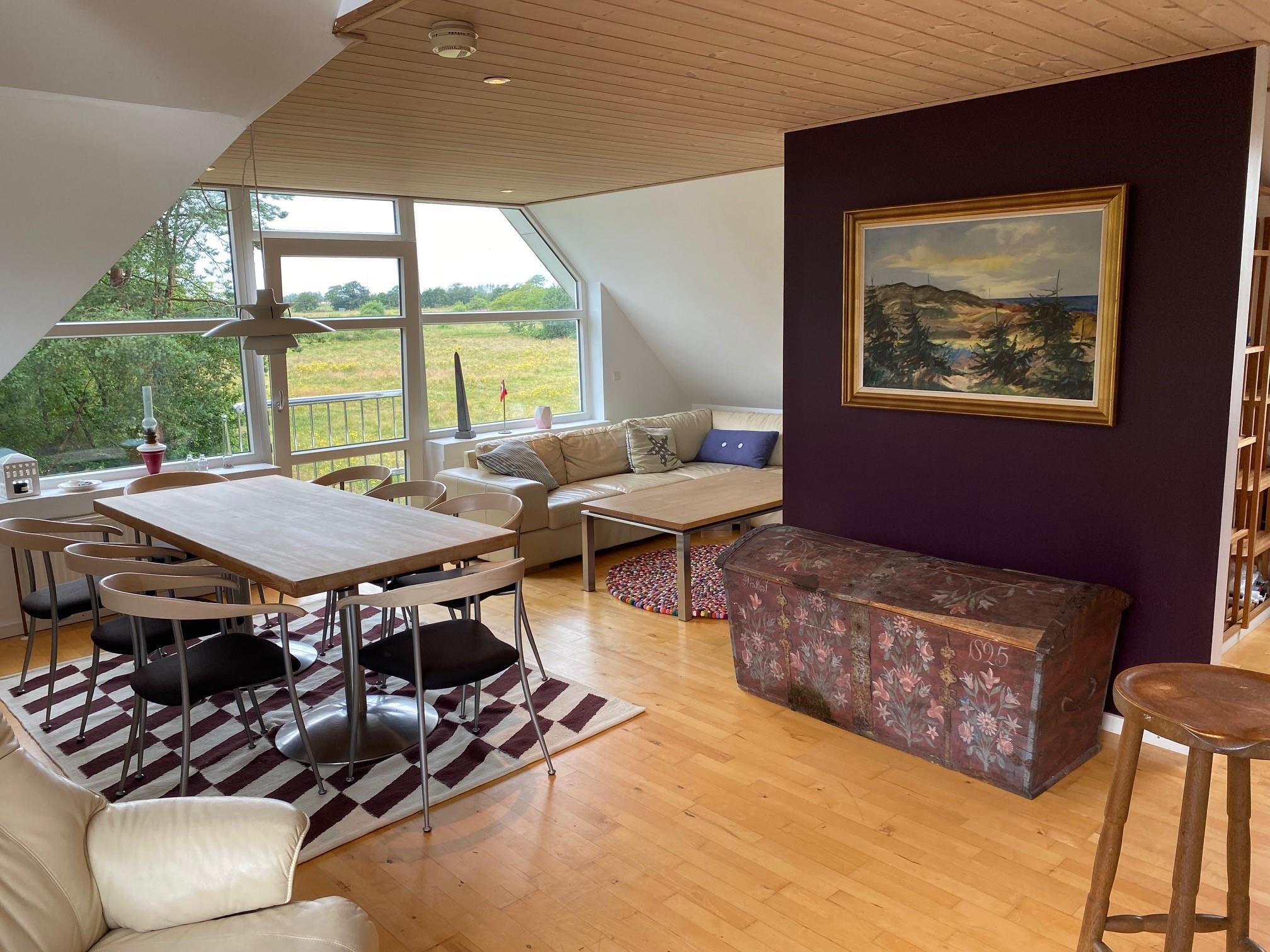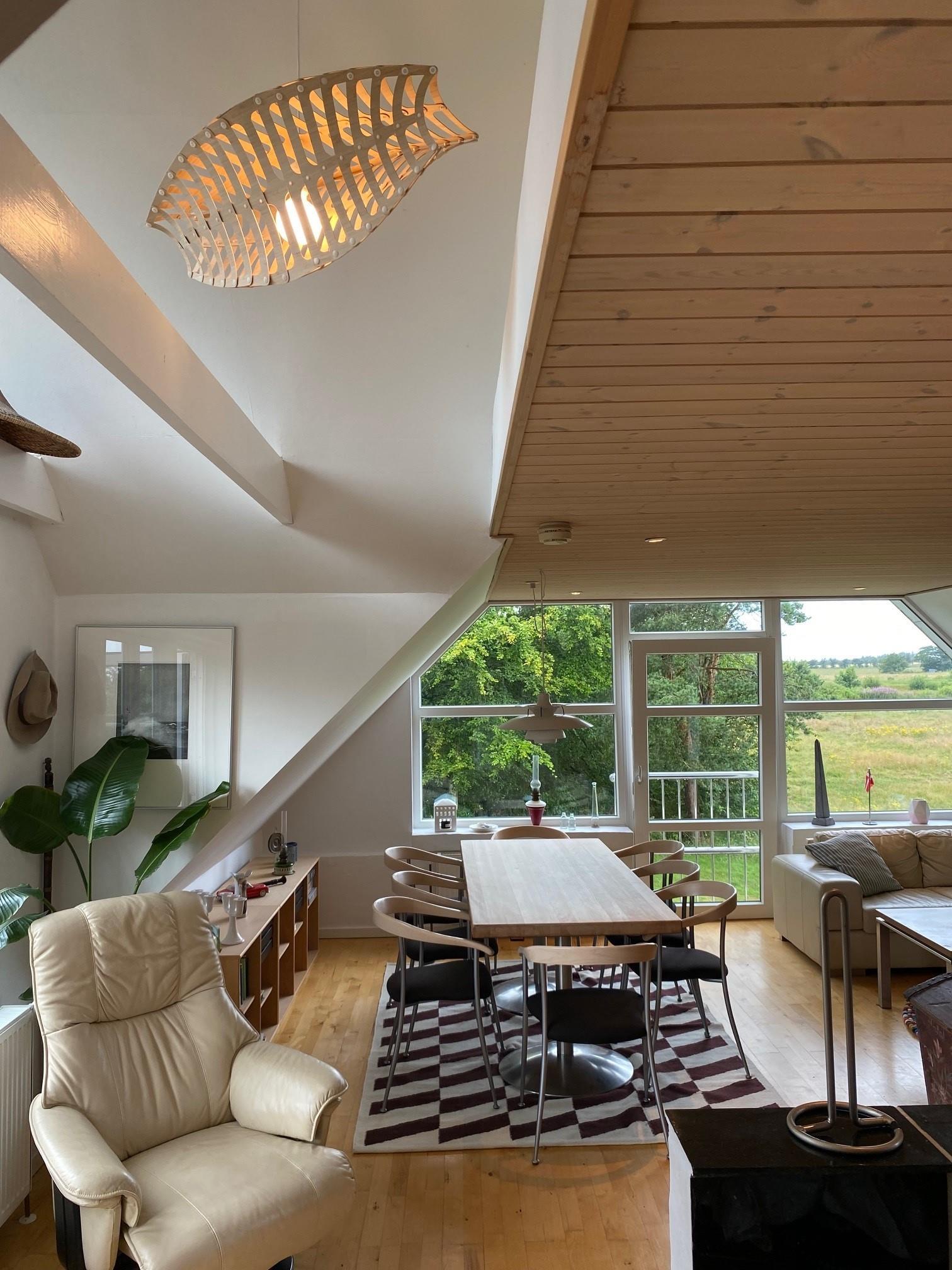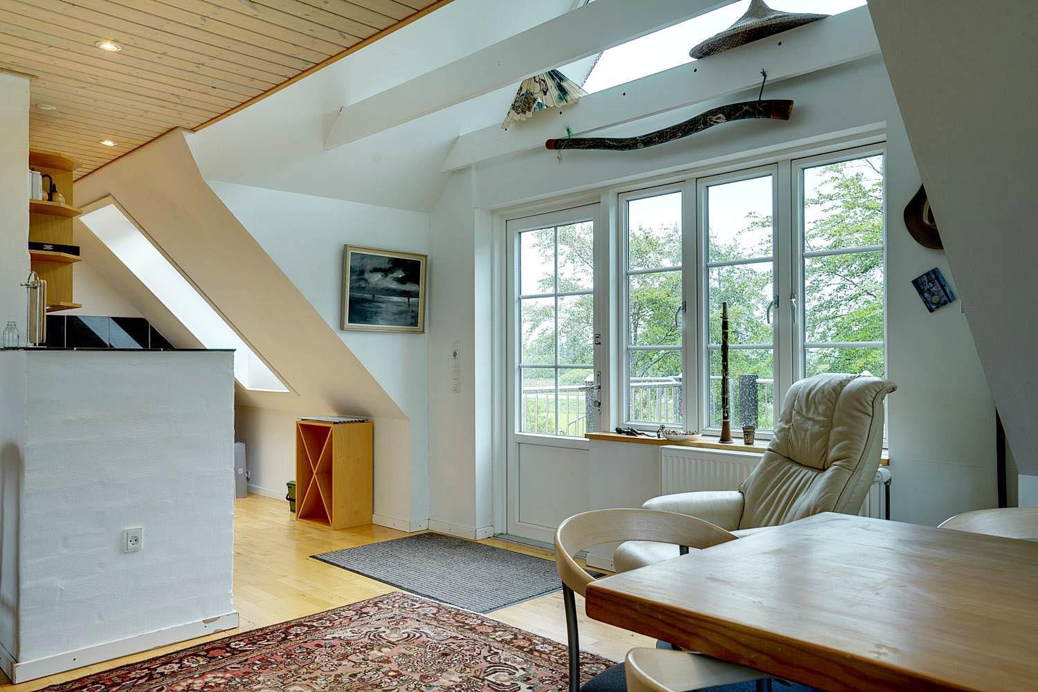 Denne lejlighed på 1. sal i Henne Kirkeby giver jer en unik mulighed for at opleve Vesterhavets perler, med en skøn udsigt over området og adgang til en række spændende oplevelser. I hjertet af lejligheden findes en lys og åben opholdsstue med køkkenafdeling, som indeholder alt, hvad I har brug for – keramisk komfur, emhætte, opvaskemaskine samt køleskab med lille fryser, alt sammen i åben forbindelse med stuen. Her kan I slappe af og nyde ferien efter dagens oplevelser.