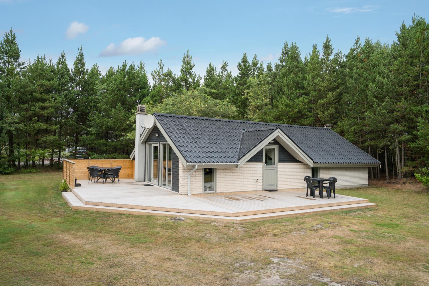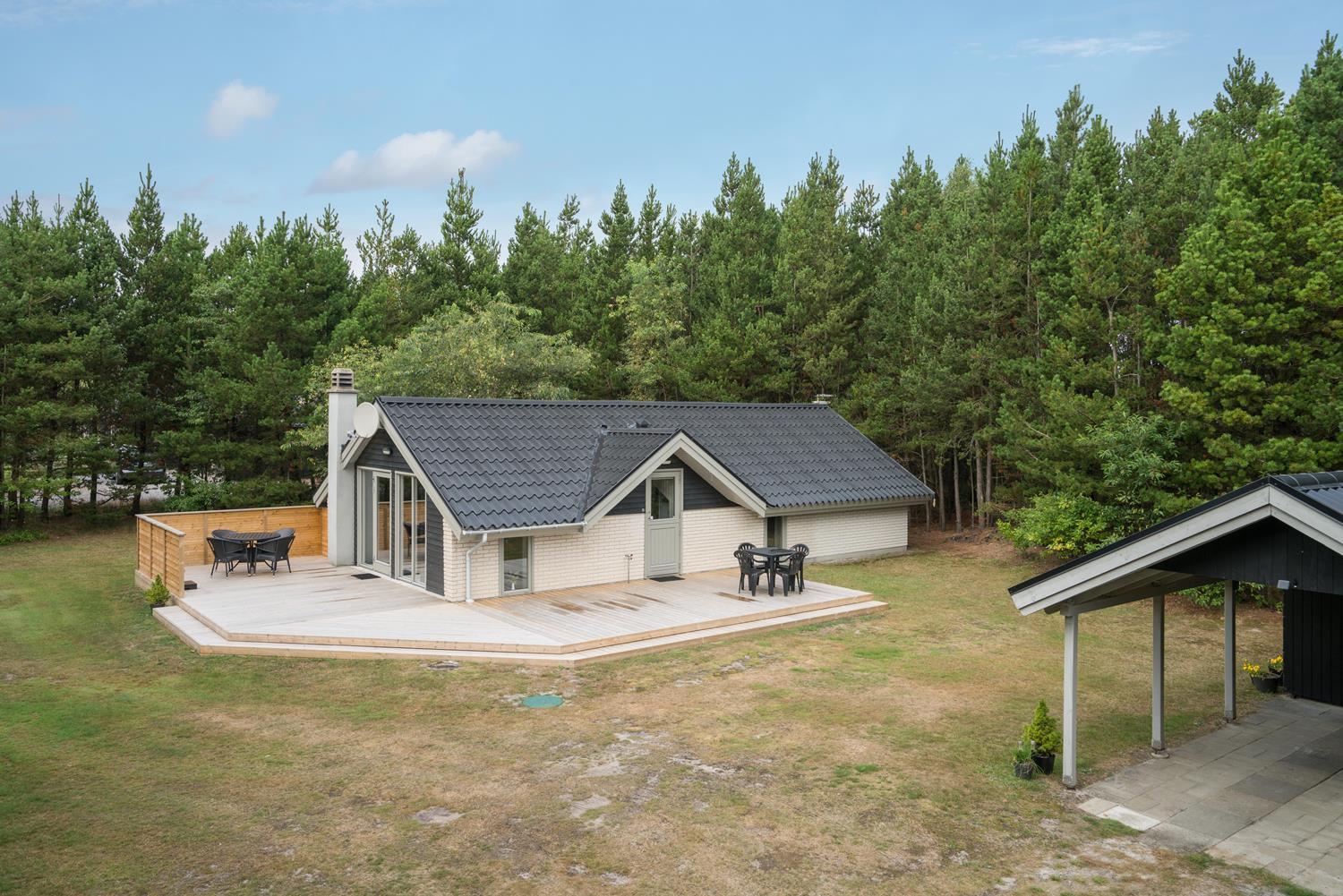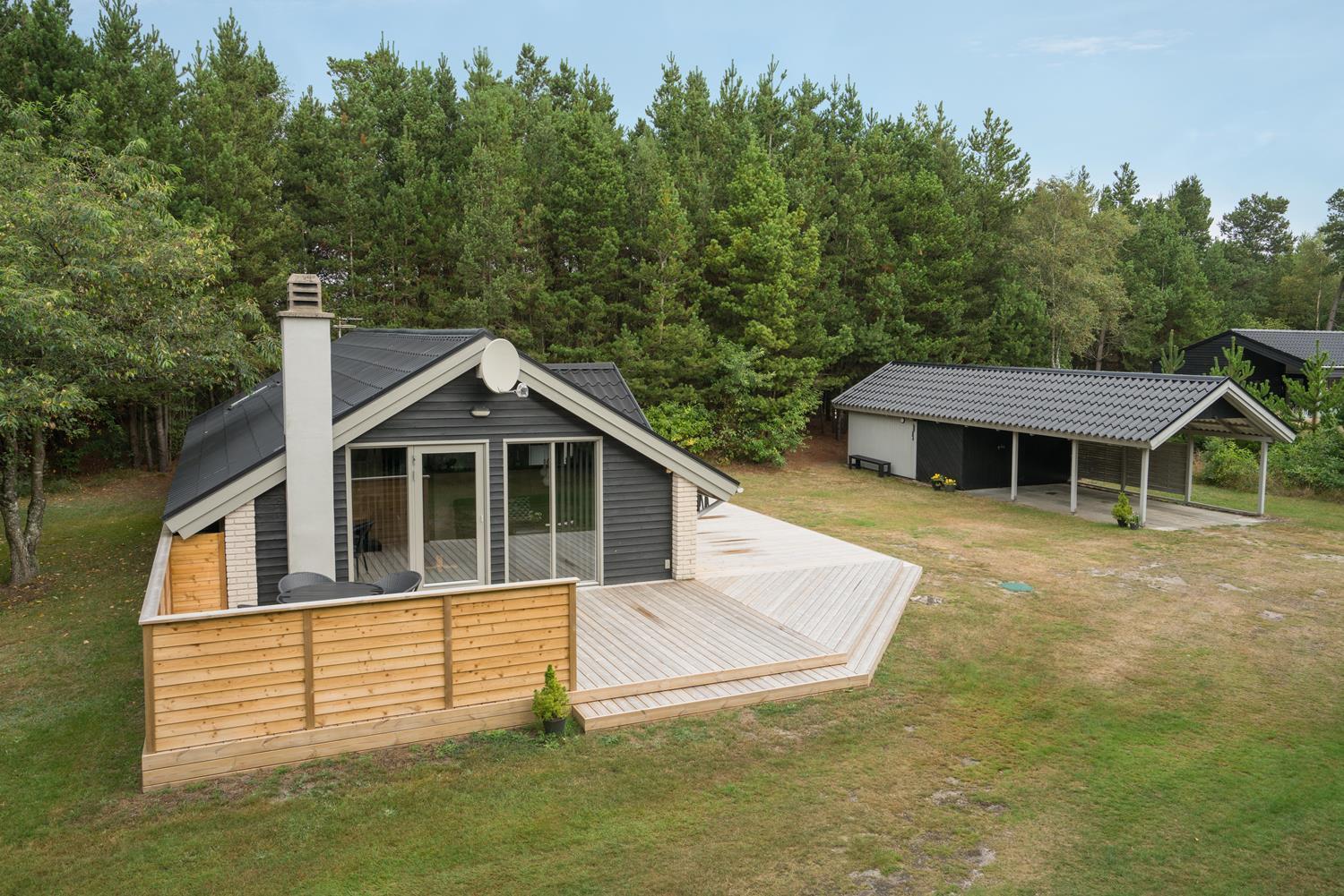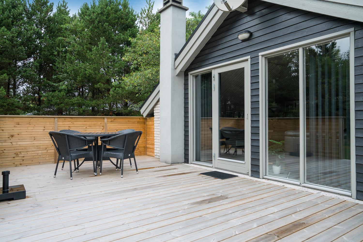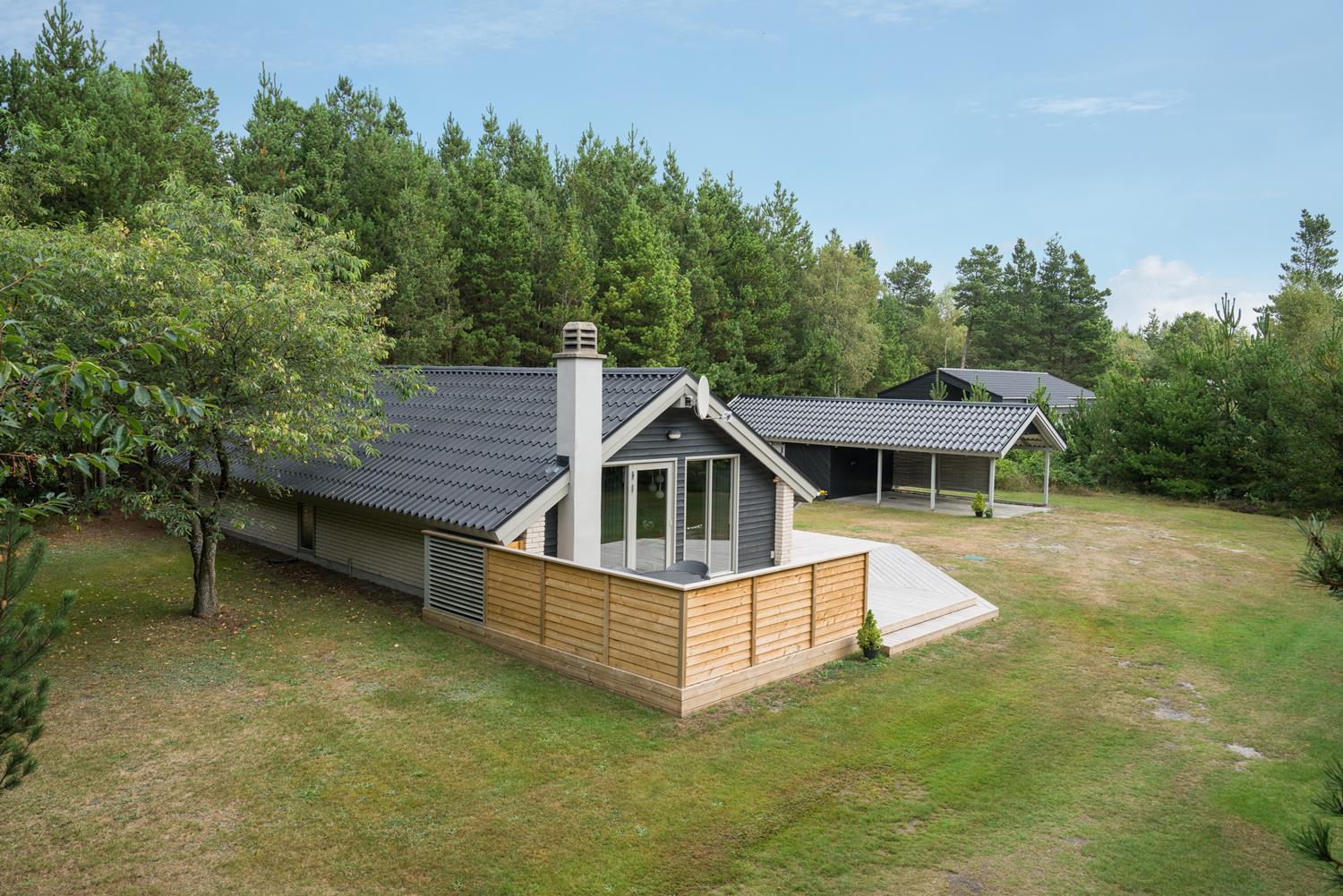 Velholdt feriehus på naturgrund nær skov og golf, med stor træterrasse og moderne køkken.