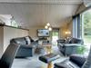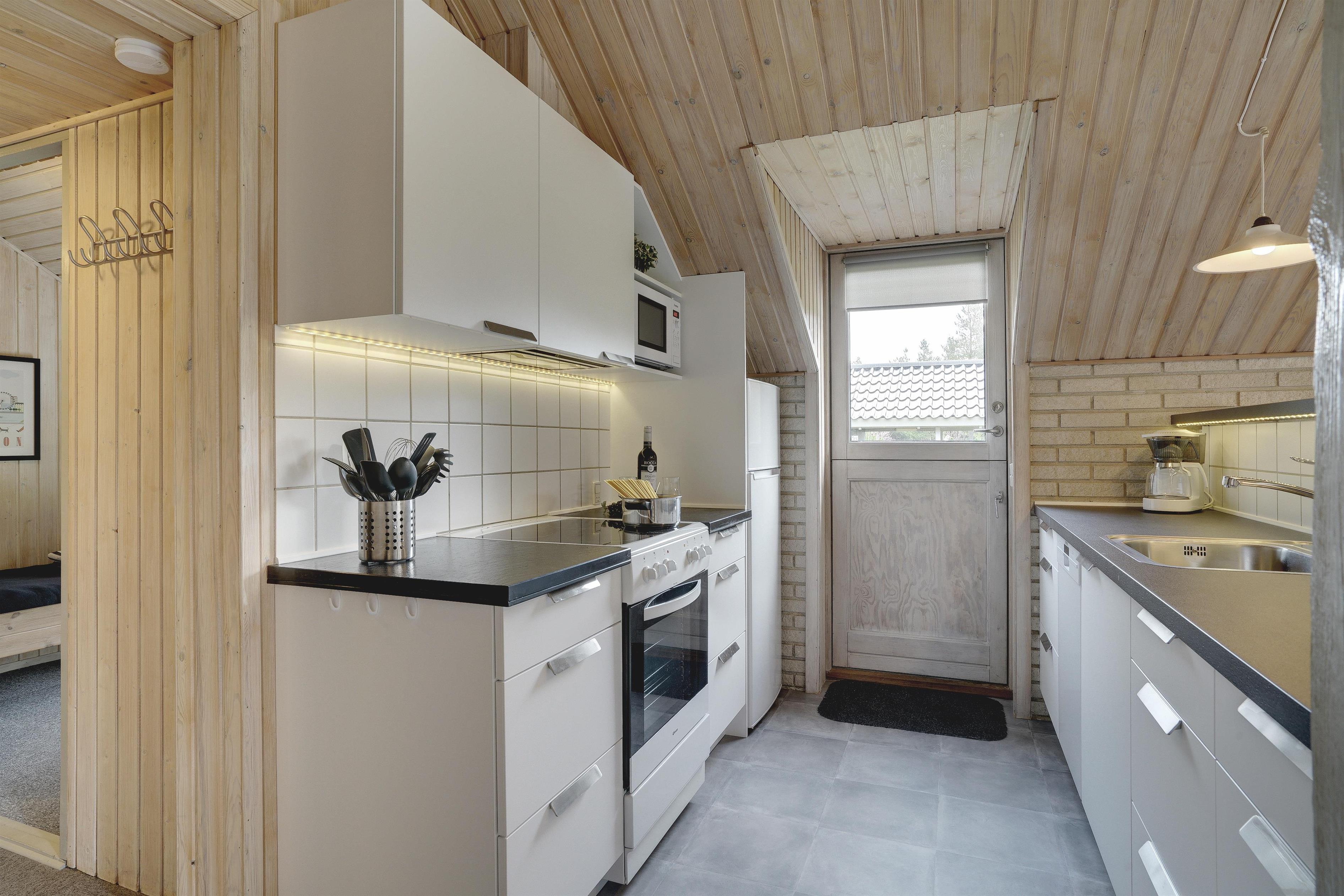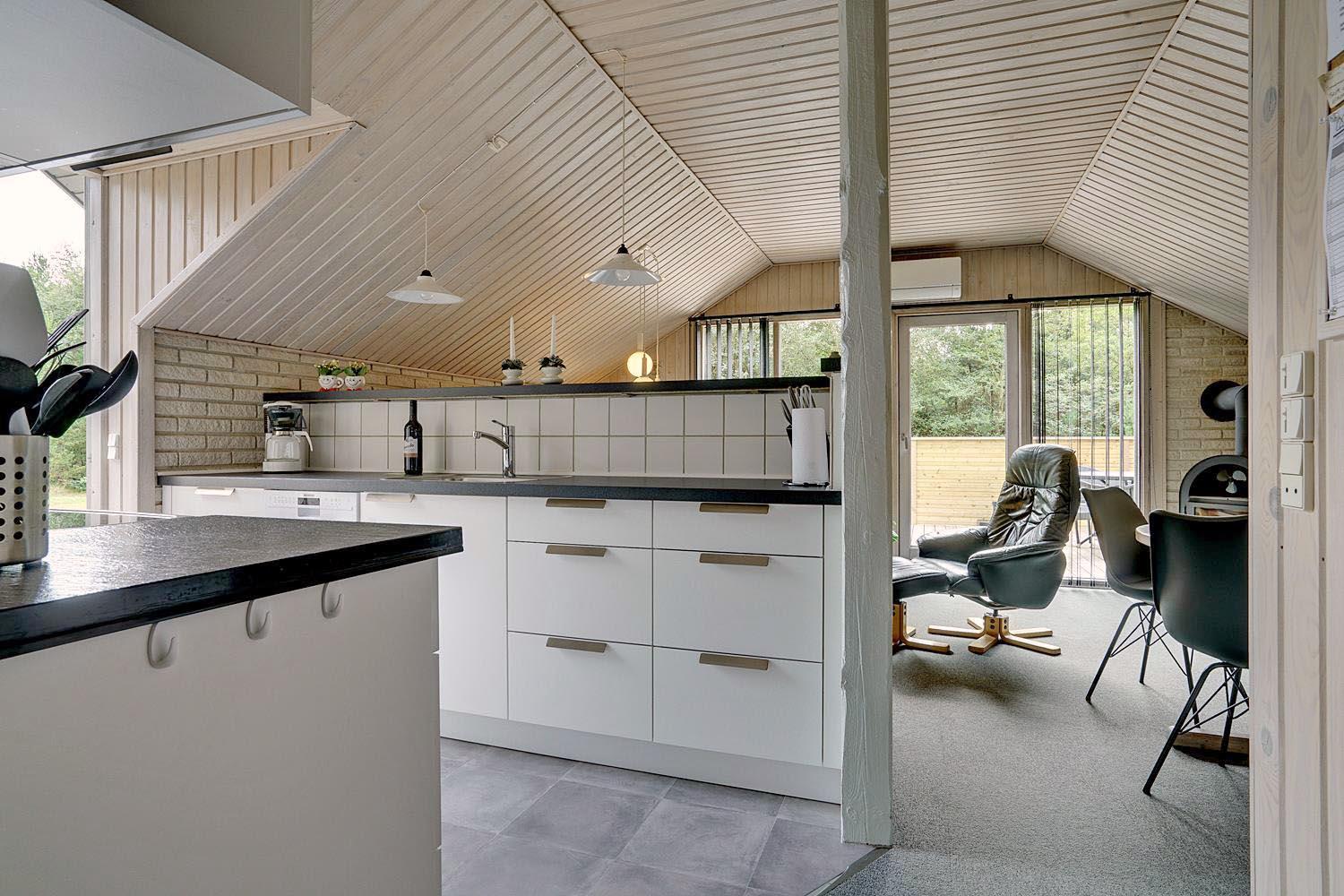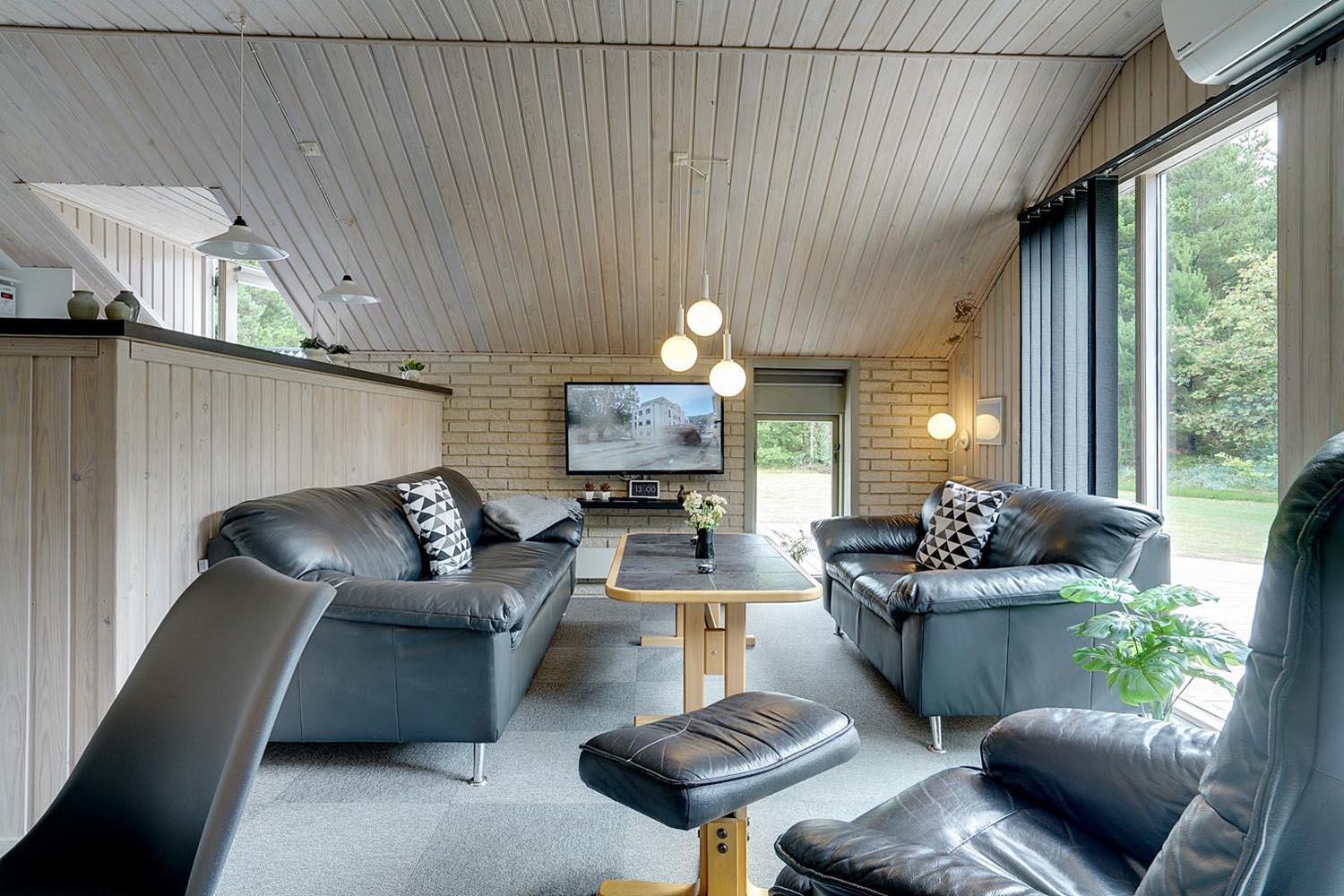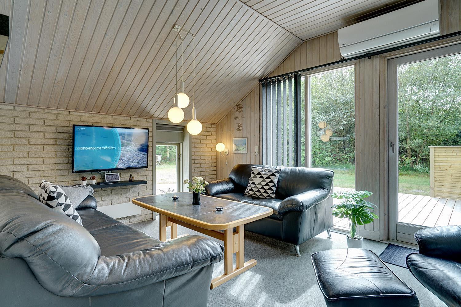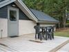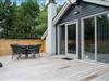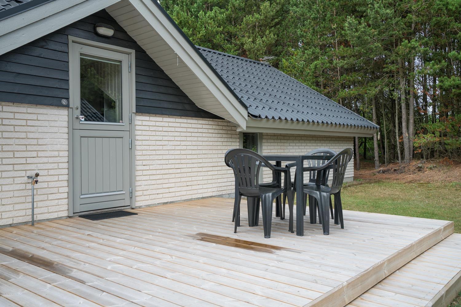 Velholdt feriehus på naturgrund nær skov og golf, med stor træterrasse og moderne køkken.