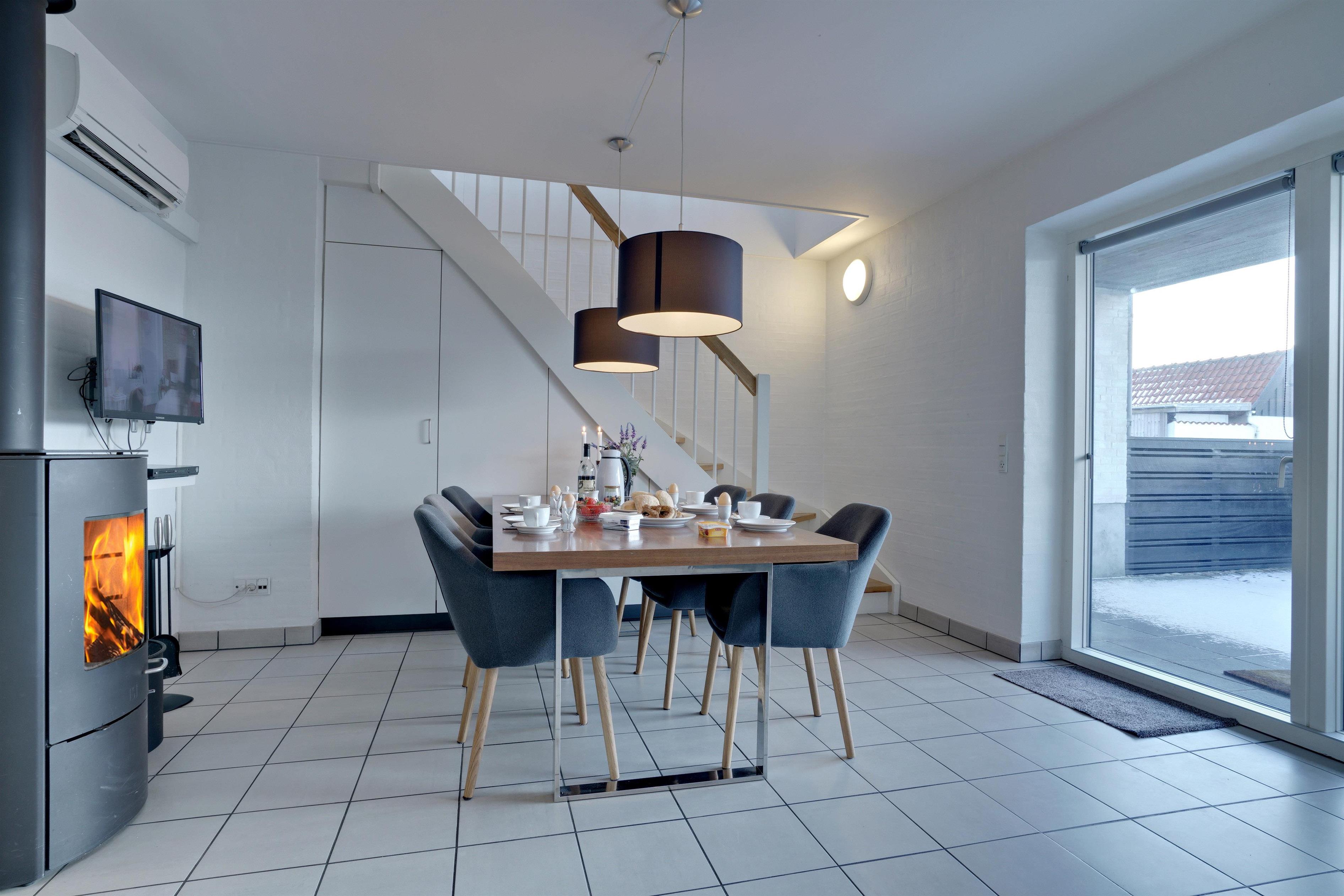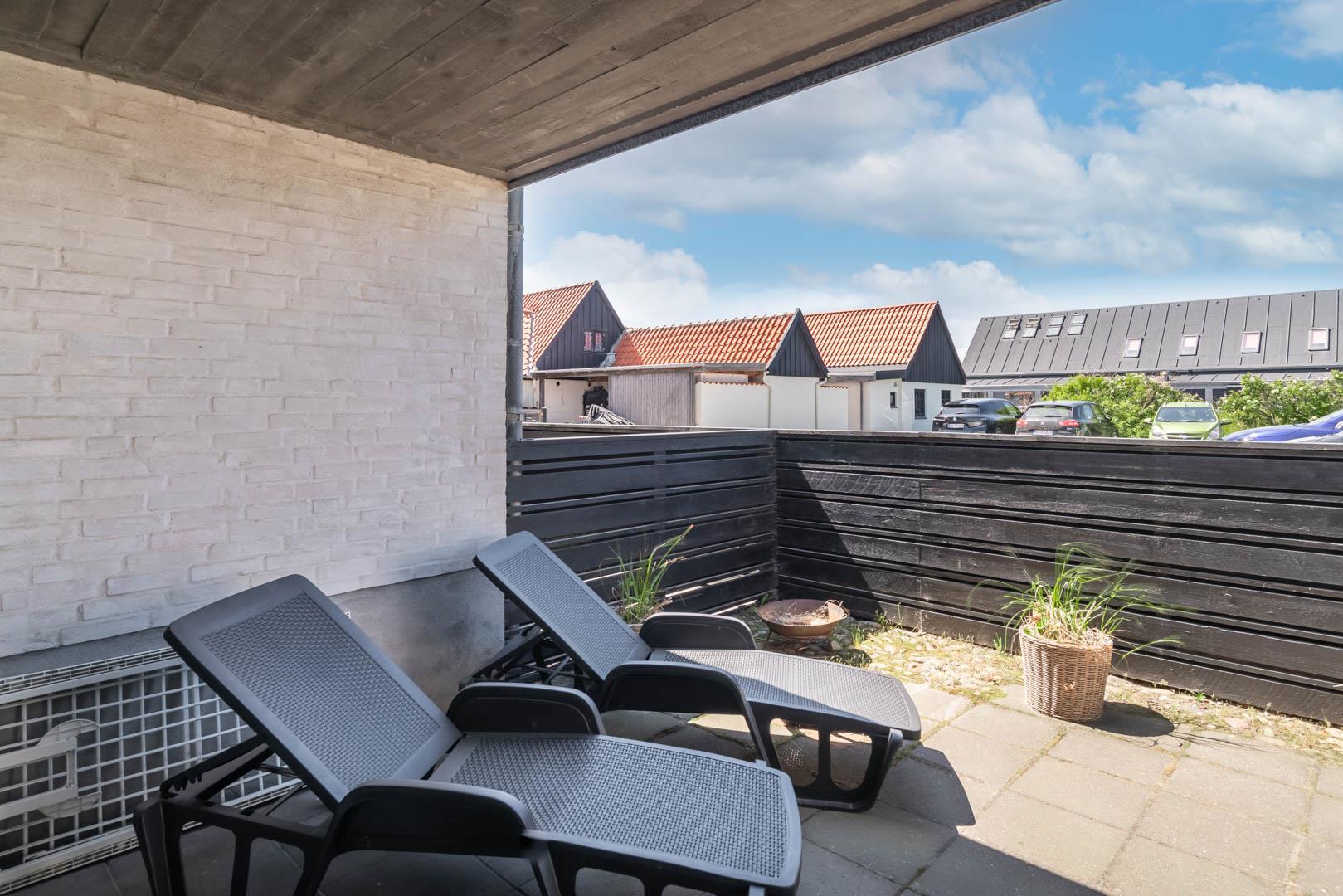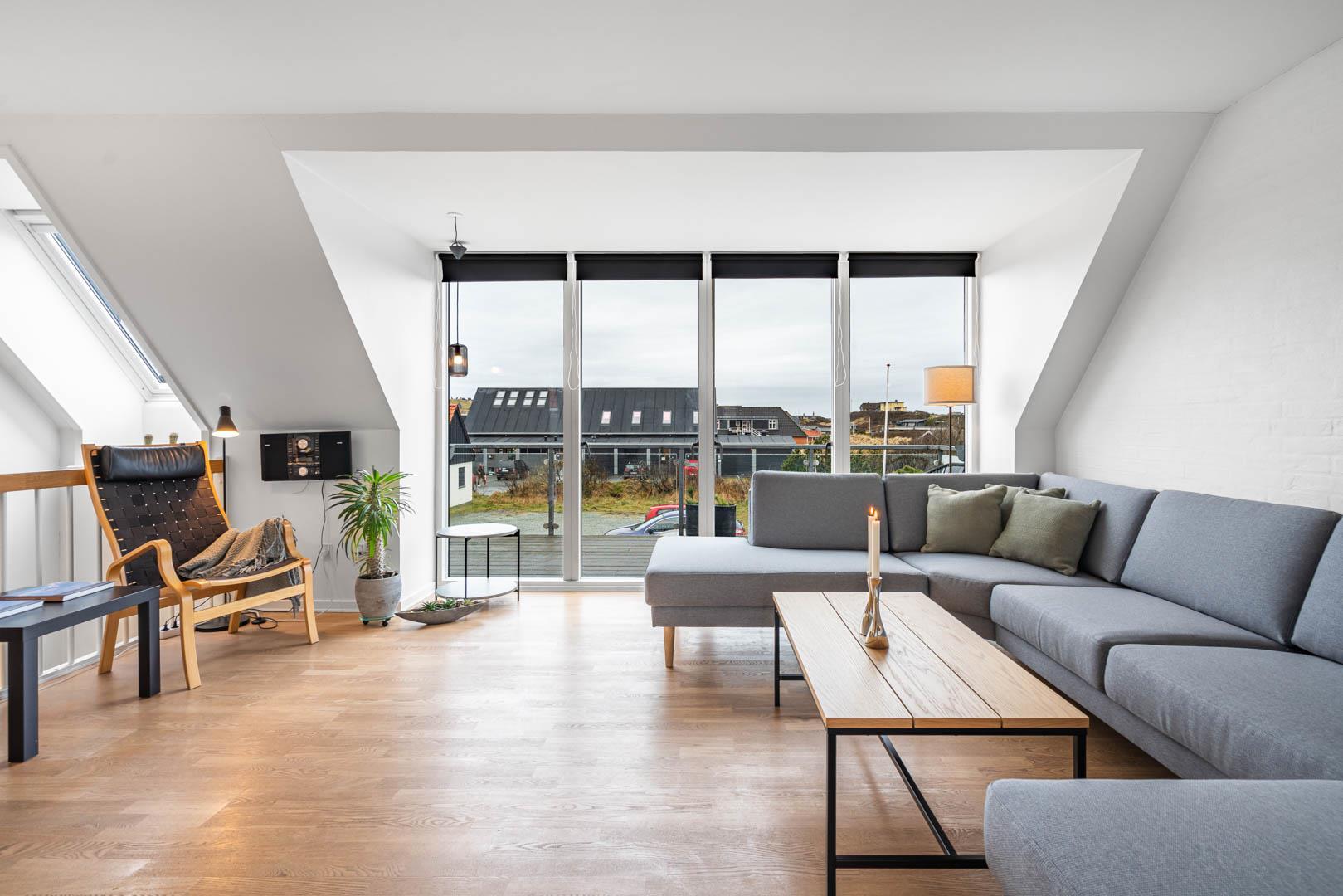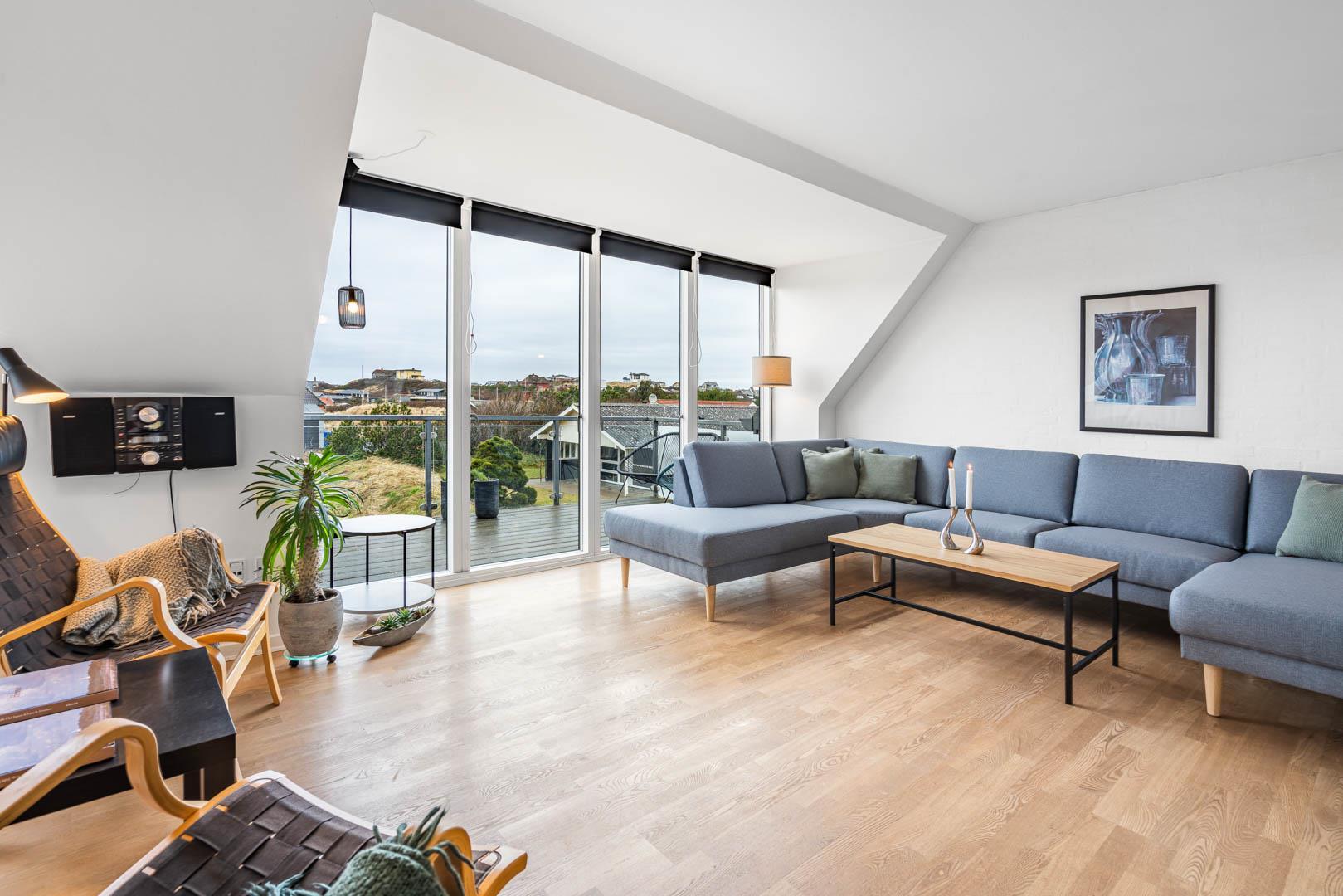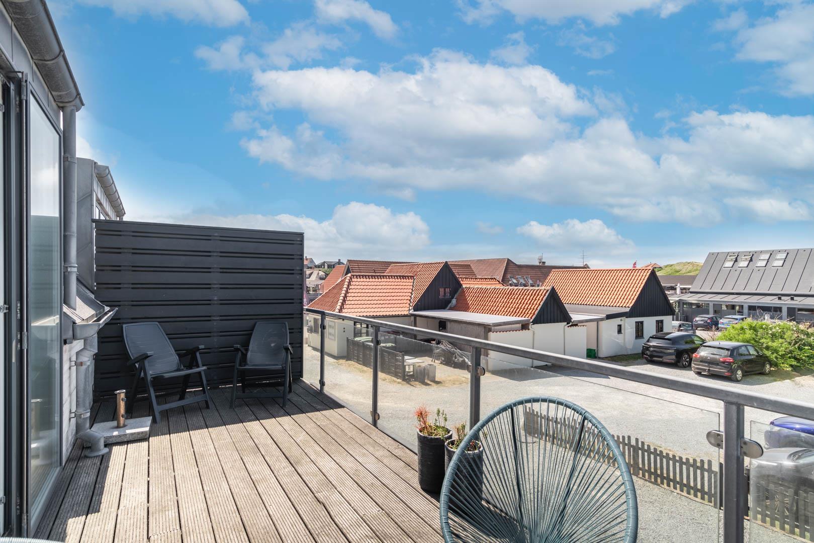 Lys og kvalitetslejlighed på 2 plan i hjertet af Henne Strand med vestvendt gårdhave og balkon.