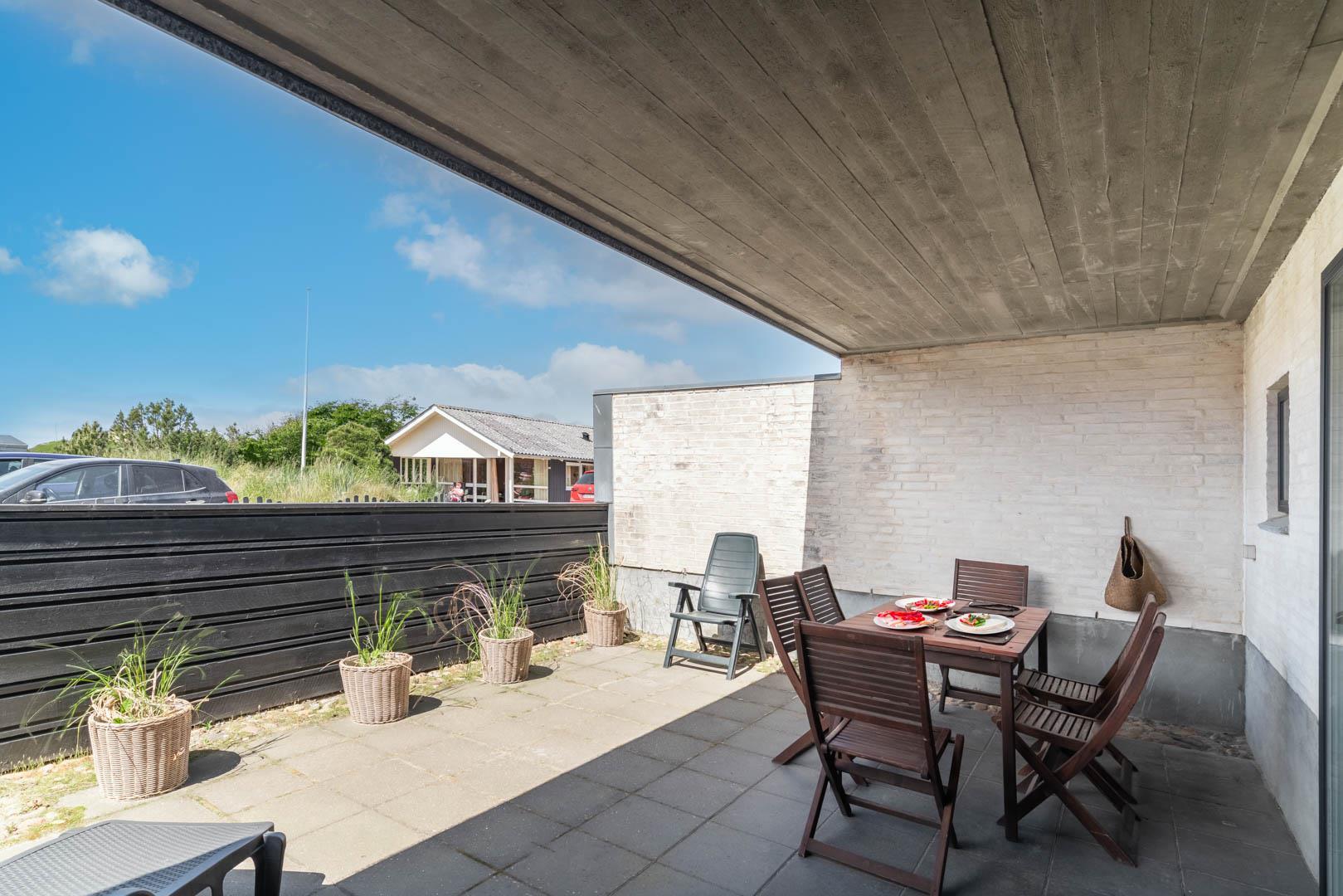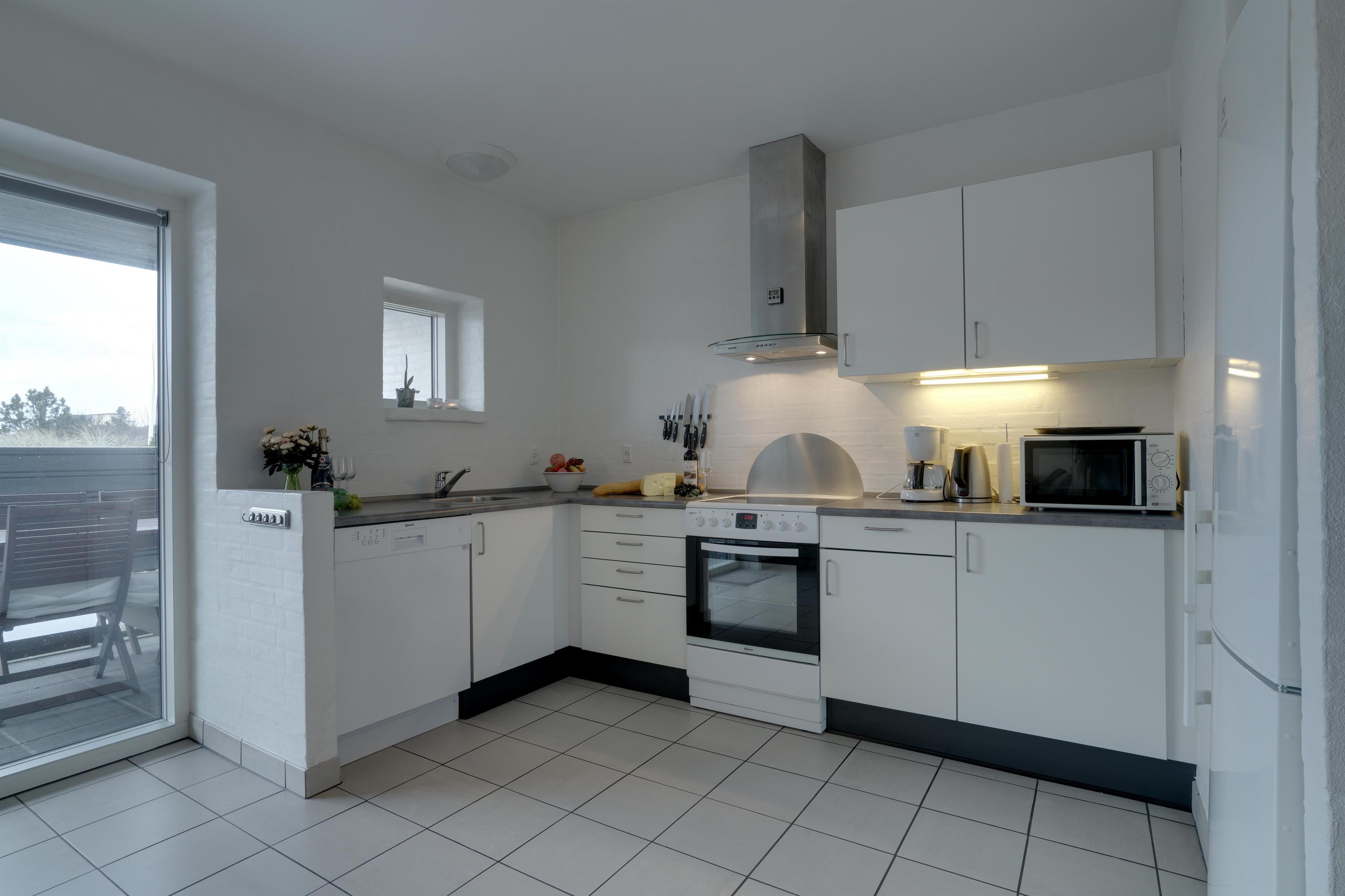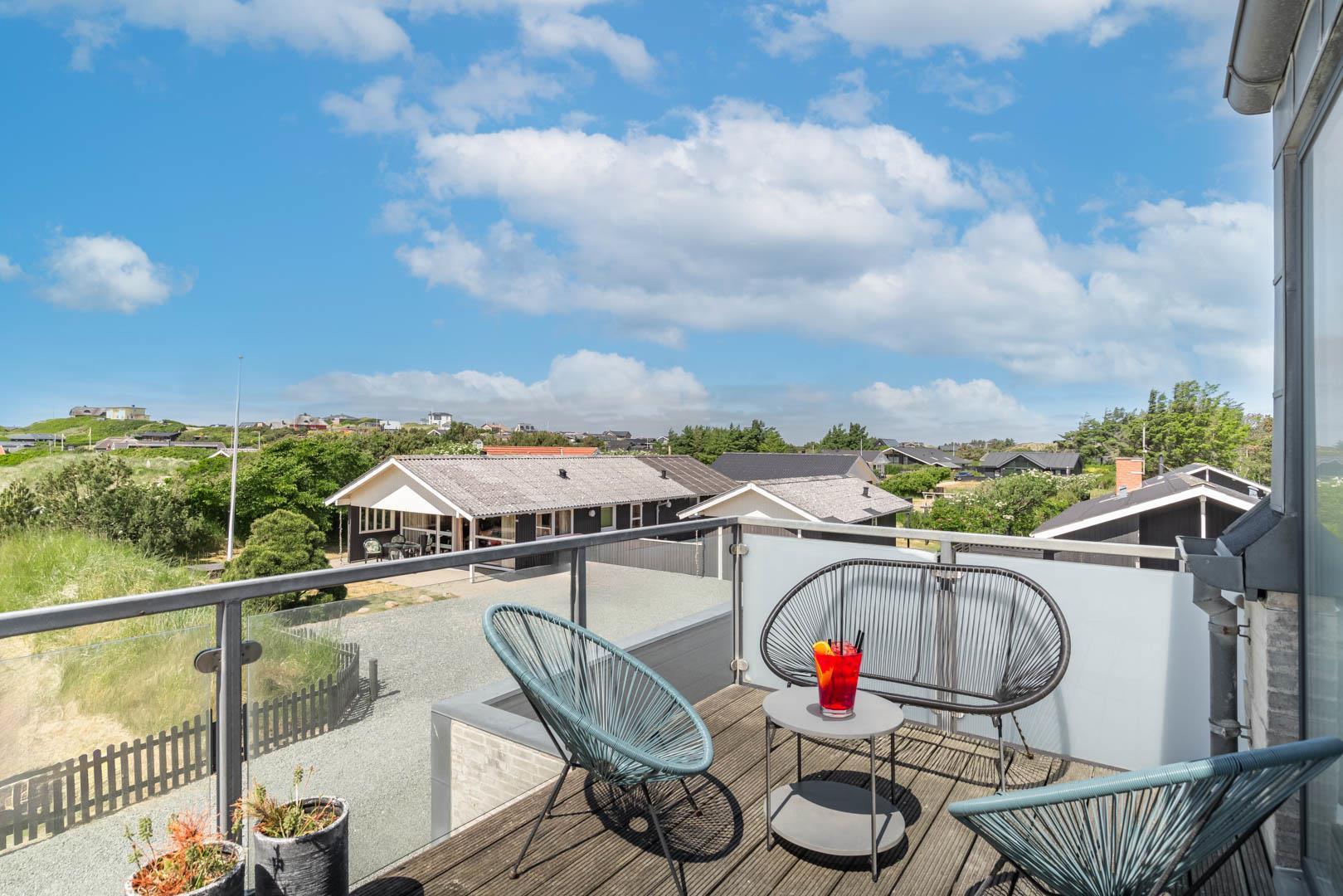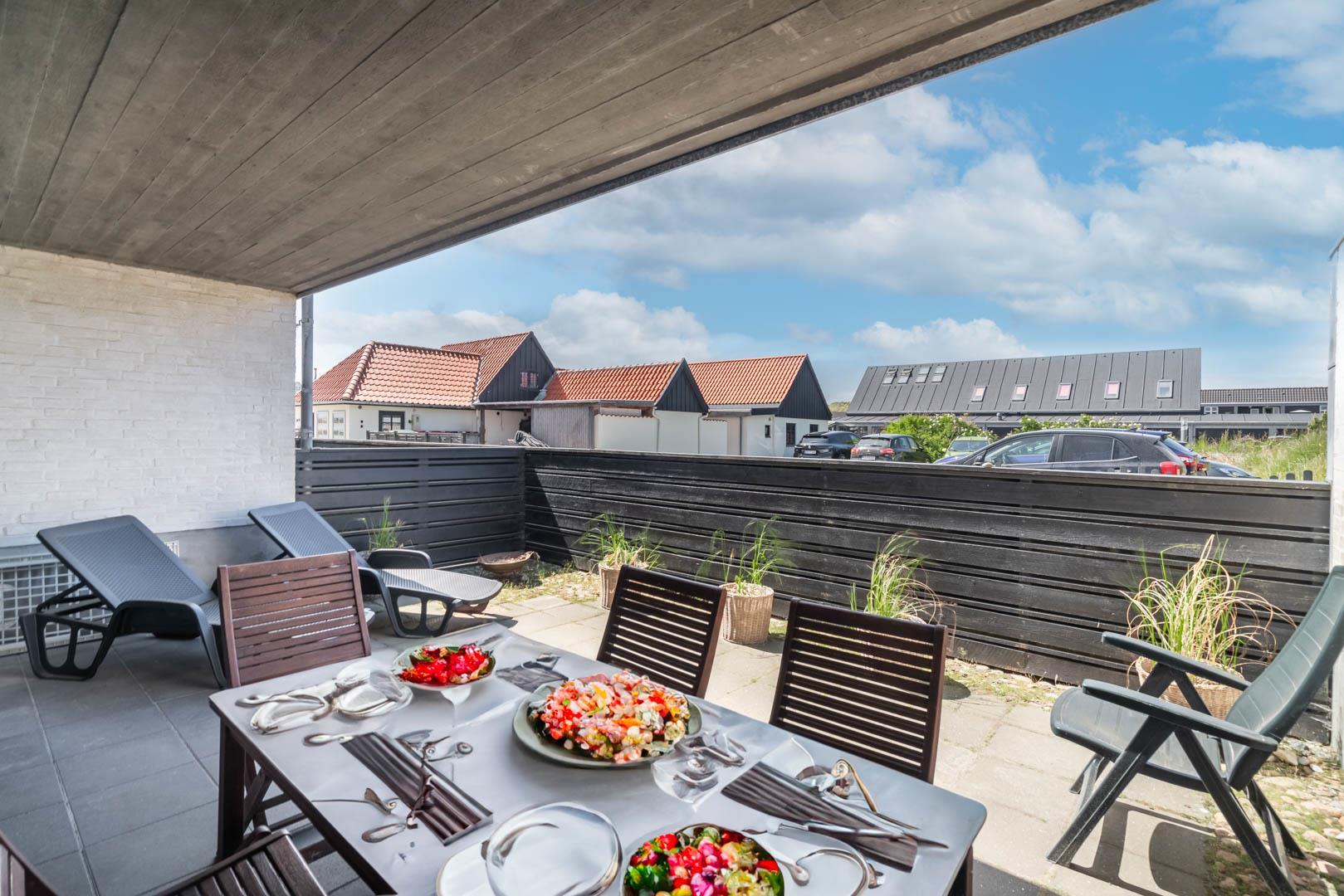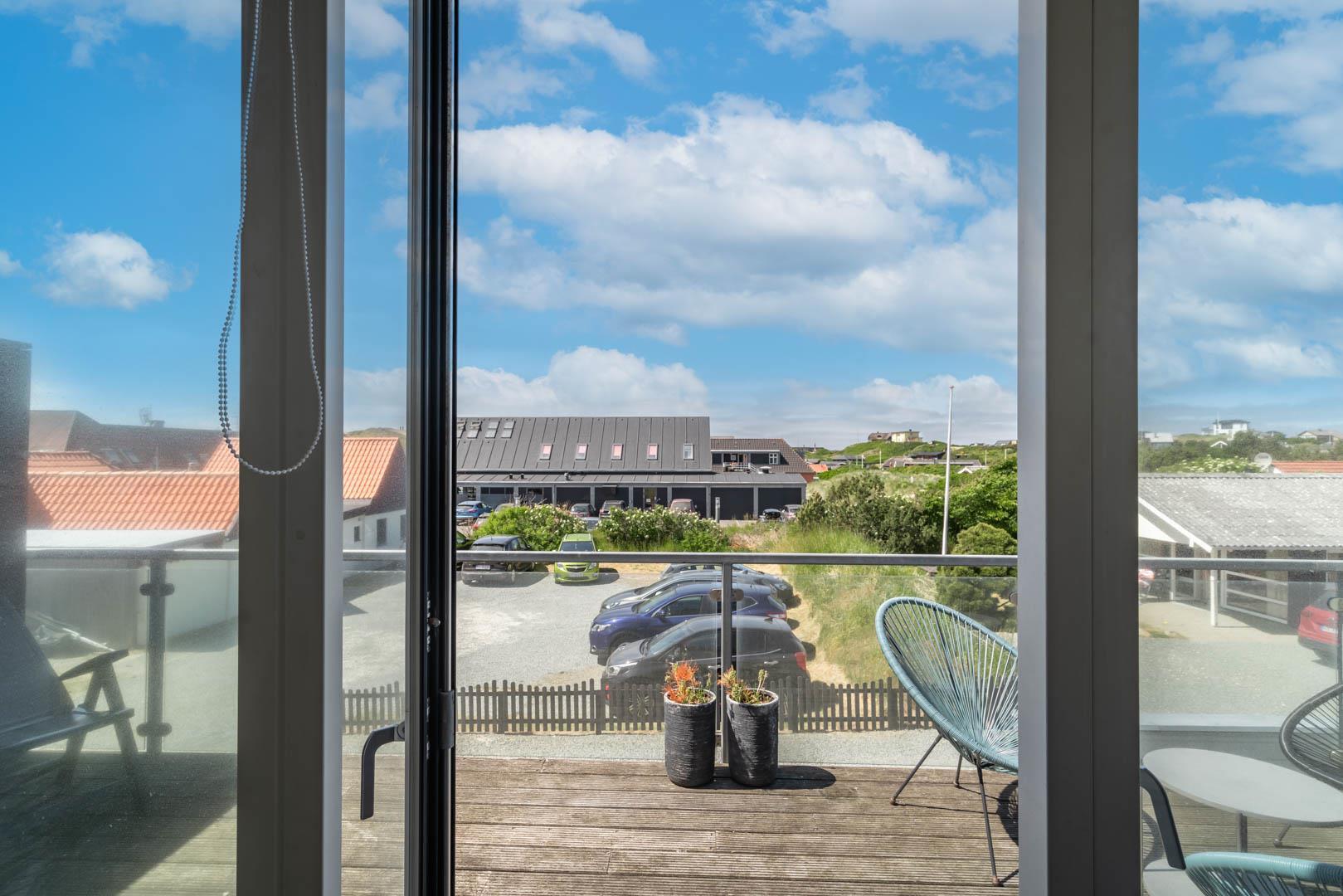 Kvalitetslejlighed beliggende i hjertet af Henne Strand. Lejligheden fremstår overalt lyst, venligt og med et højt kvalitetsneveau. Lejligheden er på 2 plan. I stuen plan finder man entre, værelse, bad og skøn delvis overdækket vestvendt gårdhave. På 1 sal er der opholdsstue og 2 værelser og stor vestvendtbalkon, hvorfra udsigten og solen kan nydes. Der er fladskærme i alle soverum, stuen og køkken alrummet. Brændeovn og varmepumpe spare på strømforbruget og sørger for et dejligt klima. Aircondition om sommeren så den perfekte temperatur altid kan opnås. Depotrum til cykler ved carporten.