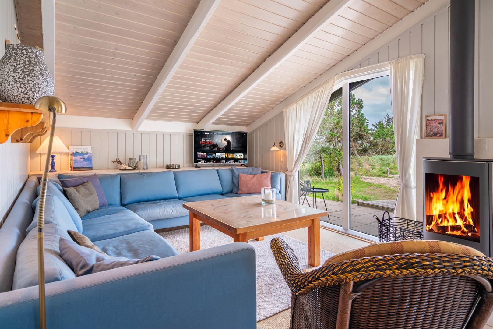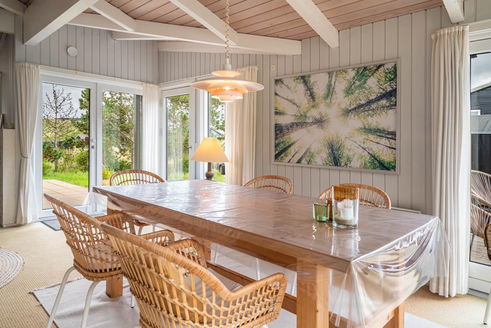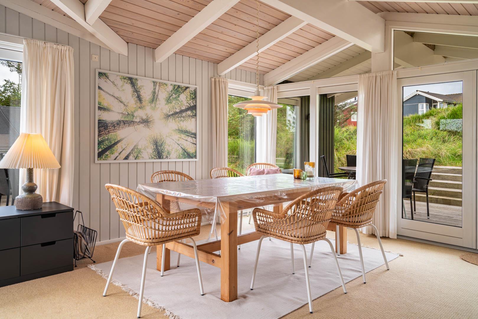 Dejligt, velholdt feriehus beliggende på en kuperet og pragtfuld beliggende grund for enden af blind vej. Huset fremtræder lyst og venligt. Dejlig lyst indrettet køkken/alrum i åben forbindelse til stue. Fra stuen er der direkte udgang til flere skønne læ fulde ugenerede terrasser. Der er gåafstand til Henne Strand by med rigtig gode indkøbsmuligheder.