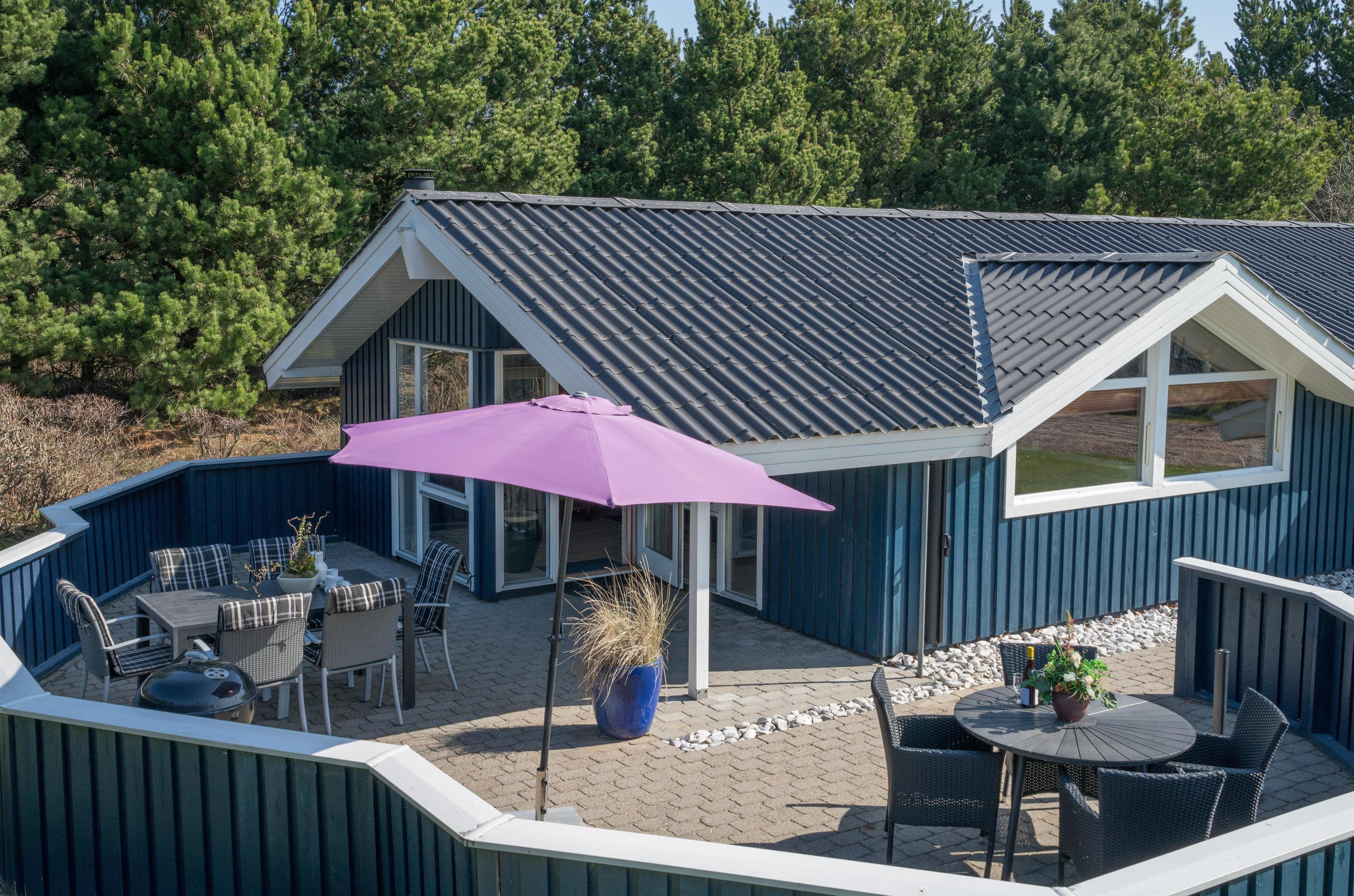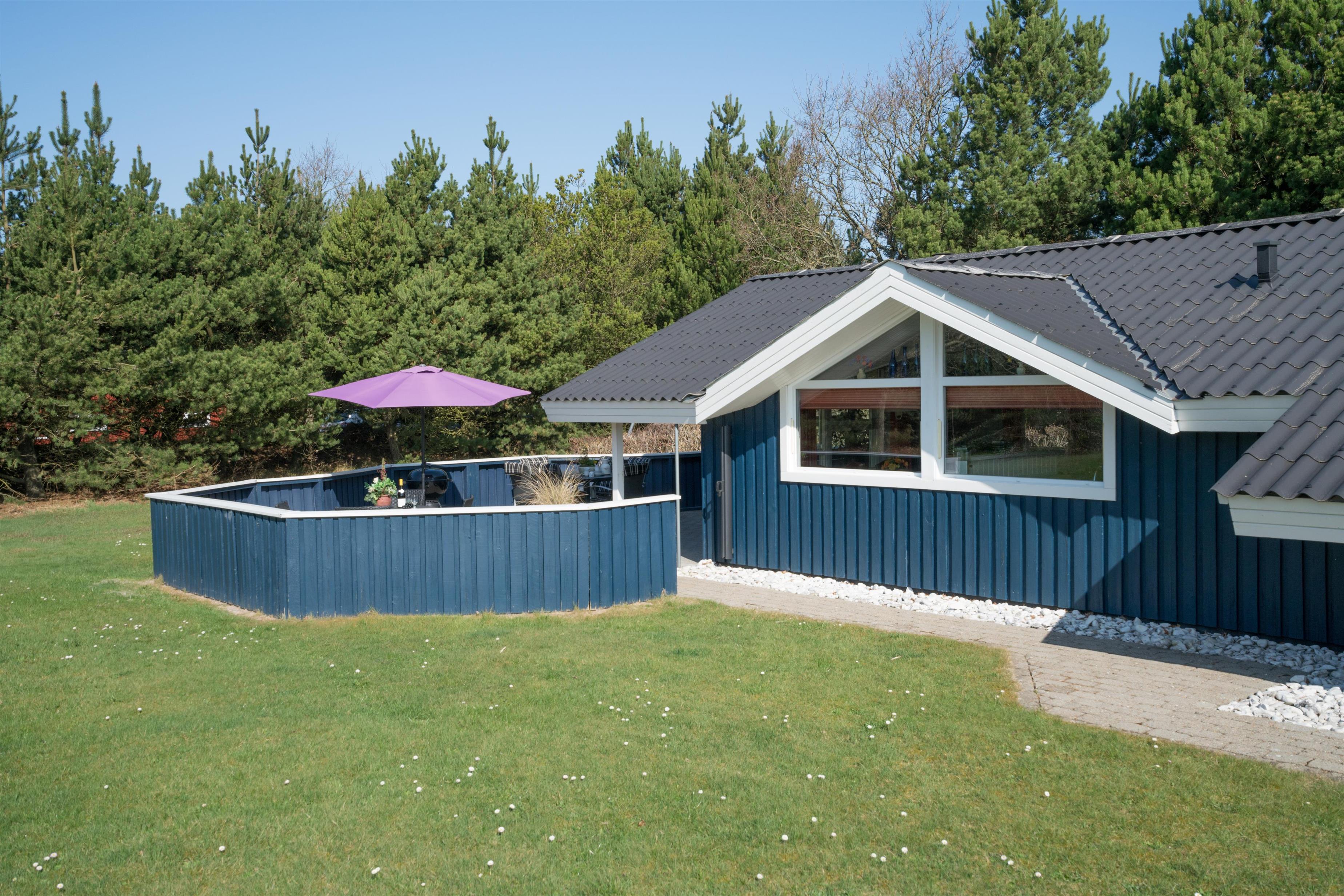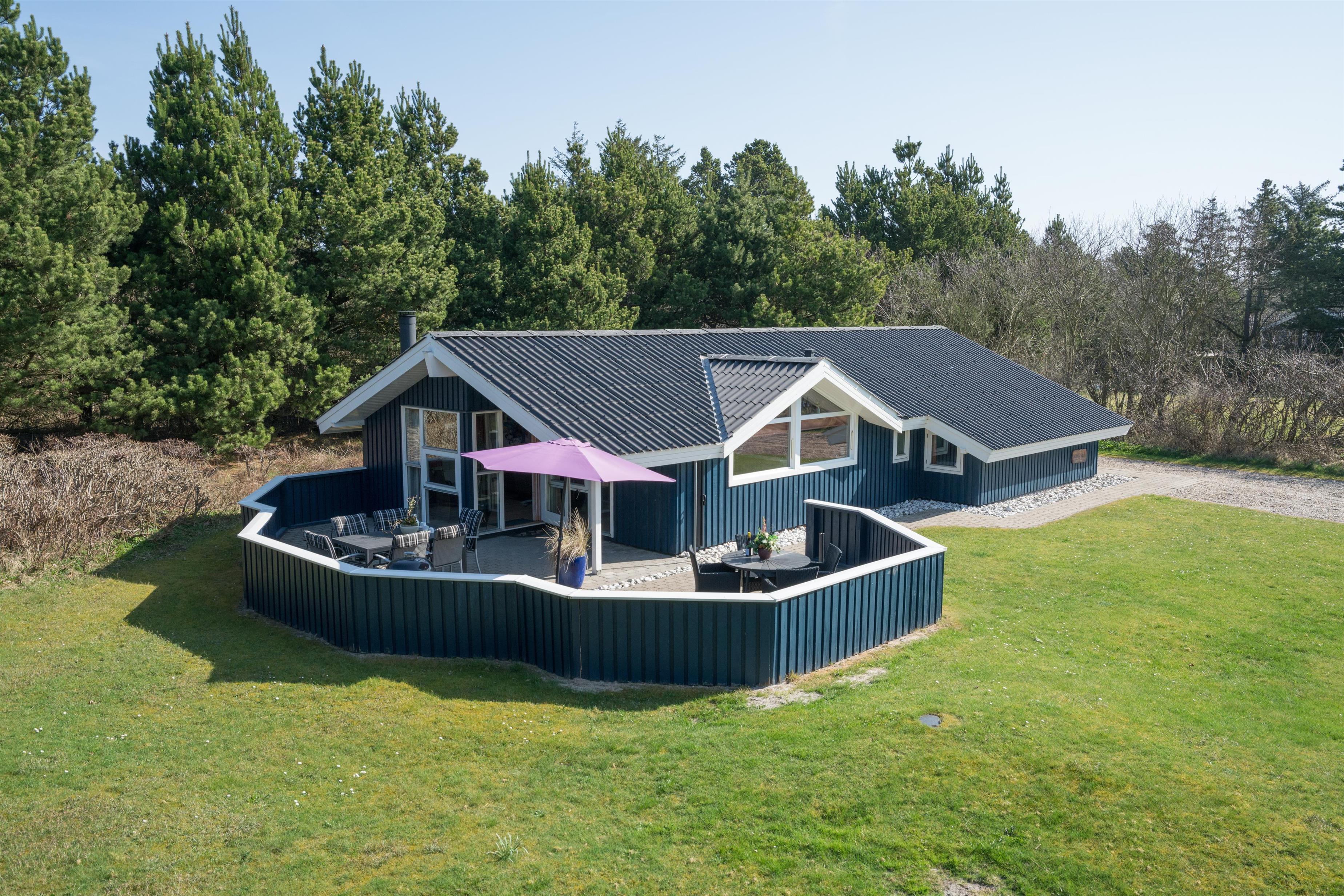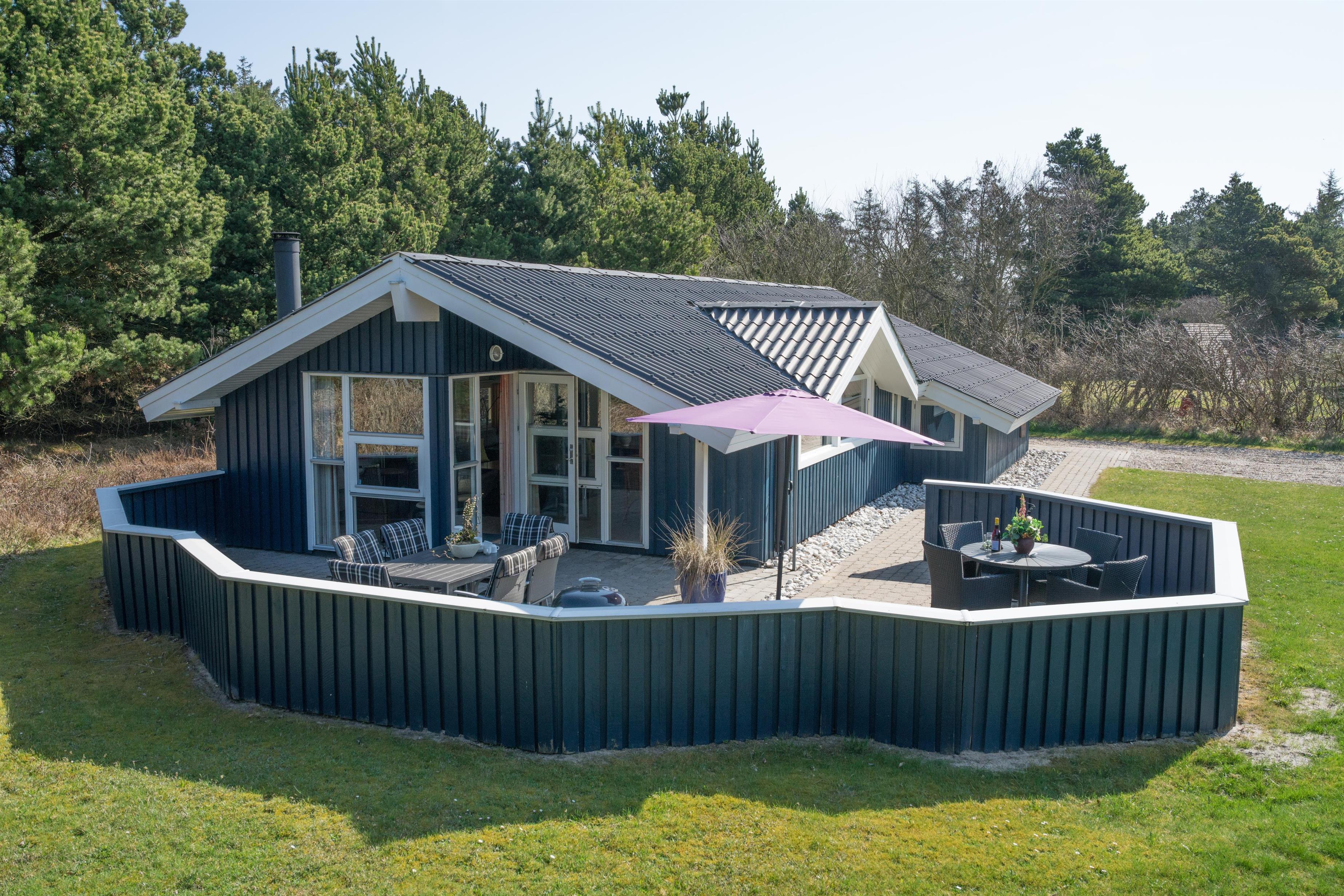 Lækkert indrettet og velholdt feriehus beliggende på en dejlig naturgrund tæt ved Blåbjerg Plantage og Henne Golfklub. På grunden er der plads til boldspil. Køkken i åben forbindelse til stue med brændeovn med glas. Herfra udgang til delvis overdækket, indhegnet terrasse. Ekstra terrasse ved det overdækkede indgangsparti. Stort badeværelse med spa og sauna, samt ekstra mindre toilet. Gratis ADSL-Internetforbindelse (Lan).