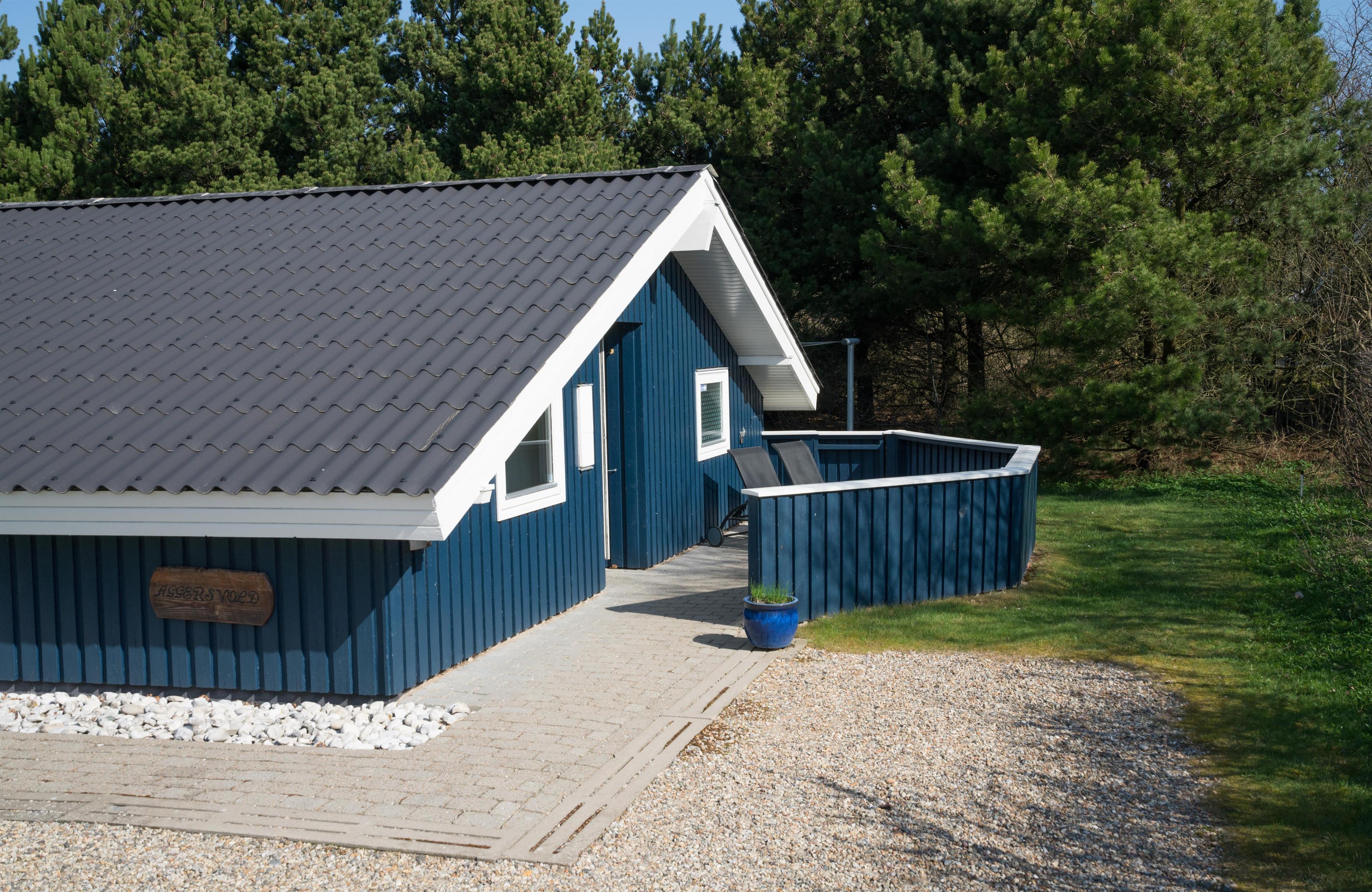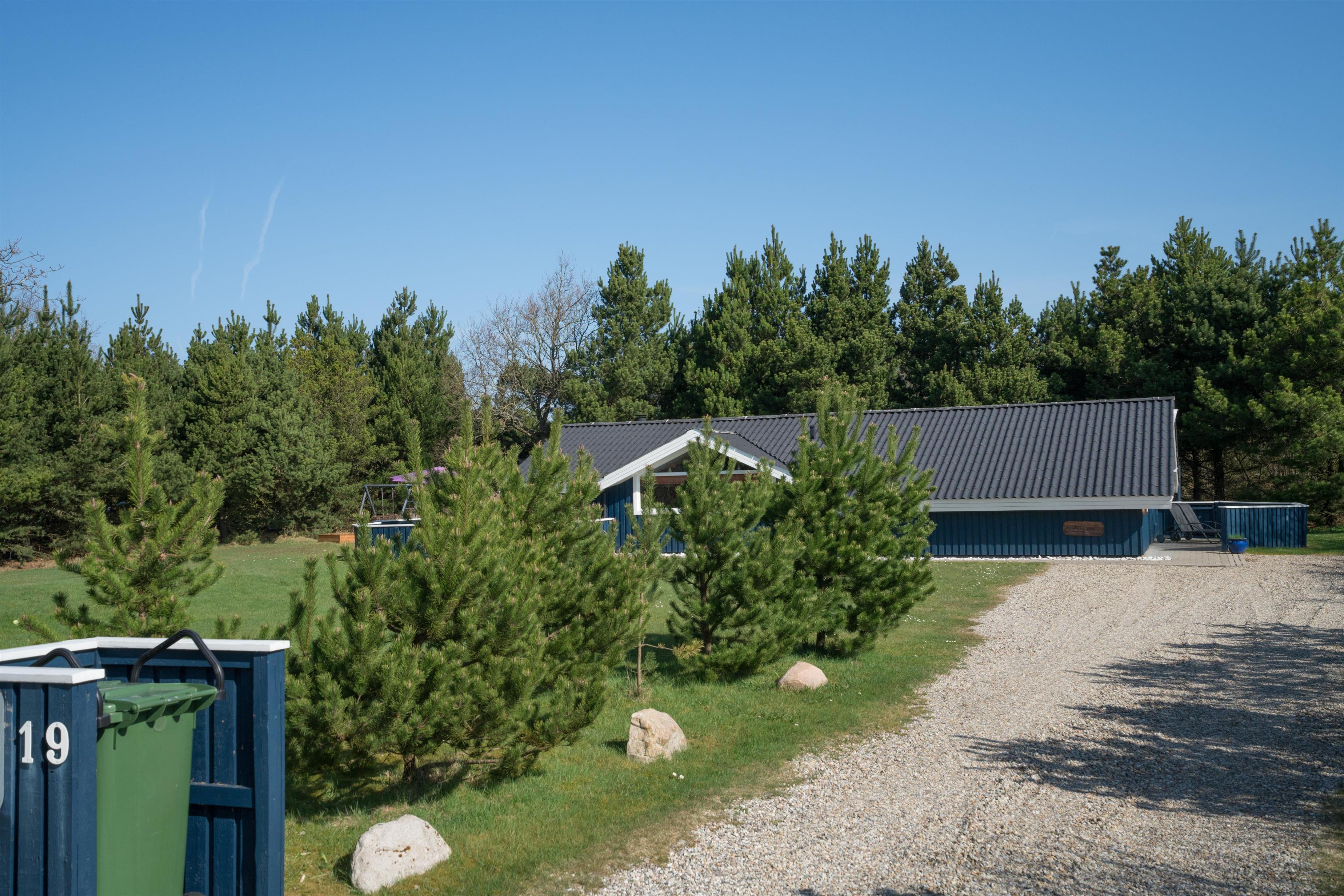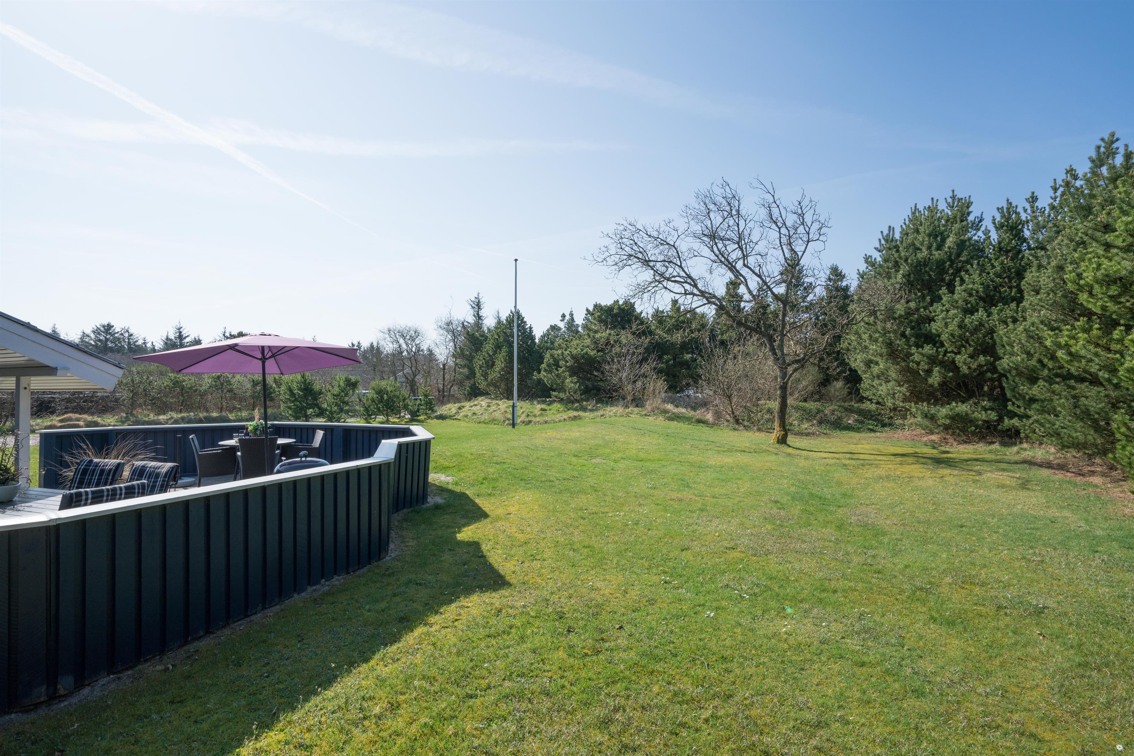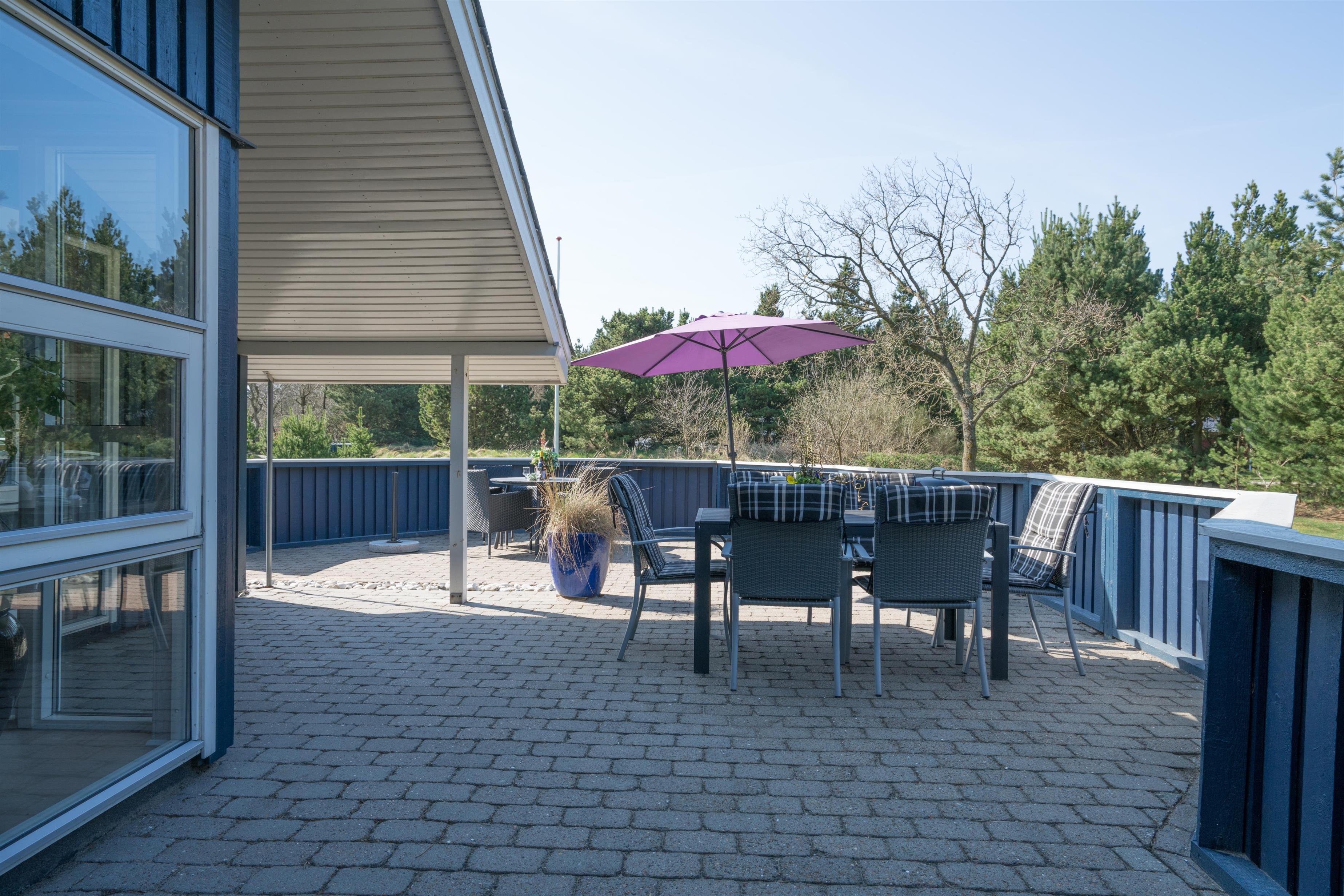 Lækkert indrettet og velholdt feriehus beliggende på en dejlig naturgrund tæt ved Blåbjerg Plantage og Henne Golfklub. På grunden er der plads til boldspil. Køkken i åben forbindelse til stue med brændeovn med glas. Herfra udgang til delvis overdækket, indhegnet terrasse. Ekstra terrasse ved det overdækkede indgangsparti. Stort badeværelse med spa og sauna, samt ekstra mindre toilet. Gratis ADSL-Internetforbindelse (Lan).