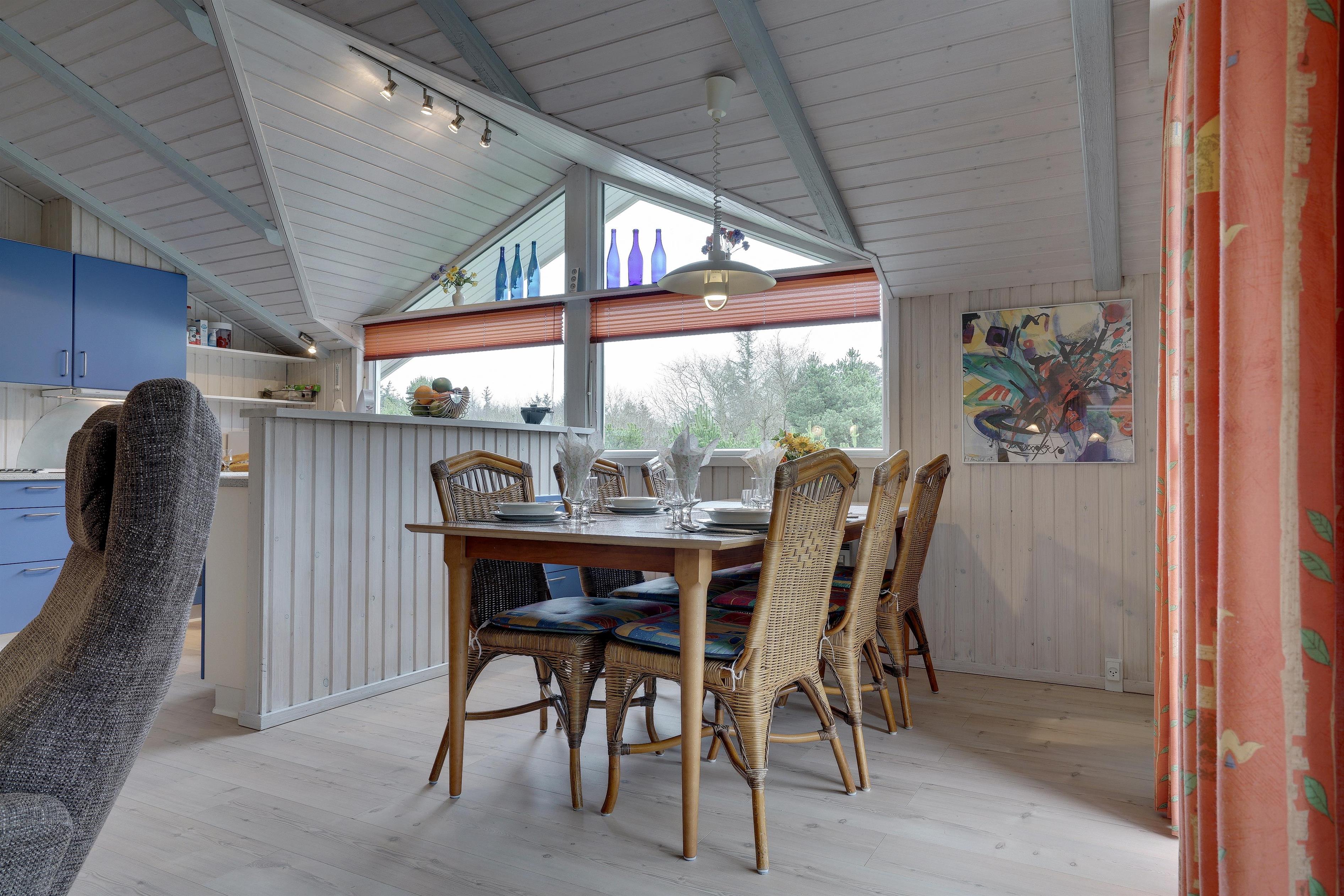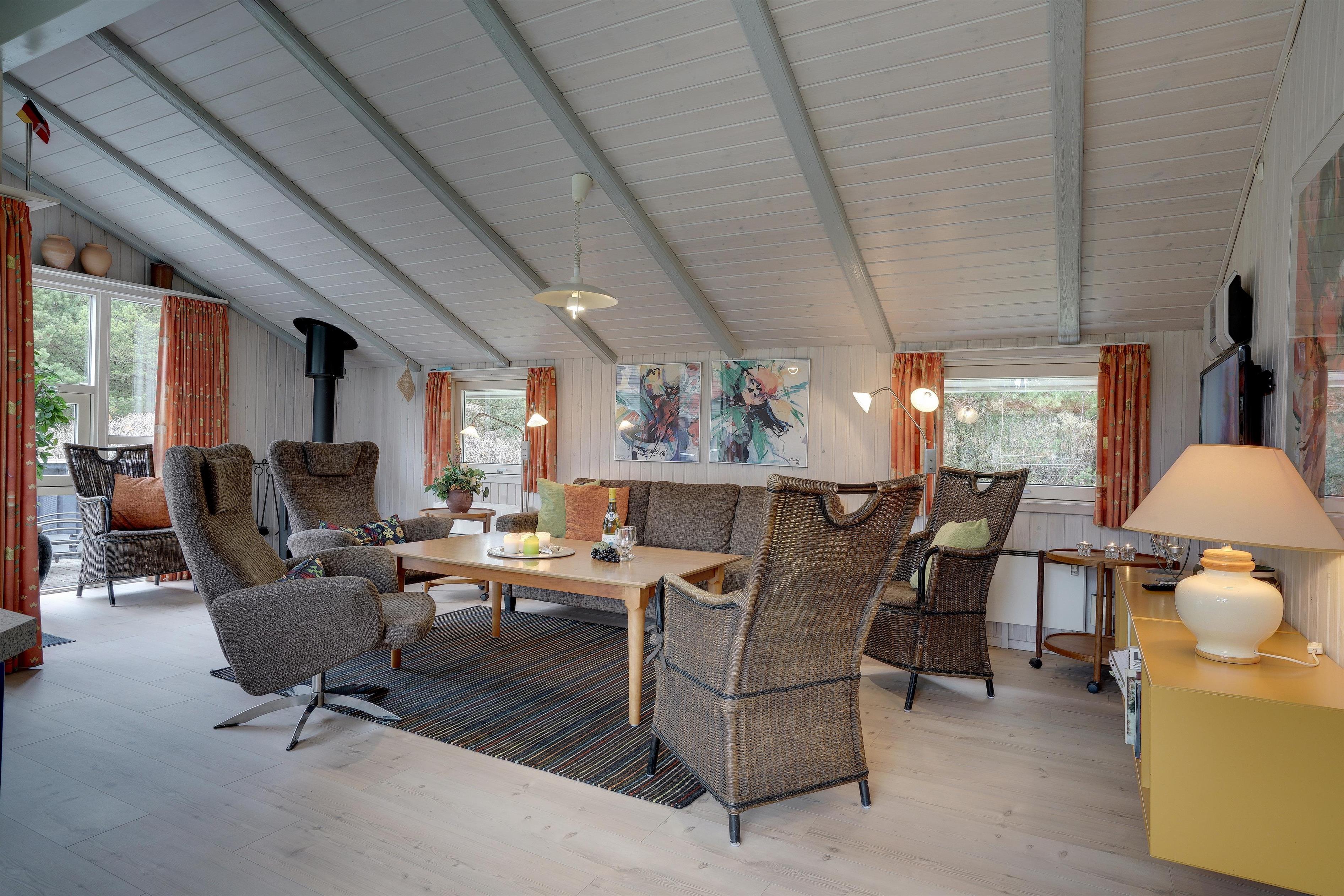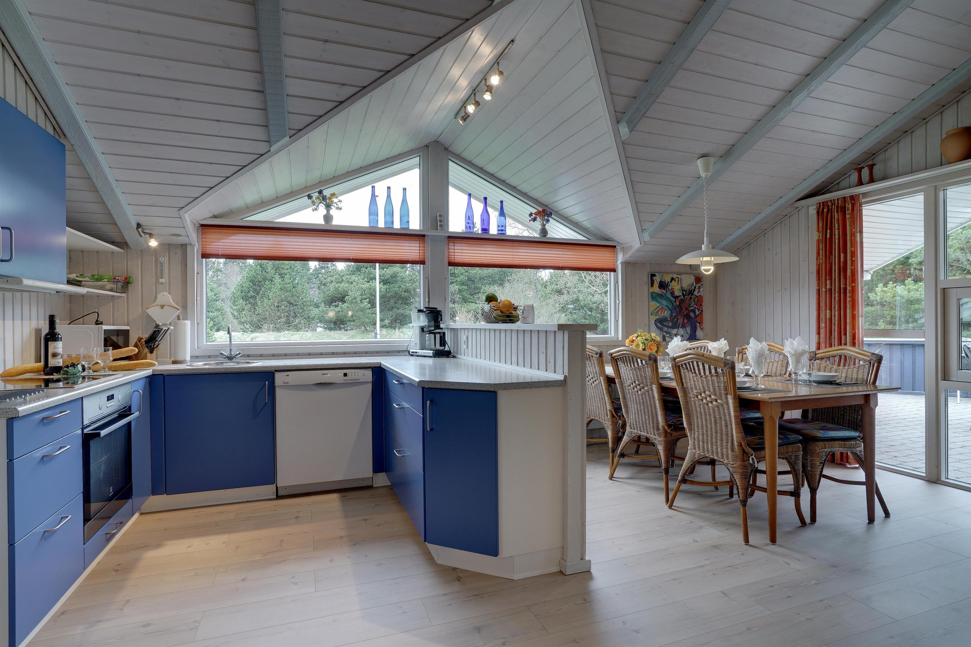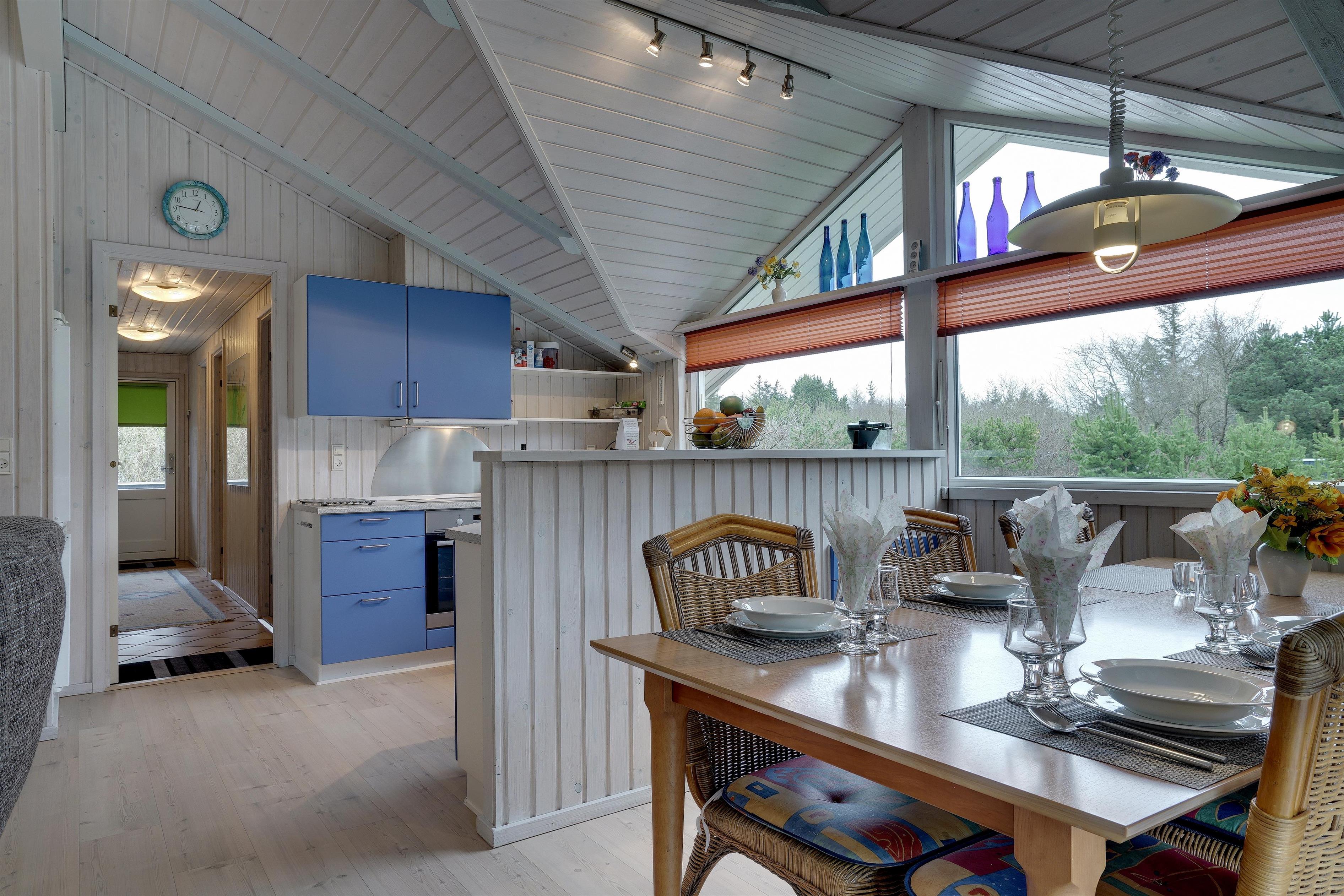 Lækkert indrettet og velholdt feriehus beliggende på en dejlig naturgrund tæt ved Blåbjerg Plantage og Henne Golfklub. På grunden er der plads til boldspil. Køkken i åben forbindelse til stue med brændeovn med glas. Herfra udgang til delvis overdækket, indhegnet terrasse. Ekstra terrasse ved det overdækkede indgangsparti. Stort badeværelse med spa og sauna, samt ekstra mindre toilet. Gratis ADSL-Internetforbindelse (Lan).