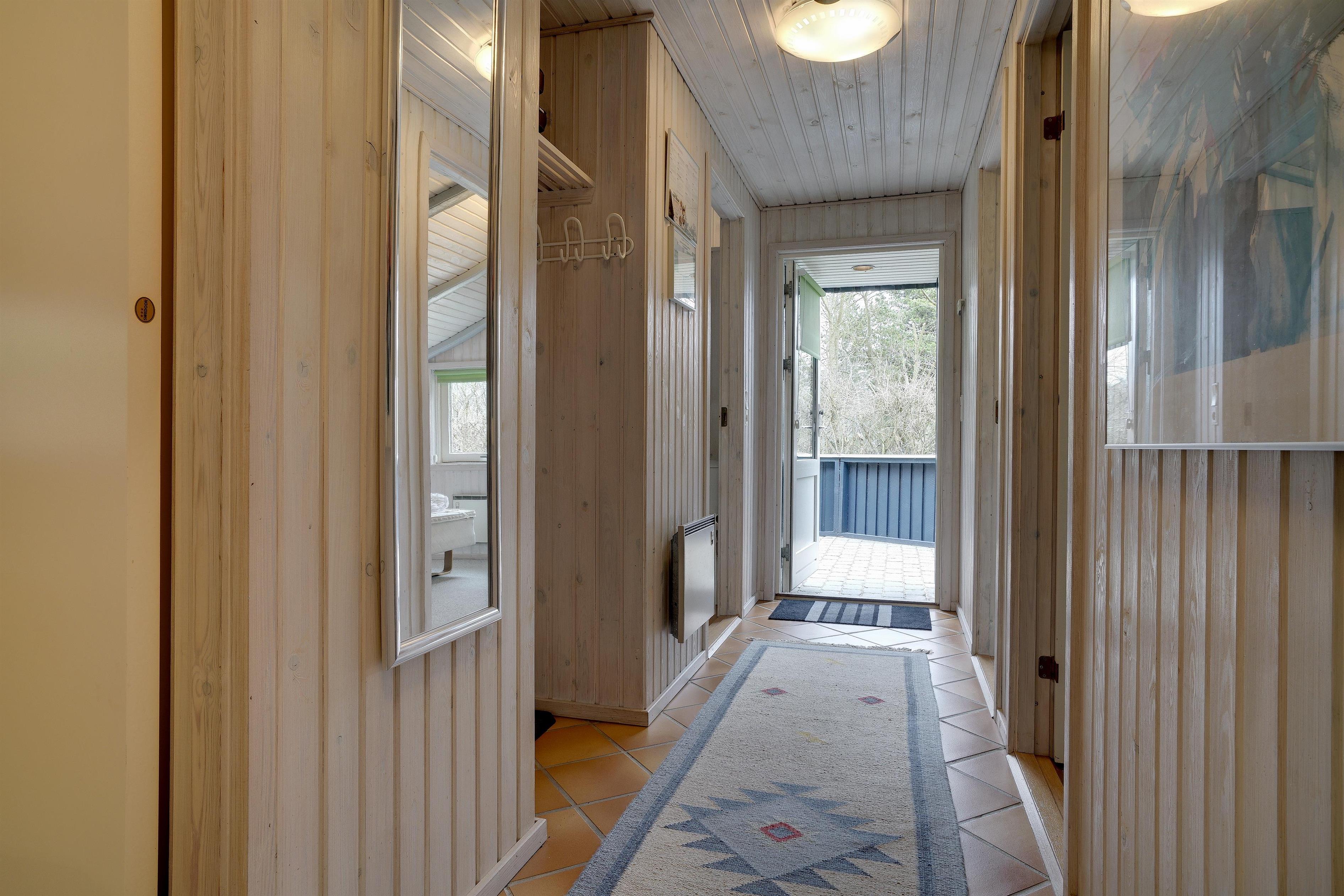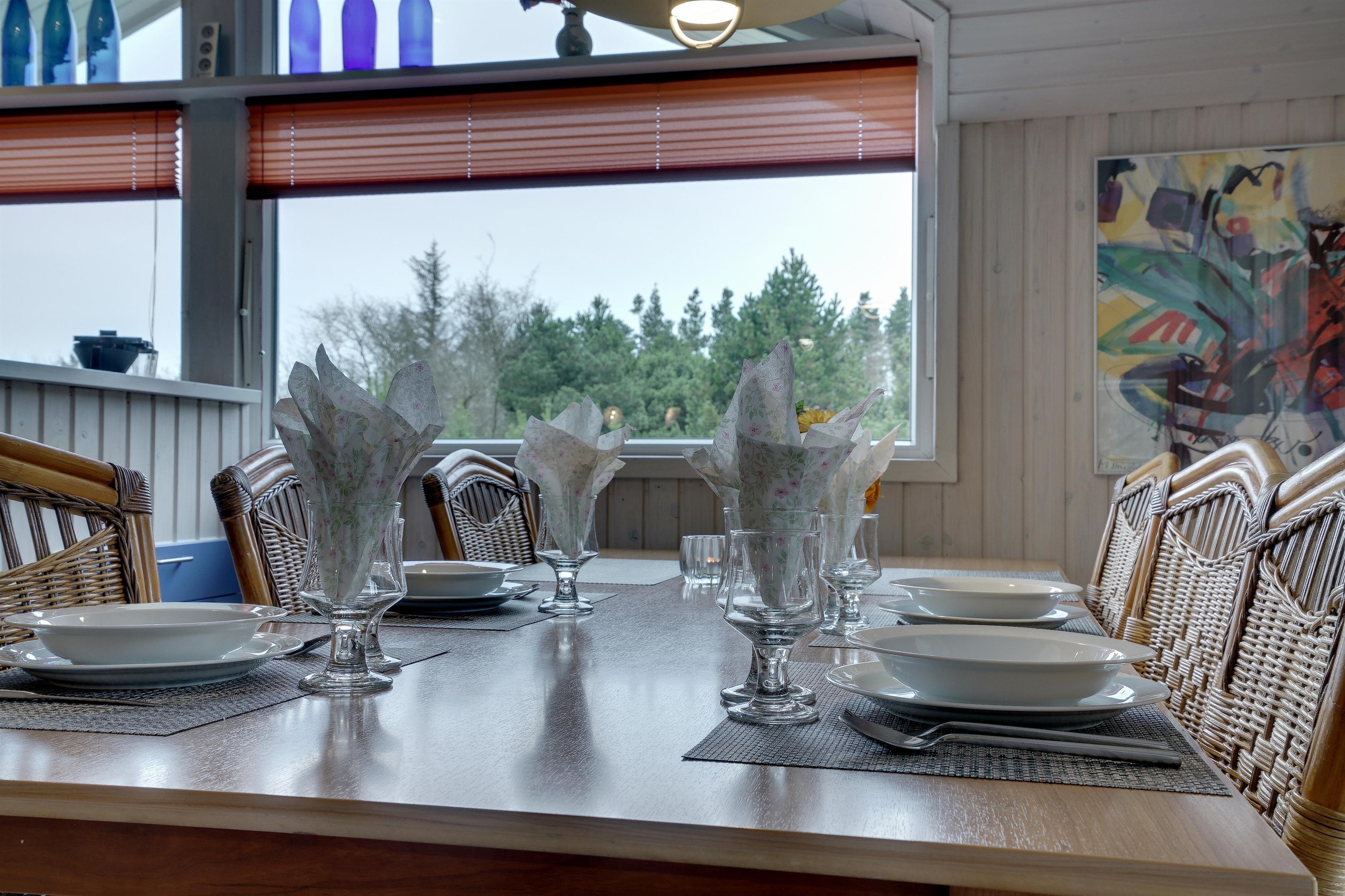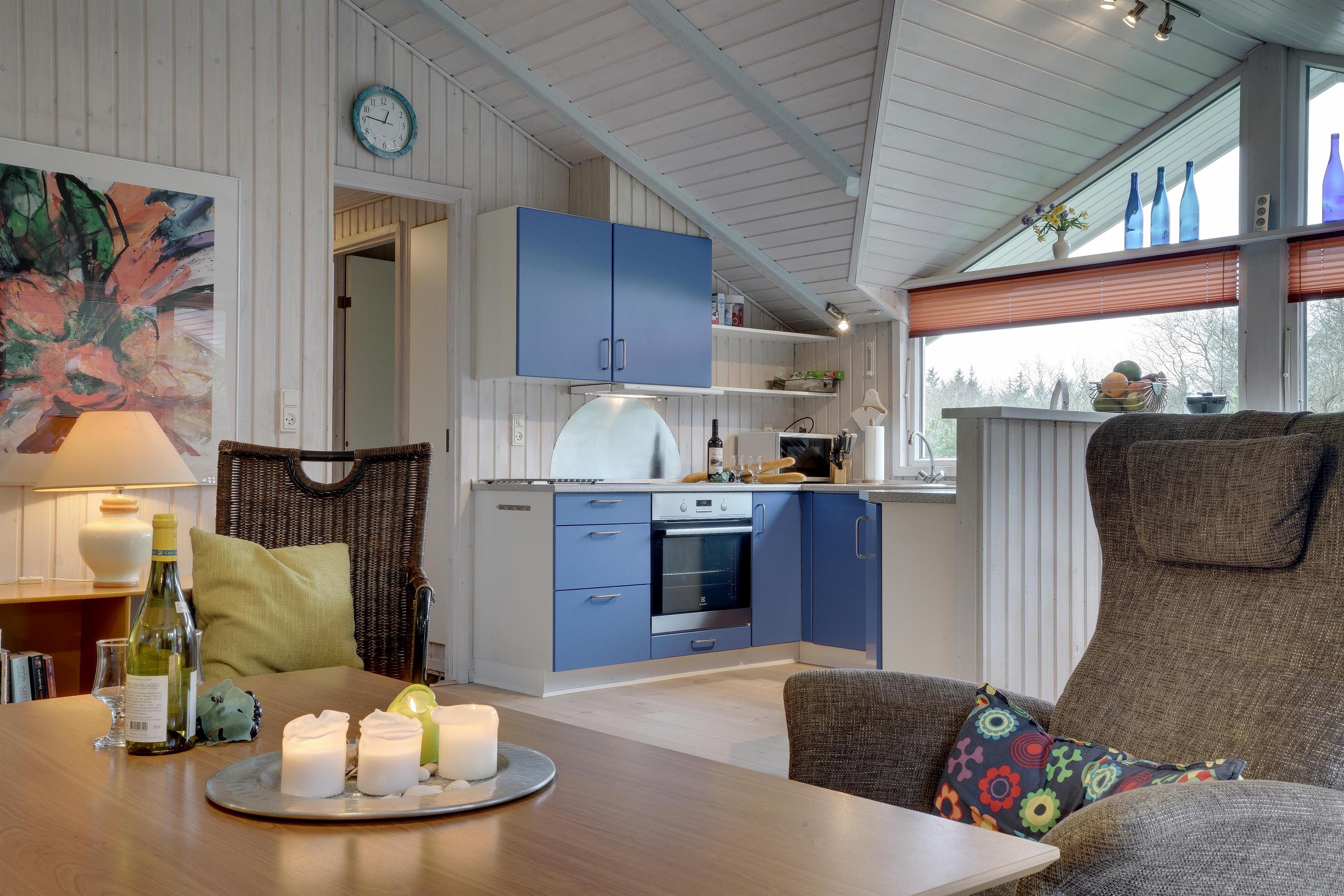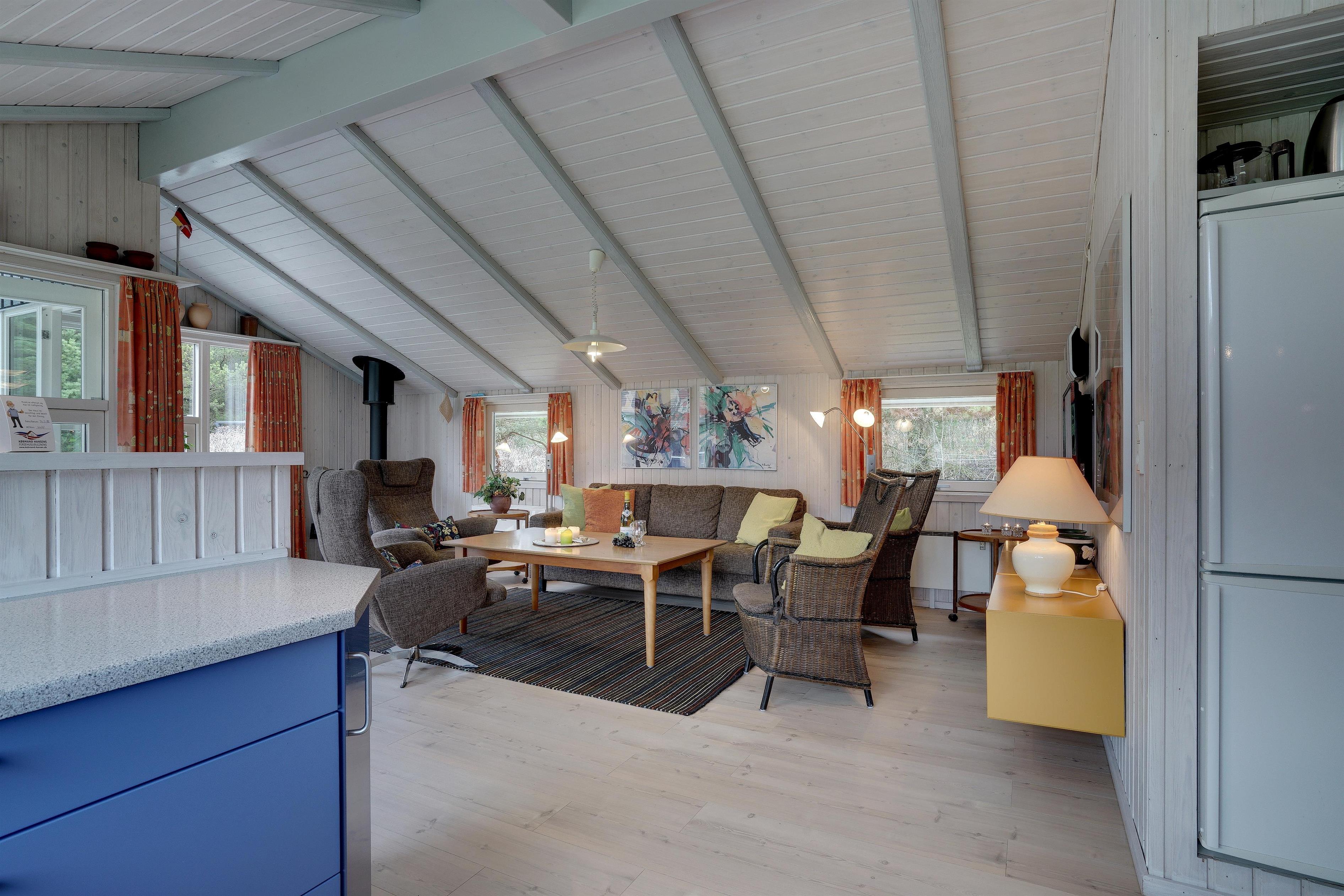 Lækkert indrettet og velholdt feriehus beliggende på en dejlig naturgrund tæt ved Blåbjerg Plantage og Henne Golfklub. På grunden er der plads til boldspil. Køkken i åben forbindelse til stue med brændeovn med glas. Herfra udgang til delvis overdækket, indhegnet terrasse. Ekstra terrasse ved det overdækkede indgangsparti. Stort badeværelse med spa og sauna, samt ekstra mindre toilet. Gratis ADSL-Internetforbindelse (Lan).