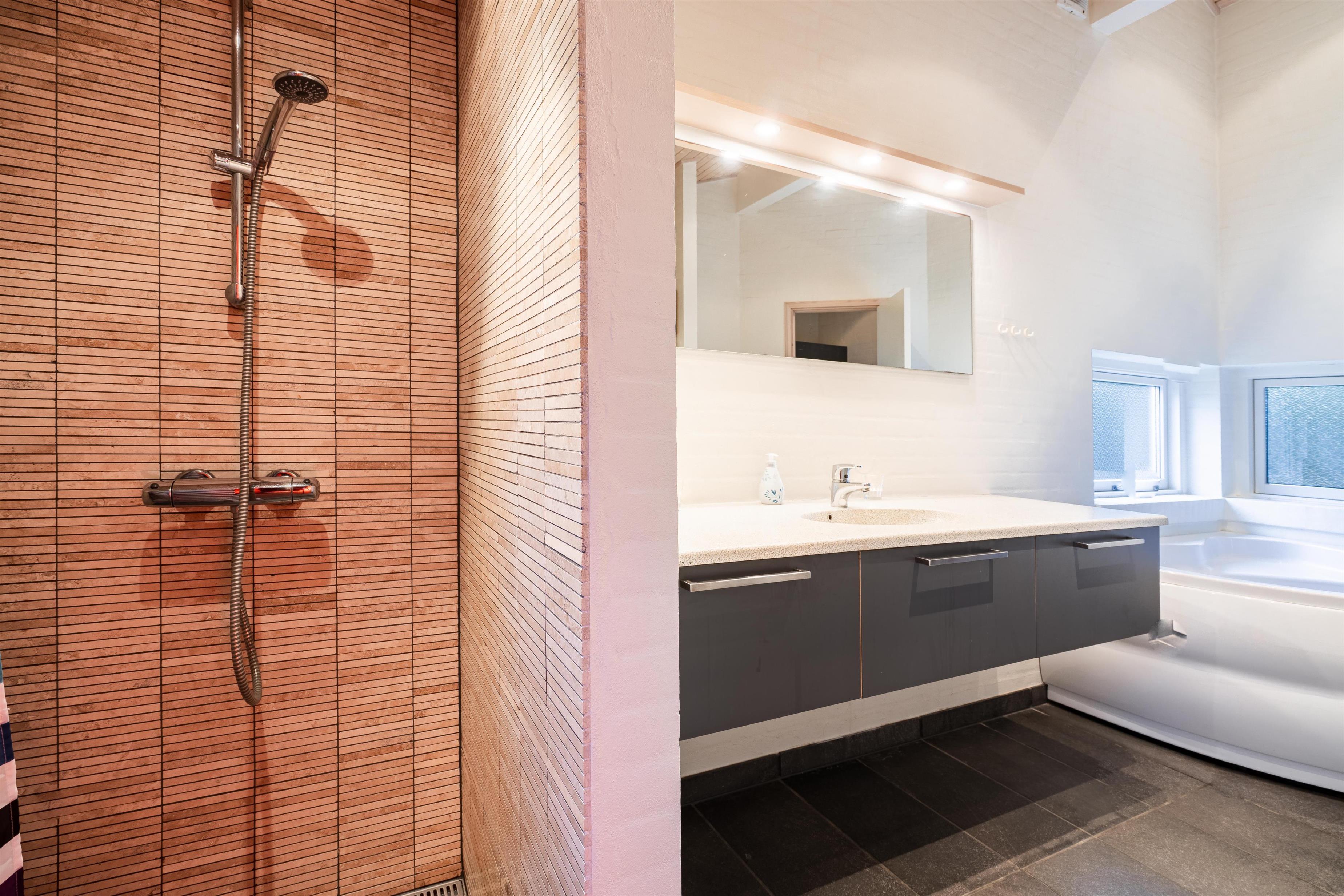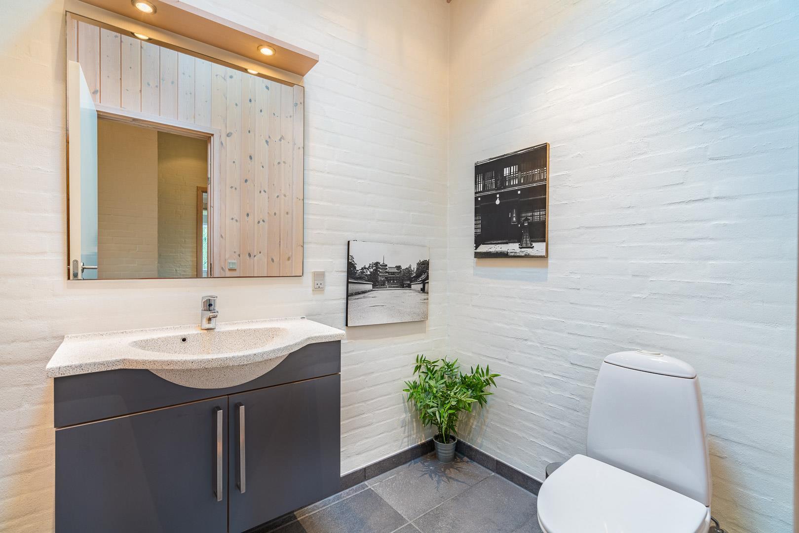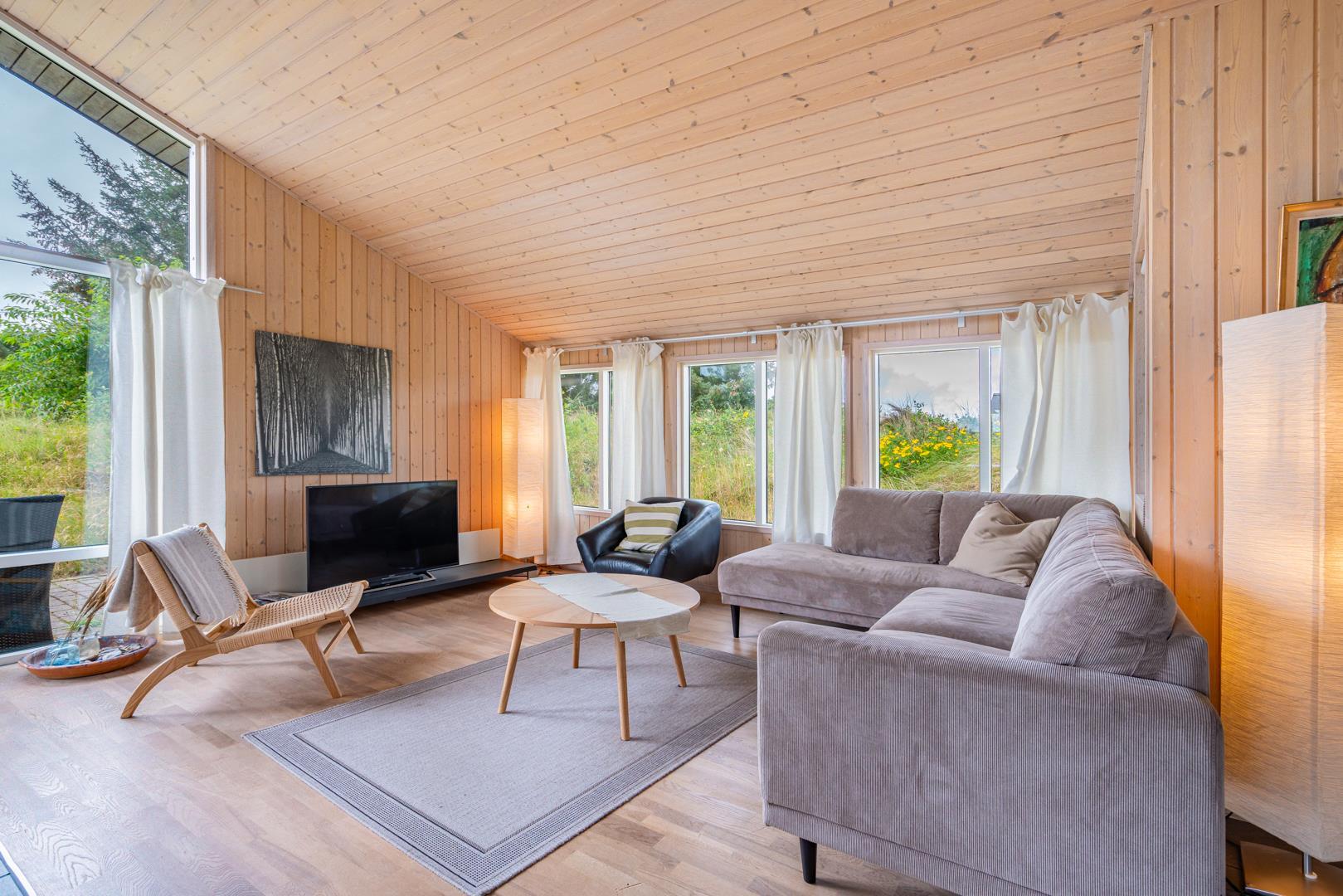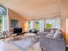 Når du træder ind gennem det overdækkede indgangsparti, mødes du af en stor, lys stue med højt til loftet, moderne møbler og en stemningsfuld brændeovn med glaslåge. Stuen har direkte udgang til to skønne terrasser, hvoraf den ene ligger fuldstændig privat – ideel til solrige dage og hyggelige grillaftener uden indkig fra vejen.